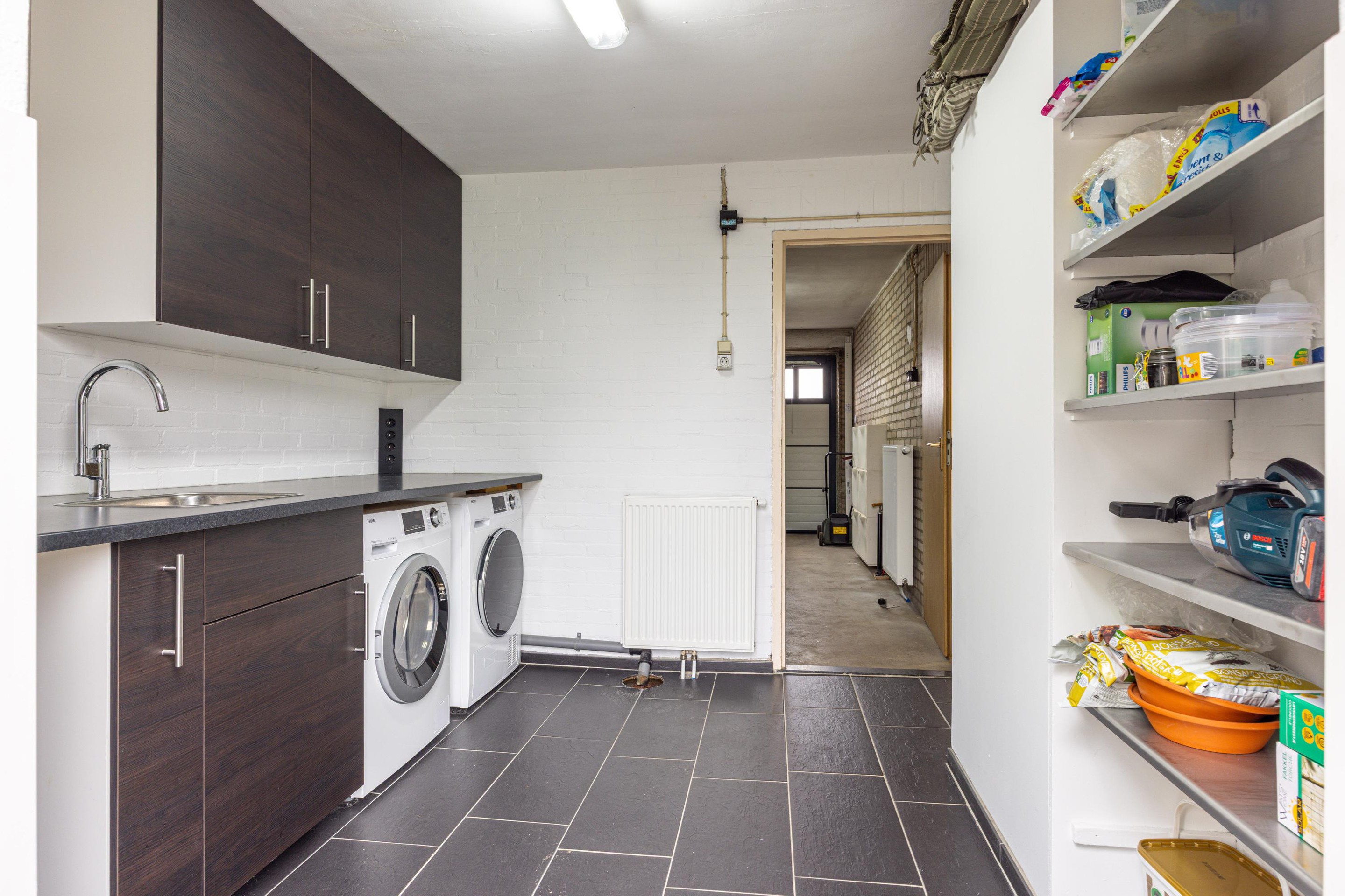 Vanuit de eetkamer bereik je de garage en bijkeuken. In de bijkeuken bevinden zich de witgoedaansluitingen en de cv-installatie. De ruimte is praktisch ingericht en biedt directe toegang tot zowel de achtertuin als de garage, wat zorgt voor extra gemak in het dagelijks gebruik.