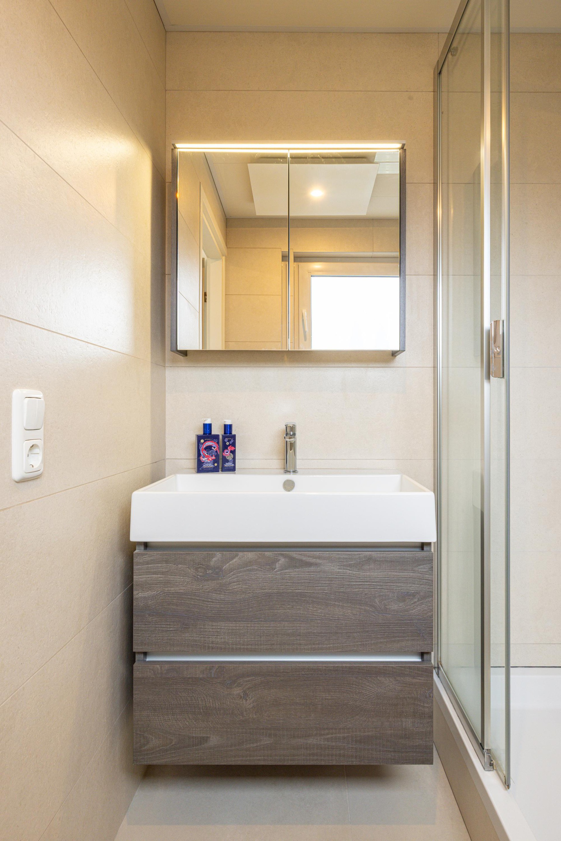 De badkamer is in 2022 vernieuwd en modern afgewerkt. De ruimte is volledig betegeld en functioneel ingedeeld. Je vindt hier een douchecabine, een zwevend toilet, een wastafelmeubel met wasbak en een spiegelkast. Het kunststof kozijn met dubbelglas zorgt voor natuurlijke lichtinval en ventilatiemogelijkheden. Daarnaast is er een infraroodpaneel in het plafond aanwezig, wat bijdraagt aan extra comfort. Een eigentijdse badkamer waar afwerking en gebruiksgemak samenkomen.