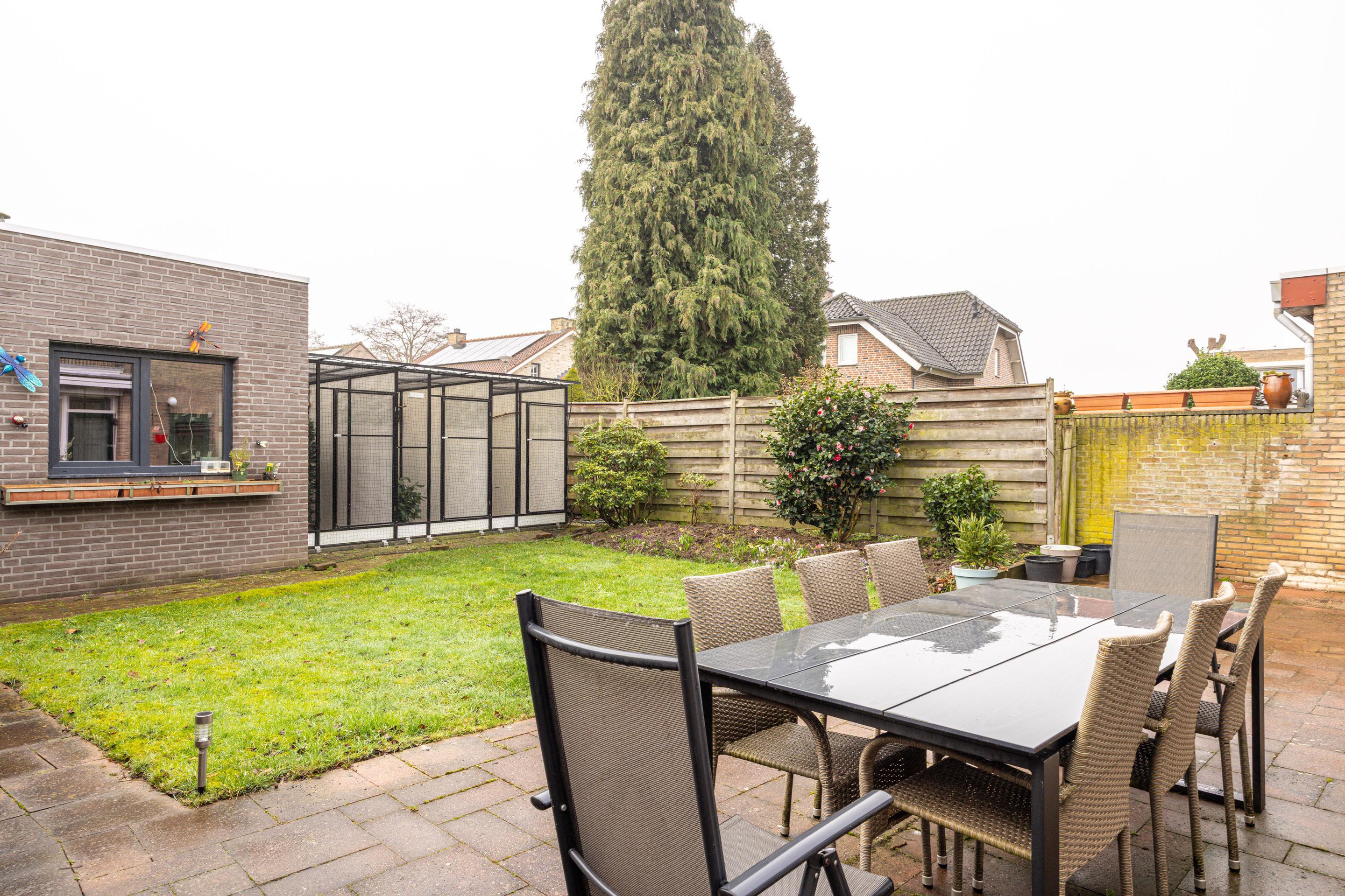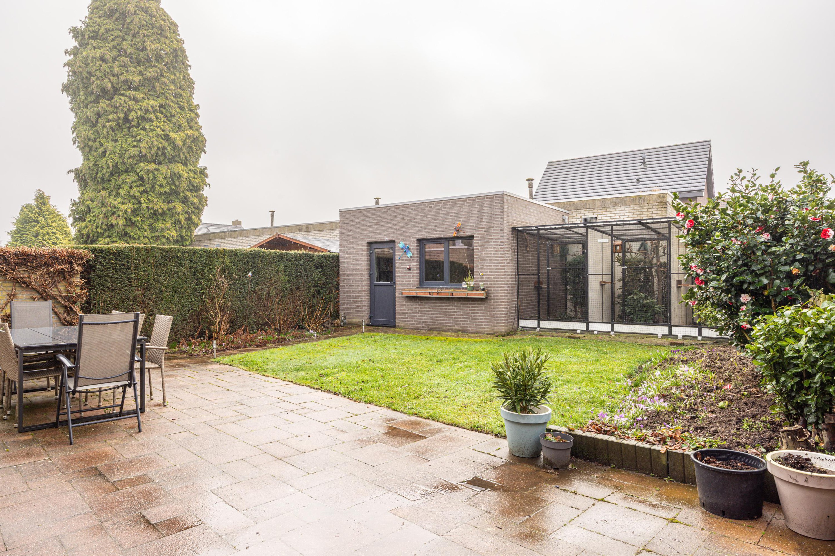 Op zonnige dagen zorgt het elektrische zonnescherm voor extra comfort en schaduw. Vanuit de tuin is er directe toegang tot de bijkeuken en de stenen berging. Deze berging is in 2022 geïsoleerd en voorzien van elektra, waardoor de ruimte niet alleen geschikt is voor opslag, maar ook prima kan dienen als hobbyruimte.