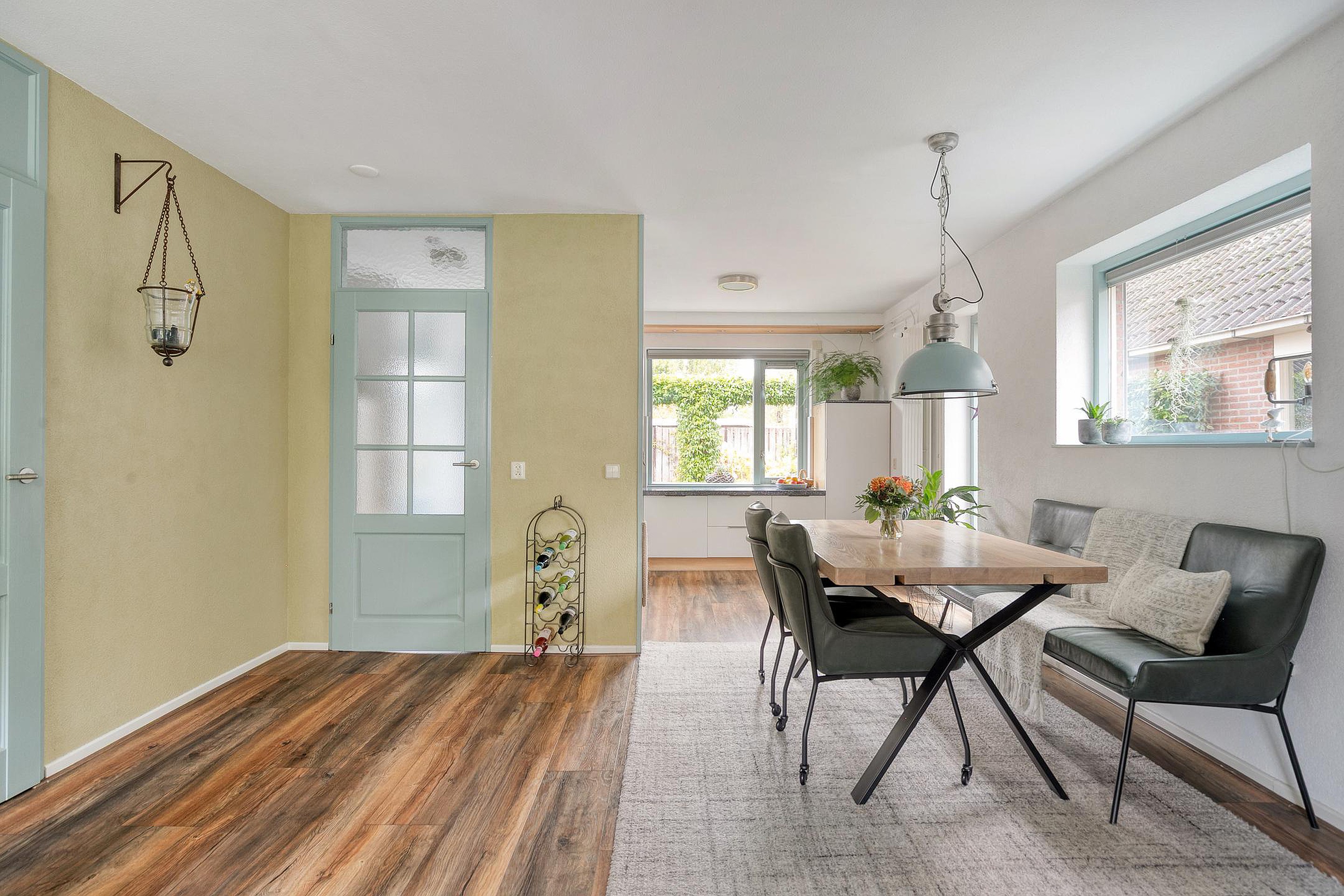 Aangrenzend aan de hal bevindt zich de ruime woonkamer, waar de open indeling zorgt voor een aangename sfeer tussen de verschillende leefruimtes. Dankzij de grote ramen valt er veel natuurlijk licht naar binnen, waardoor een warme en huiselijke sfeer ontstaat. Hier creëert u eenvoudig een gezellige zithoek en een royale eettafel voor lange avonden met familie of vrienden.