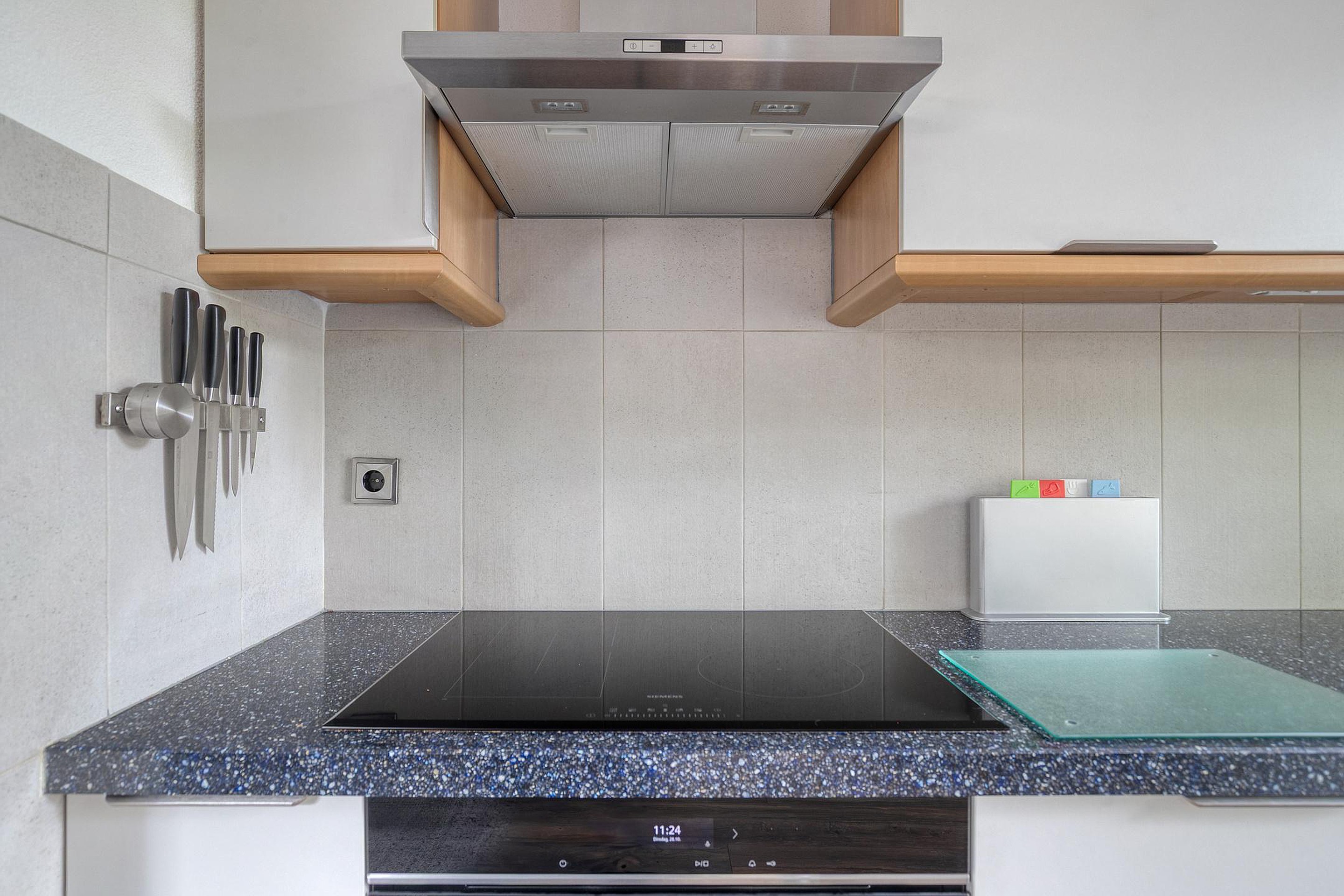 Grenzend aan de woonkamer bevindt zich de L-vormige open keuken, die niet alleen praktisch is ingedeeld maar ook in nette staat verkeert. De keuken is voorzien van moderne apparatuur, waaronder een inductiekookplaat met afzuigkap, oven, koelkast, spoelbak en volop opbergruimte in kasten en lades. Een fijne plek om de dag te beginnen met een kop koffie of uitgebreid te koken voor gasten.