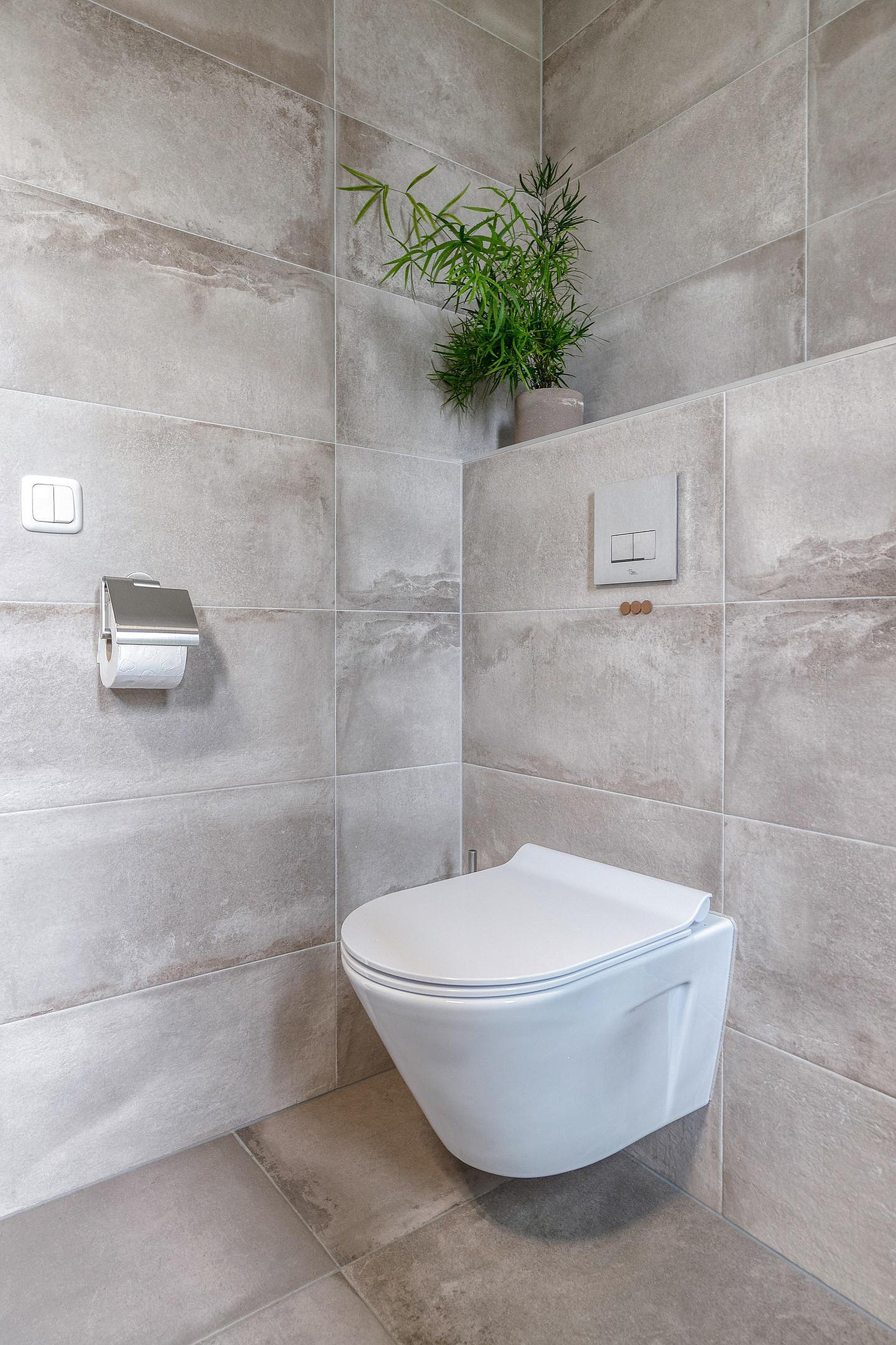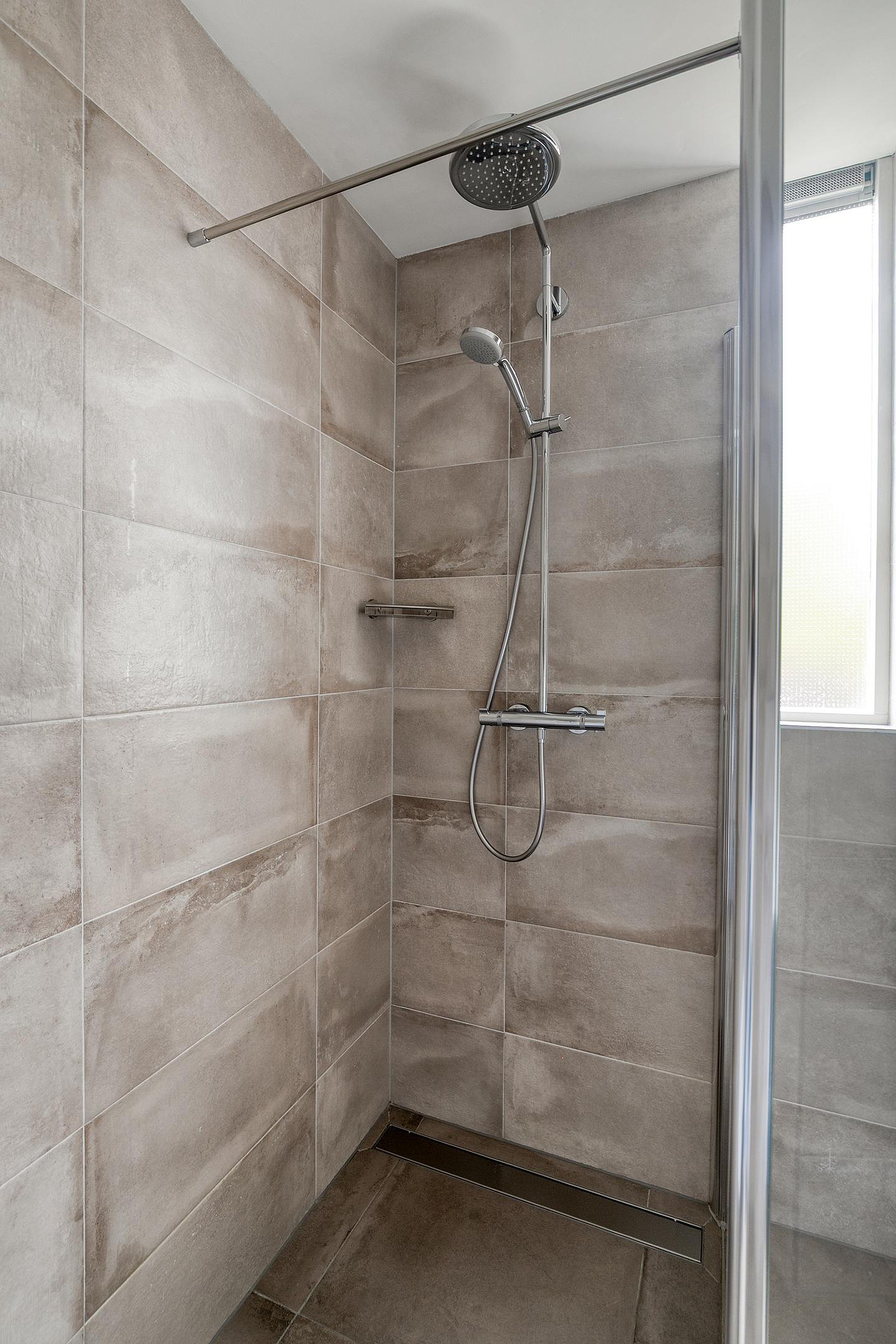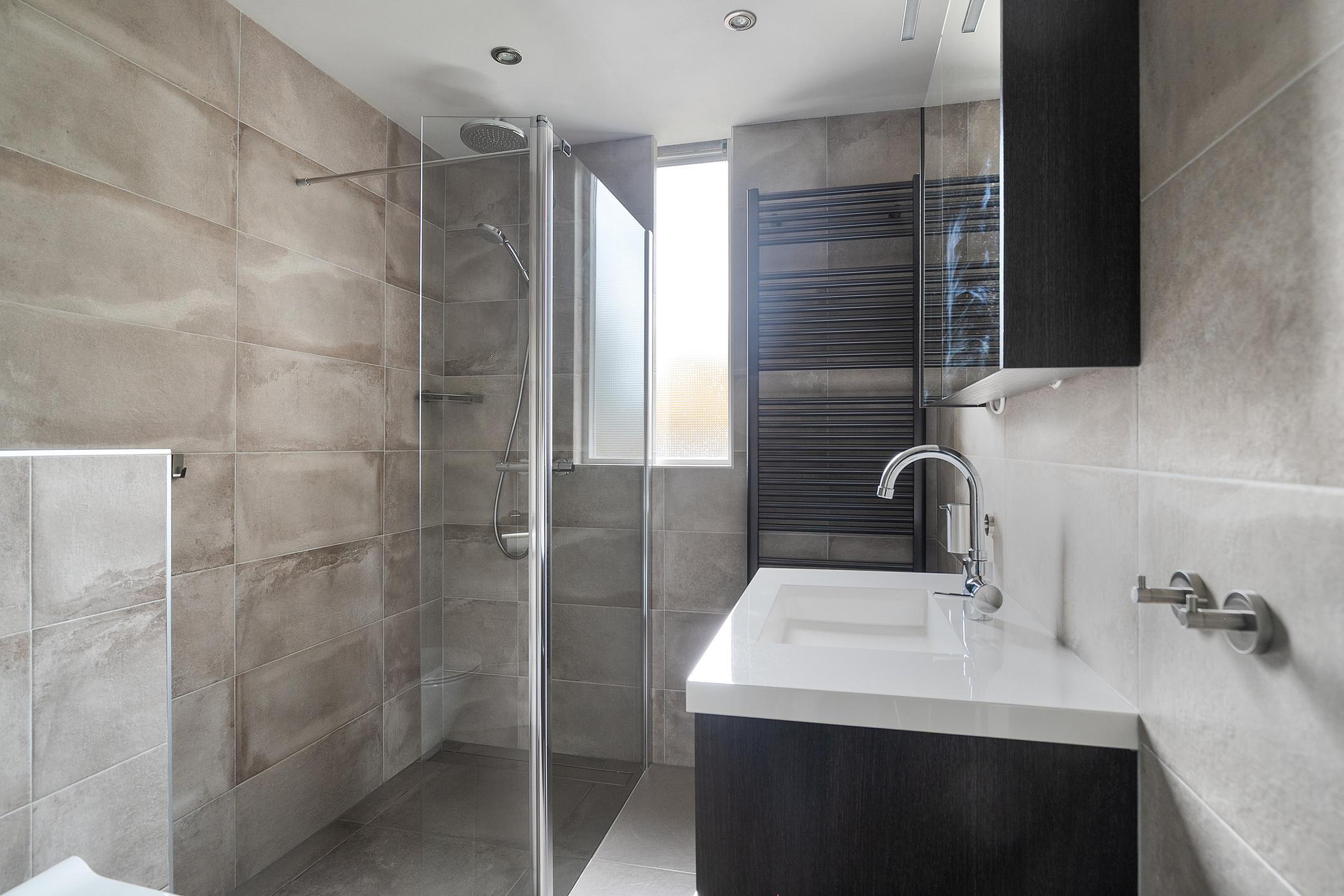 De moderne badkamer is geheel betegeld en van alle gemakken voorzien. U vindt hier een douchecabine, zwevend toilet, wastafel met spiegel en een handdoekradiator. Alles verkeert in keurige staat, waardoor u zonder aanpassingen direct kunt genieten van een frisse start van de dag.