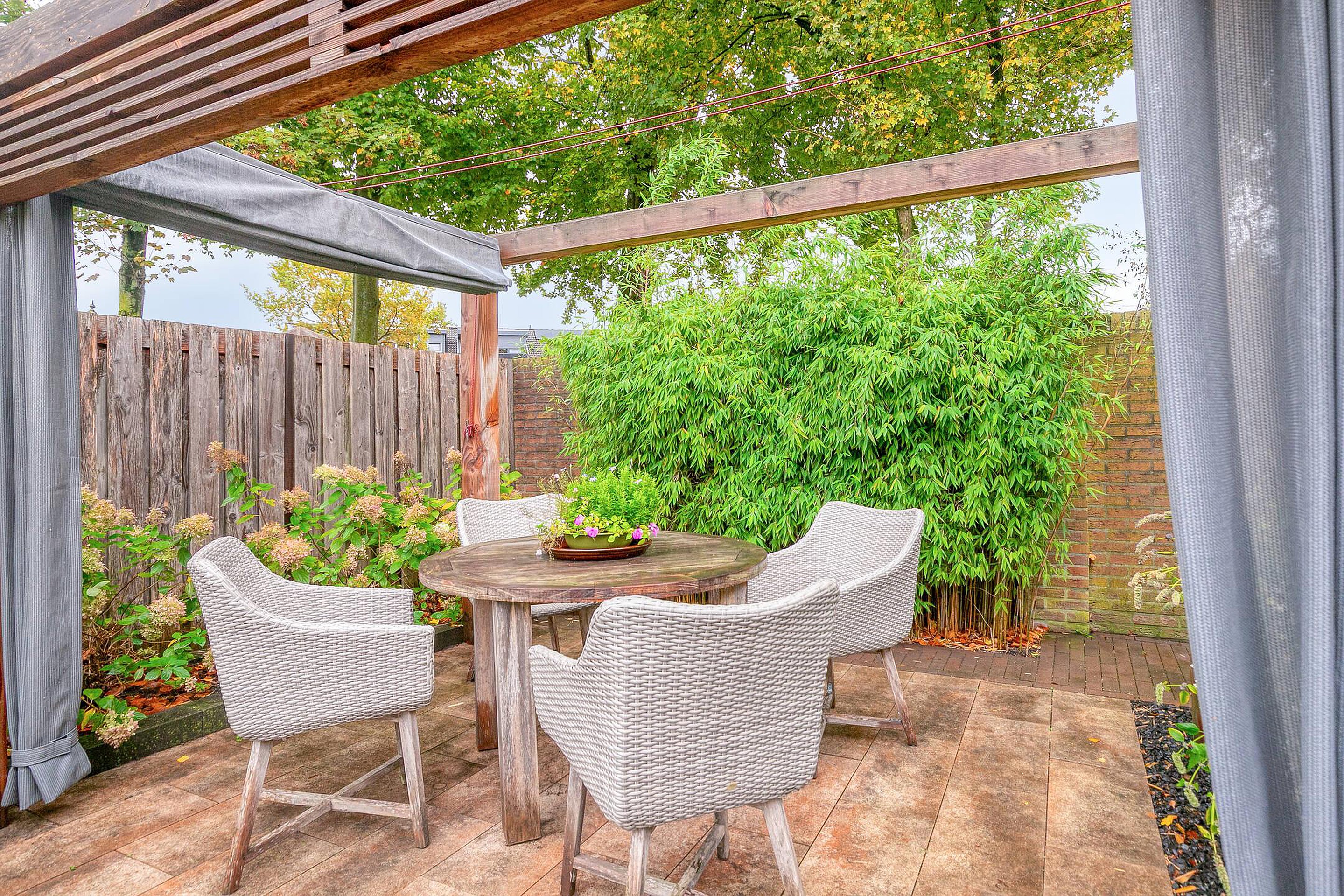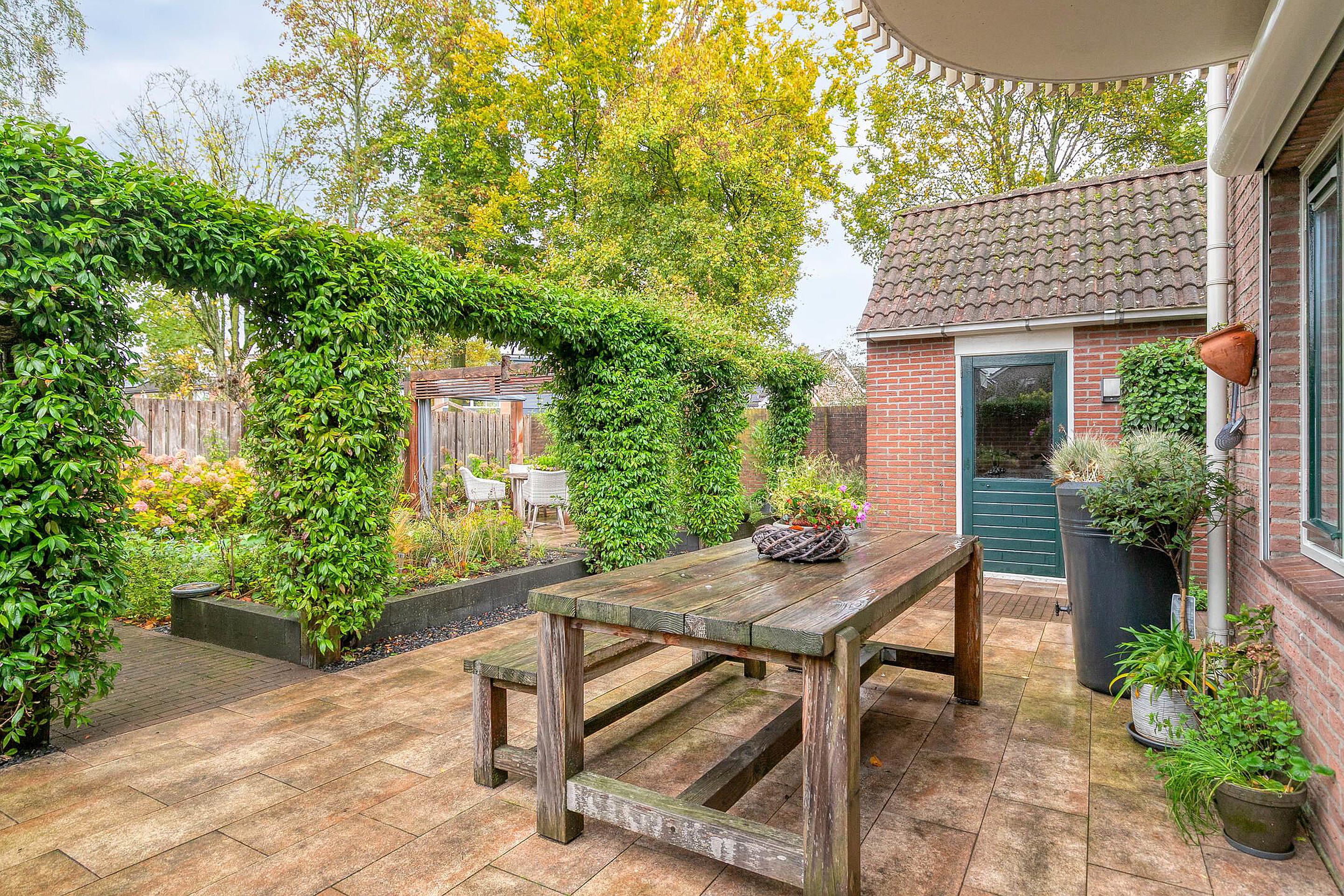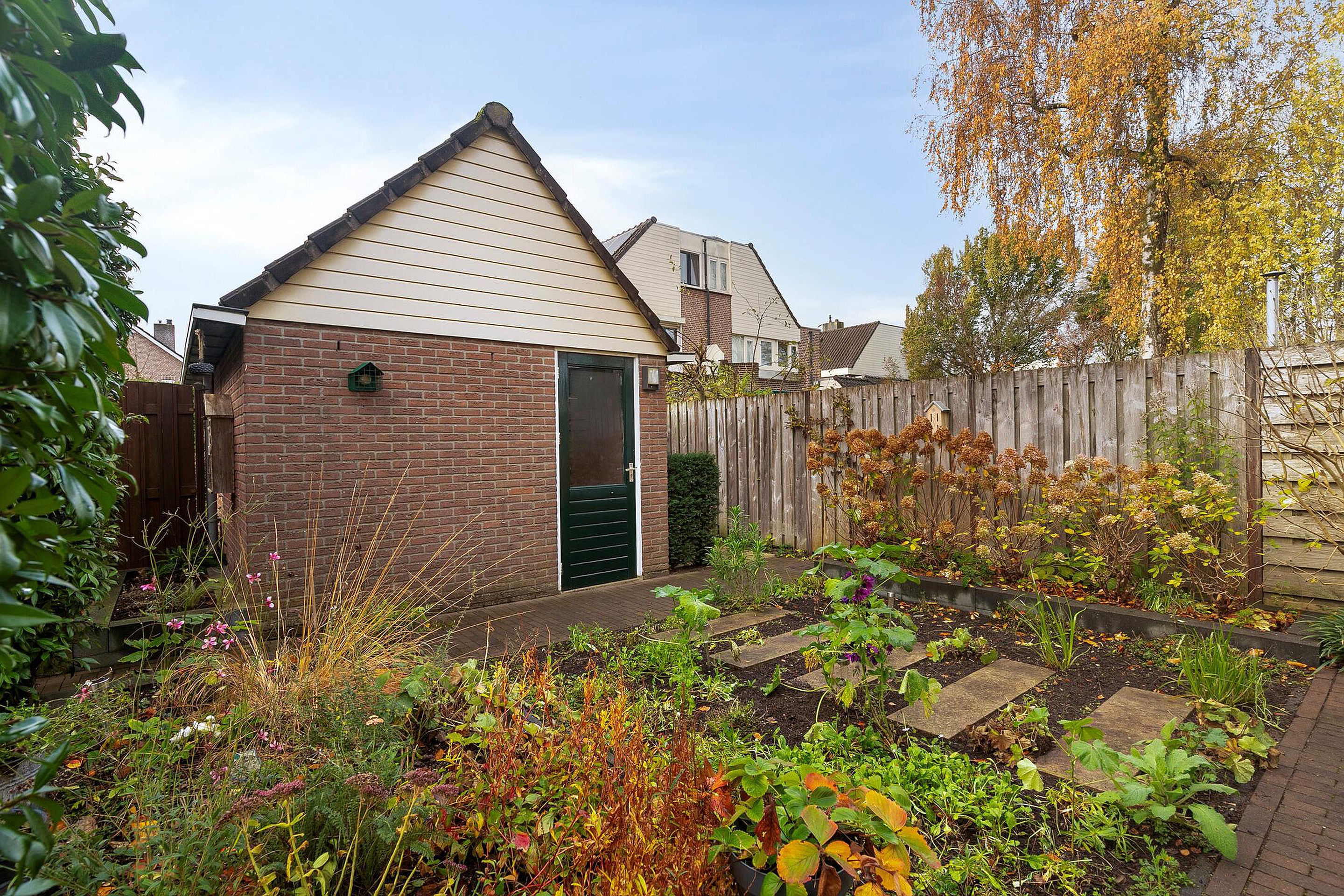 De voortuin is fraai aangelegd en geeft de woning direct een verzorgde uitstraling. Achter de woning ligt een zonnige tuin met veel privacy en groen. Hier kunt u volop genieten van het buitenleven, of u nu kiest voor een lounge set, eettafel of speelruimte voor kinderen. De tuin is onderhoudsvriendelijk aangelegd en beschikt over een berging, ideaal voor fietsen, tuingereedschap of andere spullen. Een heerlijke plek om in alle rust te ontspannen.