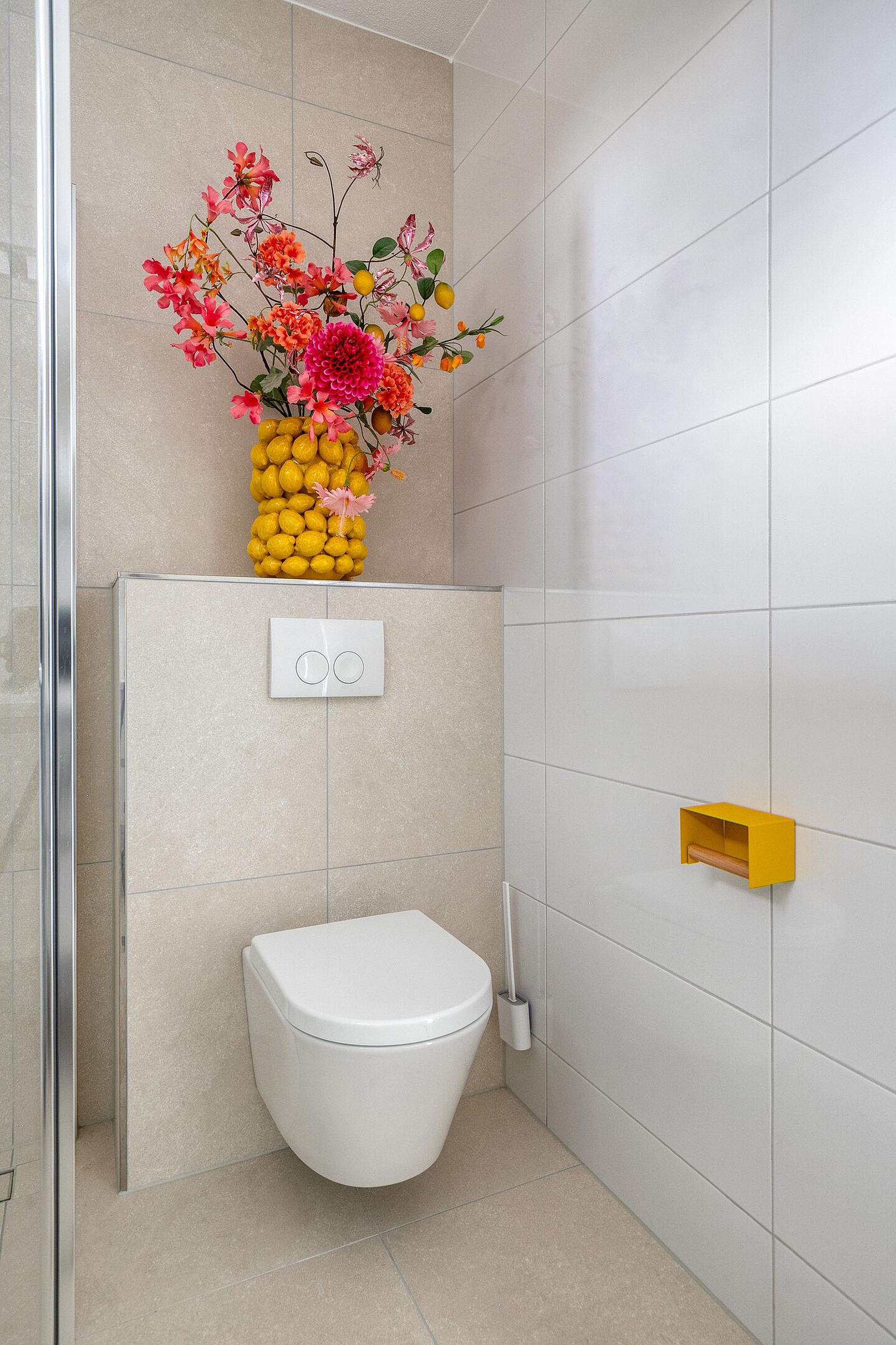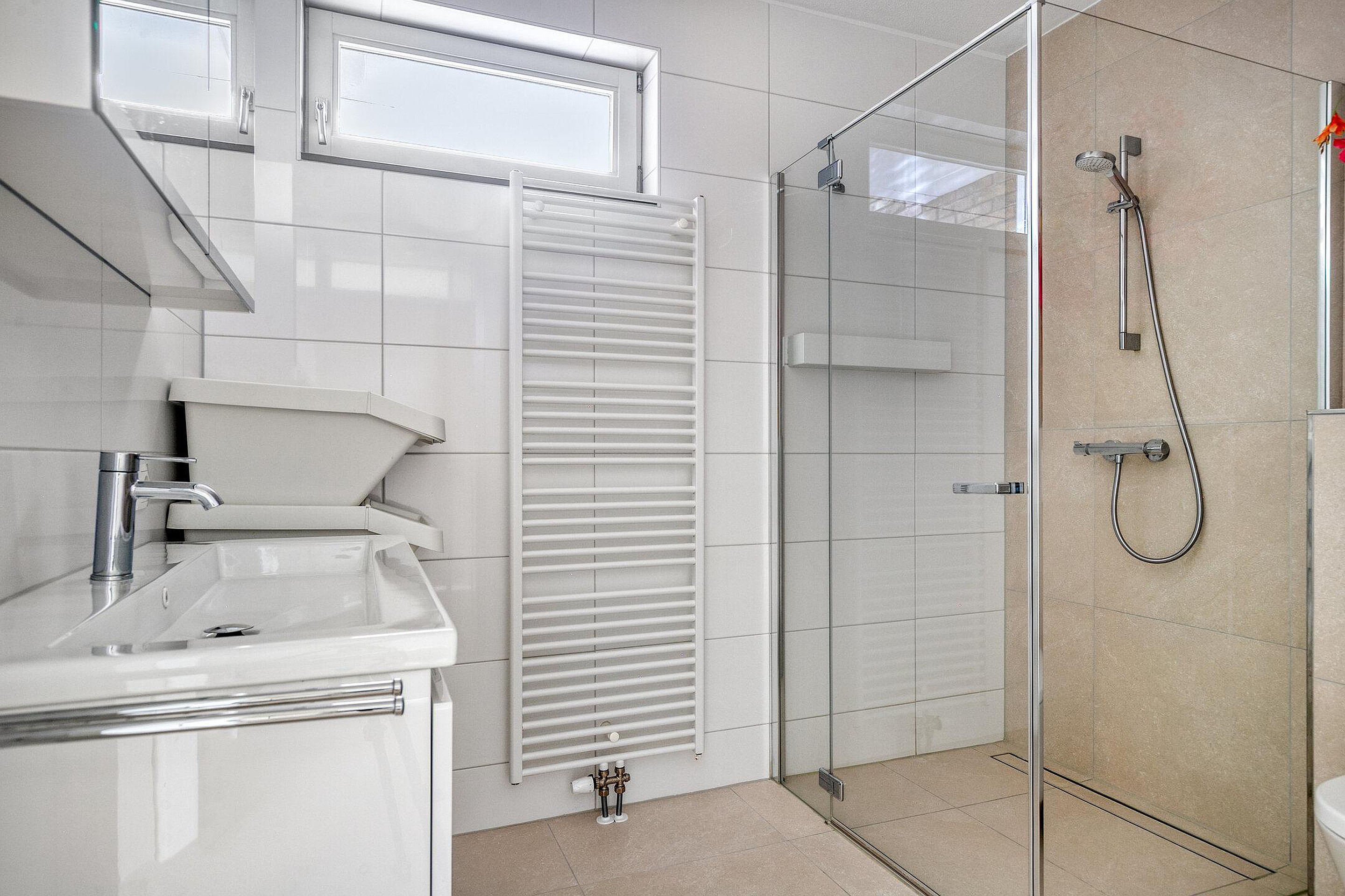 De moderne badkamer ligt direct aan de overloop en is volledig betegeld in een eigentijdse stijl. U beschikt hier over een douche met glazen deur, een wastafel met spiegel en een zwevend toilet. Daarnaast zorgt de handdoekradiator voor extra comfort. De badkamer is netjes onderhouden en instapklaar.