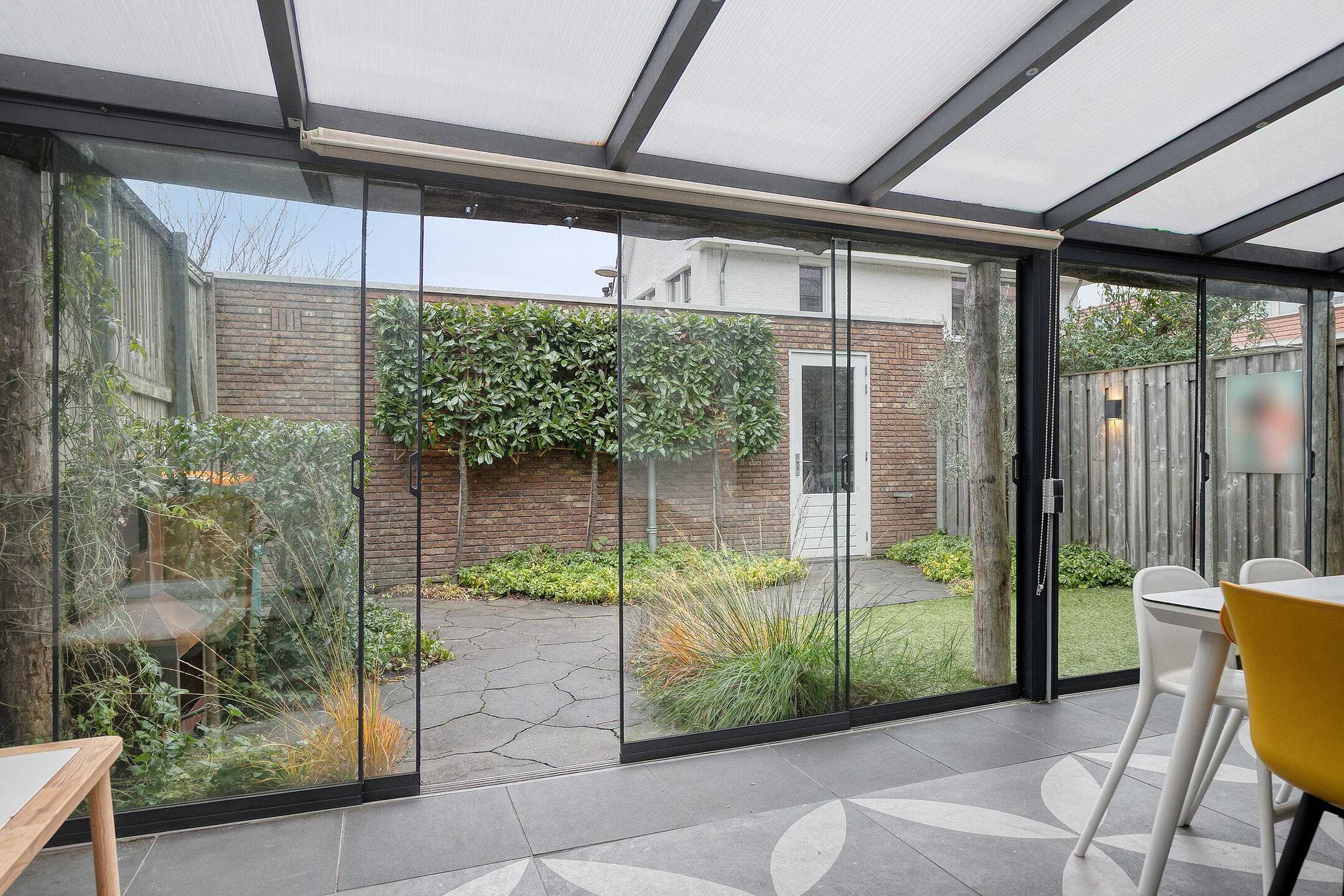 De serre vormt een prachtig verlengstuk van de keuken en daarmee van de leefruimte. Het vele glas zorgt voor een lichte, open sfeer en een directe verbinding met de achtertuin. Hier wordt het binnenleven naadloos met het buitenleven verbonden. Op de serre is een elektrisch aangedreven zonnescherm aanwezig, voorzien van afstandsbediening. Hiermee houdt u ook in de warme periode een fijne buitenplek.