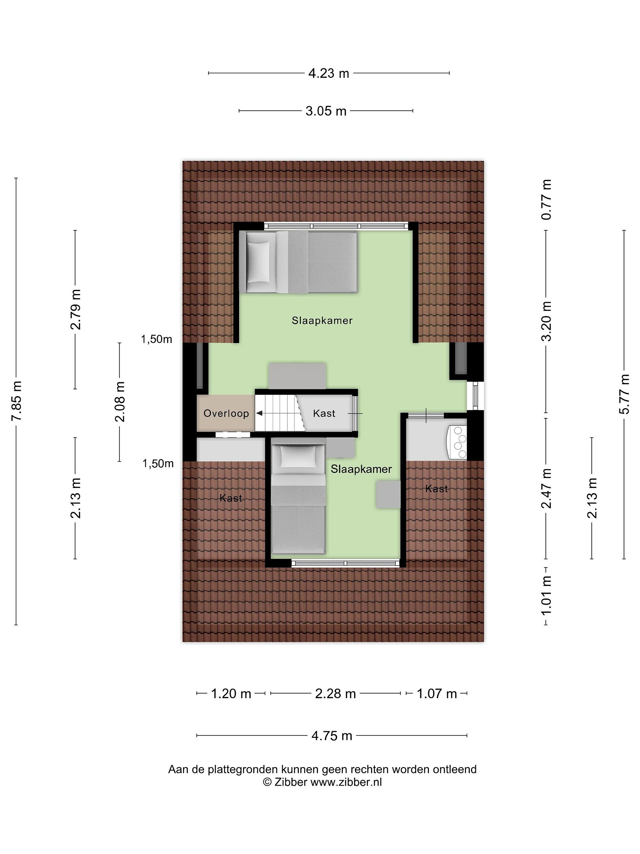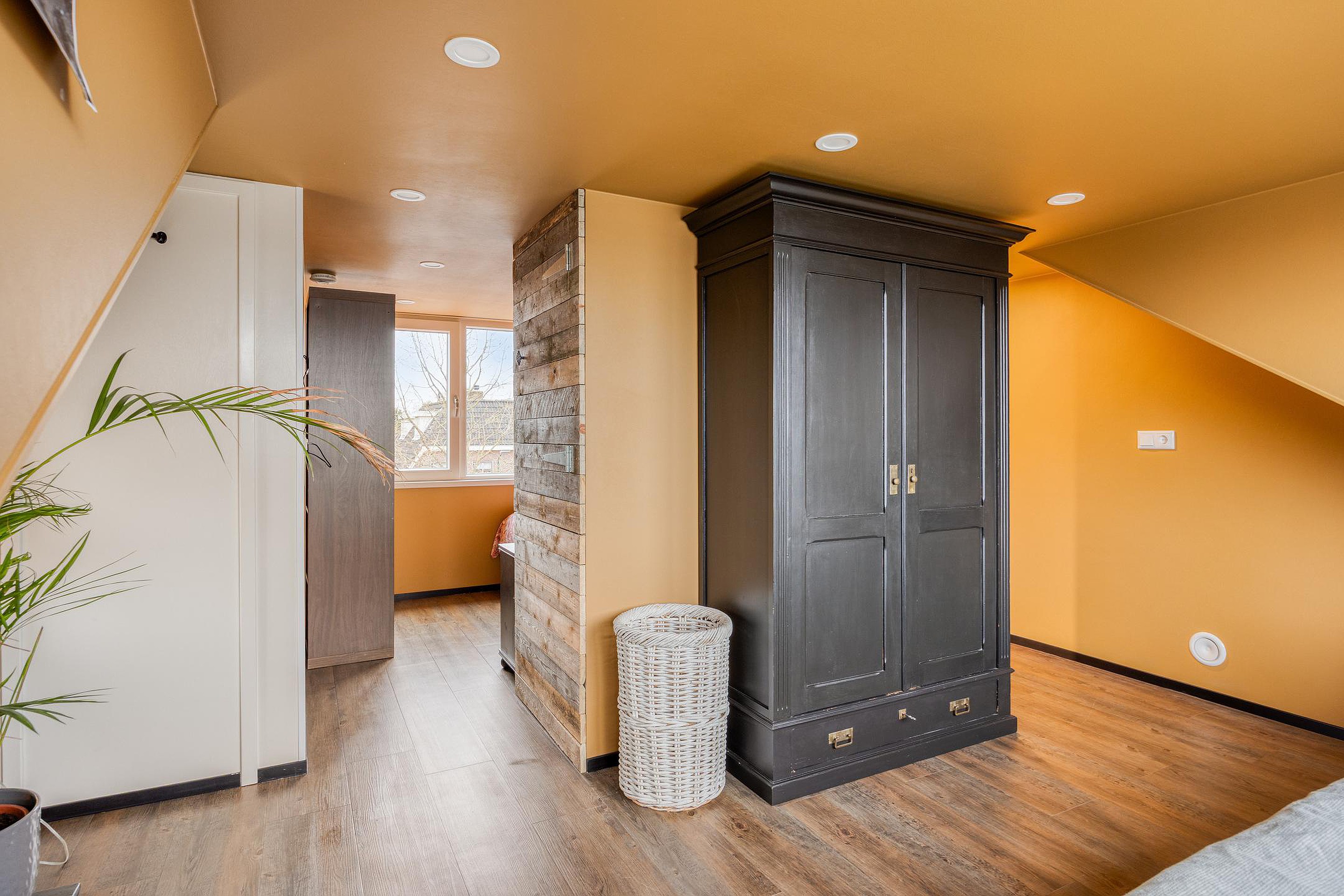 De vaste trap naar de tweede verdieping brengt u naar een royale zolderkamer. De hoogte onder de kap is verrassend goed, waardoor de ruimte veelzijdig te gebruiken is: als werkplek, één of twee slaapkamers, logeerkamer of creatieve studio. Op deze verdieping zijn twee praktische bergingen weggewerkt, ideaal voor het opbergen van seizoensspullen.