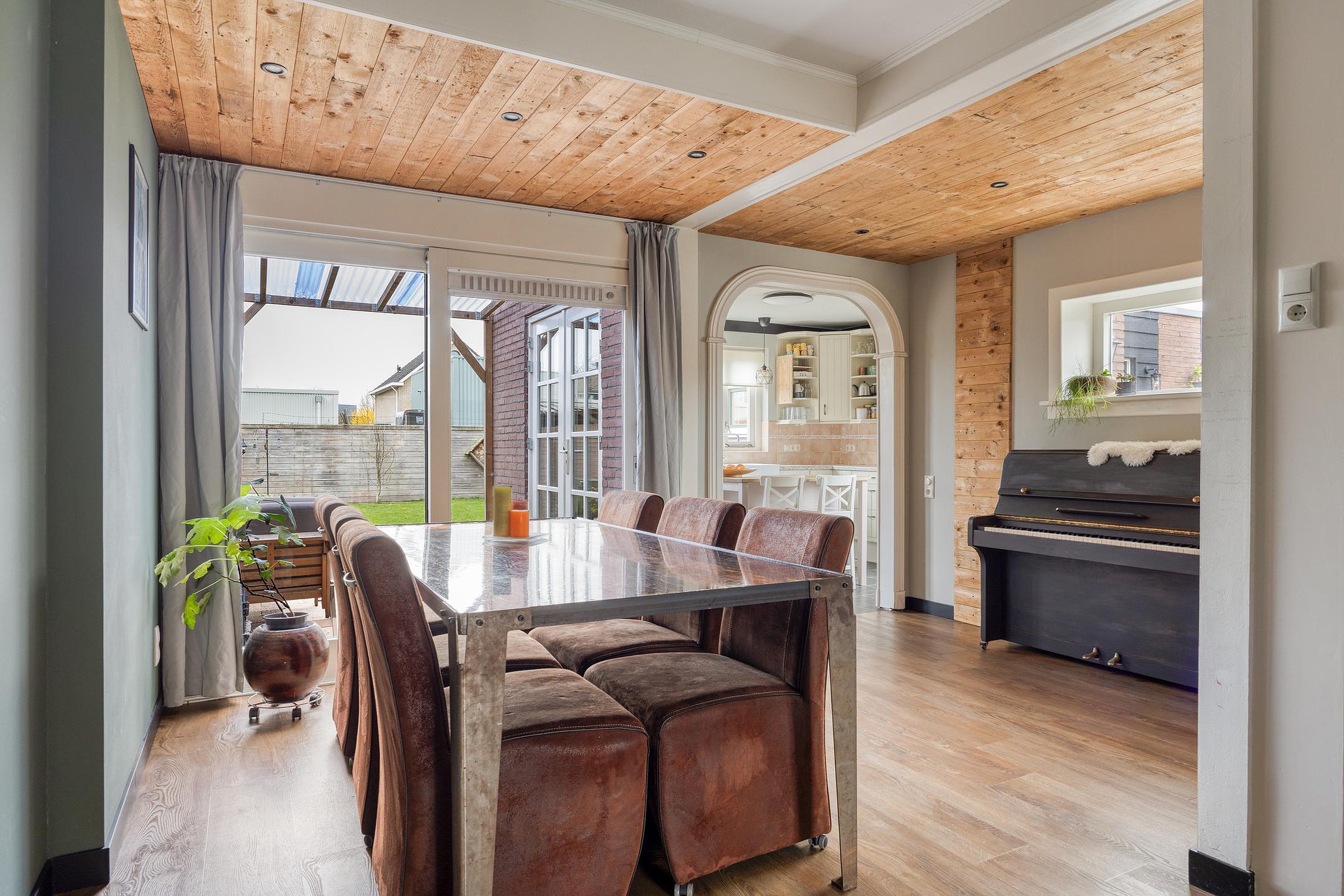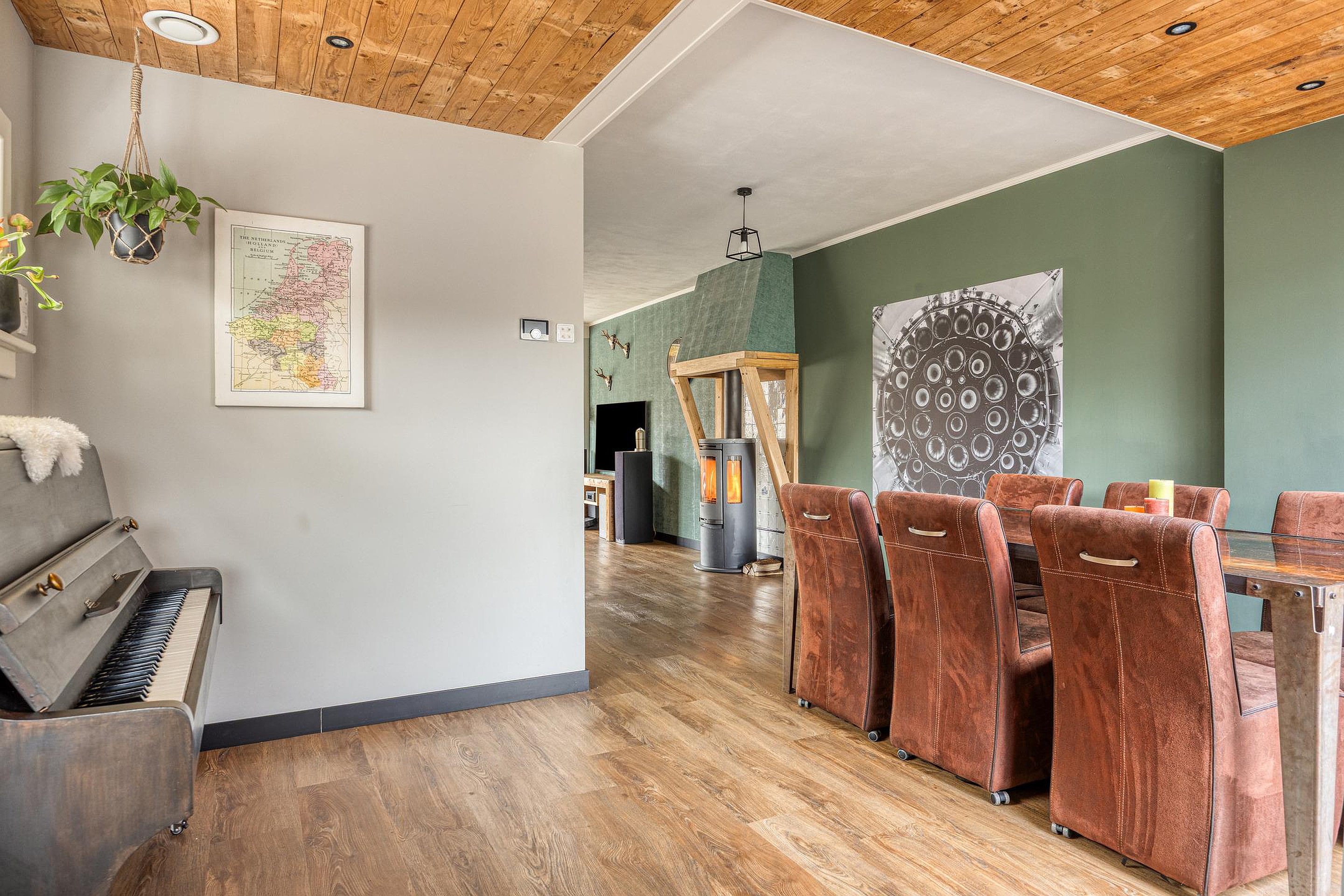 De woonkamer is ruim opgezet en wordt gekenmerkt door grote raampartijen die zorgen voor een aangename hoeveelheid daglicht en een open, uitnodigende sfeer. Centraal in de ruimte staat de sfeervolle houtkachel, die niet alleen warmte biedt maar ook een gezellige blikvanger vormt. De indeling leent zich uitstekend voor zowel een comfortabele zithoek als een royale eettafel. Via de schuifdeur loopt u direct de achtertuin in, waardoor binnen en buiten op natuurlijke wijze met elkaar verbonden zijn.