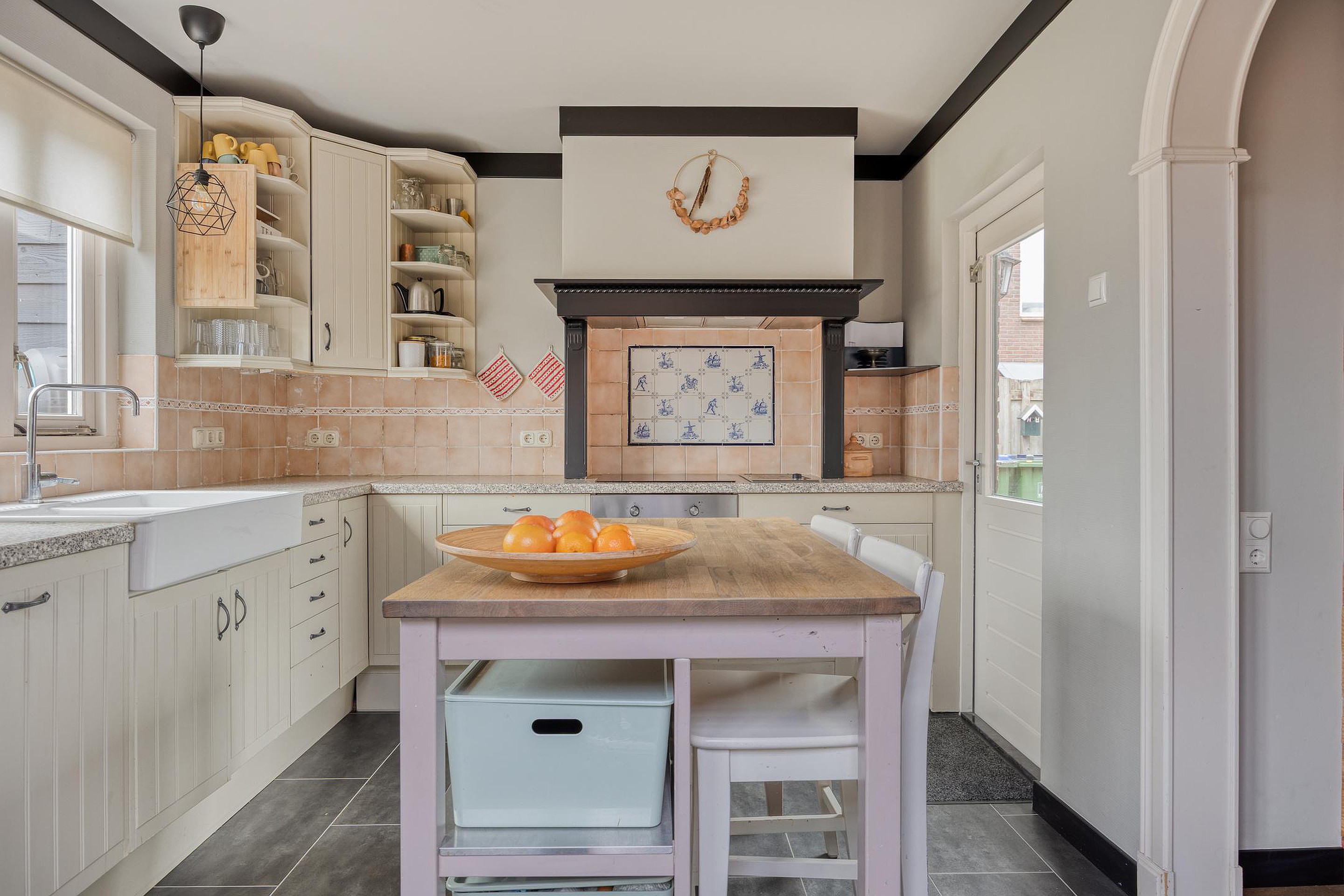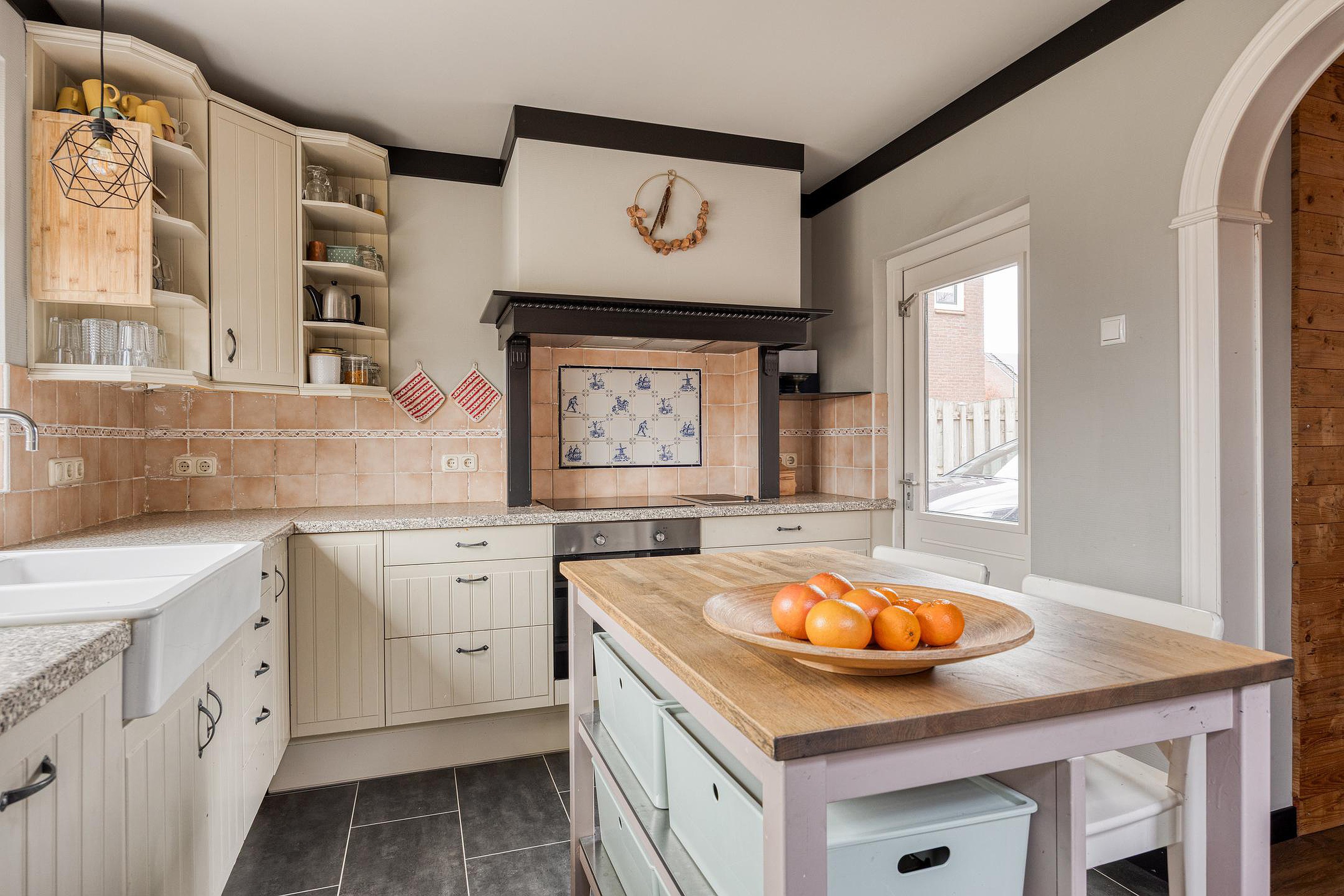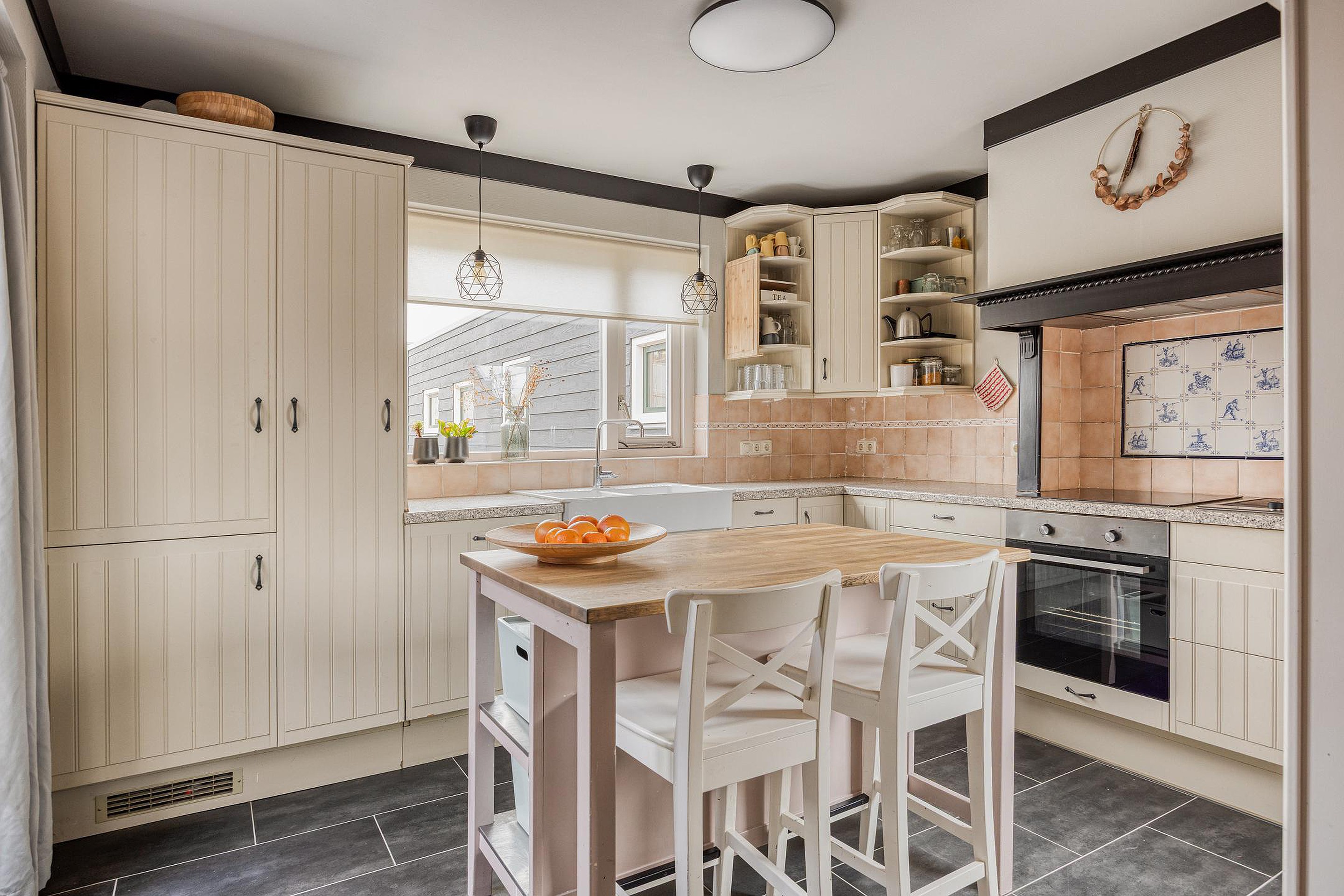 Aansluitend aan de woonkamer ligt de moderne leefkeuken. De L-opstelling biedt veel praktische ruimte. Daarnaast heeft de keuken een landelijke uitstraling. U beschikt over een inductiekookplaat met afzuigkap, oven, vaatwasser, spoelbak en koelkast. De vele kastjes en lades zorgen voor prettig opberggemak. Bovendien is er ruimte voor een kleine eettafel.