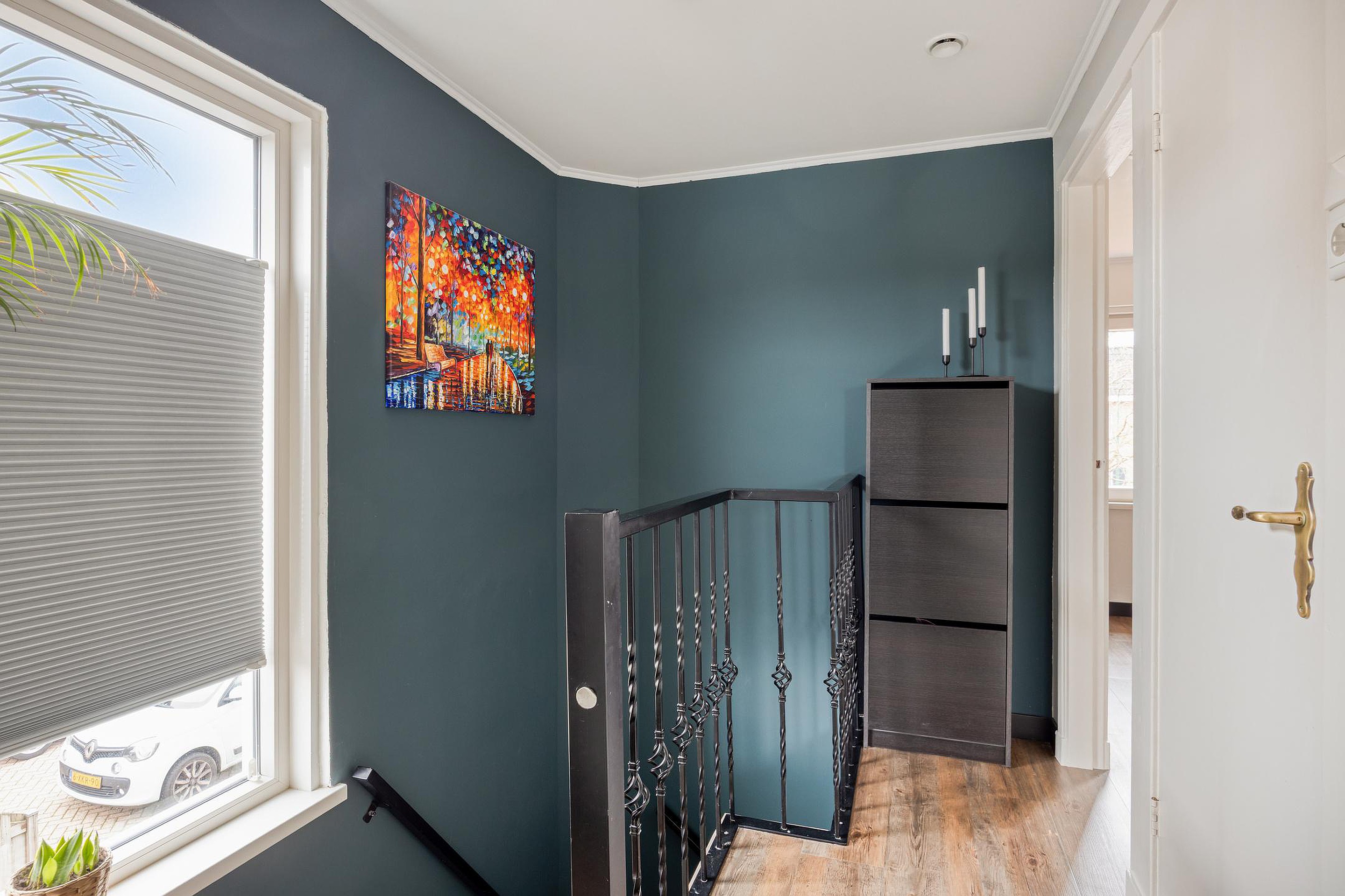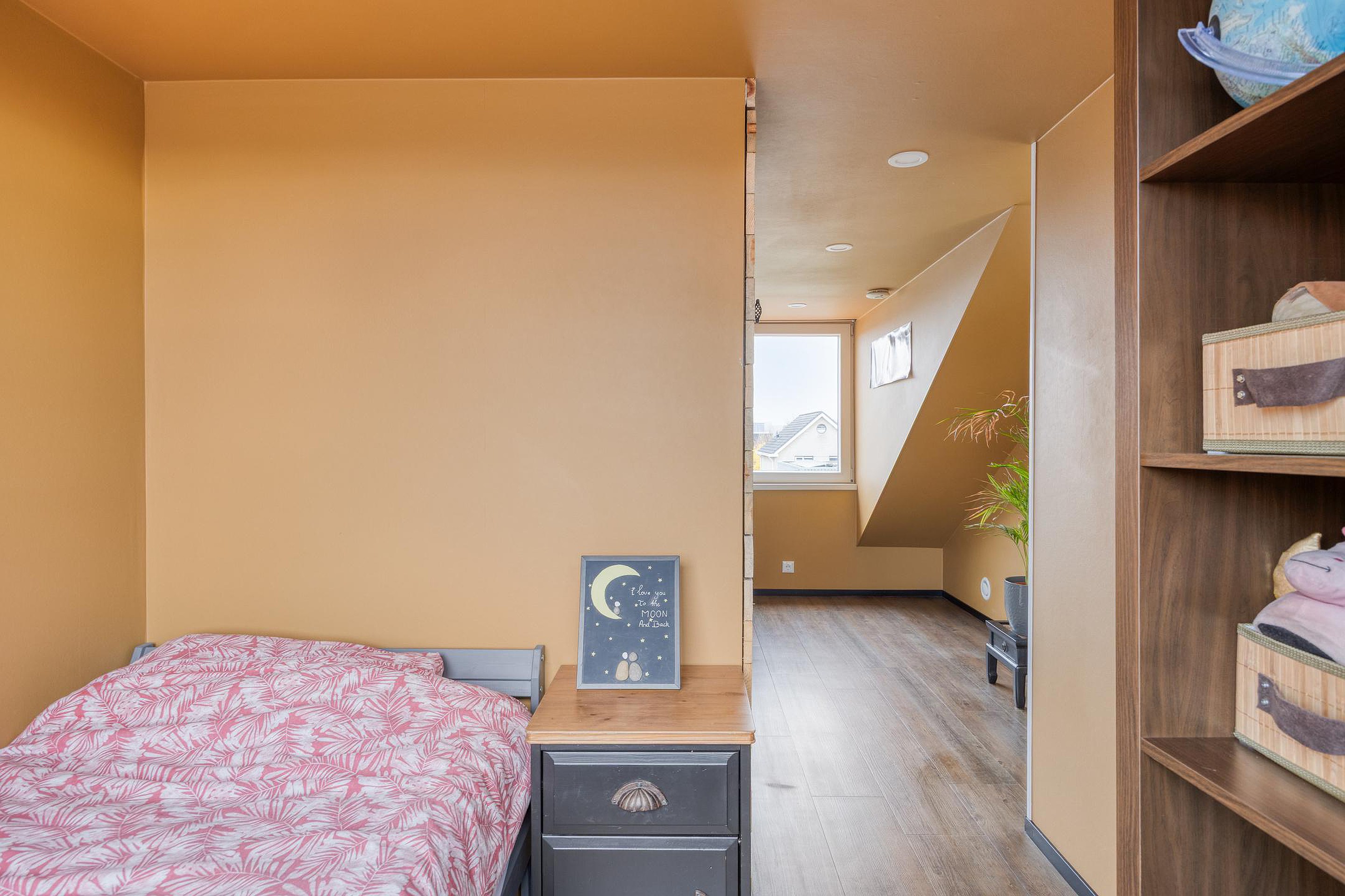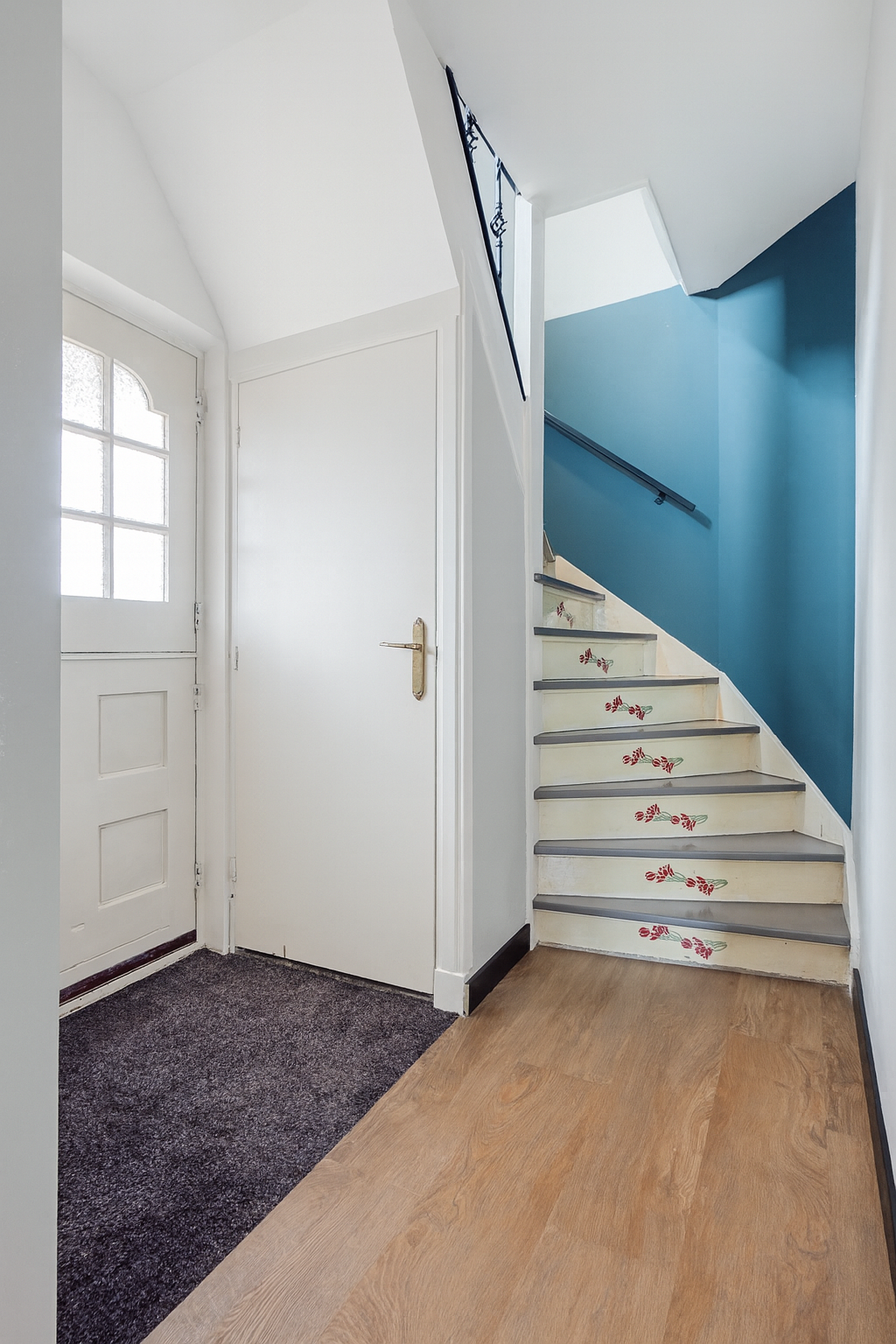 Vanaf de hal leidt de vaste trap naar de eerste verdieping, waar twee slaapkamers en de badkamer liggen. De overloop vormt het hart van deze verdieping en verbindt de ruimtes op een logische en rustige manier.