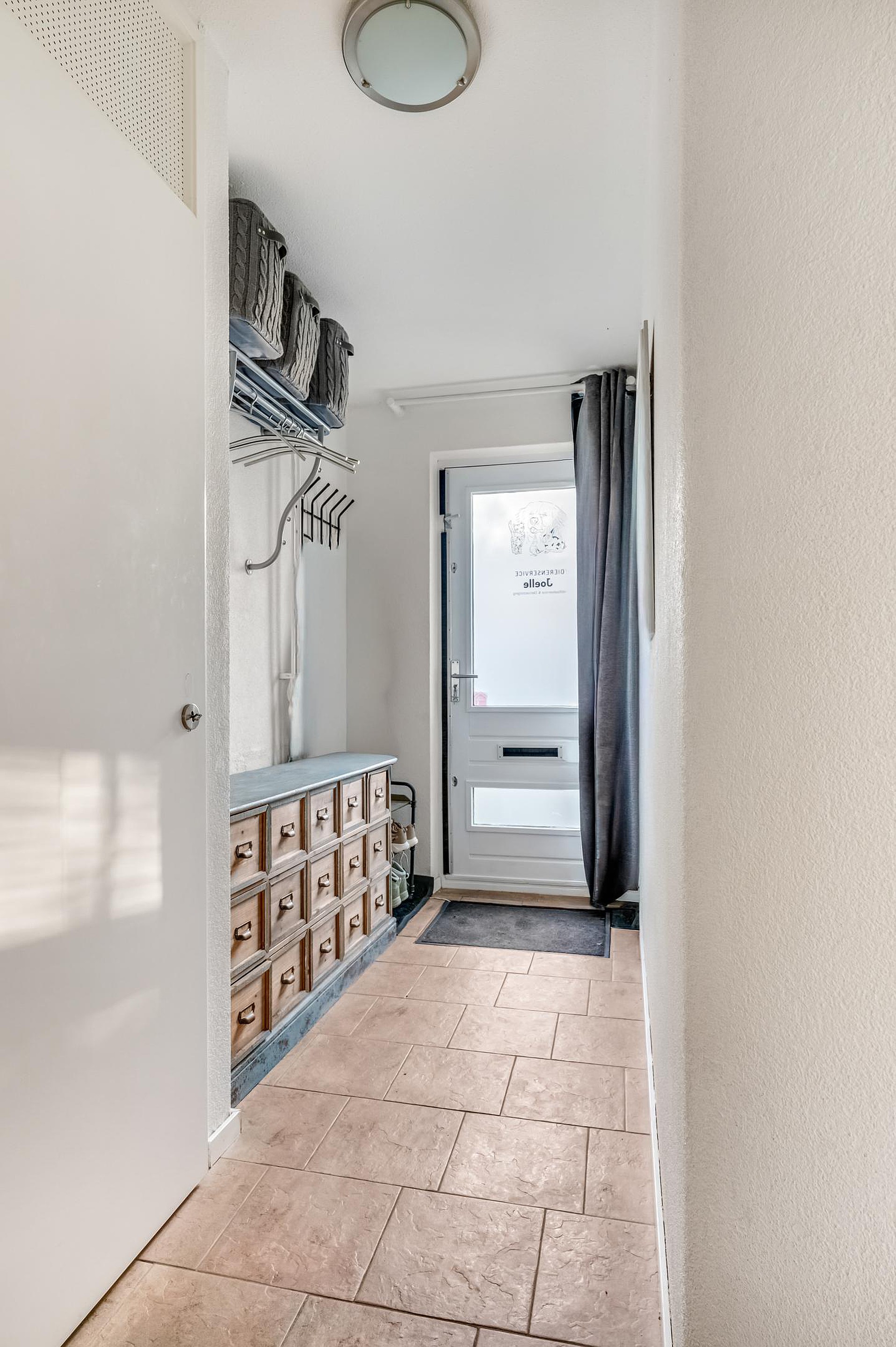 De woning is zowel aan de voorzijde als aan de achterzijde goed toegankelijk. Via de voordeur betreed je de woning en kom je in de hal met hierin de meterkast, de ruime vernieuwde moderne toiletruimte met zwevend toilet en fonteintje en de trapopgang naar de 1e verdieping.