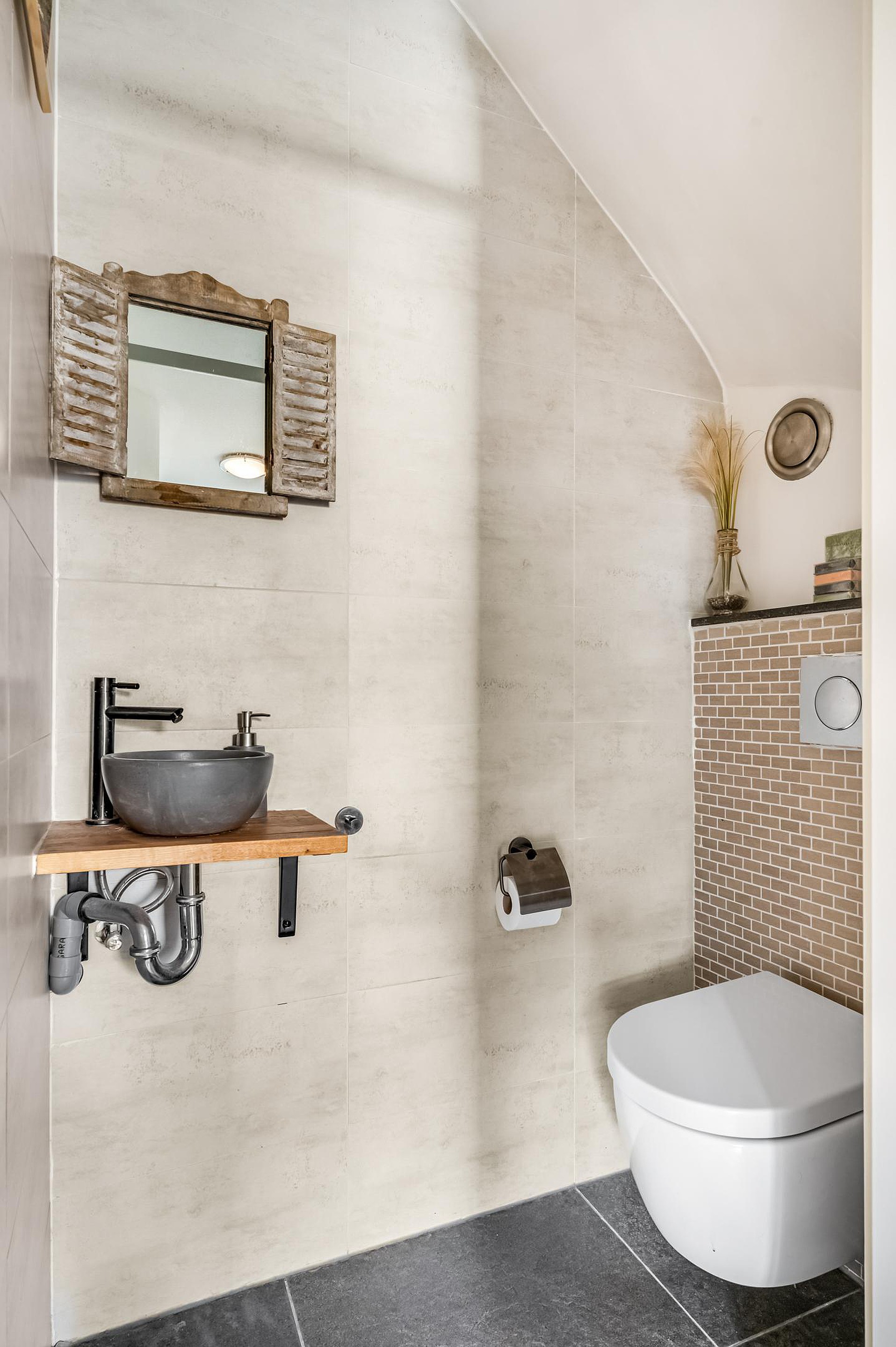 Via de vaste trap bereik je eerst de overloop, het technische hart van de woning. Hier bevinden zich een werkblad met spoelbak, de aansluitingen voor wasmachine