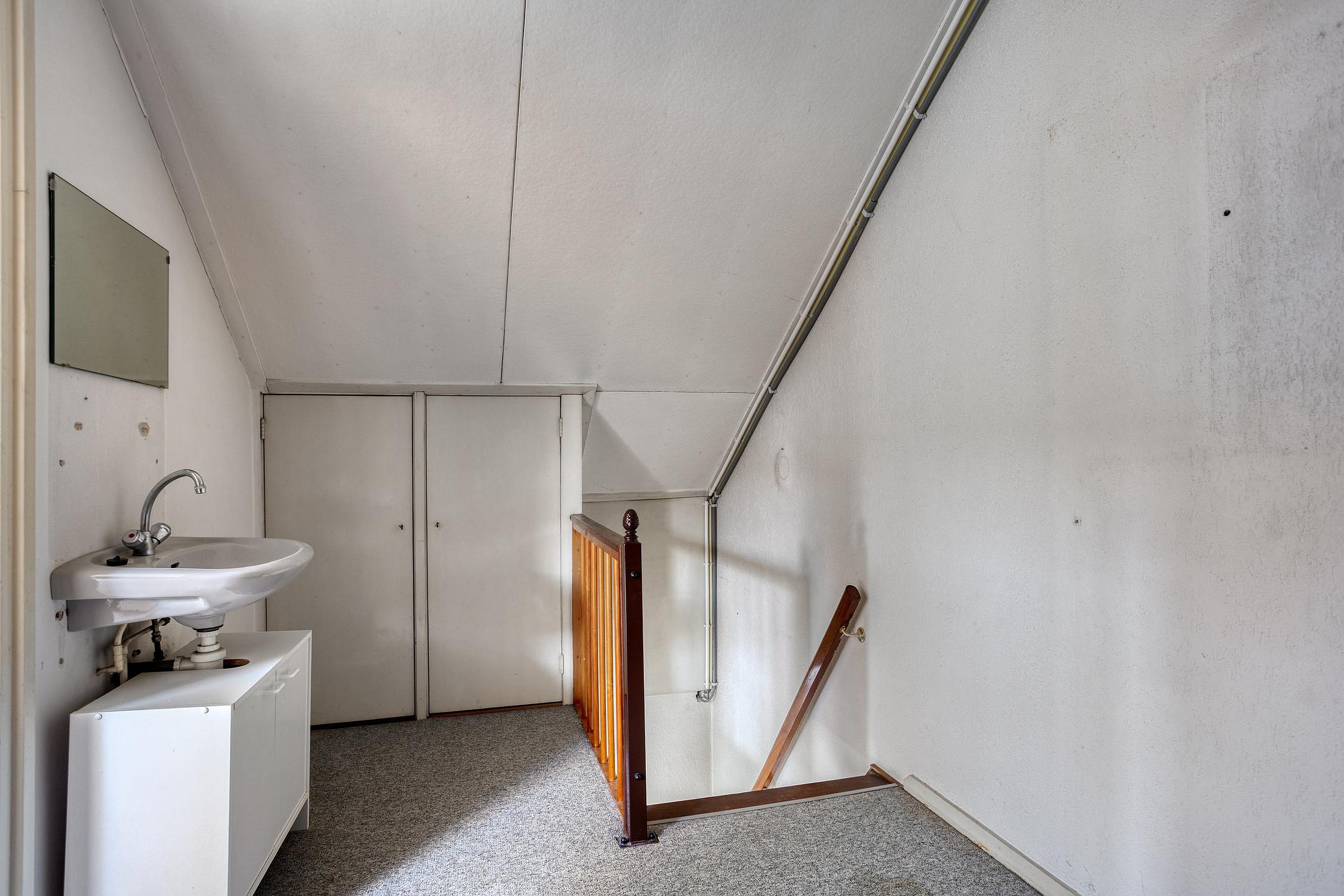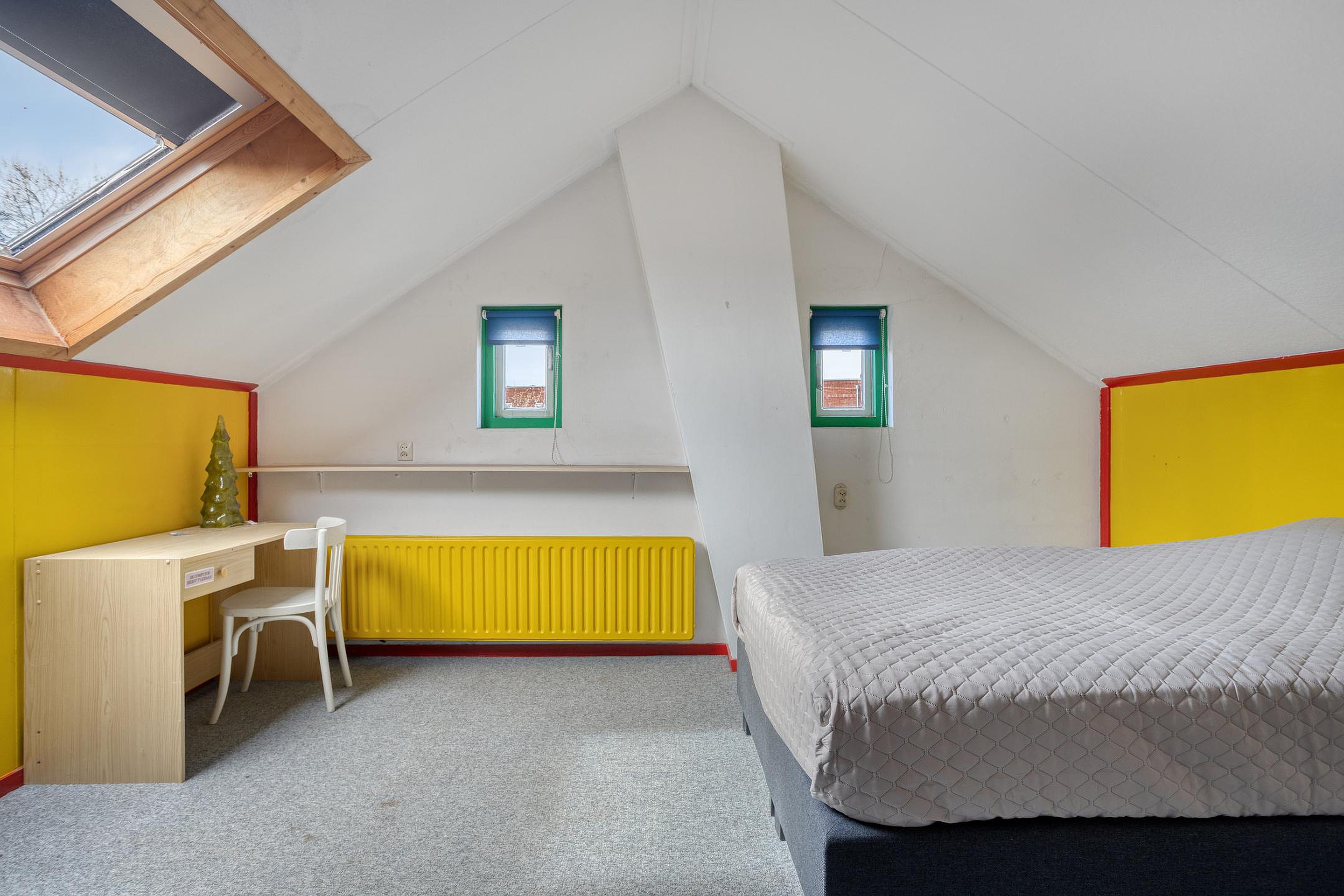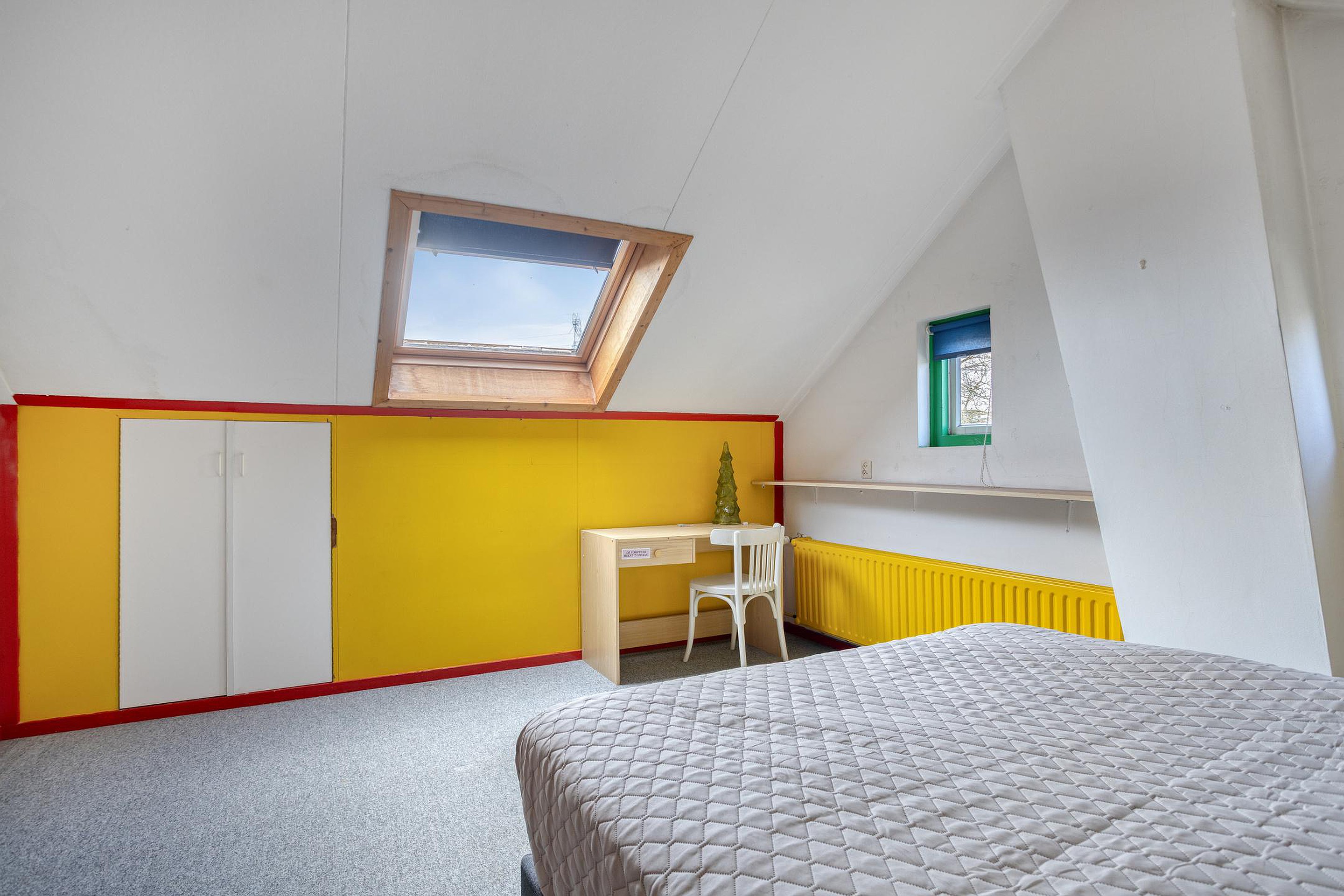 Aan de overloop grenst een derde slaapkamer, gelegen onder de schuine kap. Ook deze kamer is van een ruim formaat en vangt veel licht door het dakraam en een tweetal zijraampjes. Op deze verdieping is extra bergruimte te vinden achter de knieschotten.