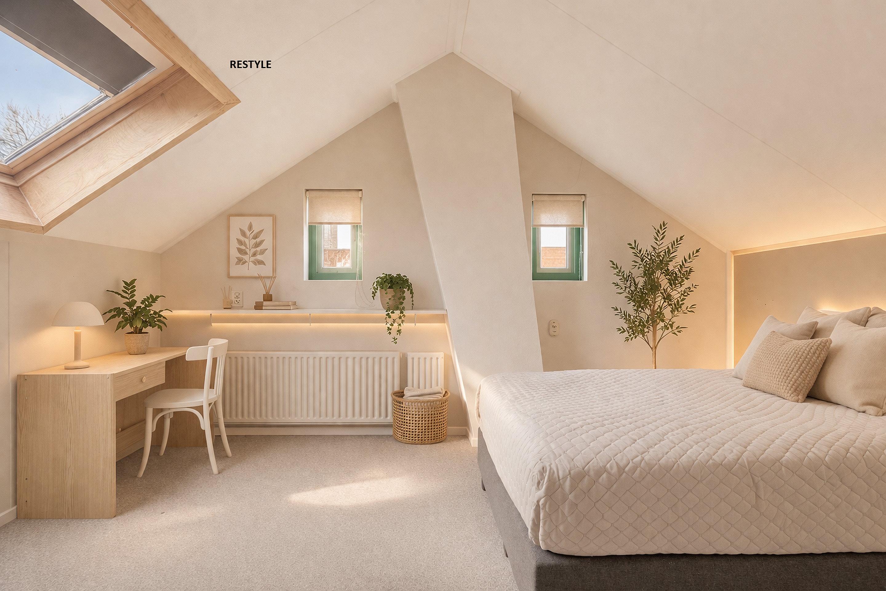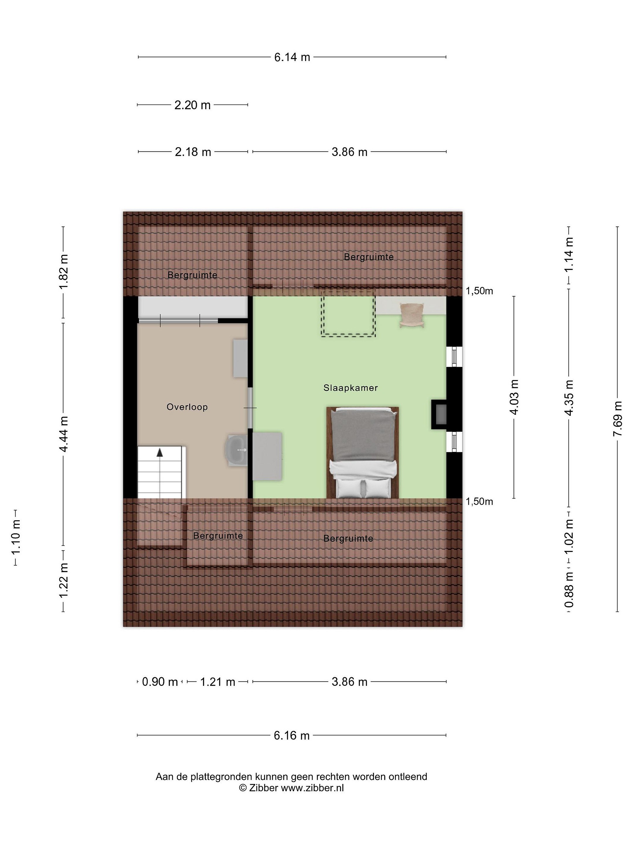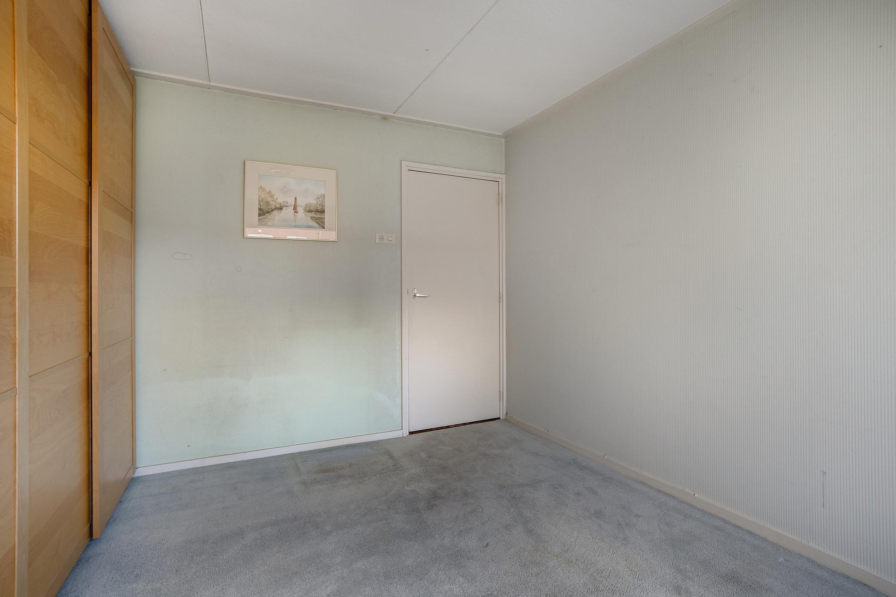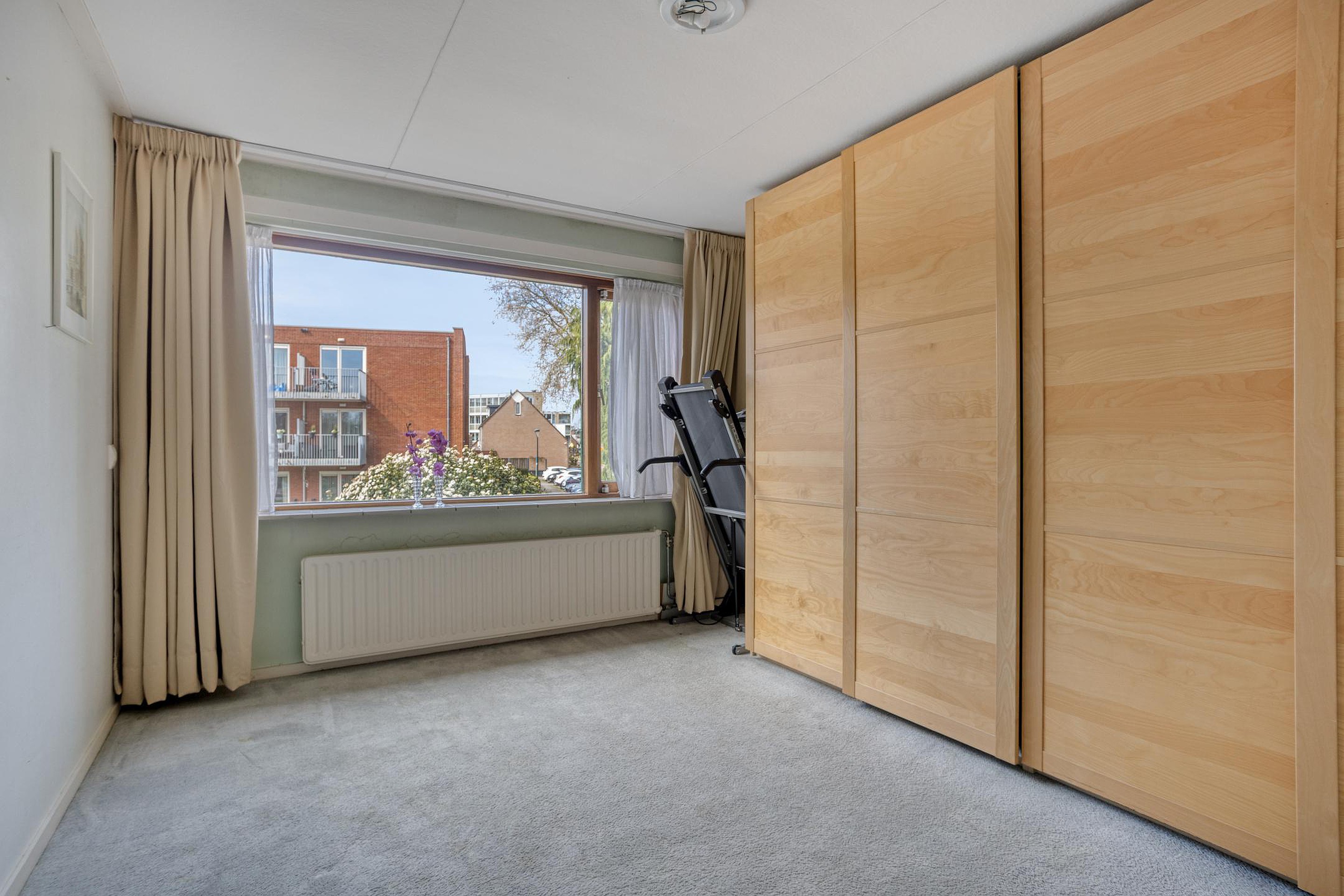 Aan de overloop grenst een derde slaapkamer, gelegen onder de schuine kap. Ook deze kamer is van een ruim formaat en vangt veel licht door het dakraam en een tweetal zijraampjes. Op deze verdieping is extra bergruimte te vinden achter de knieschotten.