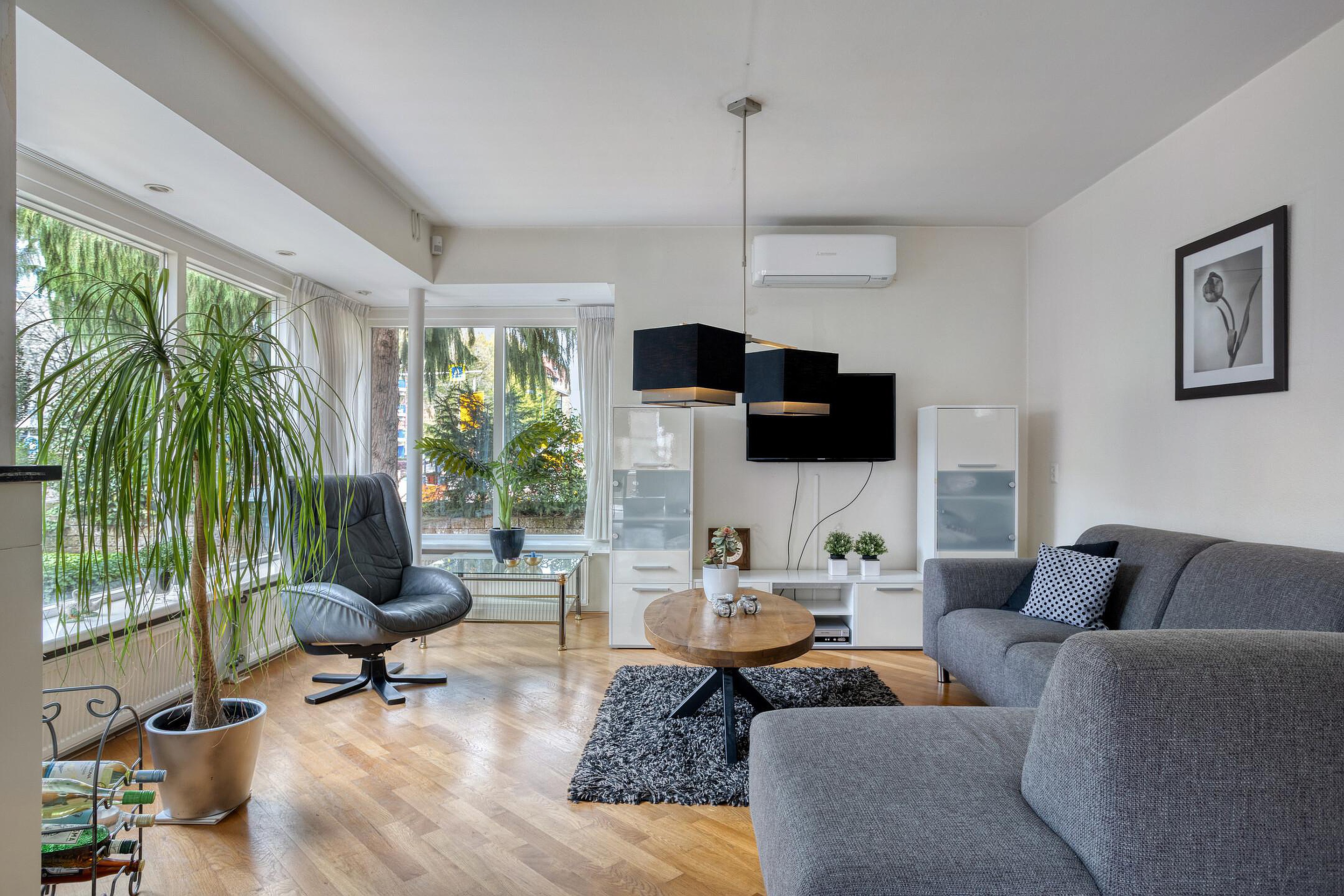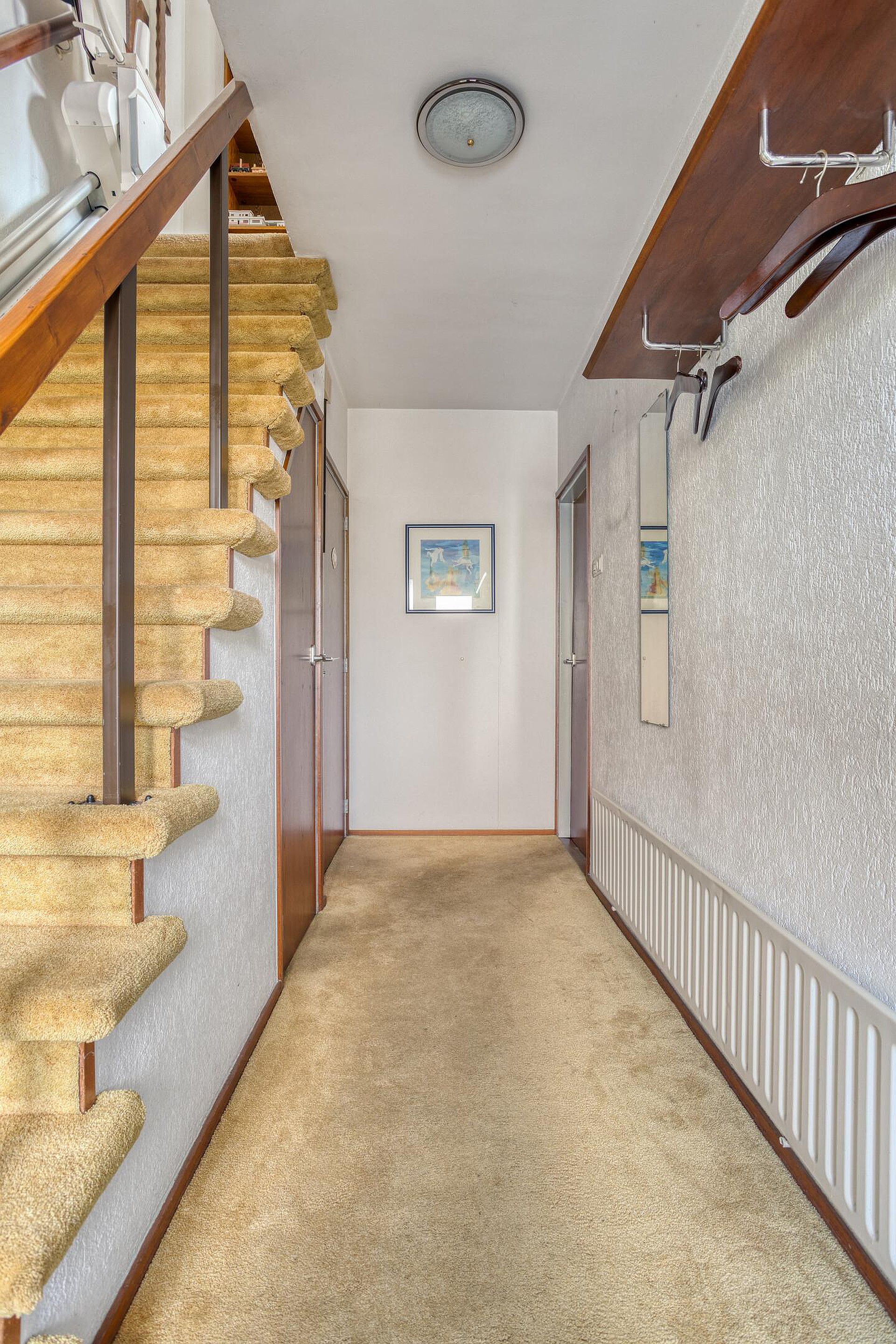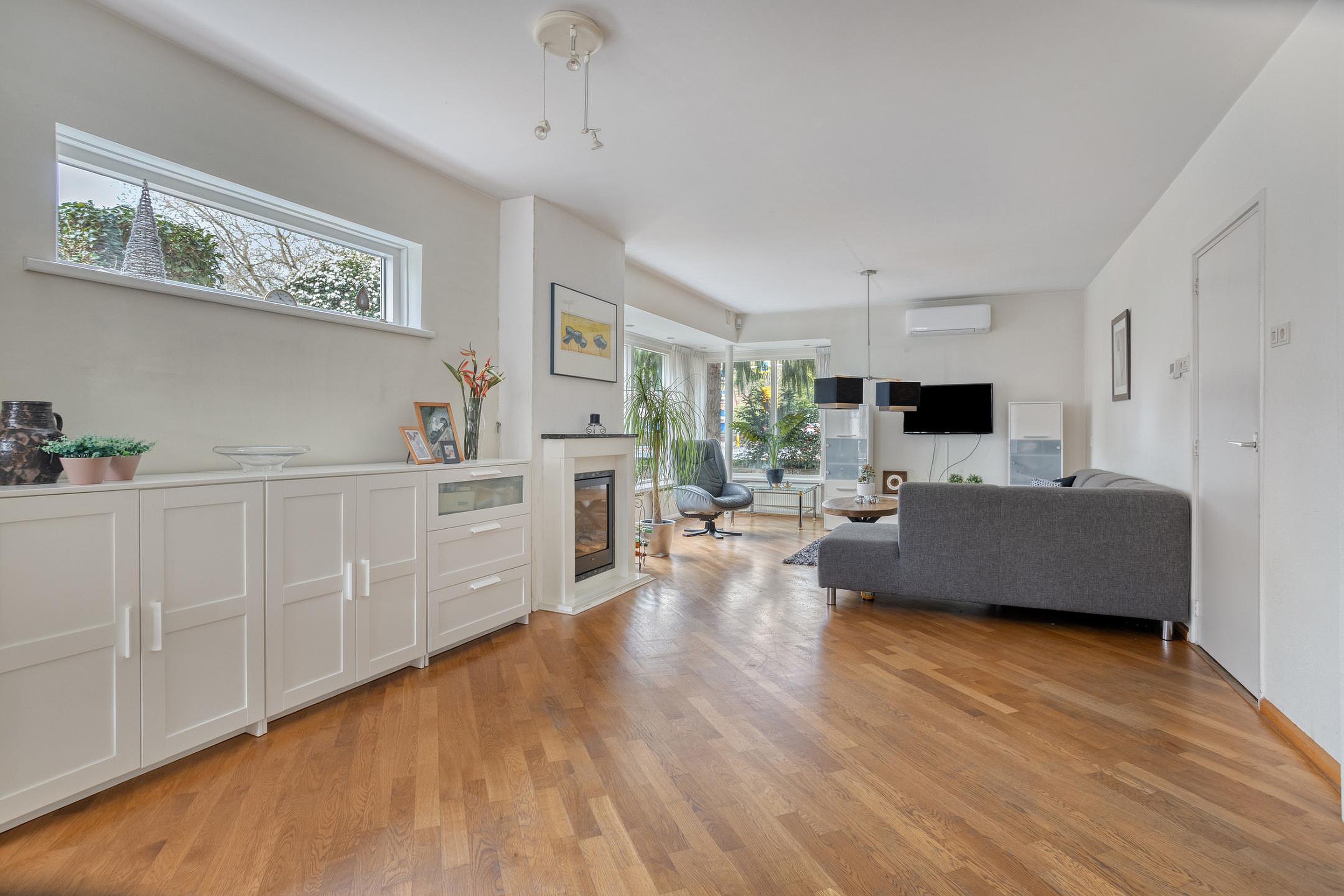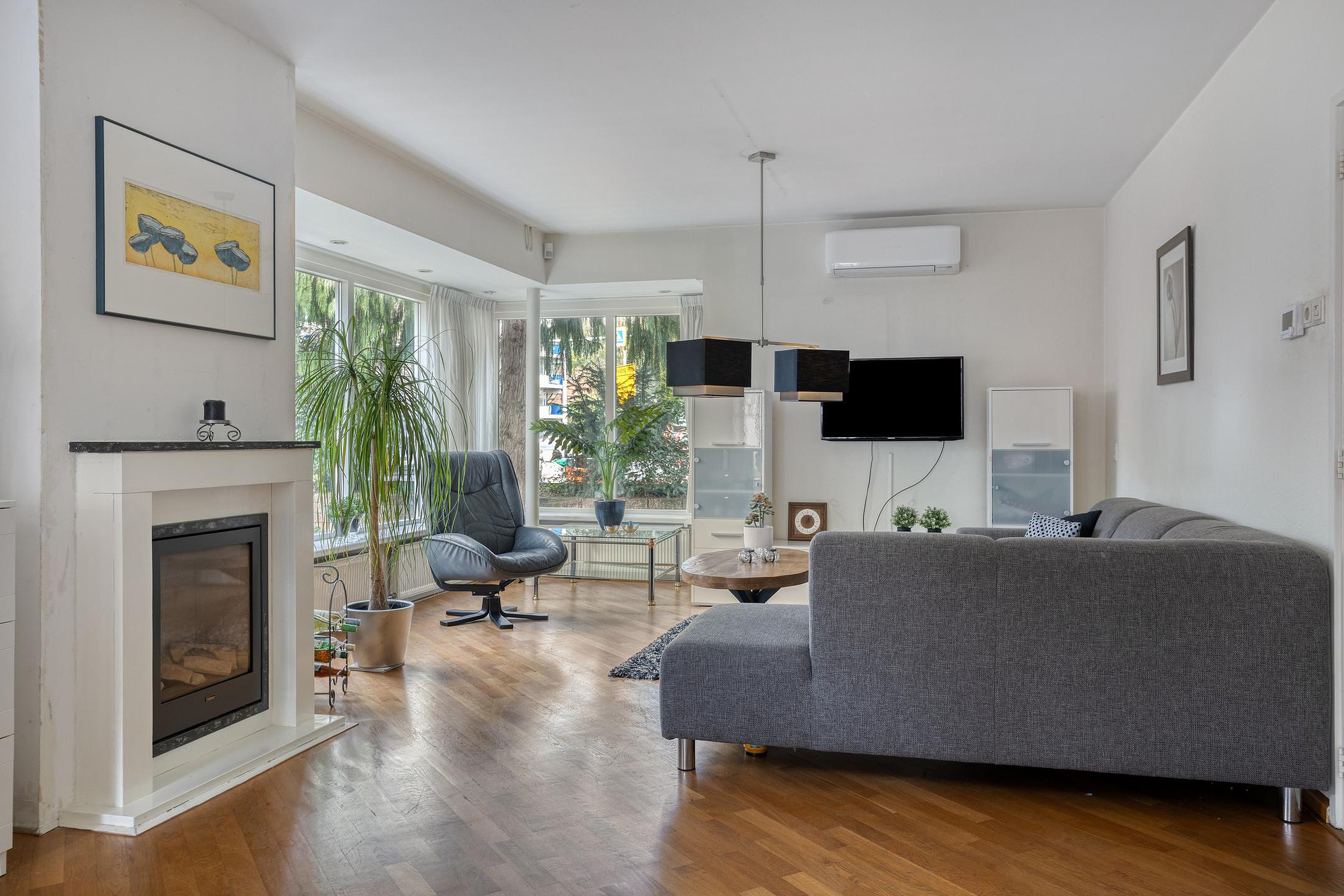 Via de entree komt u binnen in de hal, waar zich het toilet, de trapopgang en een handige trapkast bevinden. Vanuit hier loopt u door naar de woonkamer, waar grote ramen zorgen voor een rijke lichtinval. De houten vloer en de sfeerhaard geven het geheel een warme uitstraling, terwijl de airconditioning zorgt voor een aangenaam binnenklimaat.