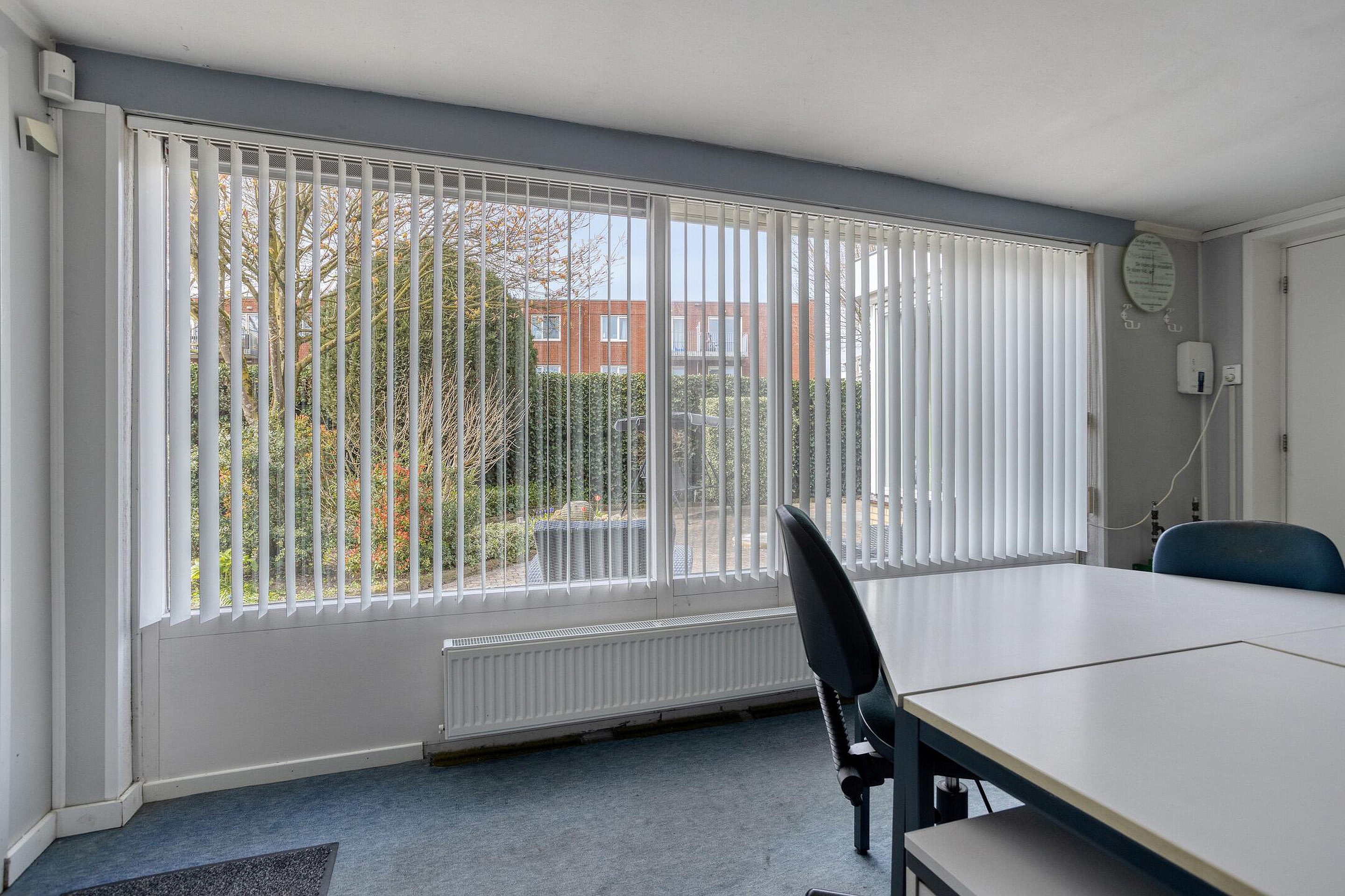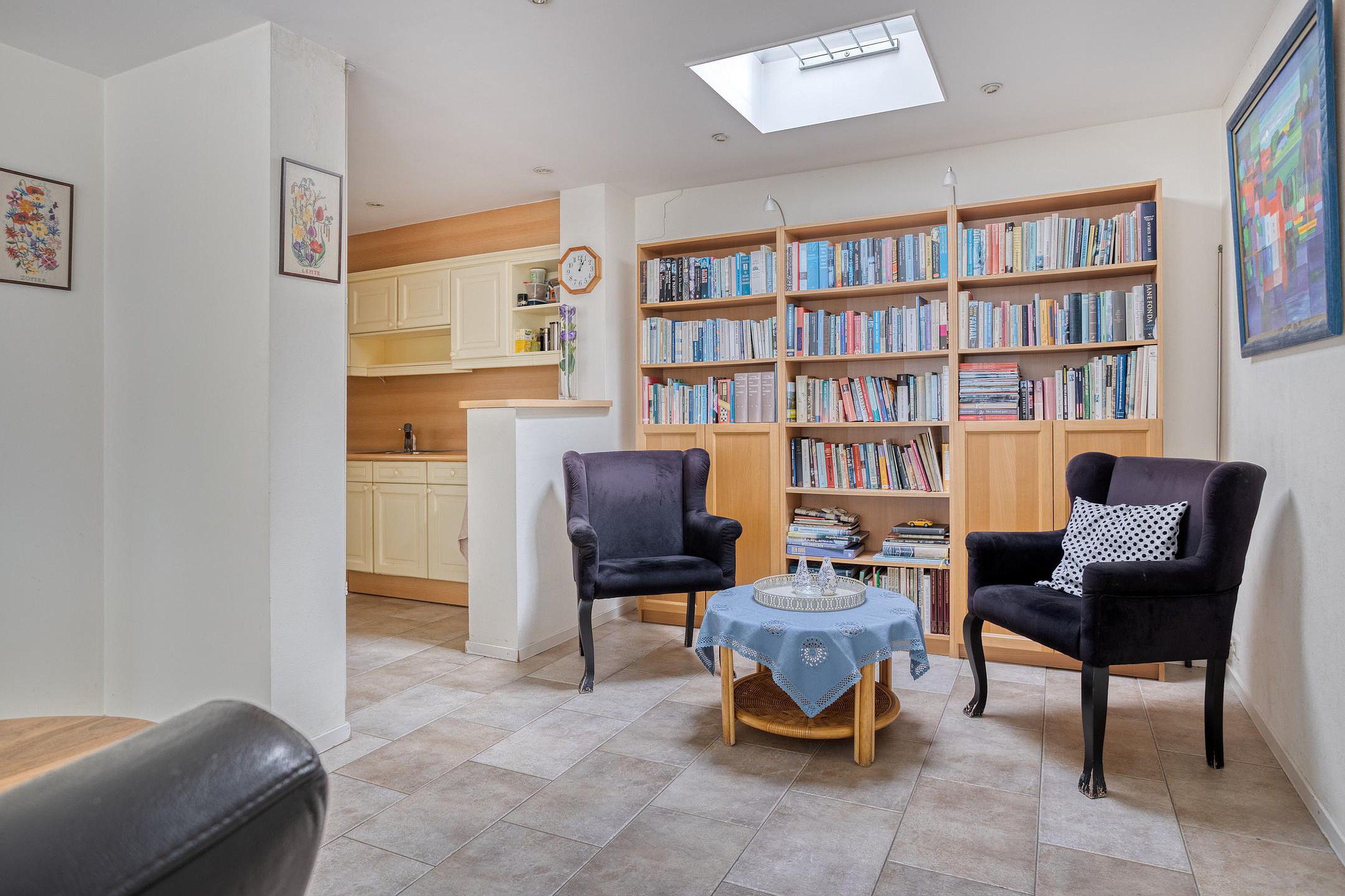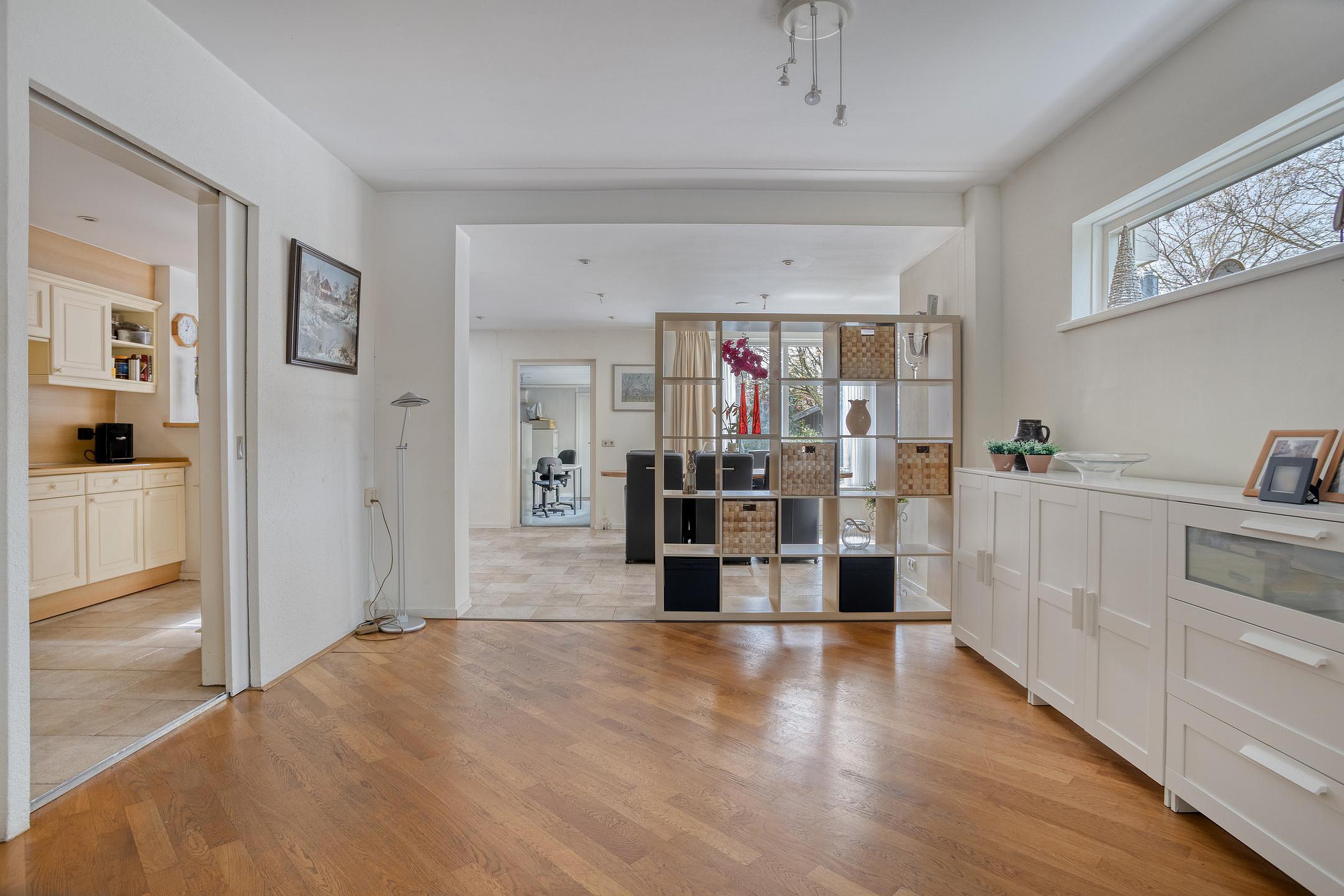 De keuken ligt aansluitend en is praktisch opgezet met voldoende werk- en kastruimte en diverse apparatuur, zoals een inductiekookplaat, ingebouwde afzuigkap, oven, koelkast en vaatwasser. Vanuit de keuken is er toegang tot de extra kamer aan de achterzijde. Deze ruimte is ideaal als werk- of praktijkruimte en beschikt eveneens over airconditioning, waardoor deze ook bij intensief gebruik comfortabel blijft.