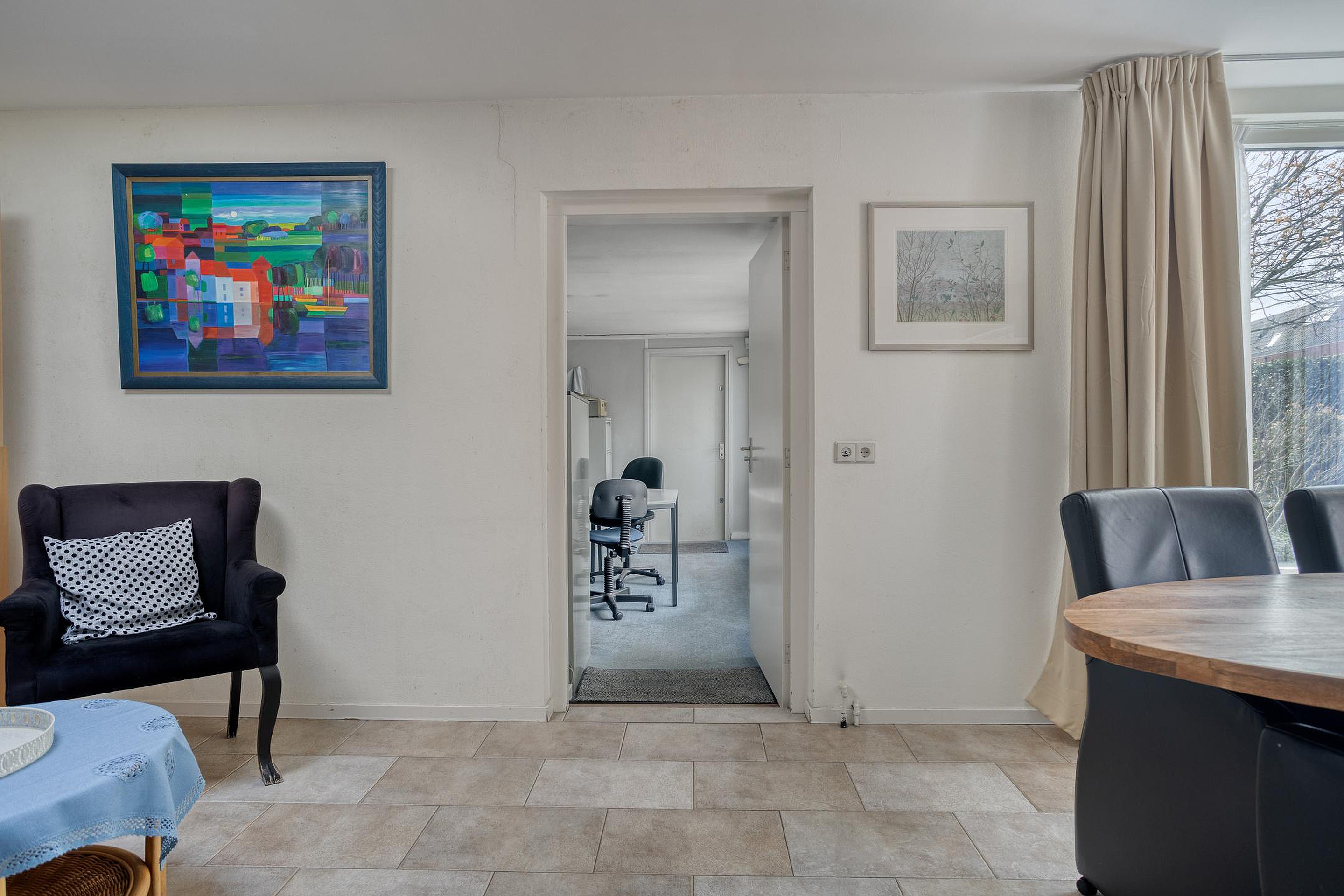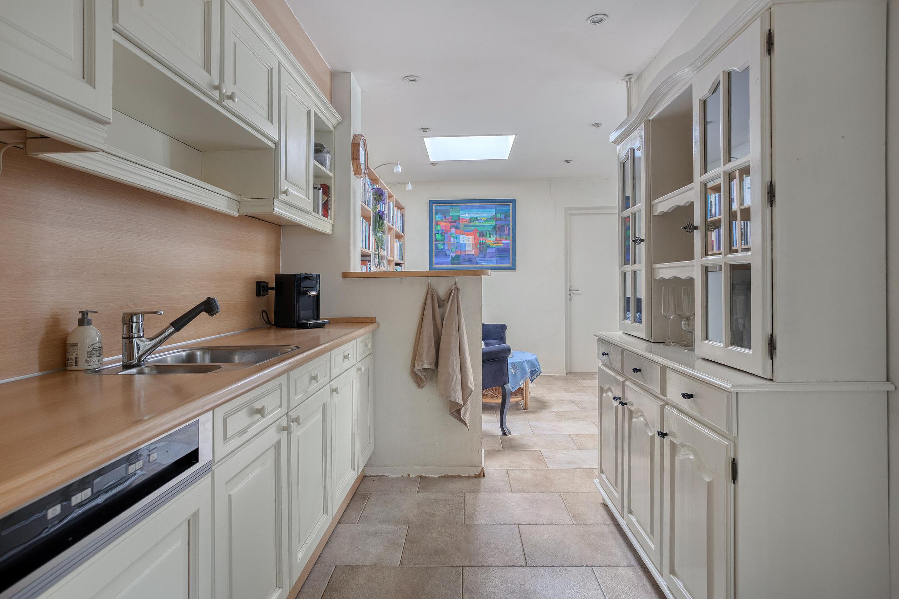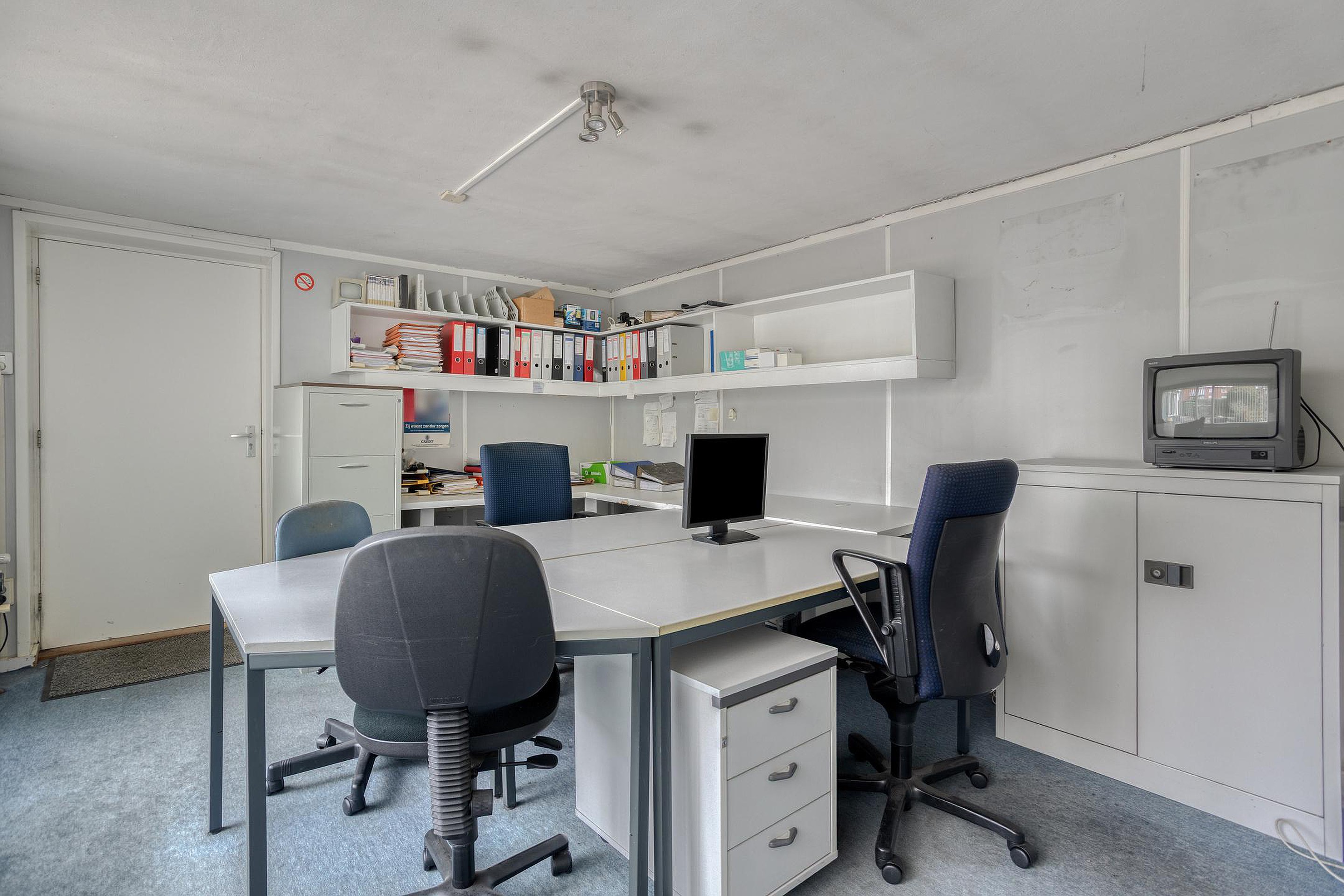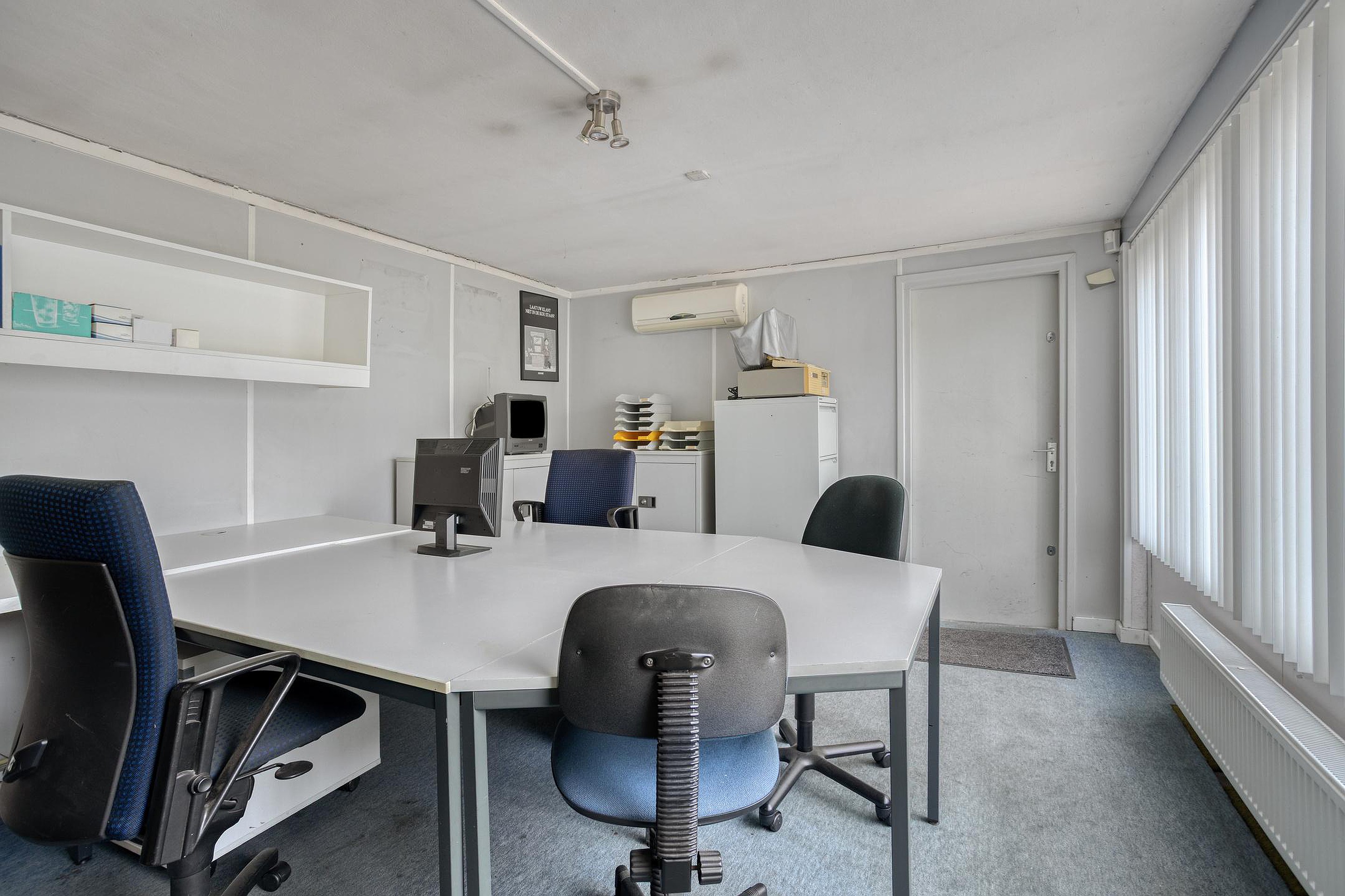 De keuken ligt aansluitend en is praktisch opgezet met voldoende werk- en kastruimte en diverse apparatuur, zoals een inductiekookplaat, ingebouwde afzuigkap, oven, koelkast en vaatwasser. Vanuit de keuken is er toegang tot de extra kamer aan de achterzijde. Deze ruimte is ideaal als werk- of praktijkruimte en beschikt eveneens over airconditioning, waardoor deze ook bij intensief gebruik comfortabel blijft.