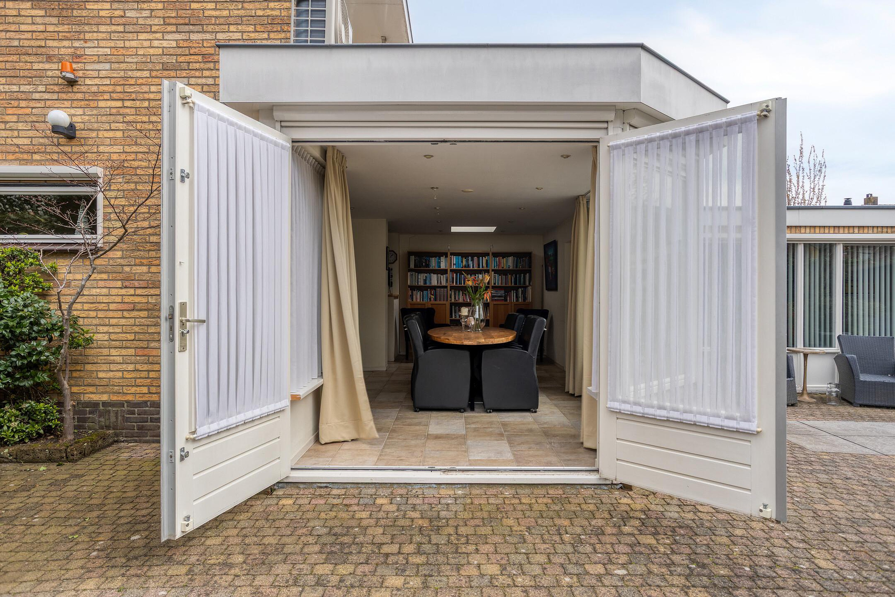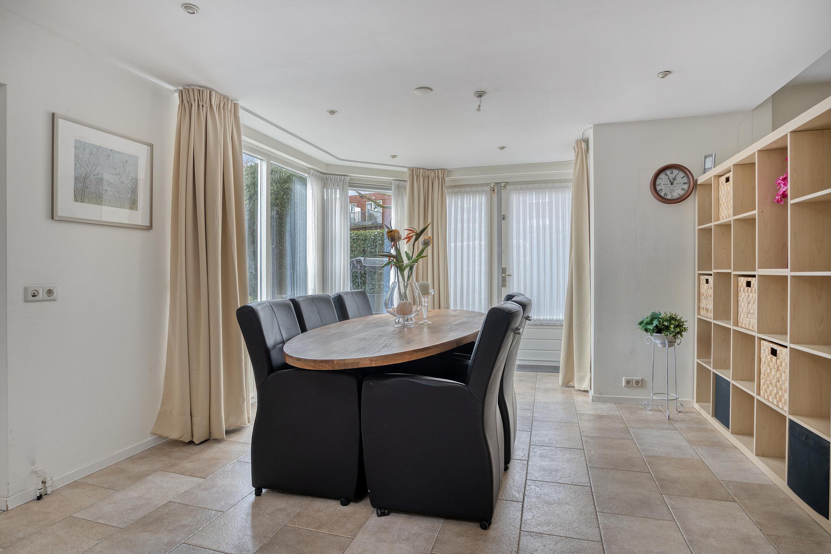 Aan de achterzijde sluit de eetkamer aan, die in directe verbinding staat met de tuin. Dit gedeelte voelt open en licht aan en vormt een fijne plek voor lange avonden aan tafel.