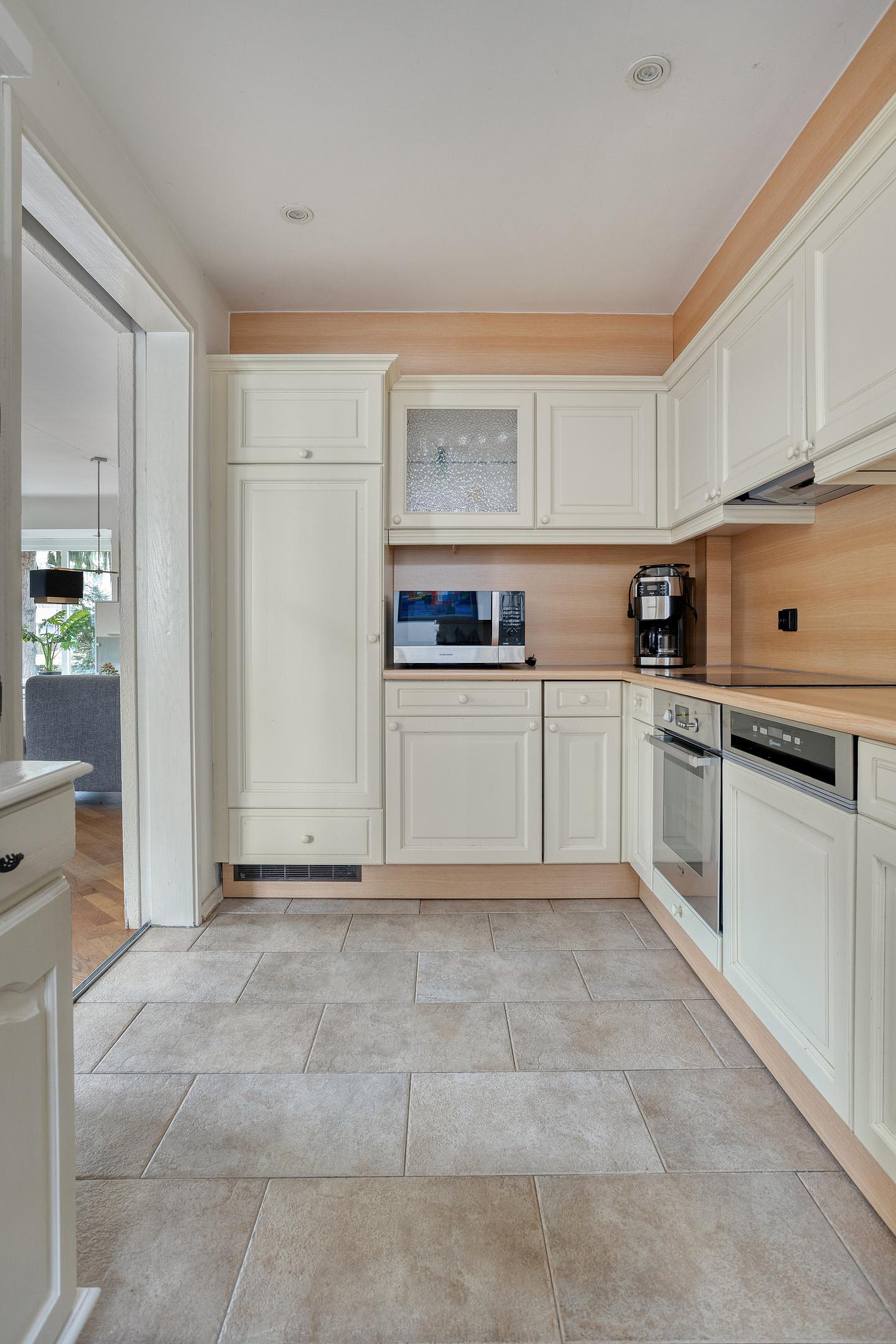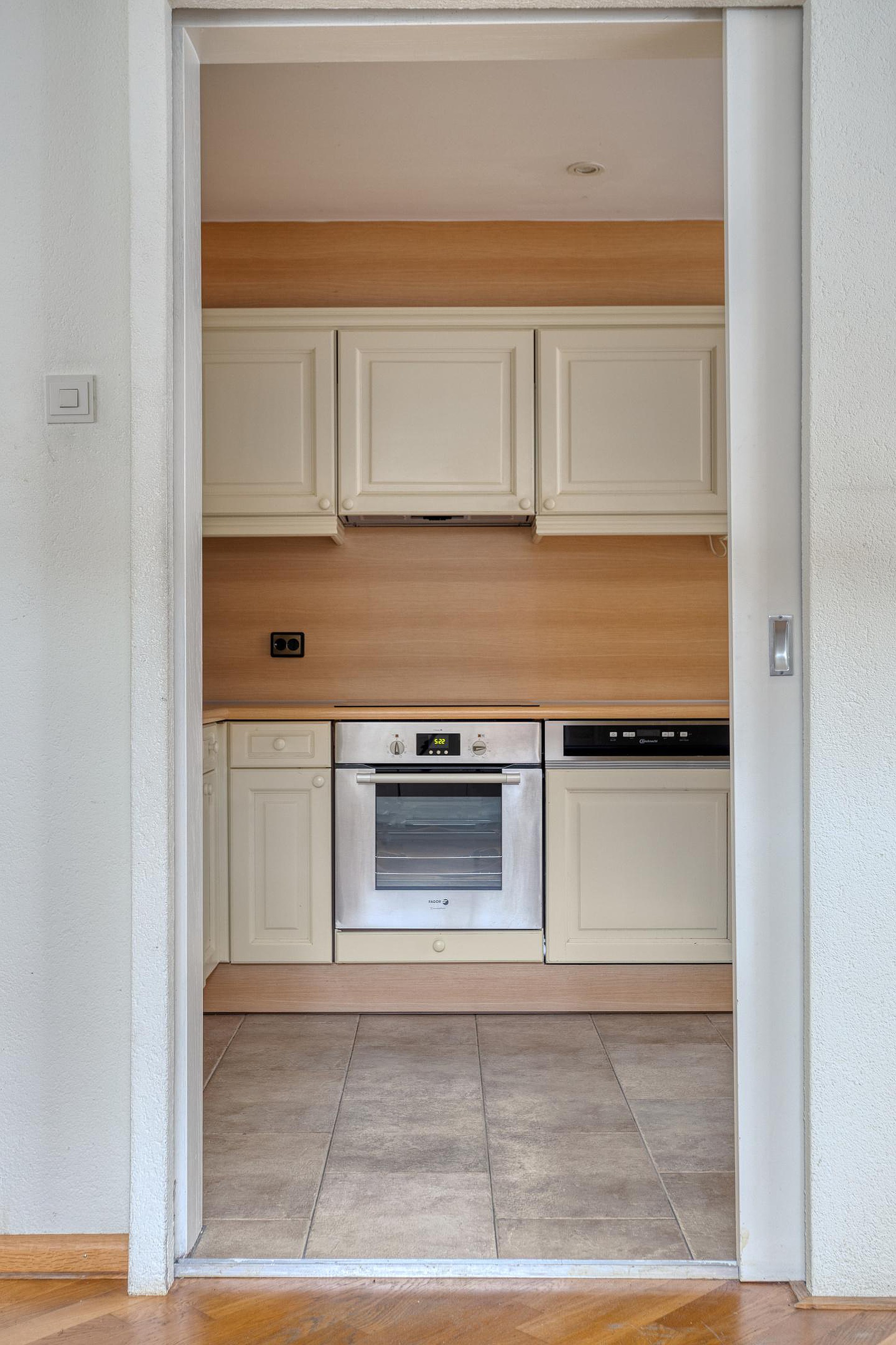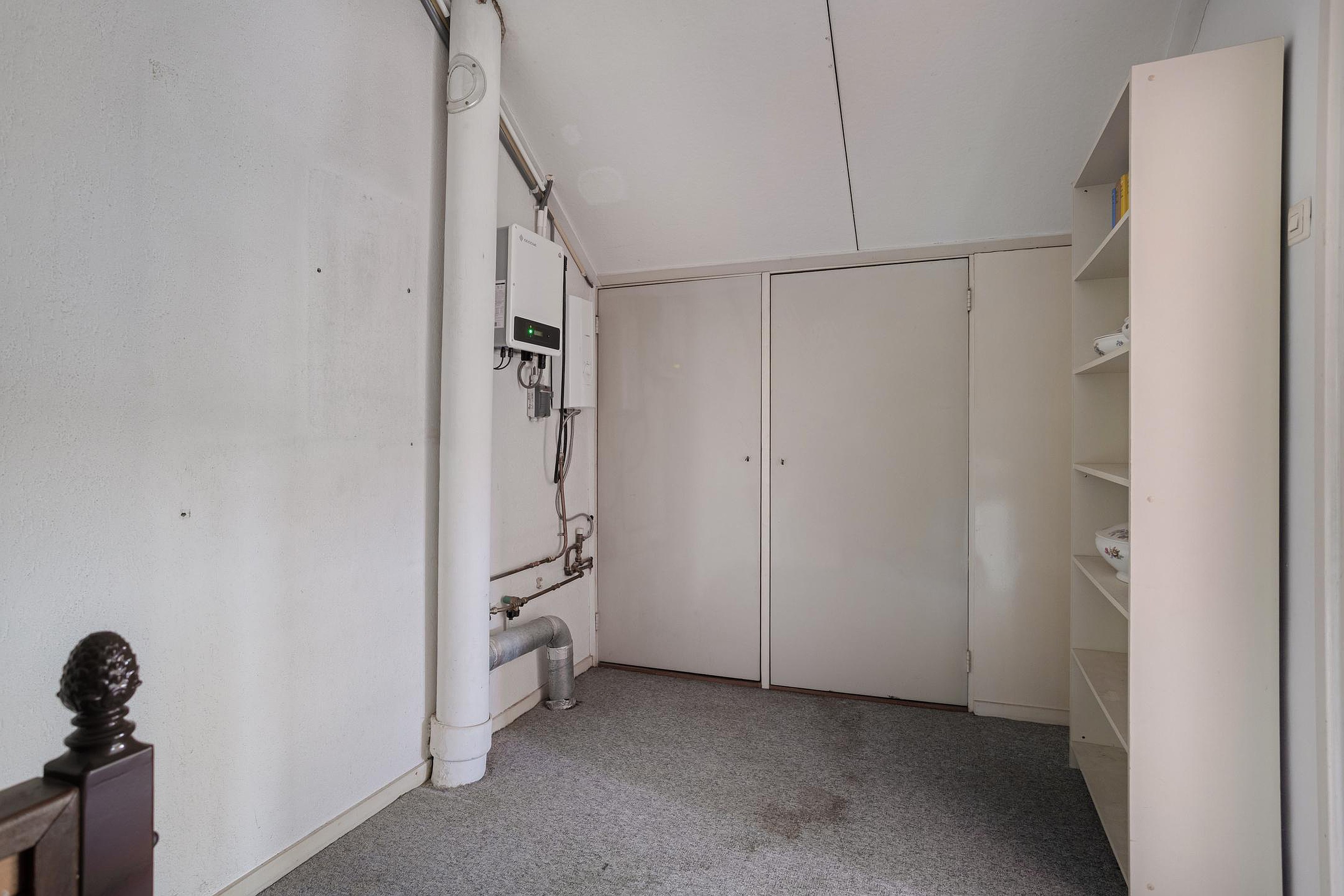 Aansluitend bereikt u een tussengang, voorzien van bergkast en een loopdeur richting de garage en de tuin.