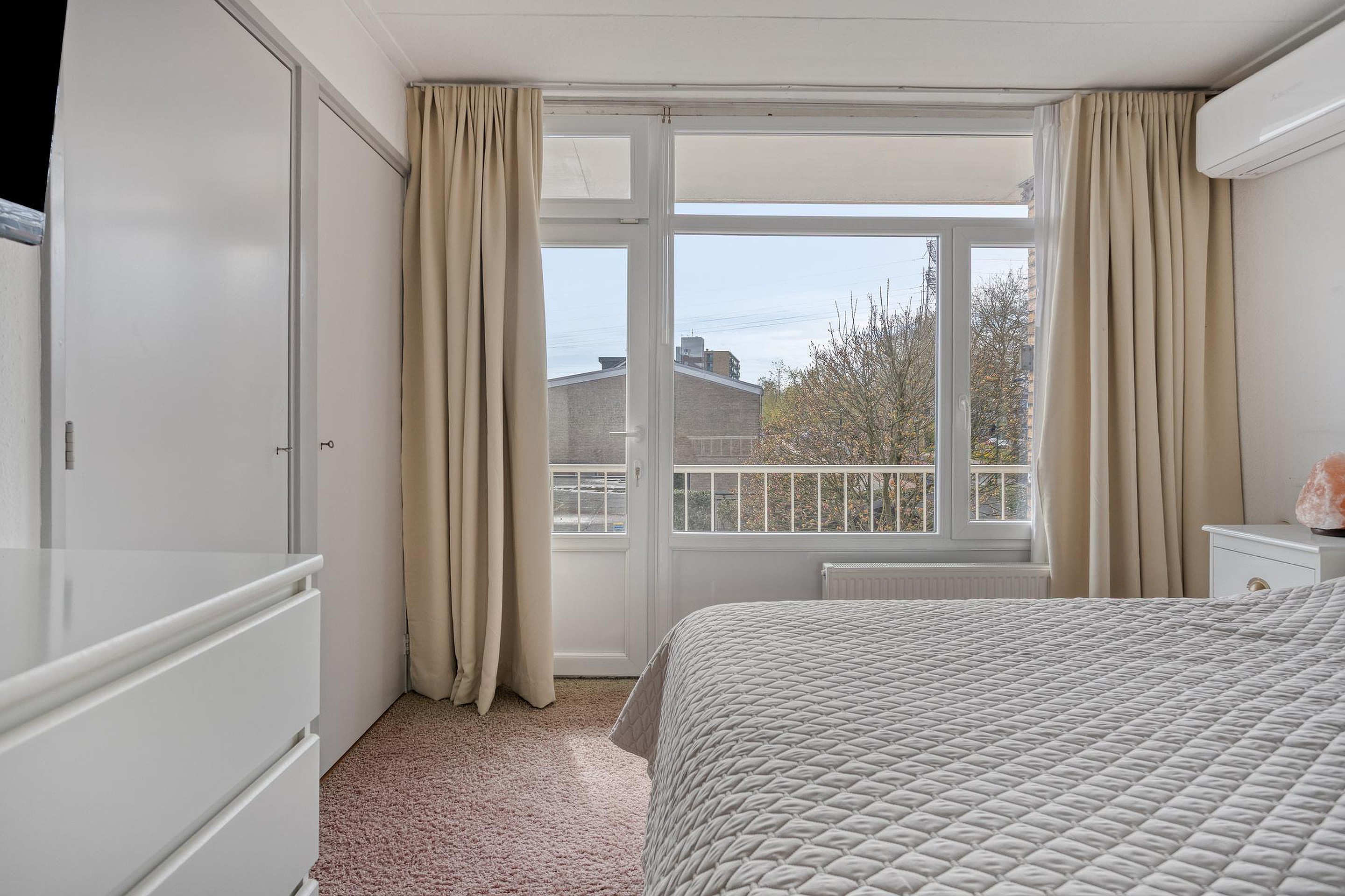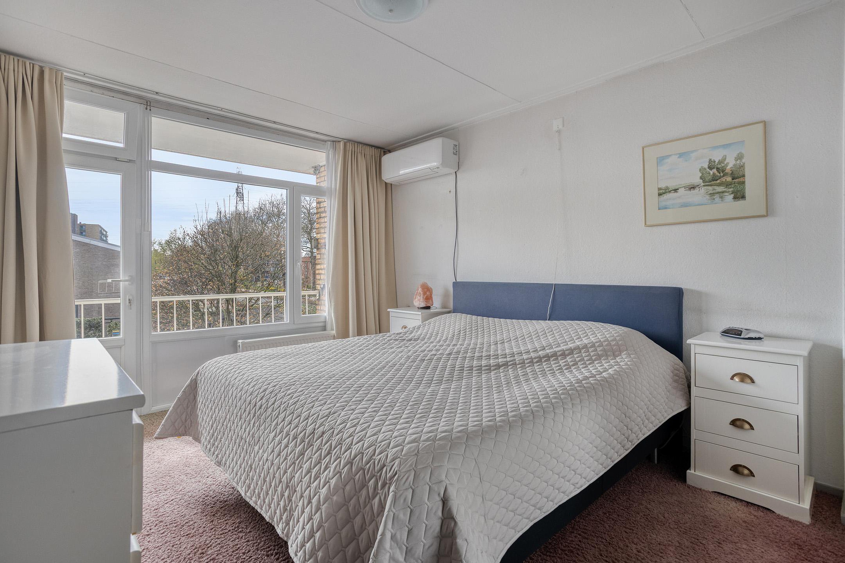 Op de eerste verdieping bevinden zich twee slaapkamers en de badkamer. De hoofdslaapkamer ligt aan de achterzijde en beschikt over vaste kasten, airconditioning en directe toegang tot het balkon. Dit maakt het een bijzonder complete en comfortabele ruimte. Ook de tweede slaapkamer is van een goed formaat en flexibel in te richten.