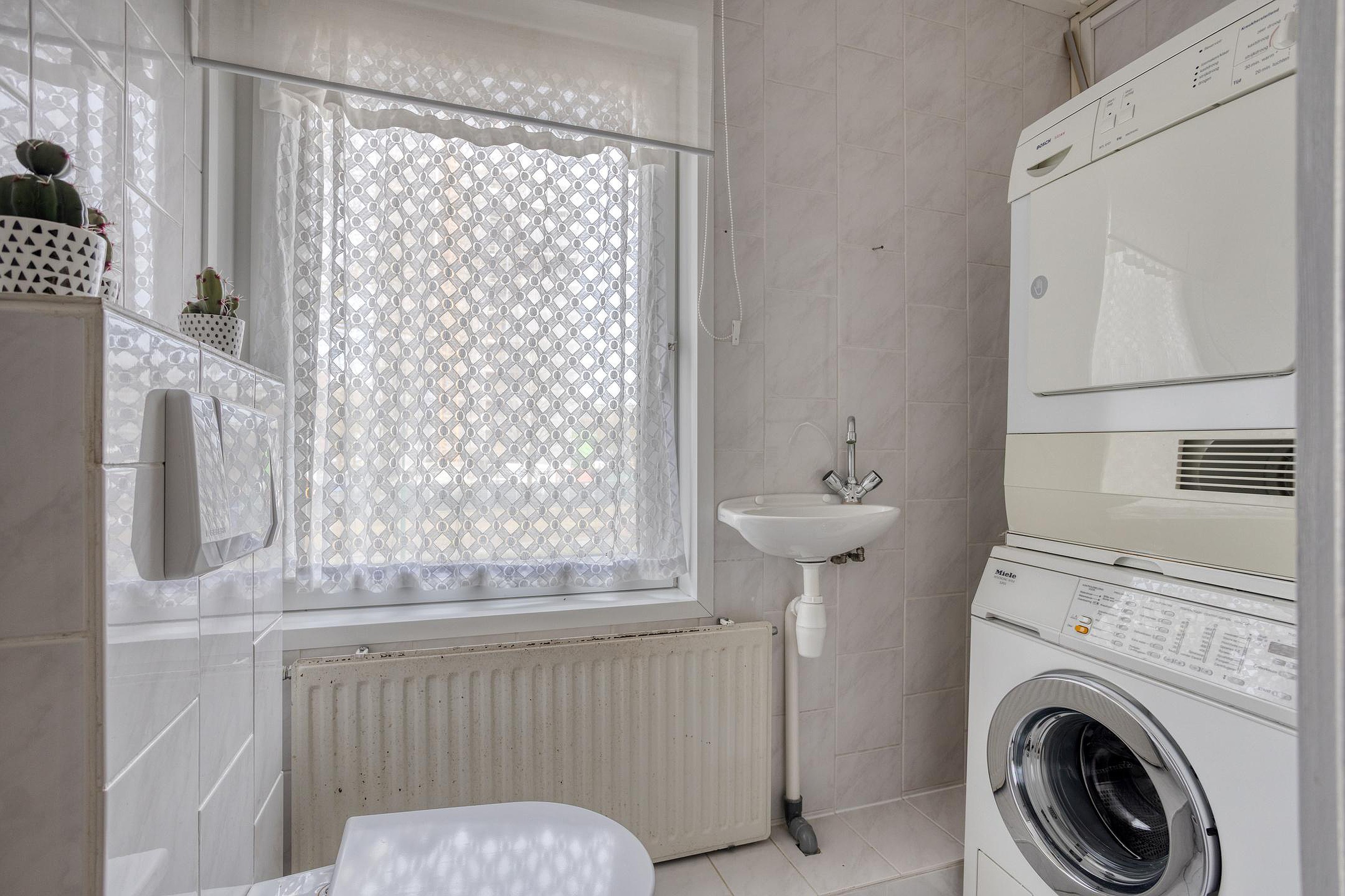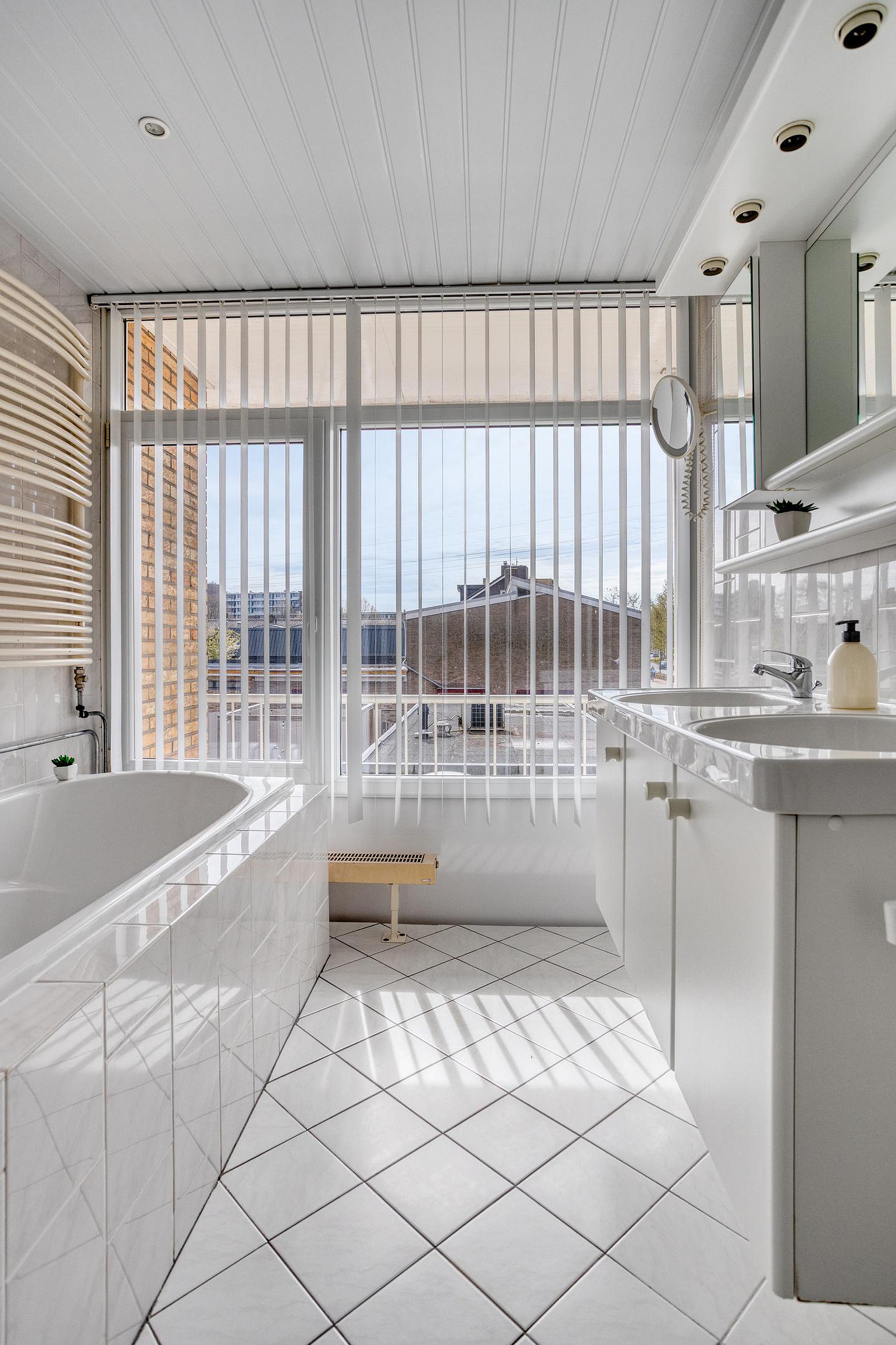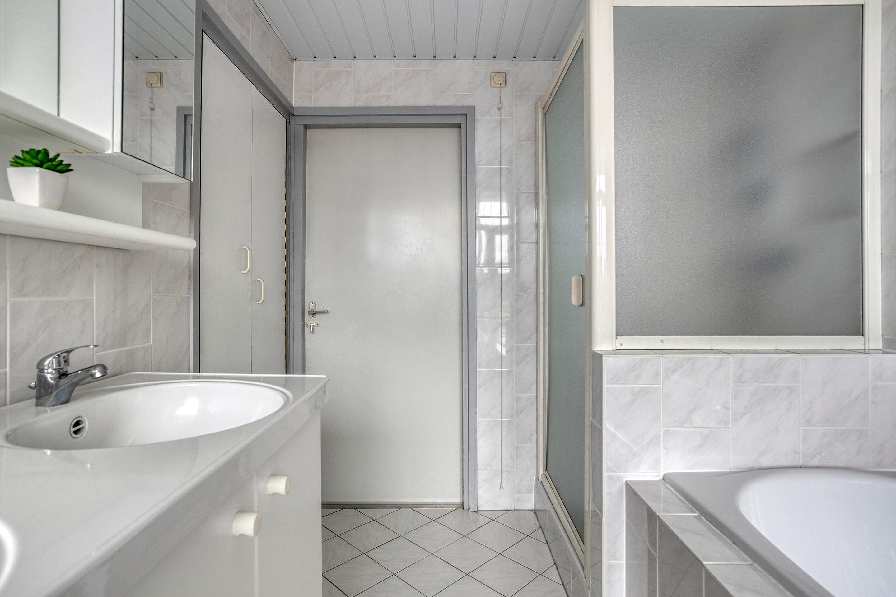De badkamer is geheel betegeld en voorzien van een ligbad, separate douche, wastafelmeubel met dubbele wasbak en veel opbergruimte. Dankzij de grote raampartij is het hier opvallend licht. Aan de overloop grenst ook een separate toiletruimte met wandcloset, fonteintje en de aansluitingen voor wasapparatuur.
