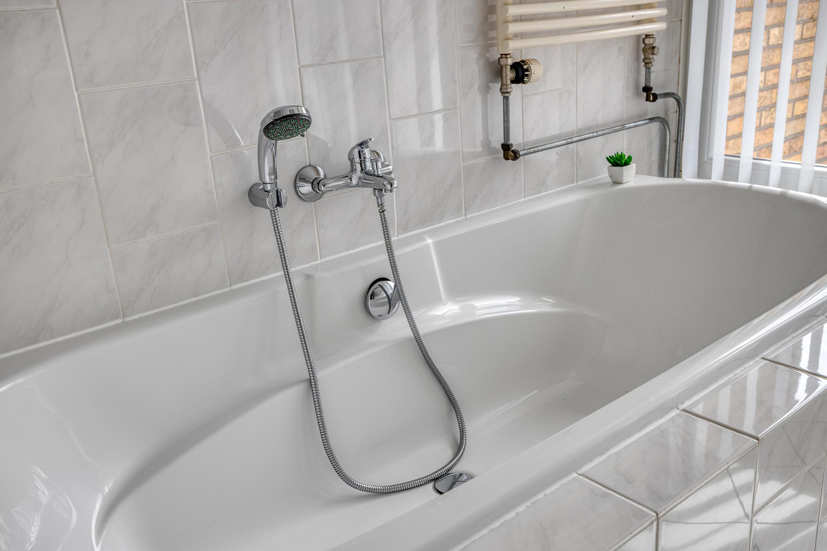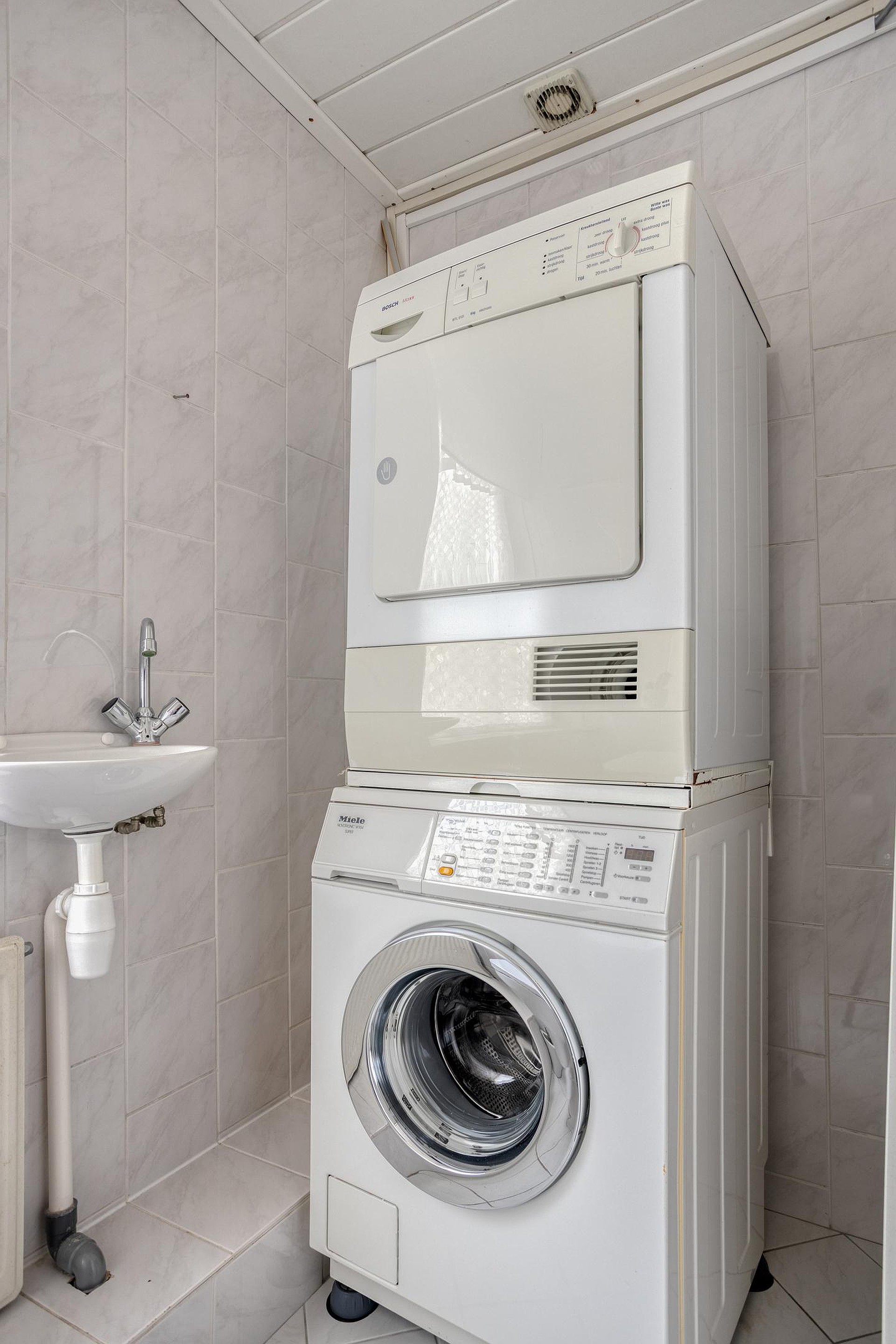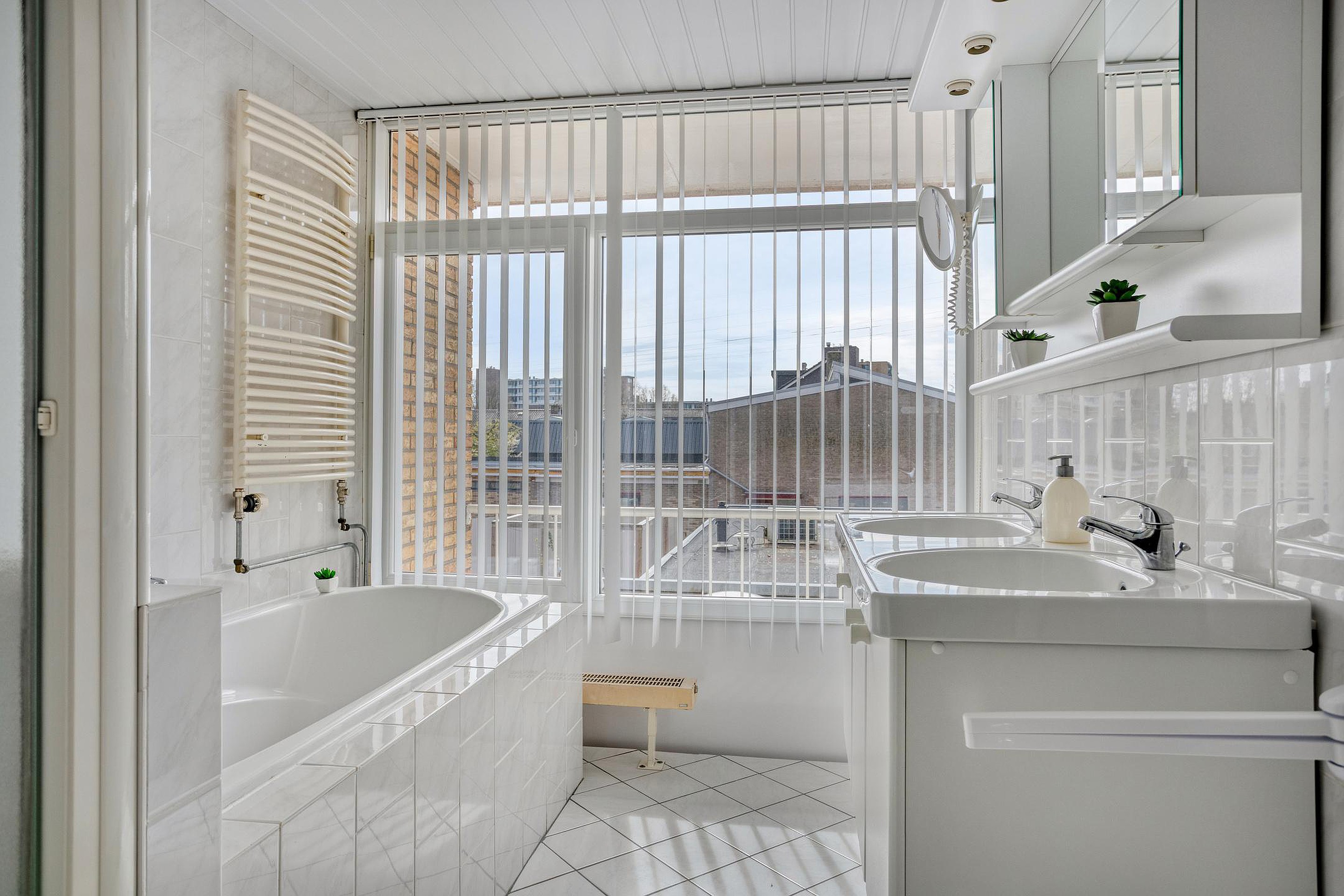 De badkamer is geheel betegeld en voorzien van een ligbad, separate douche, wastafelmeubel met dubbele wasbak en veel opbergruimte. Dankzij de grote raampartij is het hier opvallend licht. Aan de overloop grenst ook een separate toiletruimte met wandcloset, fonteintje en de aansluitingen voor wasapparatuur.