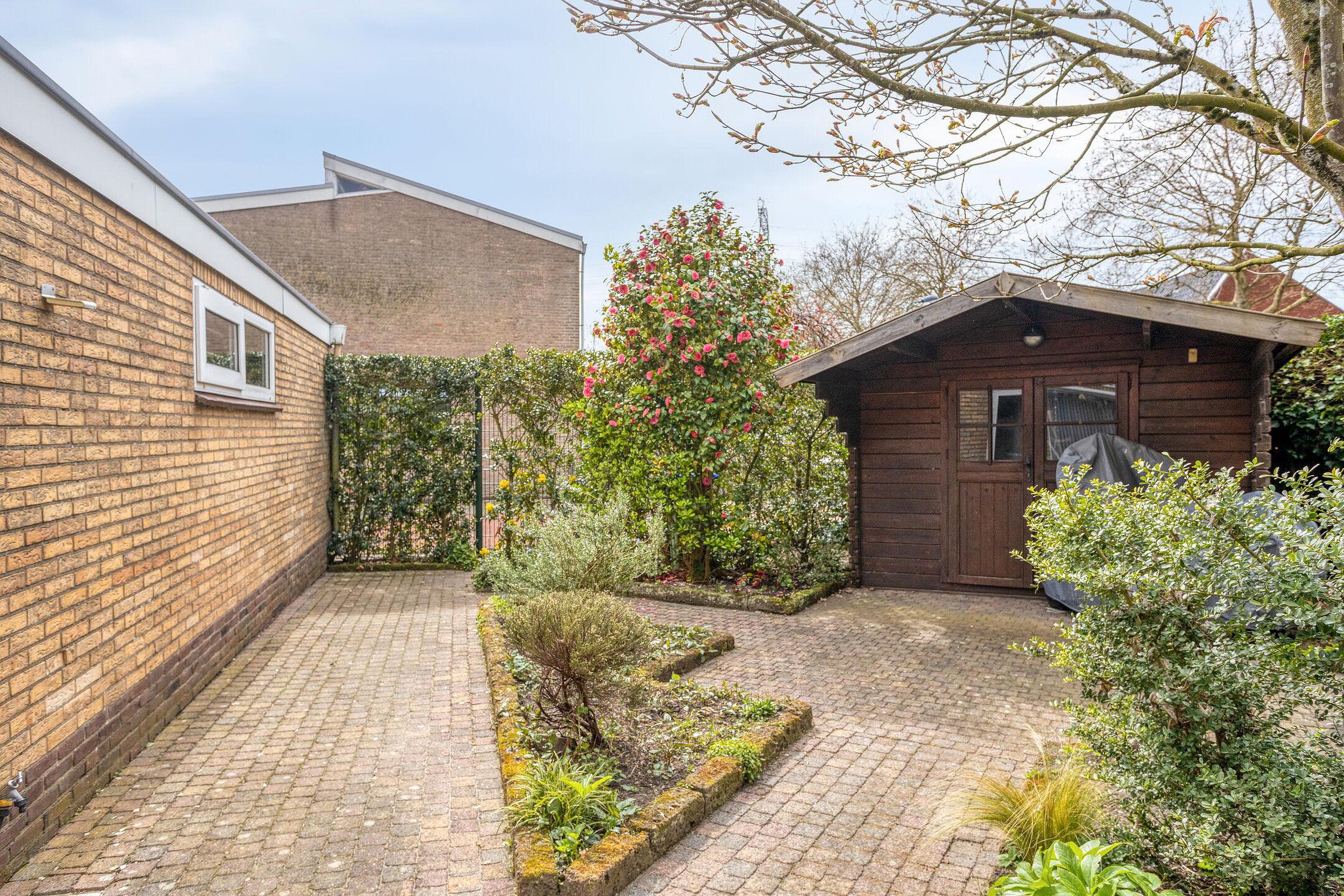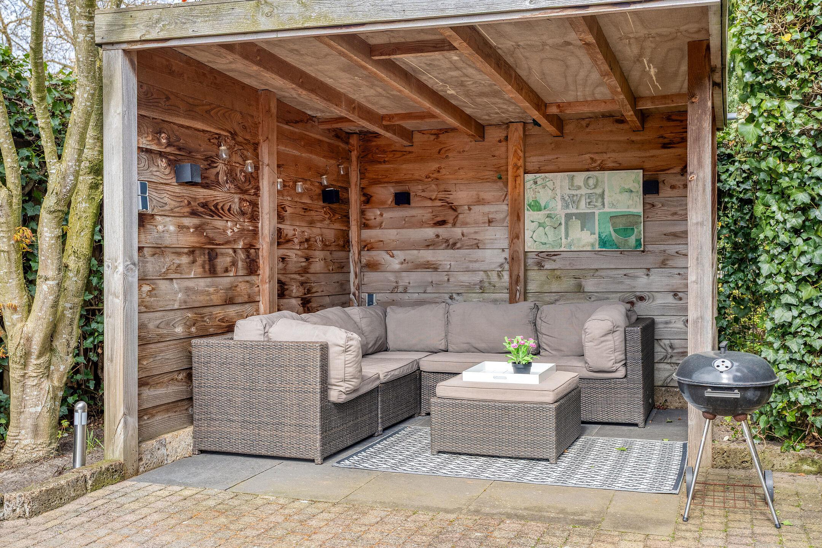 De achtertuin is royaal en biedt volop privacy. De indeling is verzorgd met bestrating, groen en verschillende zitplekken, waardoor er altijd wel een fijne plek te vinden is, in de zon of juist in de schaduw. De tuin is ingericht met een overkapping waar het heerlijk toeven is, en met een berging die extra opslagruimte biedt.