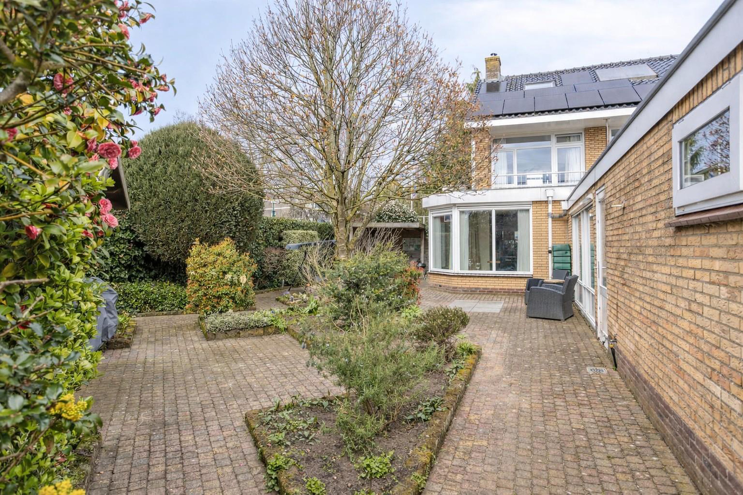 Ook aan de voorzijde is er ruimte, met een verzorgde voortuin die bijdraagt aan de prettige uitstraling van de woning.