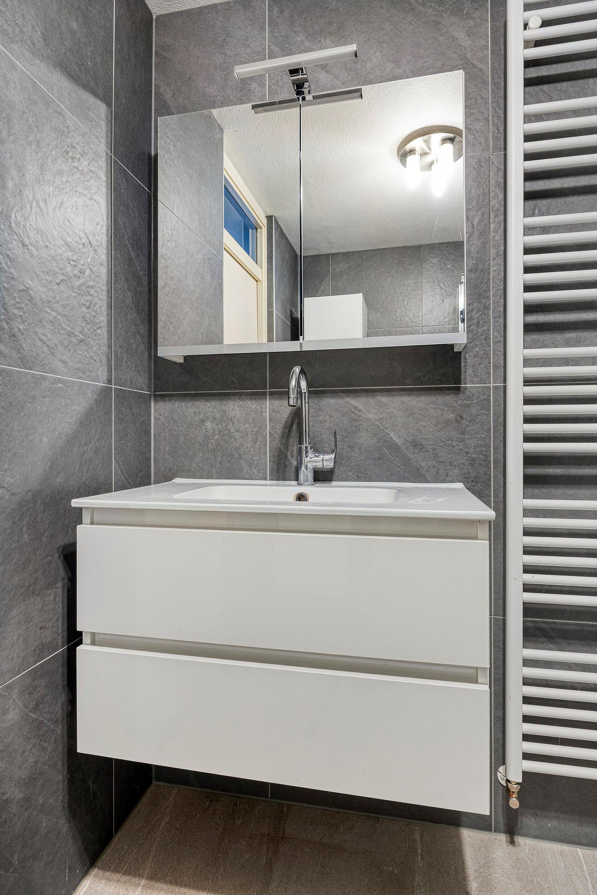 De moderne, volledig betegelde badkamer ligt eveneens aan de overloop. Deze is verzorgd afgewerkt en compleet uitgerust met een ruime douche met glazen deur, een zwevend toilet en een wastafel met spiegel. De badkamer is instapklaar en biedt alles wat u nodig heeft om de dag comfortabel te beginnen of ontspannen af te sluiten.