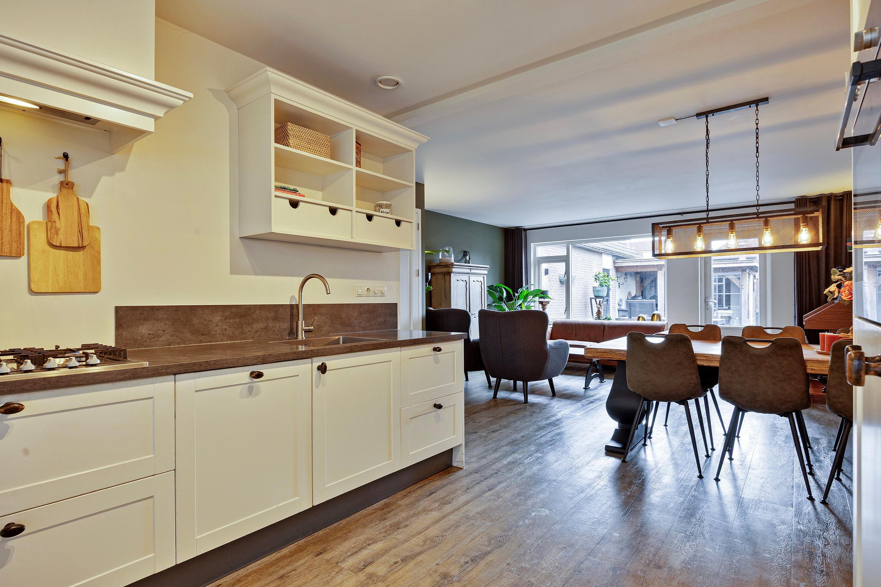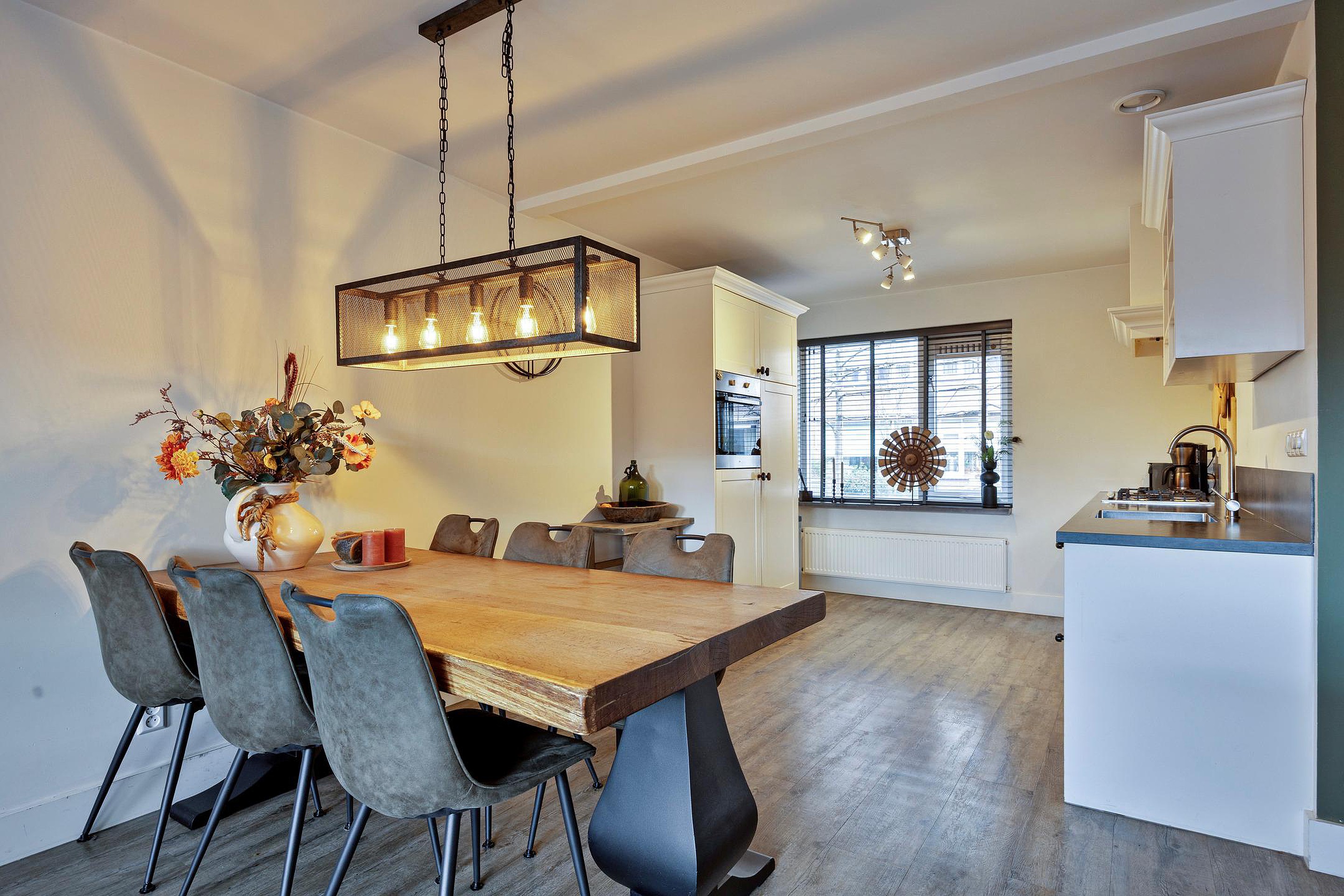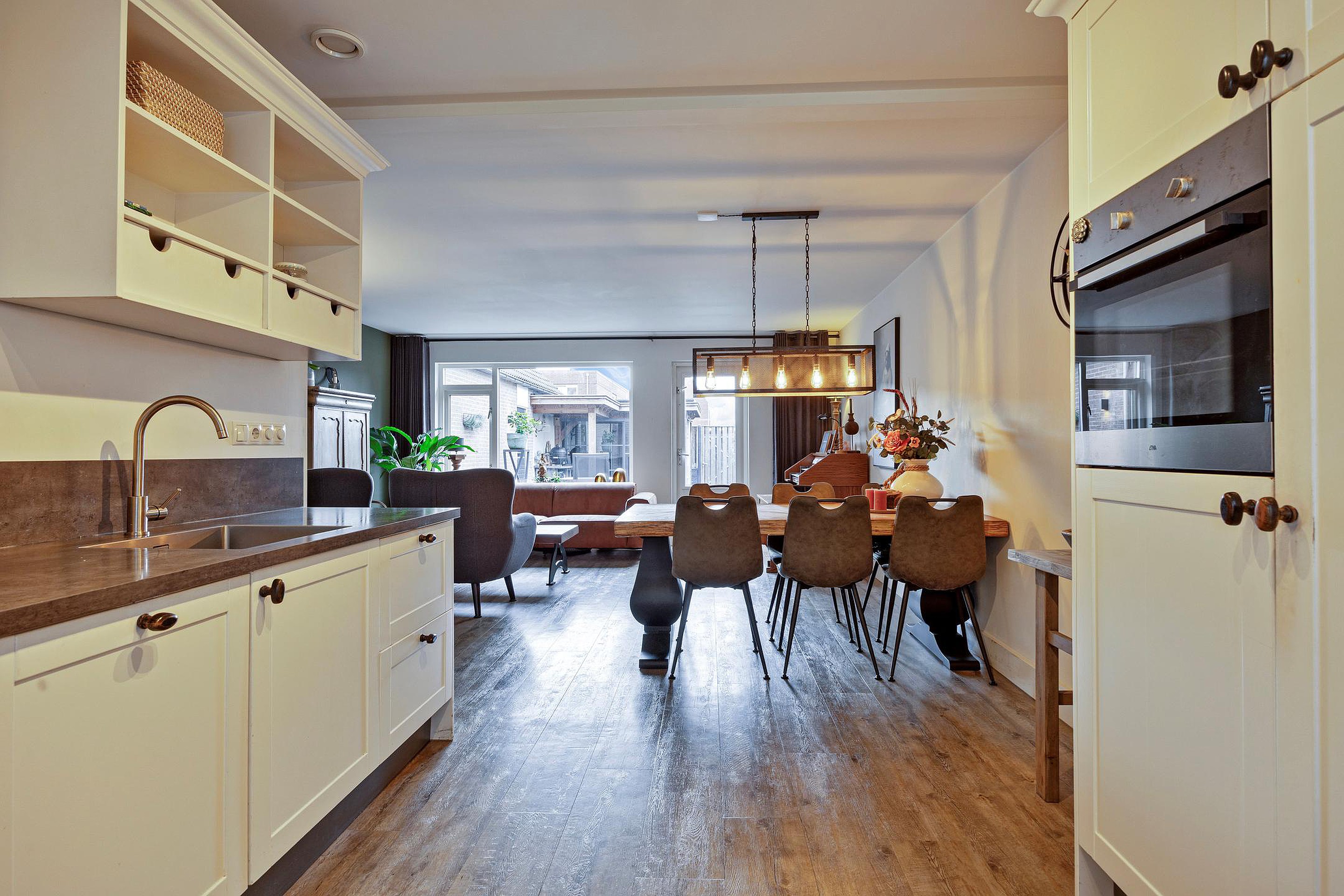 Via de entree stapt u een verzorgde hal binnen, met toegang tot het toilet met fonteintje, en de trapopgang. Eenmaal in de woonkamer merkt u direct hoe prettig de ruimte voelt: sfeervolle kleuren, grote raamvlakken en een natuurlijke overgang naar de tuin creëren een ontspannen leefruimte. De eethoek ligt centraal in de ruimte en vormt een gezellige schakel tussen de woonkamer en de royale keuken aan de voorzijde. Deze keuken is uitgerust met diverse inbouwapparatuur, waaronder een combi-oven, een gaskookplaat met schouwafzuigkap, koel-/vriescombinatie en een contrasterend werkblad dat genoeg werkruimte biedt. Alles is overzichtelijk, sfeervol en praktisch ingedeeld; helemaal klaar voor uw culinaire hoogstandjes.