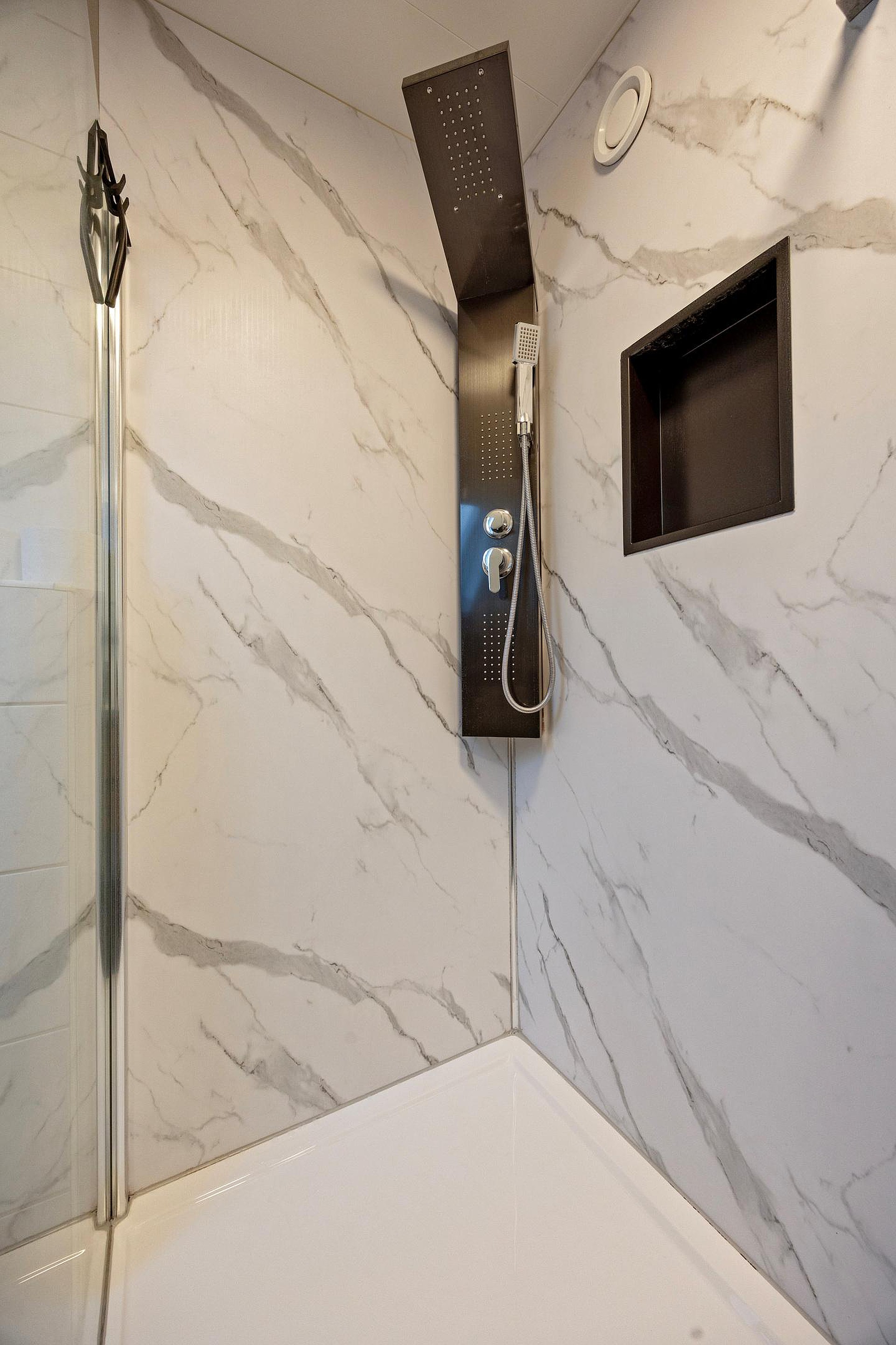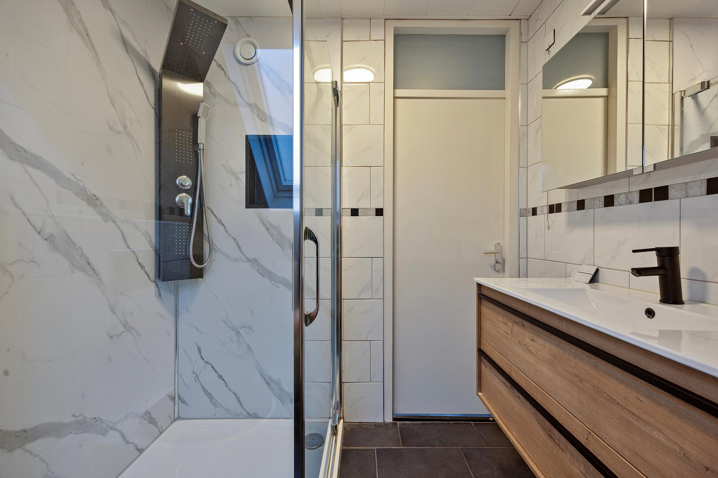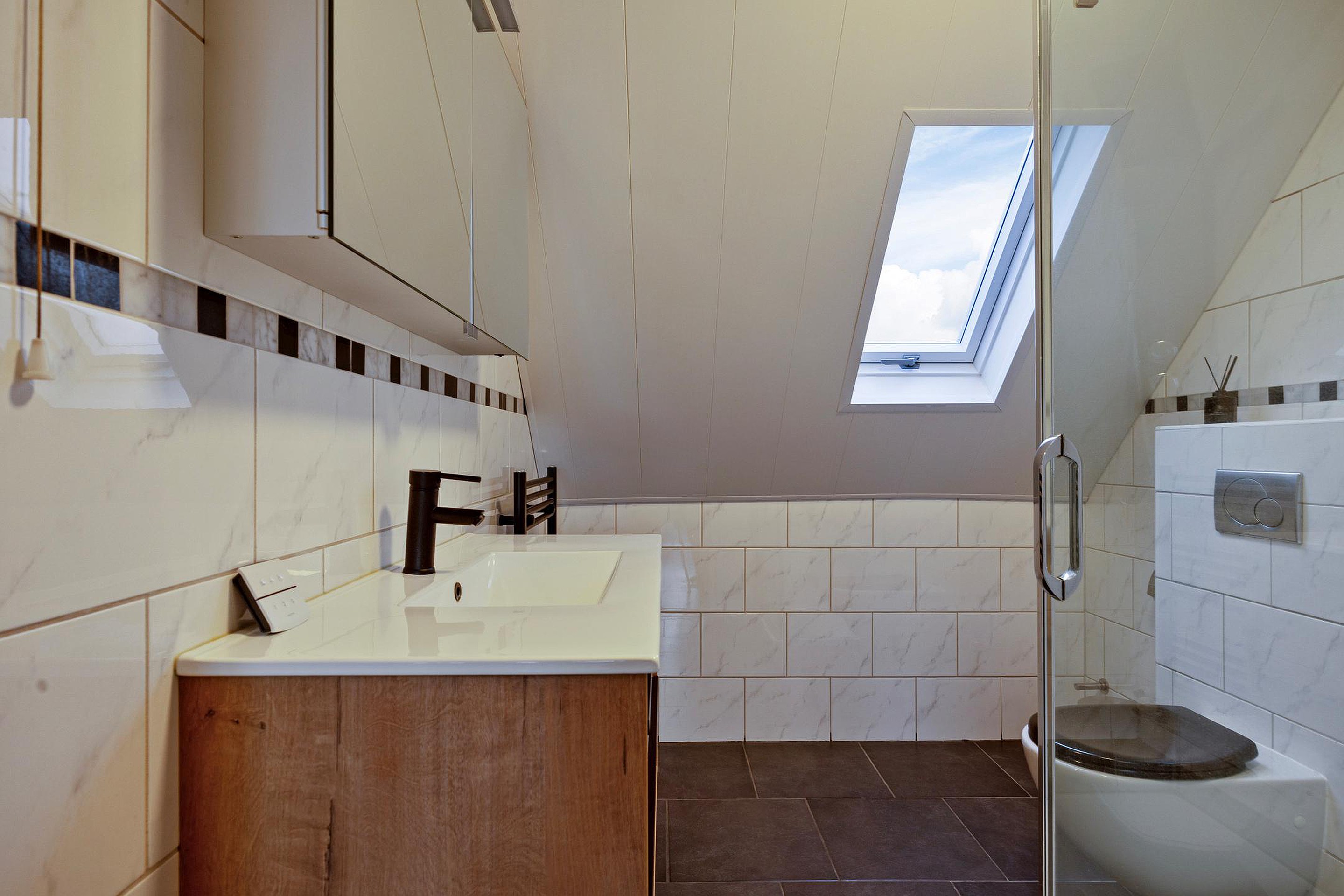 De overloop leidt naar drie comfortabele slaapkamers, elk met een fijne lichtinval en een nette afwerking. De grootste slaapkamer bevindt zich aan de achterzijde en biedt volop plaats voor een groot bed en kastruimte. De overige twee kamers zijn ideaal als kinder-, werk- of logeerruimte. De badkamer is modern en zorgvuldig uitgevoerd met een ruime douchecabine voorzien van douchepaneel, een breed wastafelmeubel en een tweede toilet. De combinatie van lichte tegels en houtaccenten geeft de ruimte een rustige, moderne uitstraling.