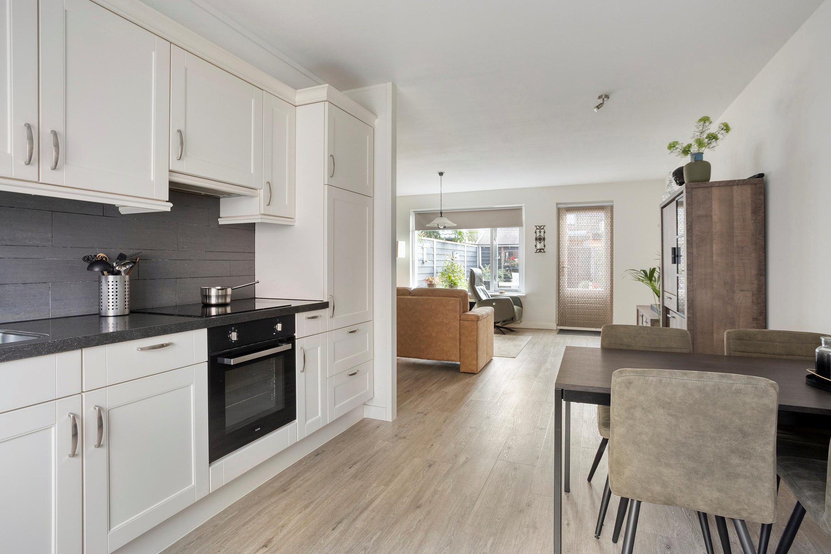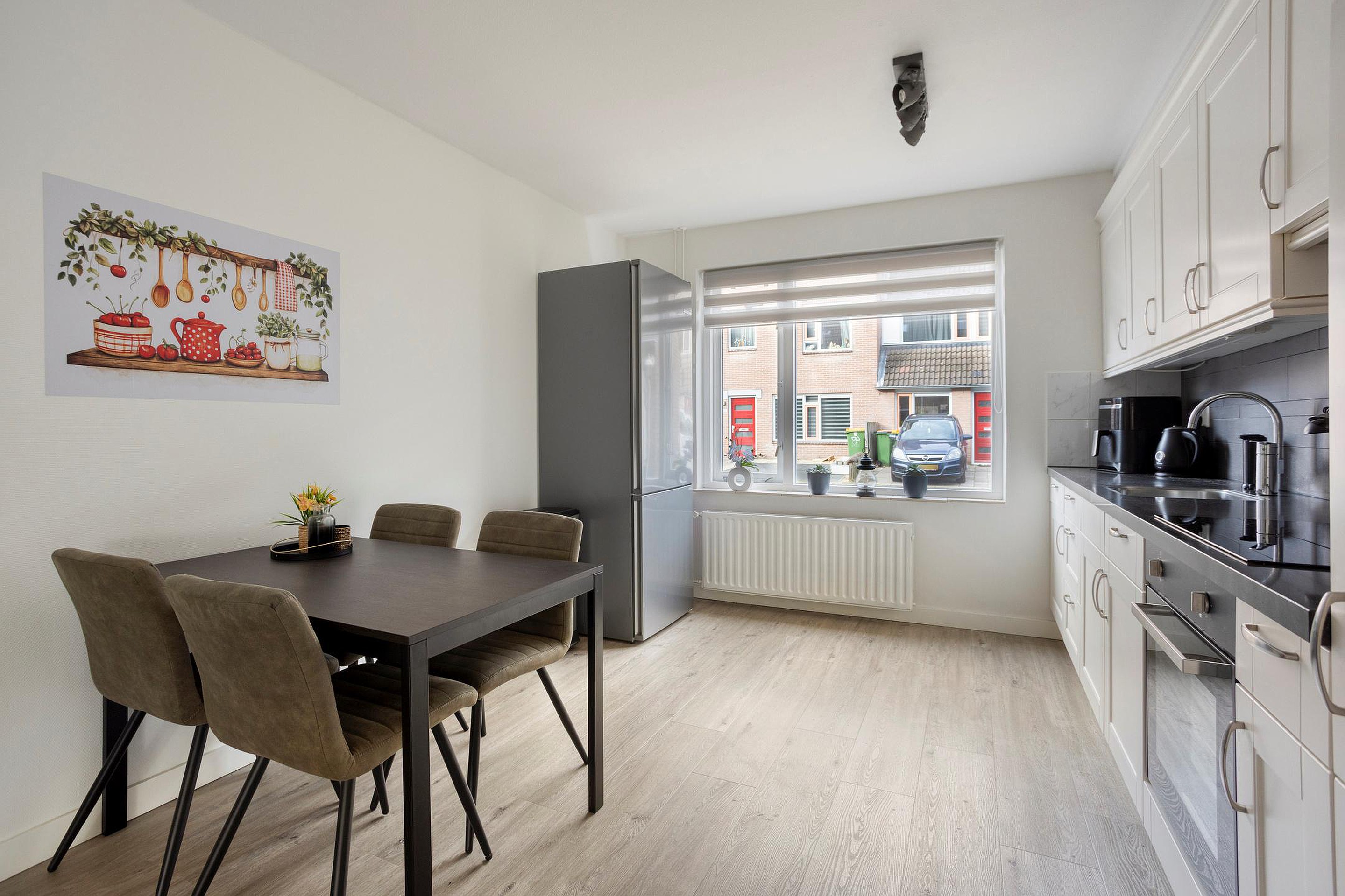 Aan de voorzijde van de woning bevindt zich de open keuken, die naadloos aansluit op de woonkamer. De langgerekte opstelling zorgt voor een praktische werkruimte, voorzien van een inductiekookplaat met afzuigkap, oven, spoelbak, ruime opbergmogelijkheden en losstaande koelkast. De keuken is netjes onderhouden en biedt voldoende plek voor een eettafel of ontbijtplek, waar u met gemak de dag begint met een kop koffie en uitzicht op de straat.