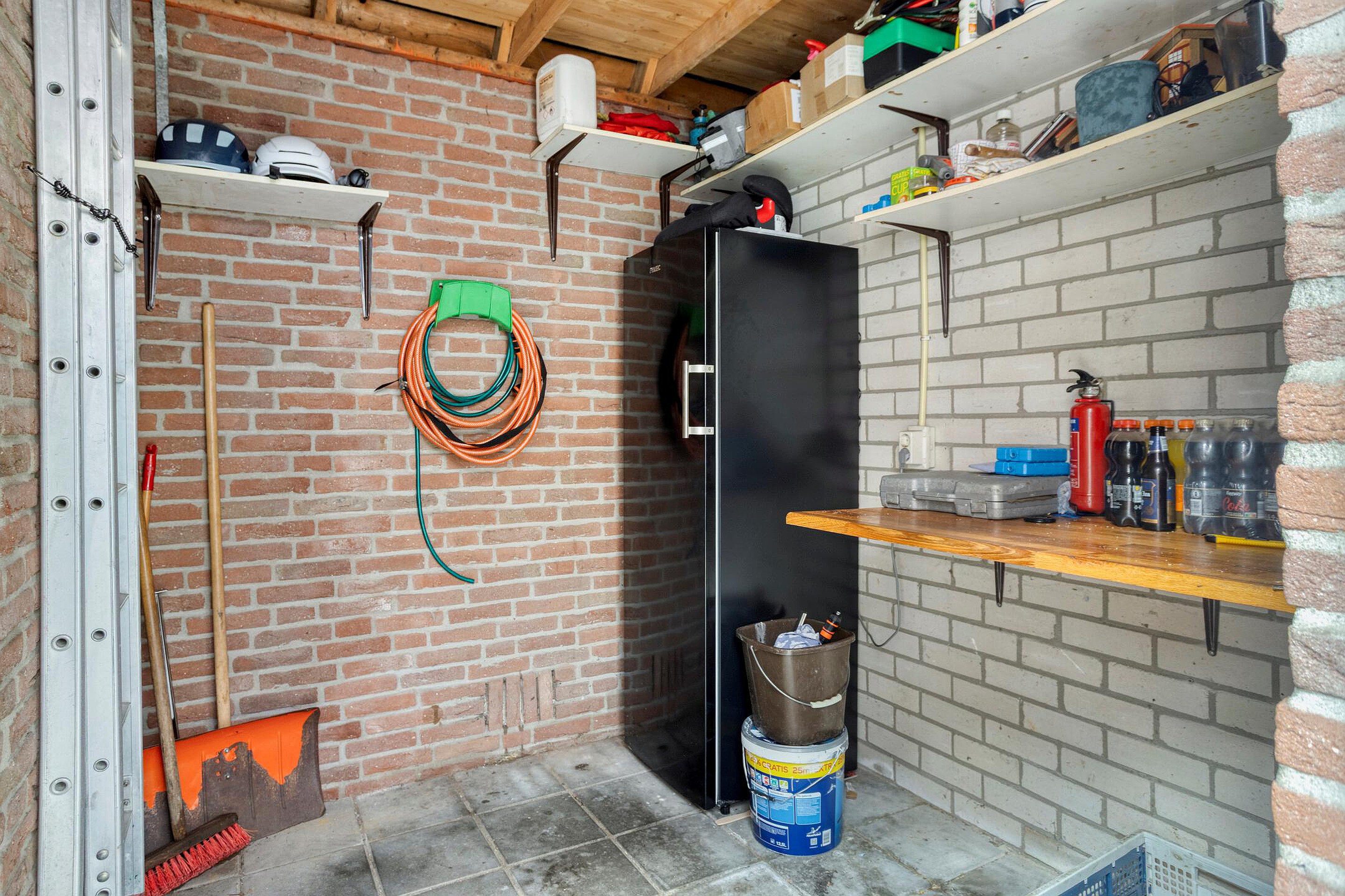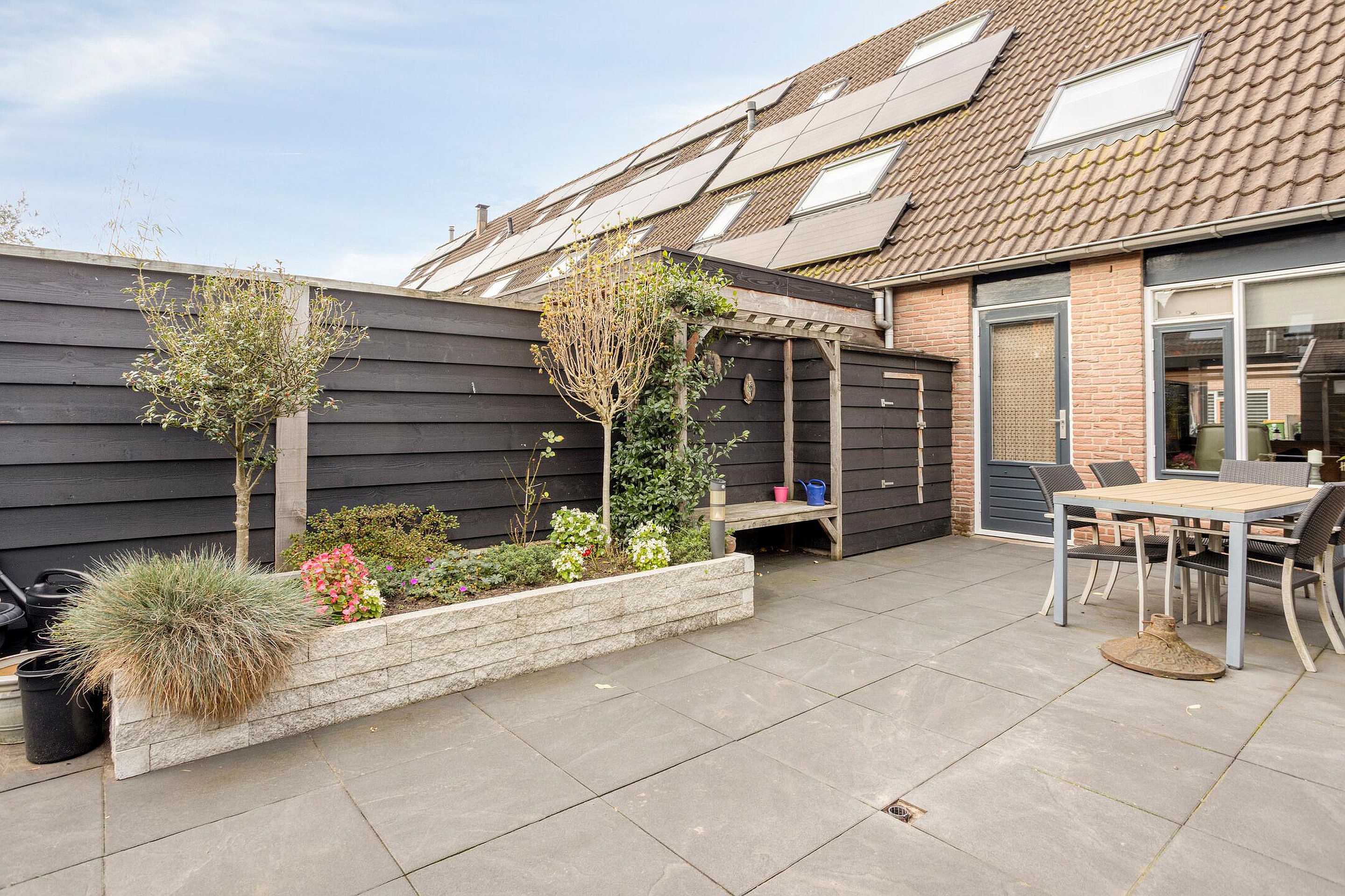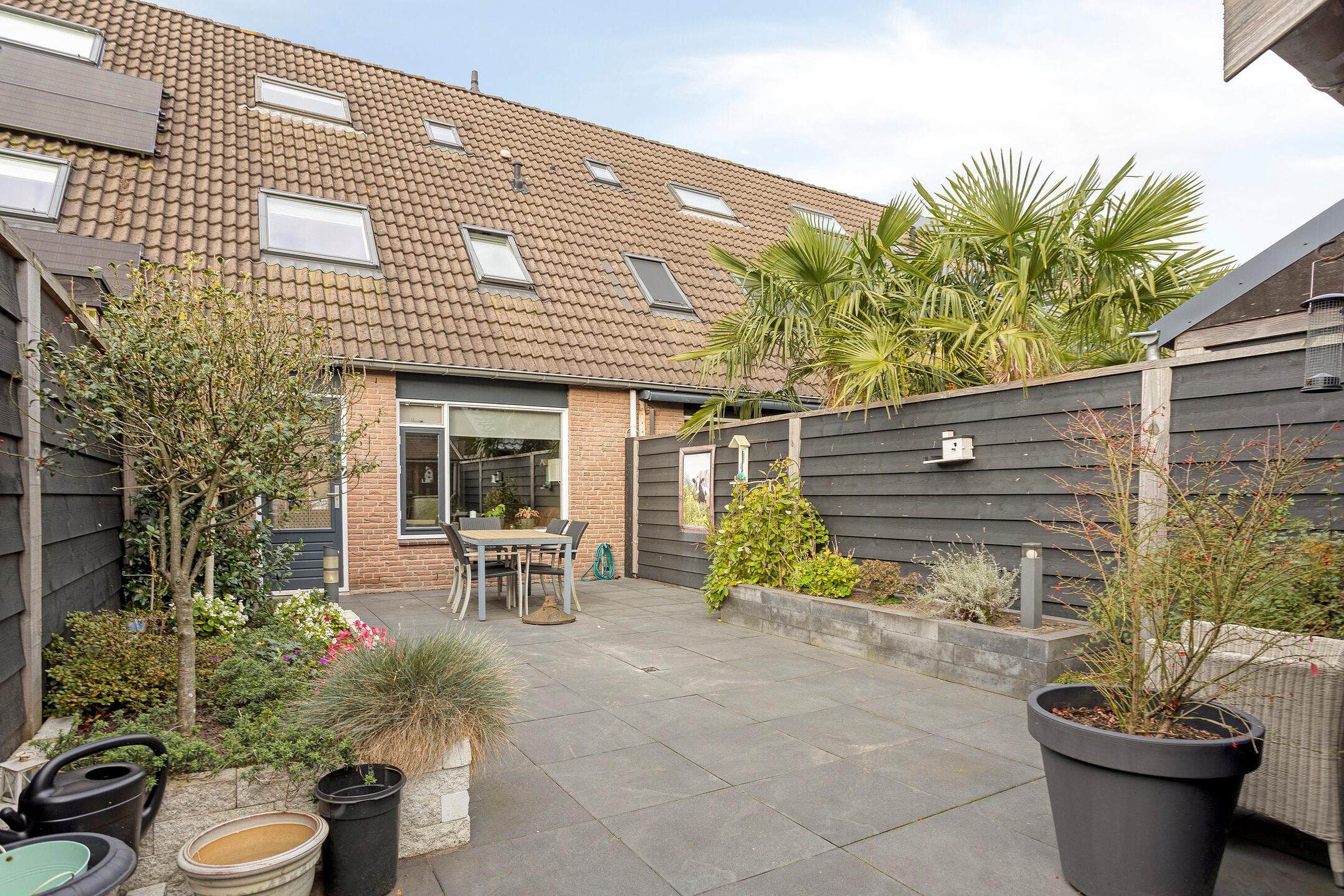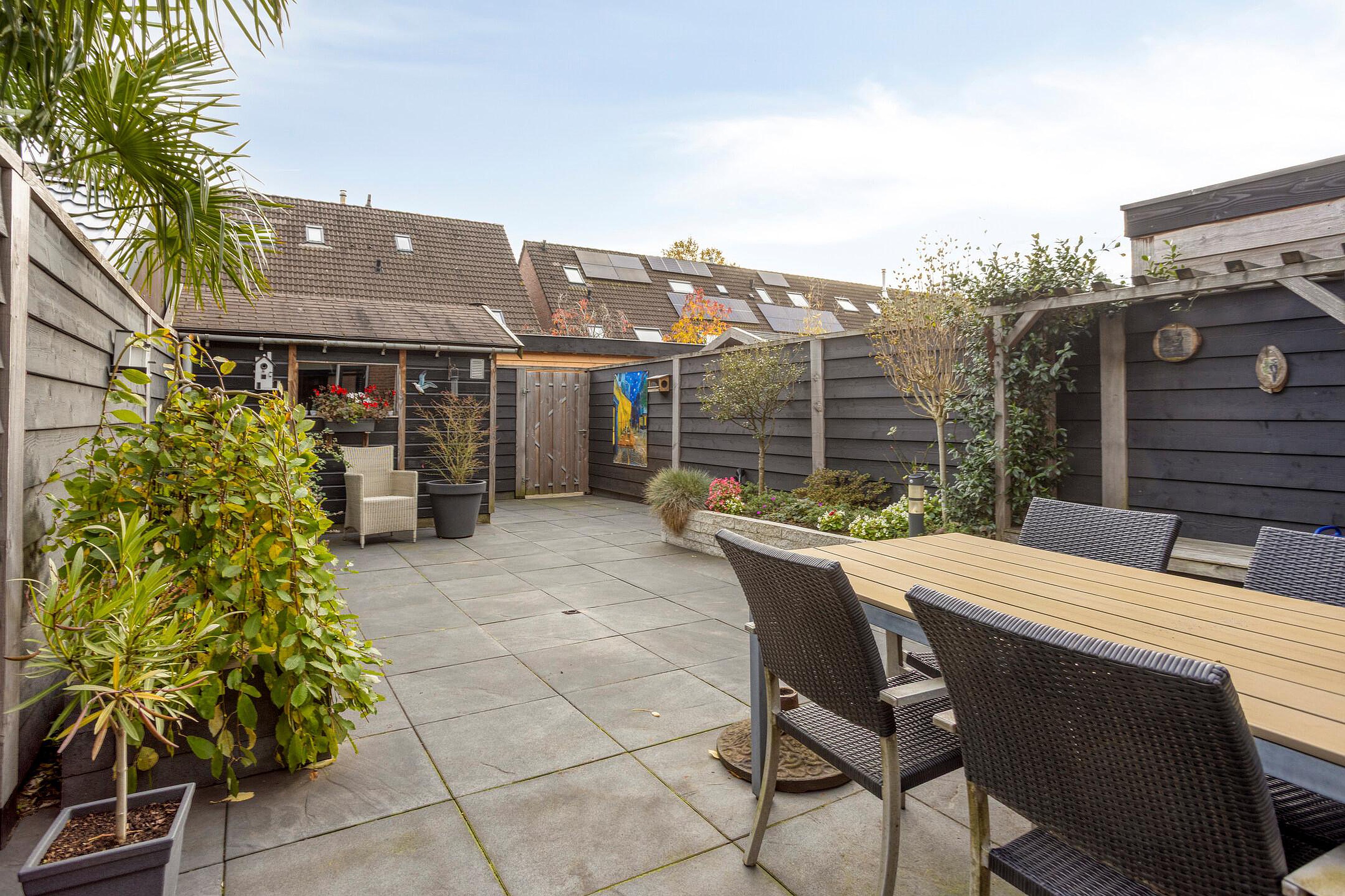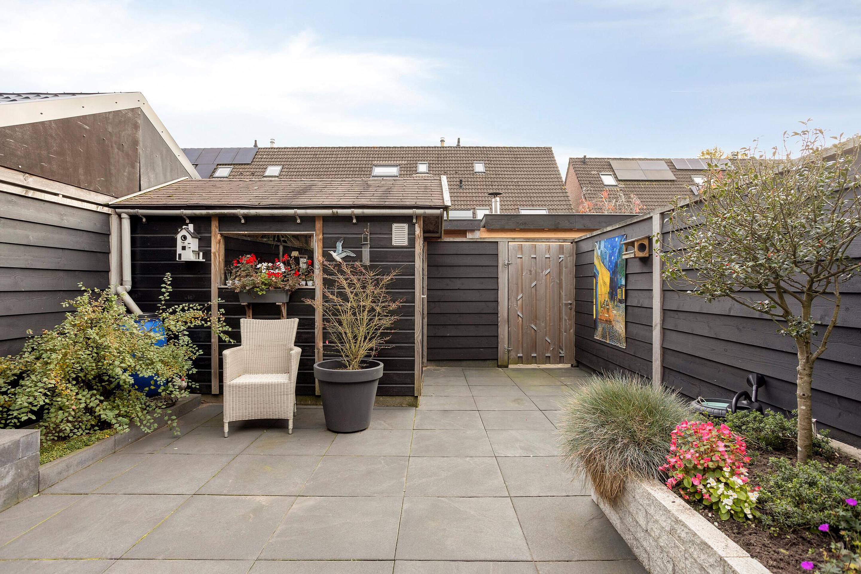 Achter de woning ligt een onderhoudsvriendelijke, zonnige tuin met een fraaie mix van bestrating en groen. Dankzij de gunstige ligging geniet u hier van veel zonuren. Op het terras creëert u eenvoudig een gezellige loungeplek of eetgedeelte. Achterin de tuin bevindt zich een berging met voldoende ruimte voor fietsen of tuinspullen, en via de achterpoort is de tuin ook achterom bereikbaar – praktisch en veilig.