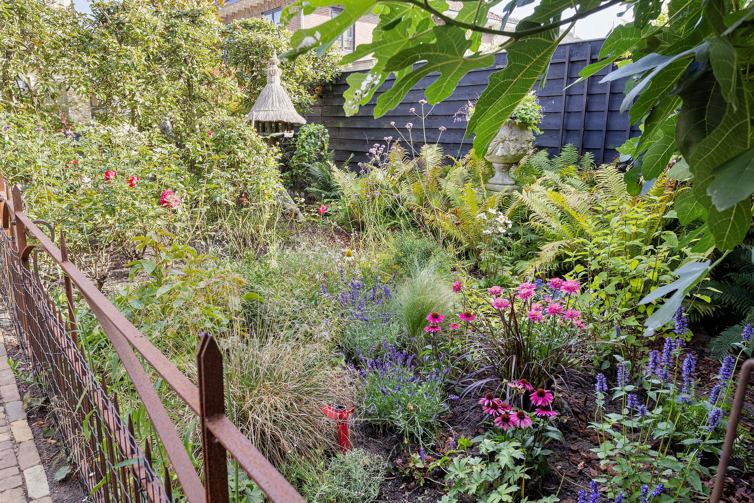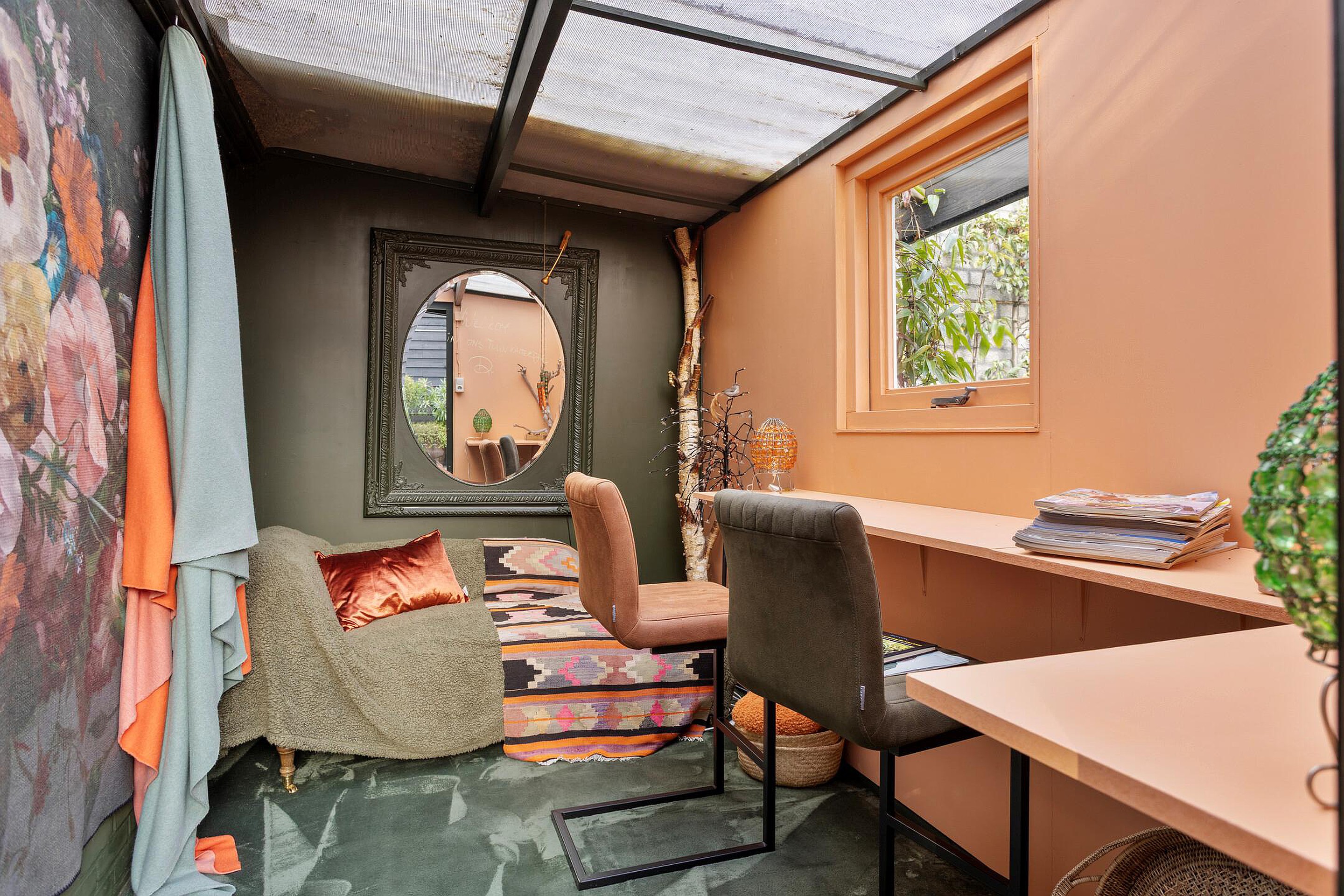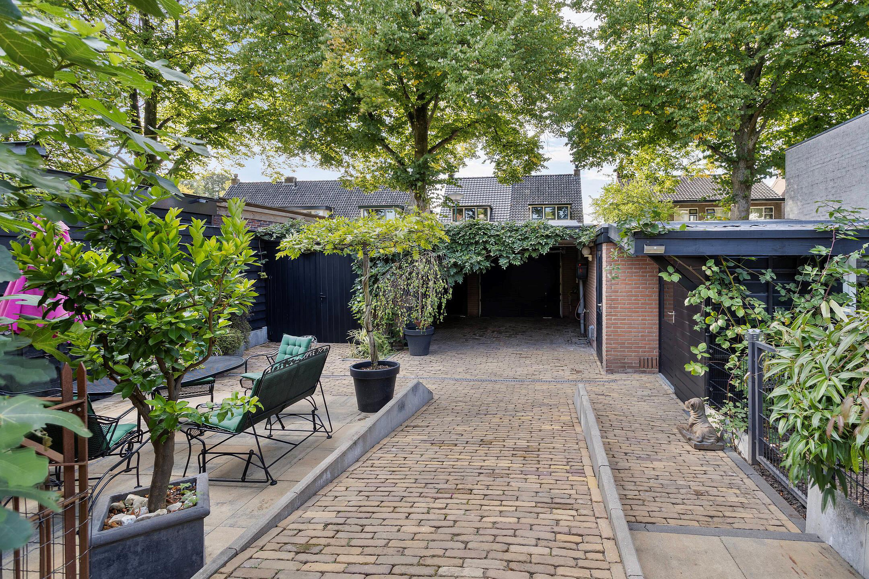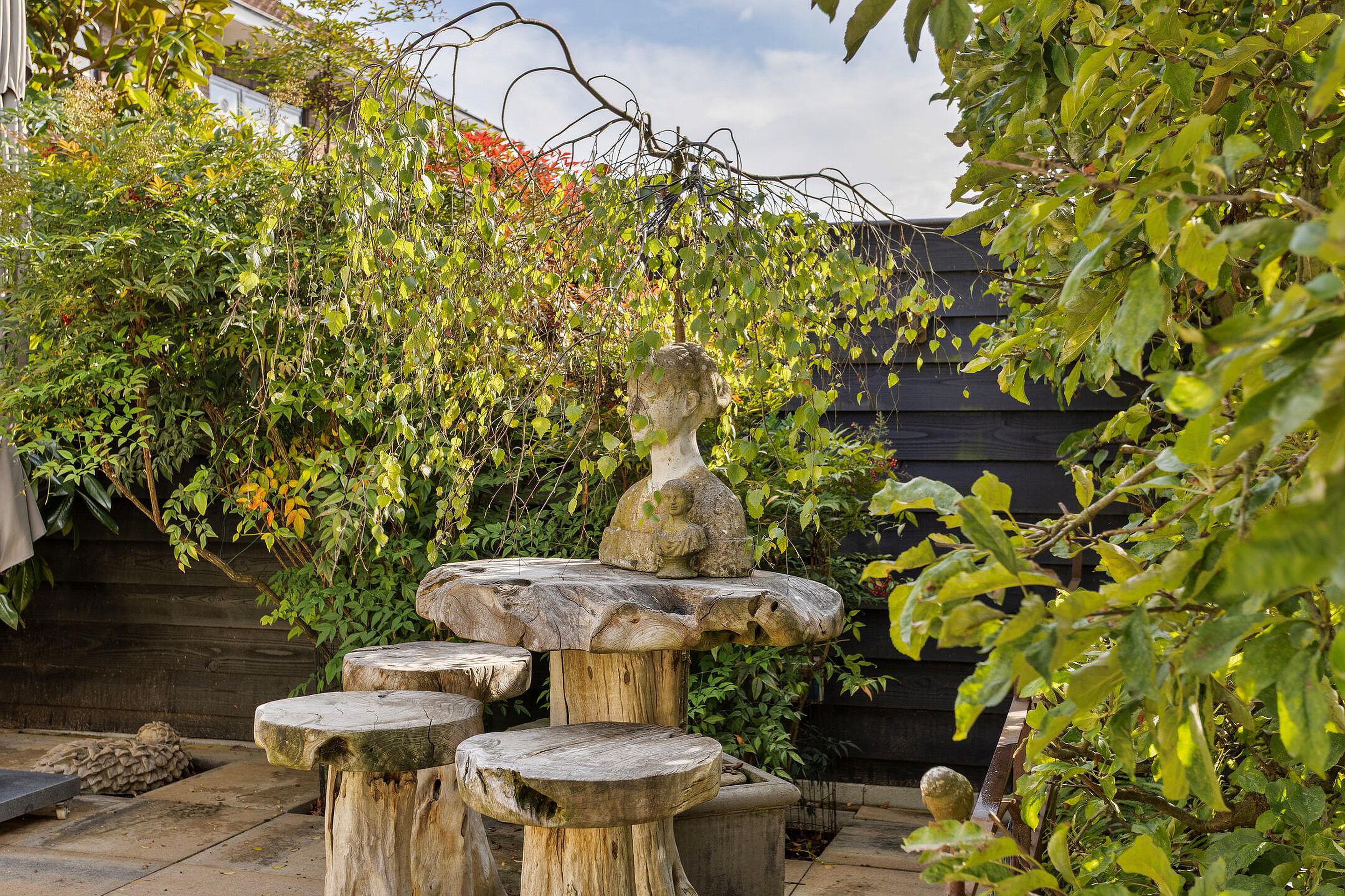 De tuin is zonder twijfel een van de meest bijzondere elementen van deze villa. Met 674 m2 eigen grond heeft u hier genoeg ruimte, privacy en rust. De tuin strekt zich ver naar achteren uit en biedt meerdere terrassen, sierlijke beplanting en verrassende doorkijkjes. Achterin staat een grote vrijstaande garage met aangrenzend een afsluitbare carport en een berging met dubbele lichtkoepel. Als extra toevoeging is er een knus tuinkamertje, sfeervol afgewerkt en voorzien van een raam. De tuin is ontworpen om elk seizoen tot zijn recht te laten komen: van het eerste voorjaarzonnetje tot de warme zomeravonden. Het is een plek waar u kunt eten, loungen, tuinieren en ontspannen — alles in uw eigen groene omgeving.