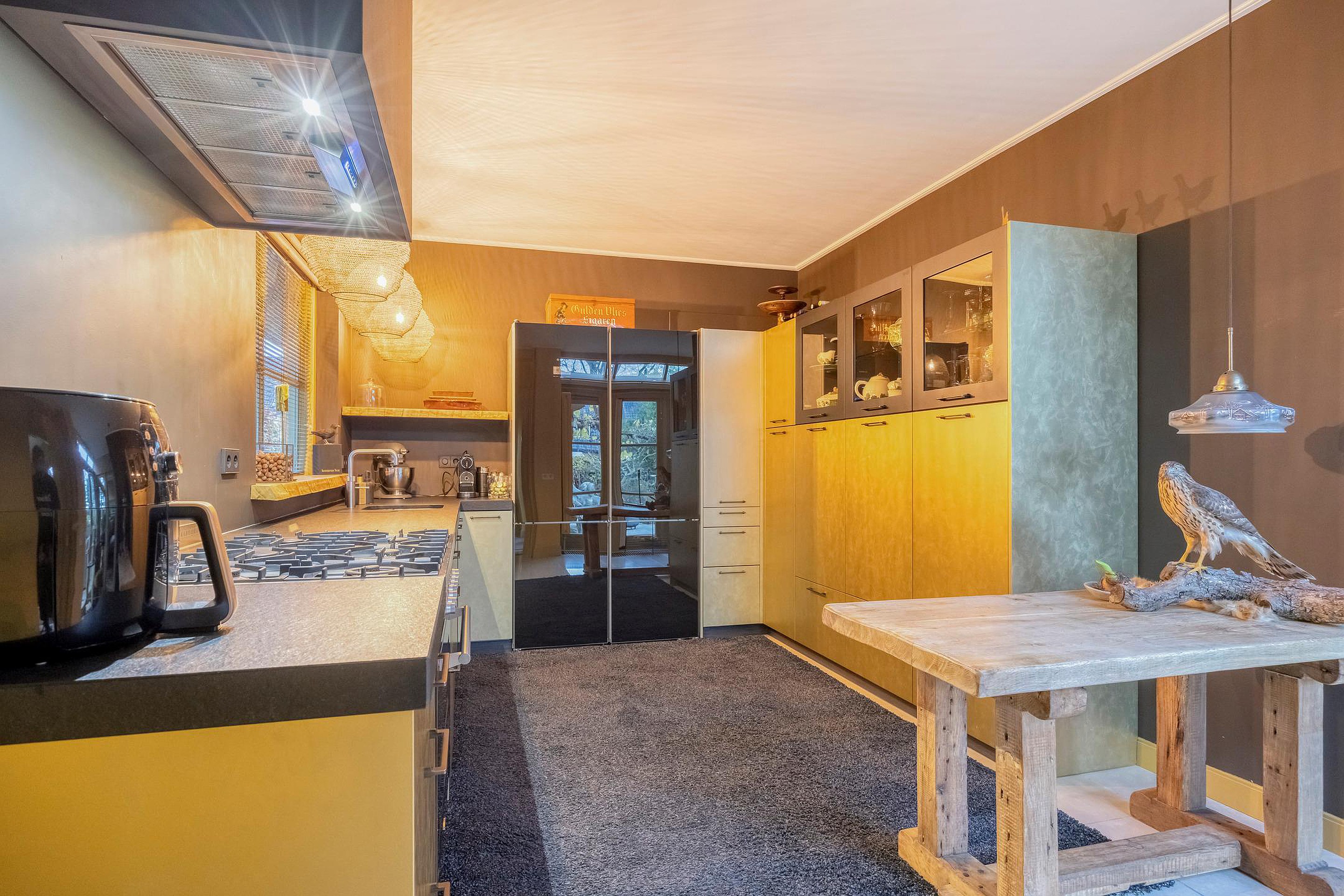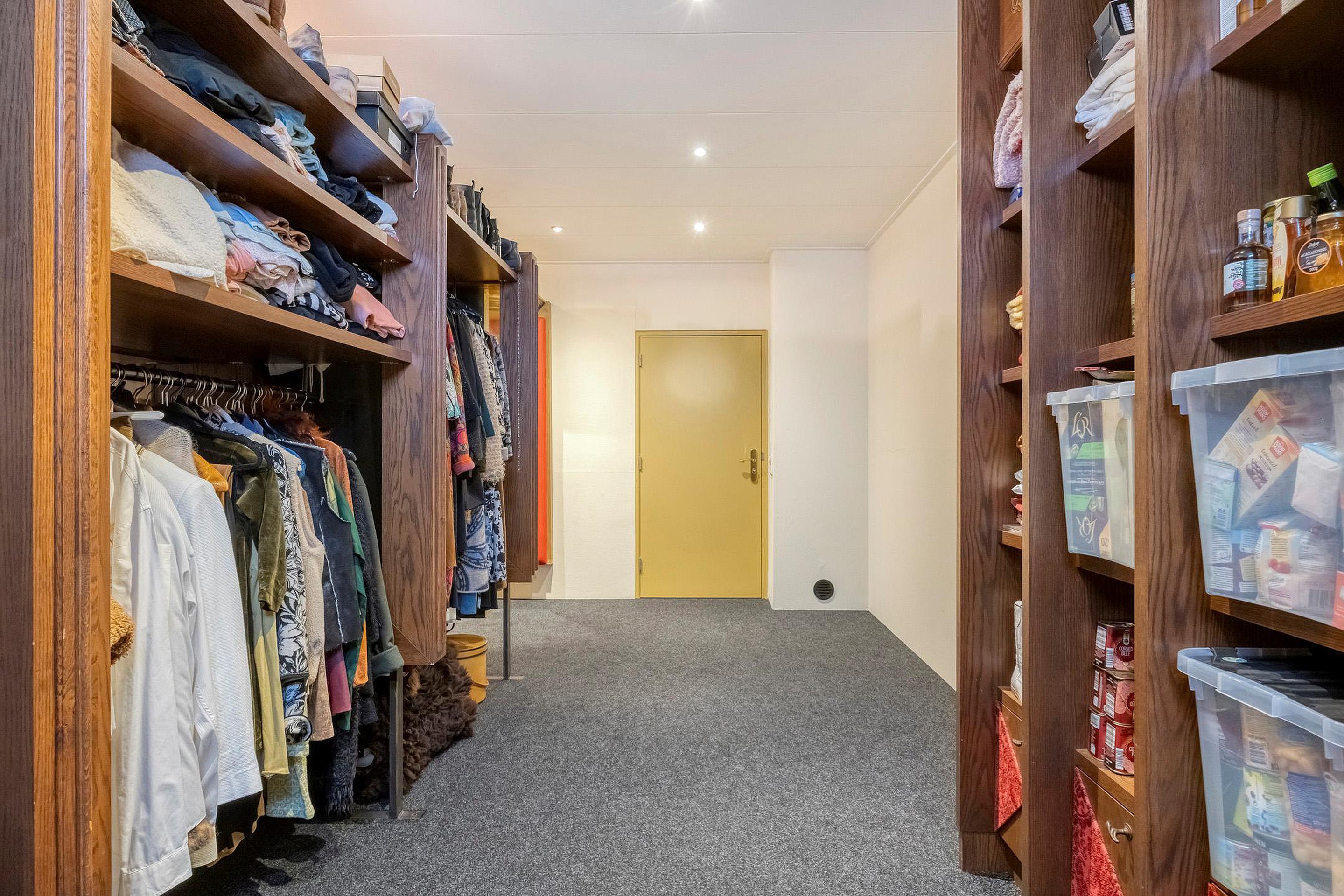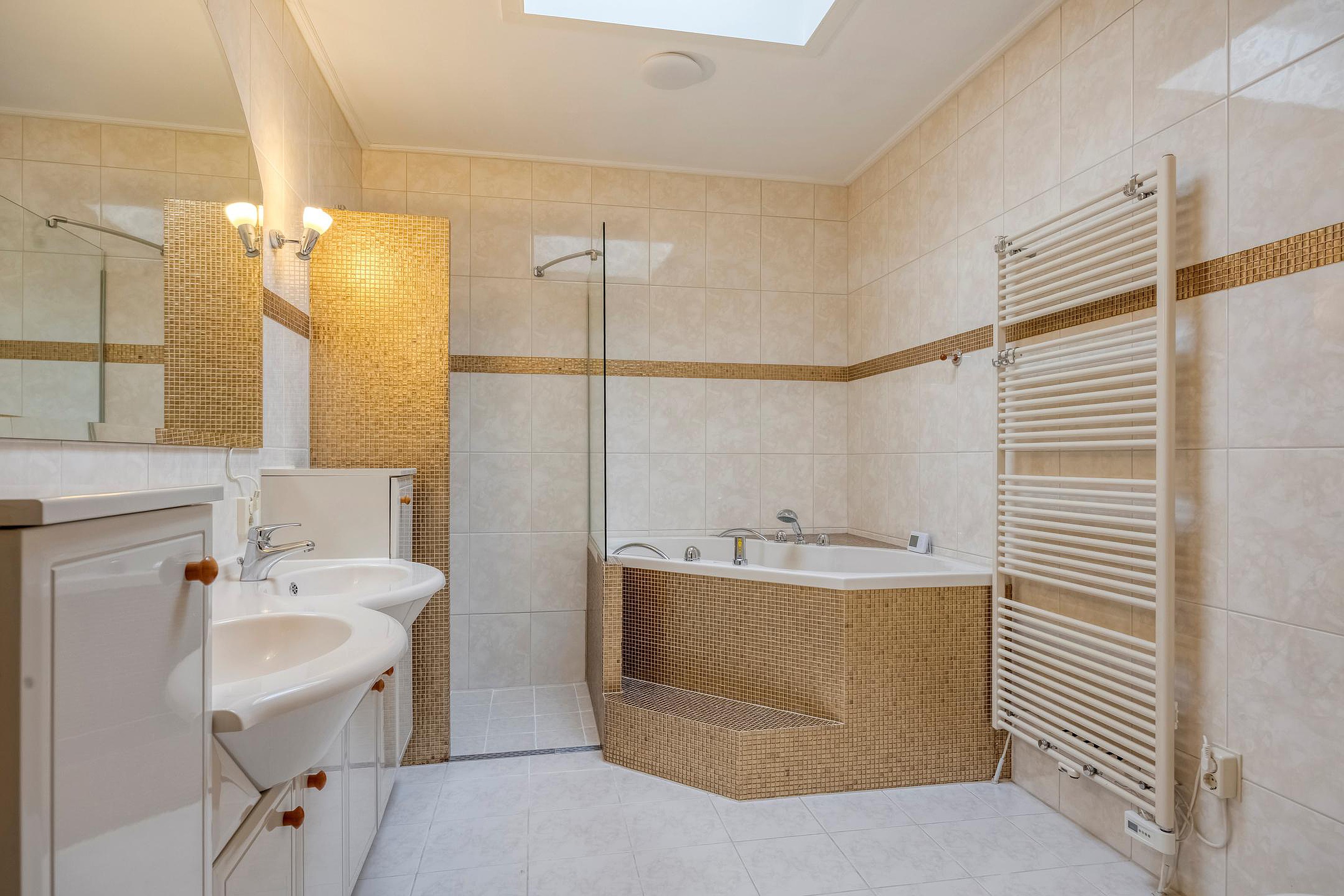 De woonkeuken is modern uitgevoerd met luxe apparatuur zoals een groot gasfornuis, een schouwafzuigkap, vaatwasser, koel- en vrieskast, airconditioning en een Quookerkraan. Hier kookt u met zicht op de tuin, terwijl het natuurlijke licht mooi over de gouden fronten van de keuken strijkt. Ook via de keuken zijn de serre en achtertuin toegankelijk gemaakt. Aangrenzend bereikt u enerzijds de praktische bijkeuken met witgoedaansluitingen en anderzijds een riante slaapkamer, met een evenzo riante walk-in closet en een badkamer en suite. Een schuifpui verbindt de slaapkamer met de tuin, en ook via de walk-in closet kunt u de tuin eenvoudig bereiken. De ruime badkamer is voorzien van licht tegelwerk en een lichtkoepel, een whirlpool, dubbele wastafel, een inloopdouche, wandcloset en volop opbergruimte.