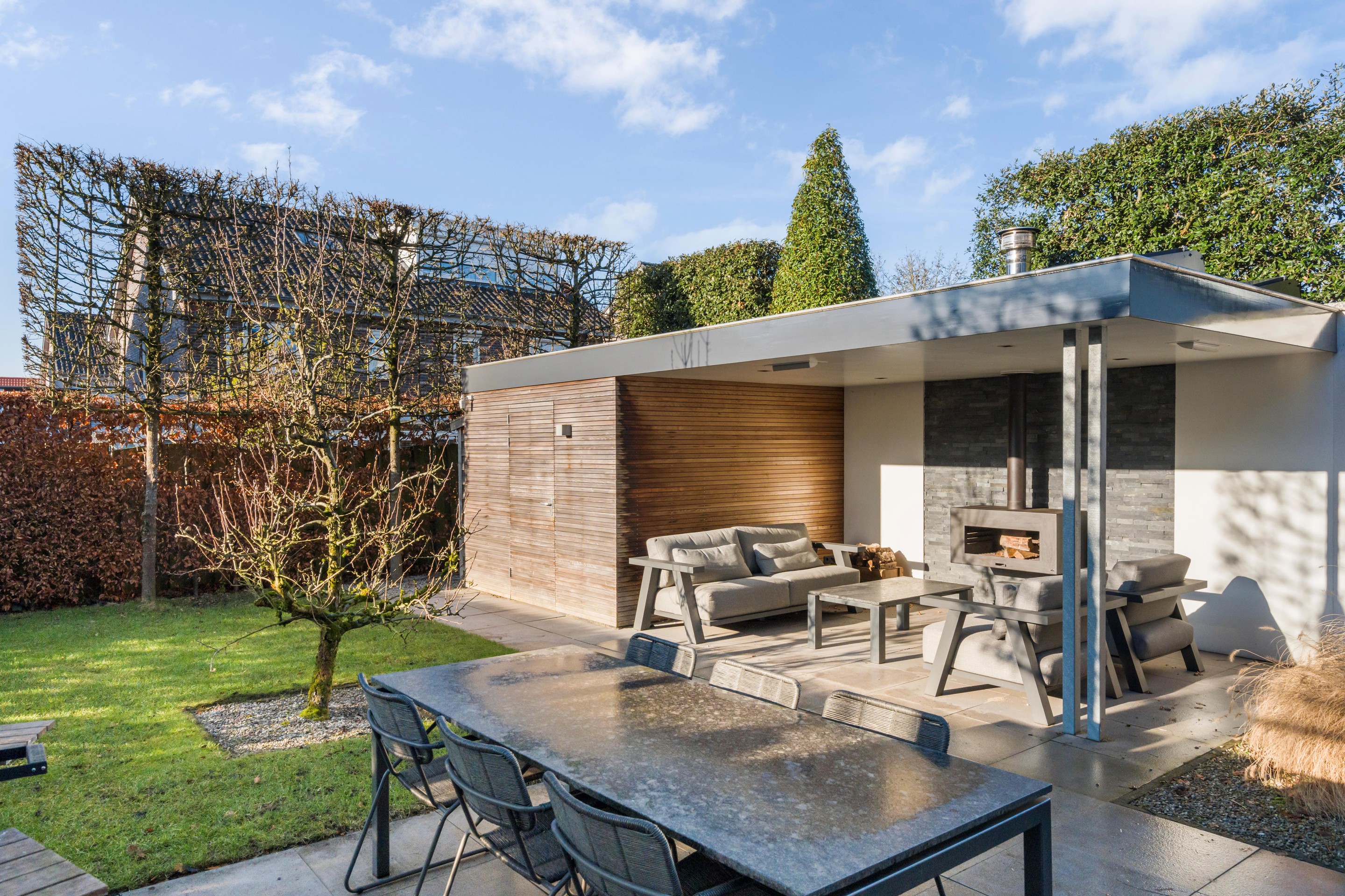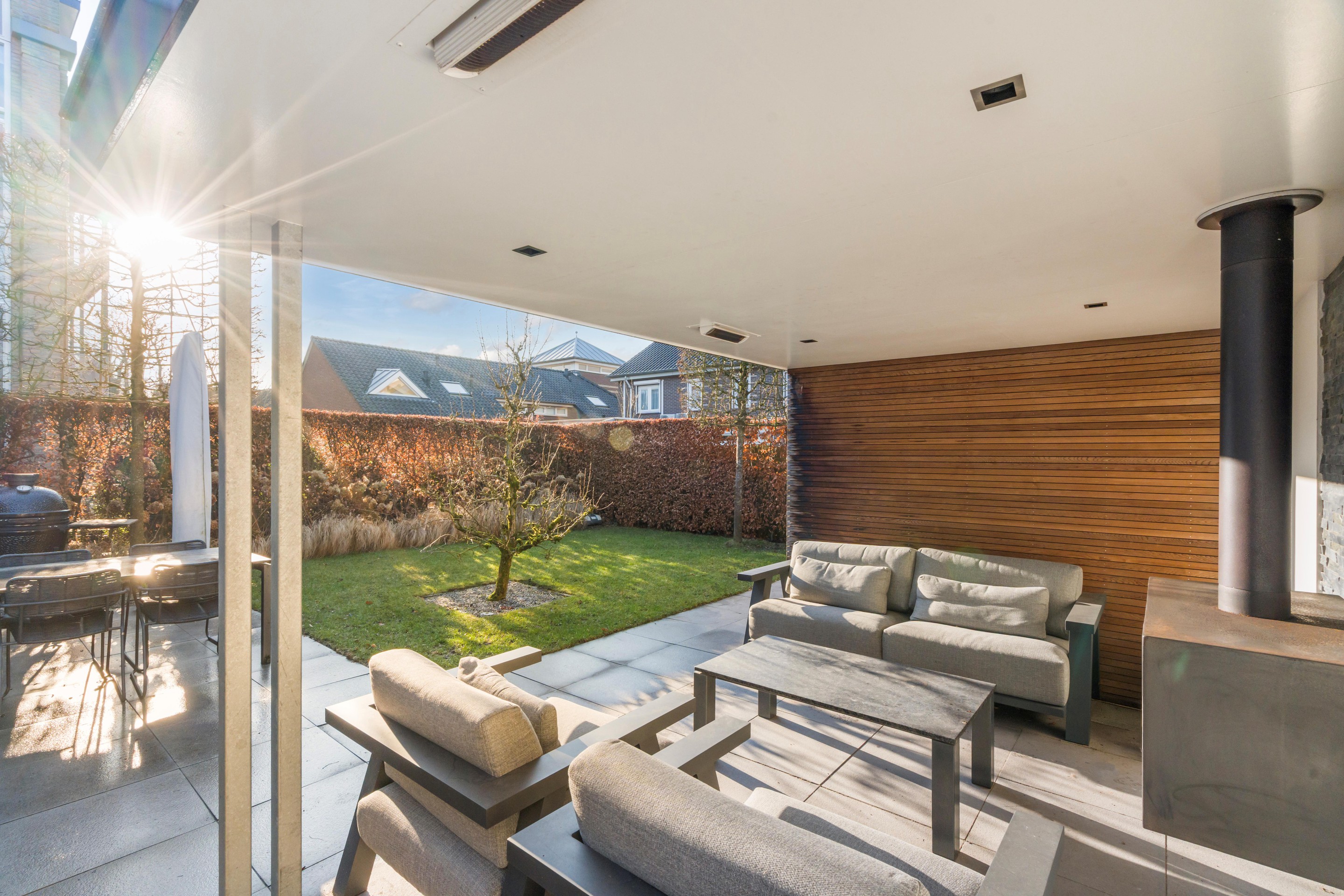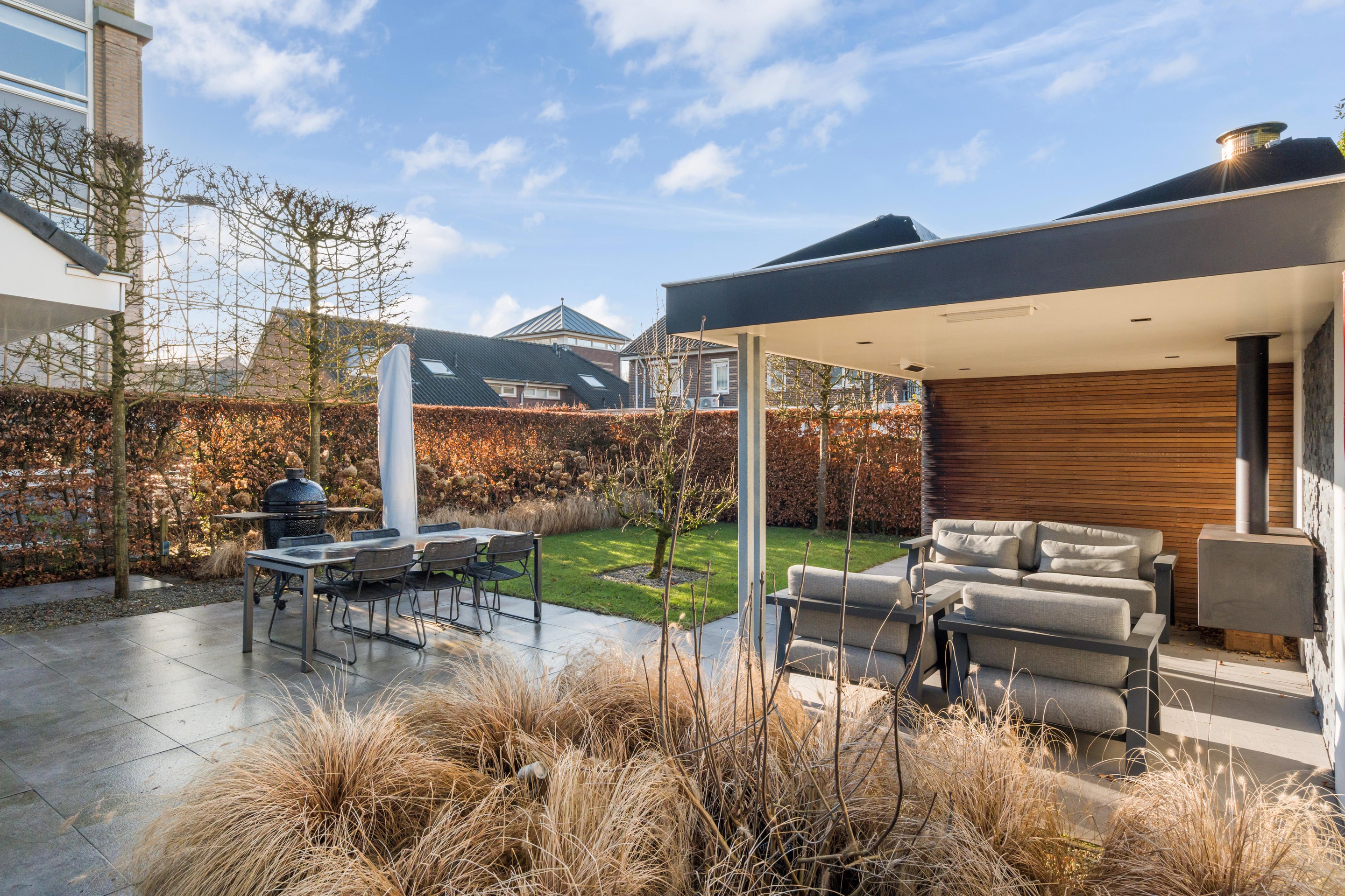 De door een tuinarchitect ontworpen tuin is verzorgd aangelegd en nodigt uit om veel buiten te zijn. Er is een ruim terras, een gazon en meerdere fijne plekken om te zitten. Achterin staat een separate berging (met keuken) met daarnaast een lounge-overkapping/veranda , waardoor u hier ook op minder zonnige dagen beschut kunt genieten. Zeker ook omdat deze overkapping voorzien is van geïntegreerde heaters, een open haard en ingebouwde verlichting. Deze overkapping kan eenvoudig worden aangepast naar een tuinkamer door het plaatsen van (glazen) wanden. Het buitenleven voelt hier als een verlengstuk van uw woonruimte. De hoge esdoorns in leivorm geven u privacy in de tuin.