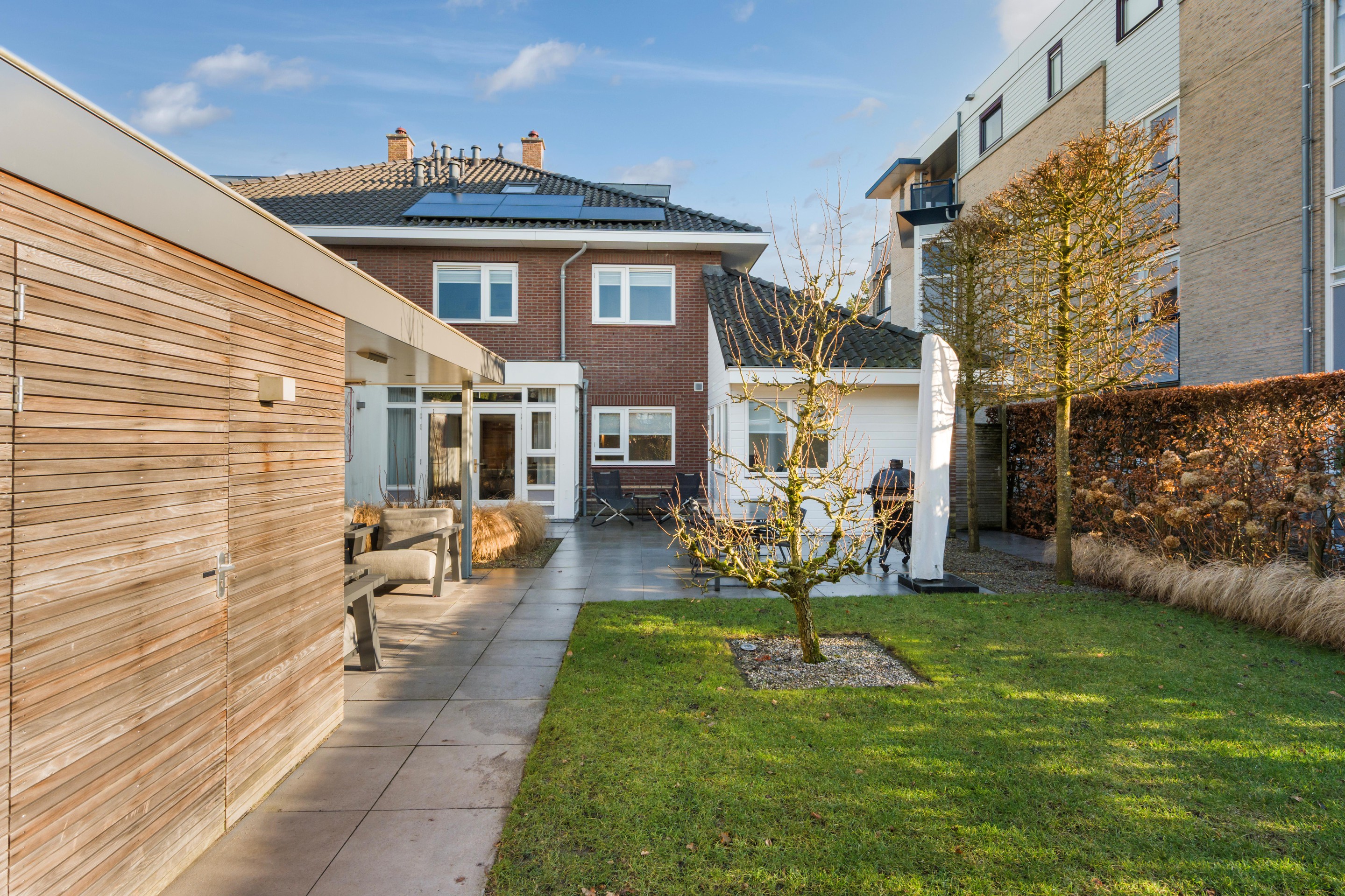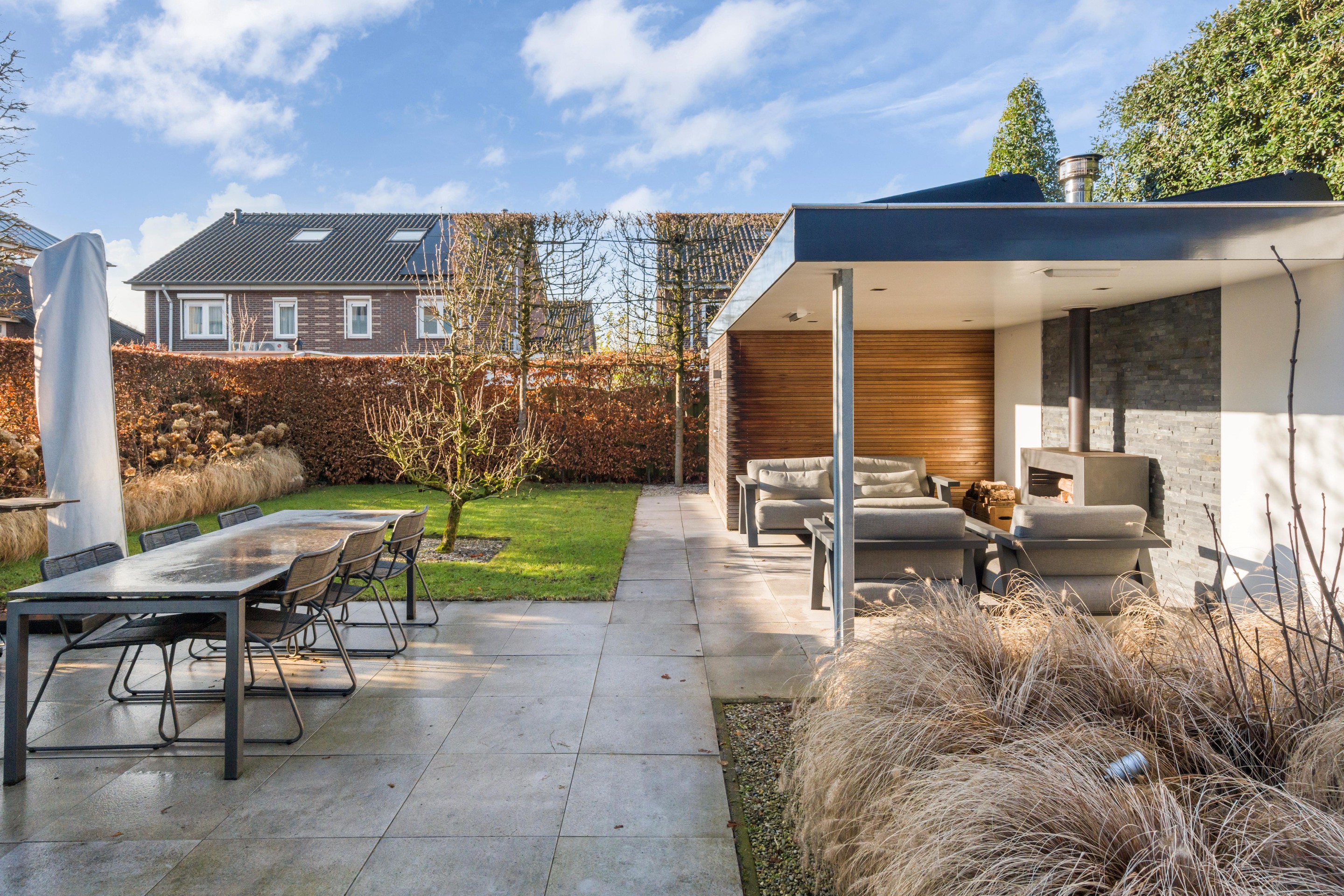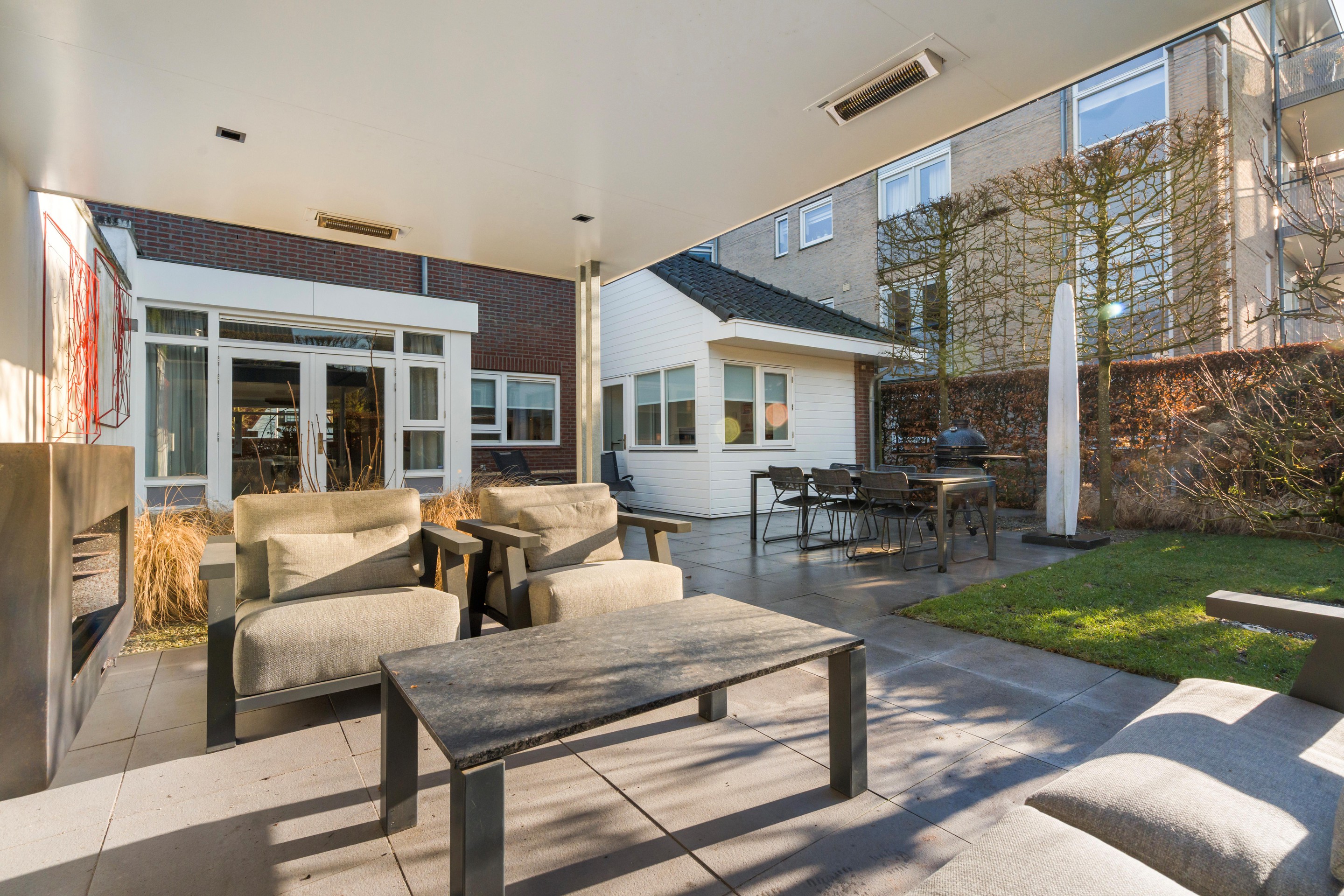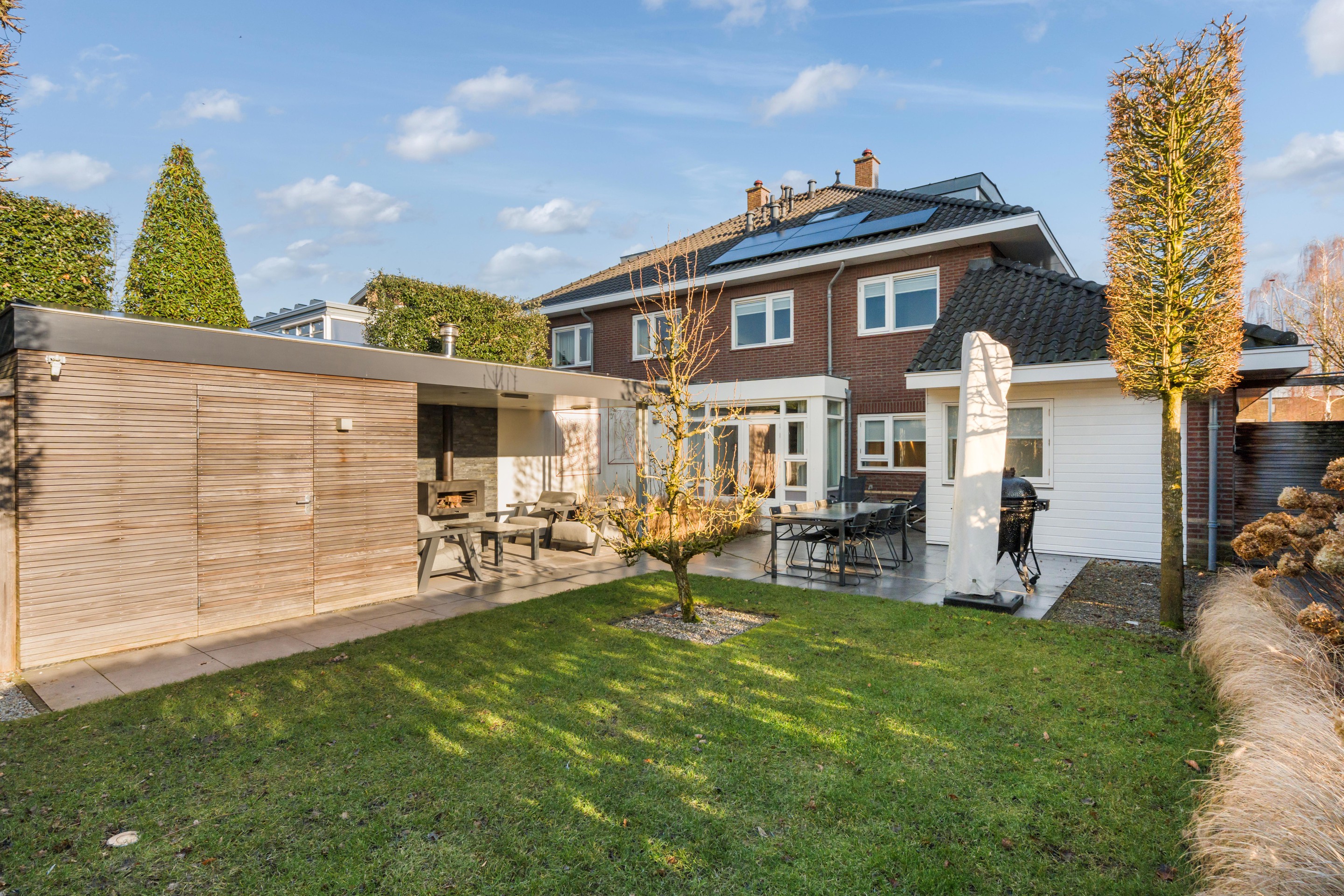 De door een tuinarchitect ontworpen tuin is verzorgd aangelegd en nodigt uit om veel buiten te zijn. Er is een ruim terras, een gazon en meerdere fijne plekken om te zitten. Achterin staat een separate berging (met keuken) met daarnaast een lounge-overkapping/veranda , waardoor u hier ook op minder zonnige dagen beschut kunt genieten. Zeker ook omdat deze overkapping voorzien is van geïntegreerde heaters, een open haard en ingebouwde verlichting. Deze overkapping kan eenvoudig worden aangepast naar een tuinkamer door het plaatsen van (glazen) wanden. Het buitenleven voelt hier als een verlengstuk van uw woonruimte. De hoge esdoorns in leivorm geven u privacy in de tuin.