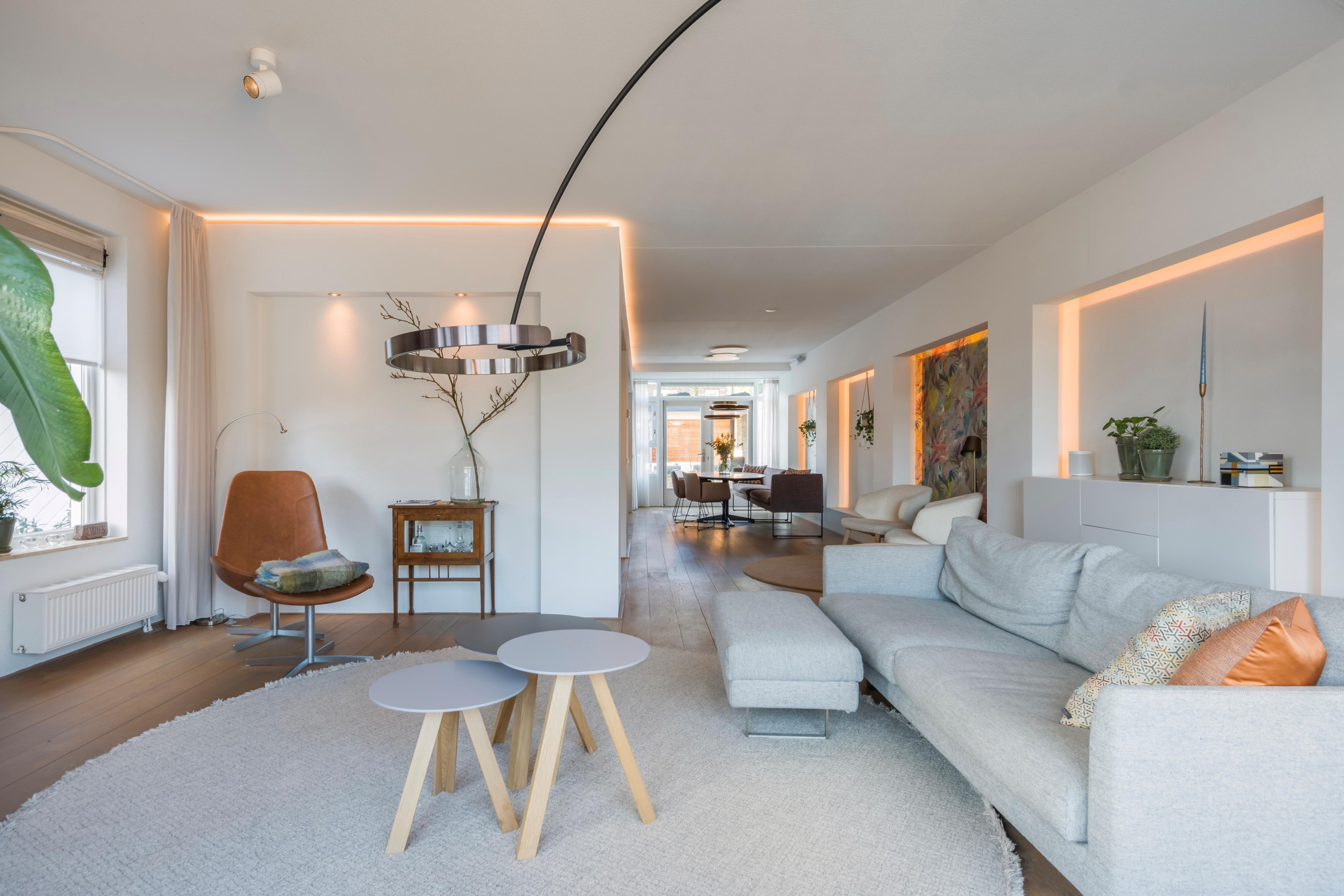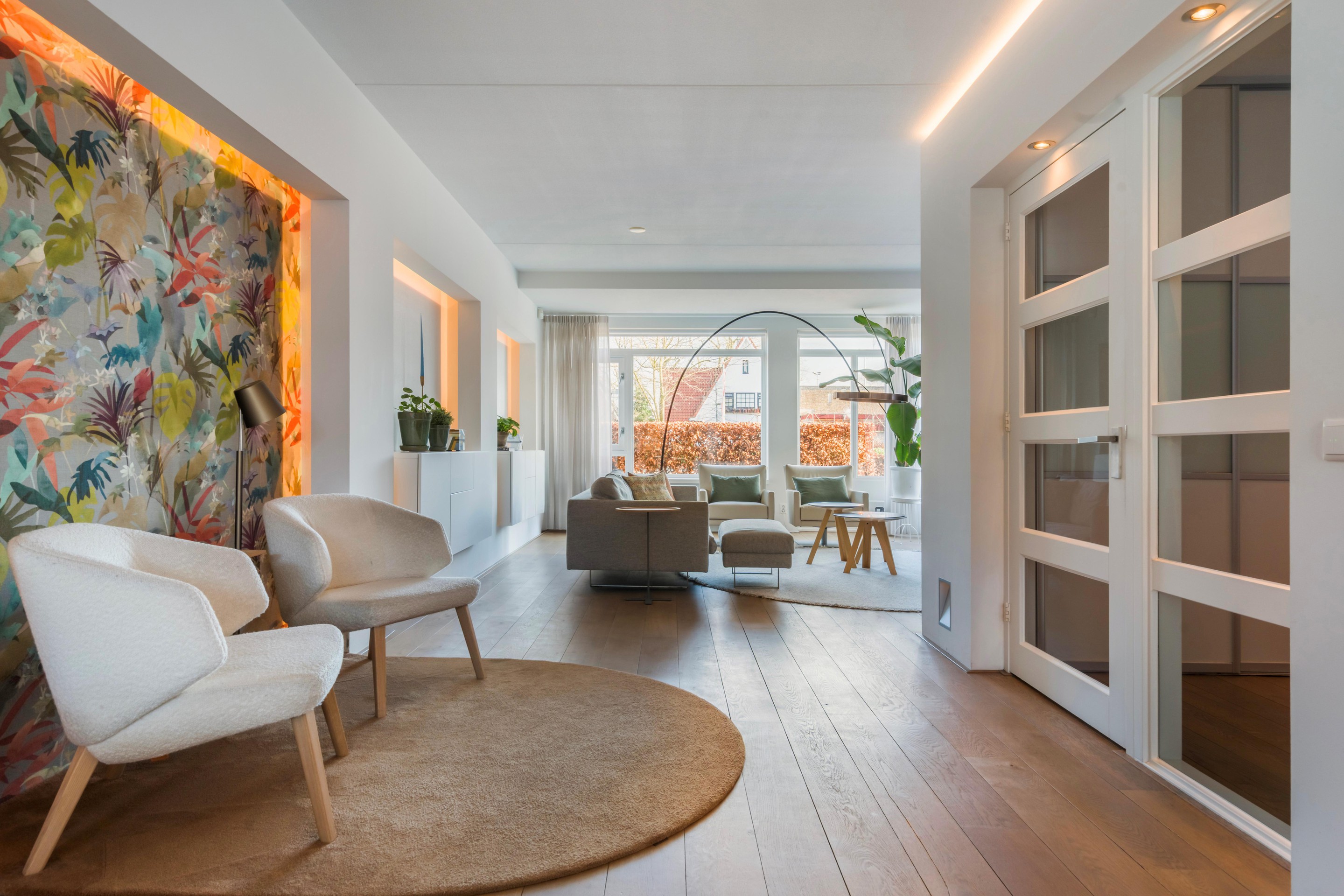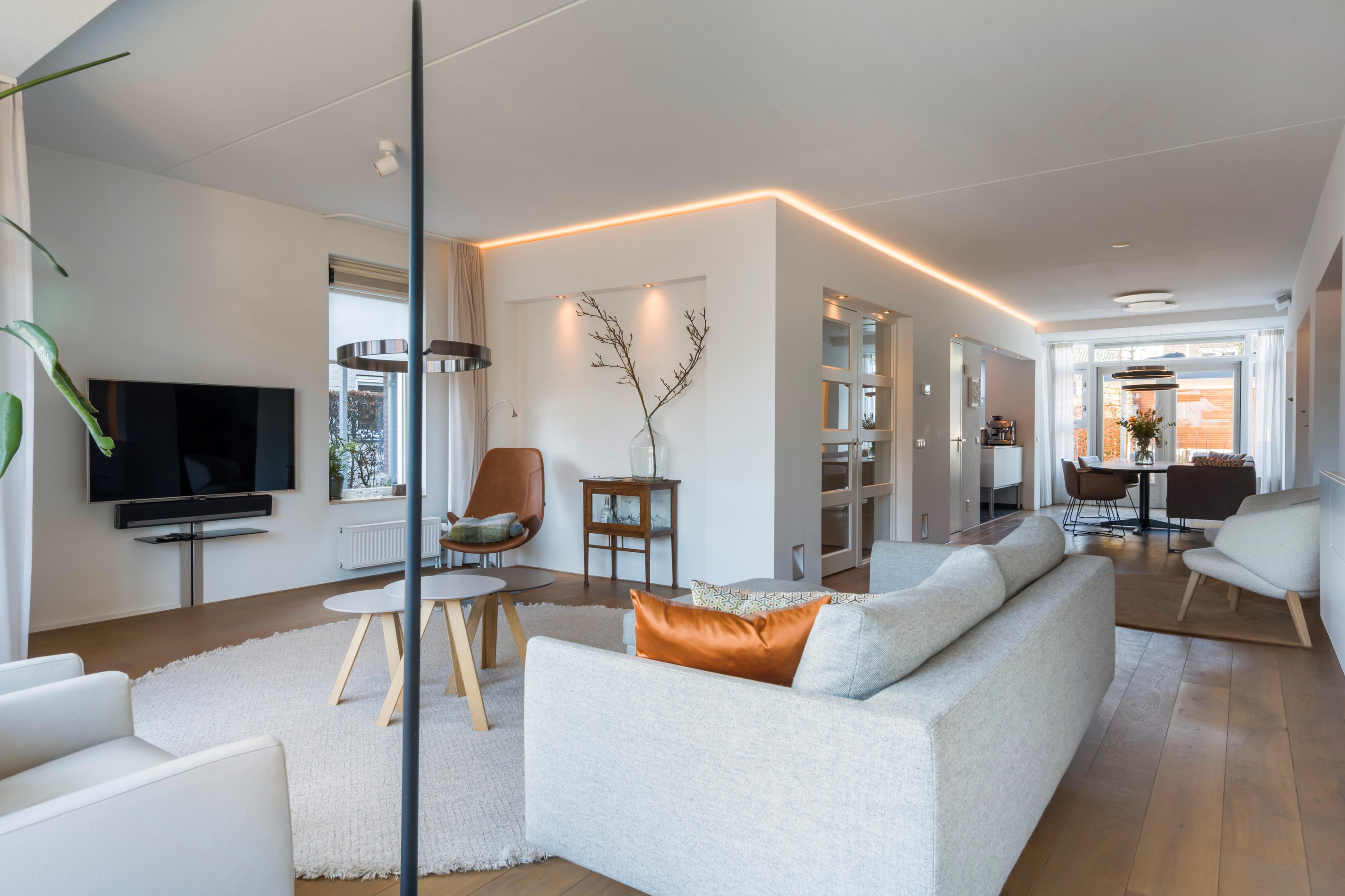 Via de entree komt u in de hal met toiletruimte, kastruimte en de trapopgang. Vanuit hier stapt u de lichte woonkamer in: ruim opgezet, met volop mogelijkheden voor een royale zithoek zonder dat dit ten koste gaat van de loopruimte. De indeling voelt open en verbonden, maar biedt tegelijk genoeg plekken om het knus en gezellig in te richten. De gehele begane grond beschikt over een houten vloer. De verlichting is geïntegreerd in de wanden, wat een mooi ruimtelijk effect geeft.
