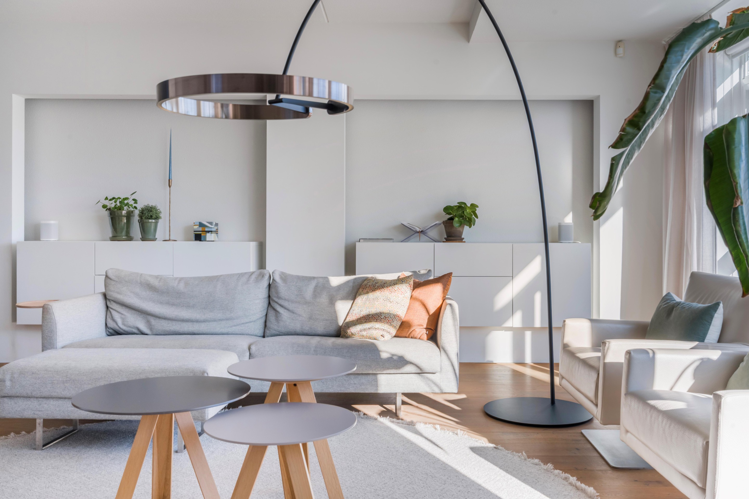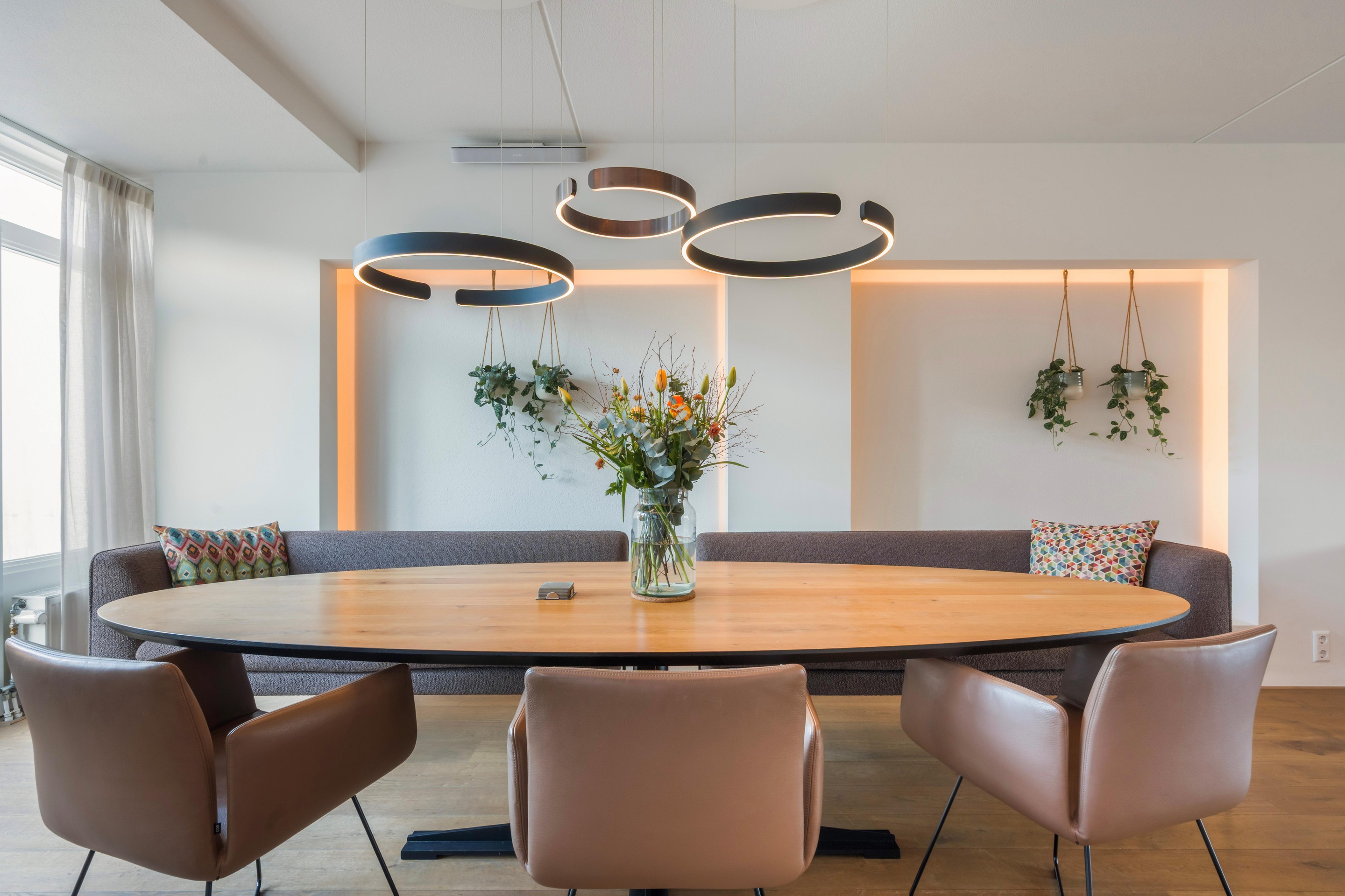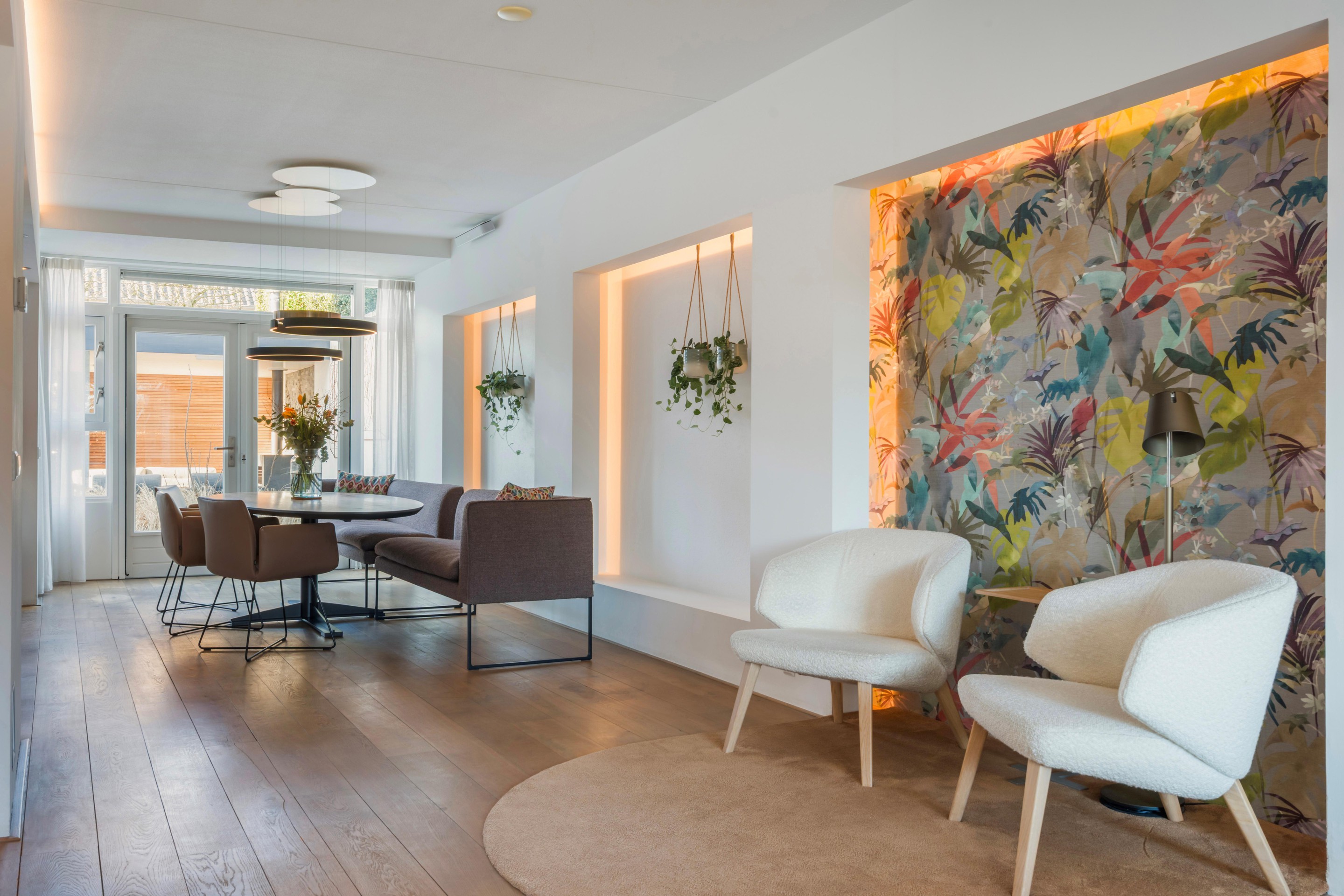 Via de entree komt u in de hal met toiletruimte, kastruimte en de trapopgang. Vanuit hier stapt u de lichte woonkamer in: ruim opgezet, met volop mogelijkheden voor een royale zithoek zonder dat dit ten koste gaat van de loopruimte. De indeling voelt open en verbonden, maar biedt tegelijk genoeg plekken om het knus en gezellig in te richten. De gehele begane grond beschikt over een houten vloer. De verlichting is geïntegreerd in de wanden, wat een mooi ruimtelijk effect geeft.