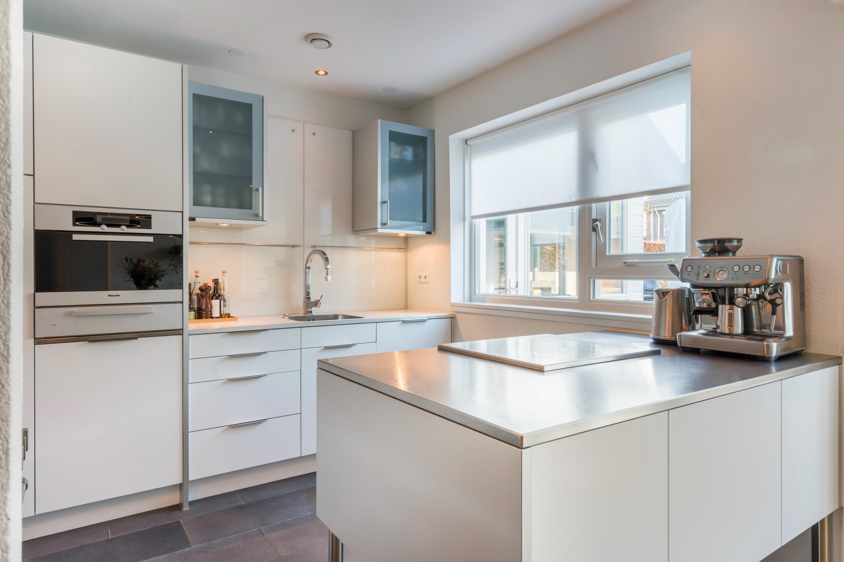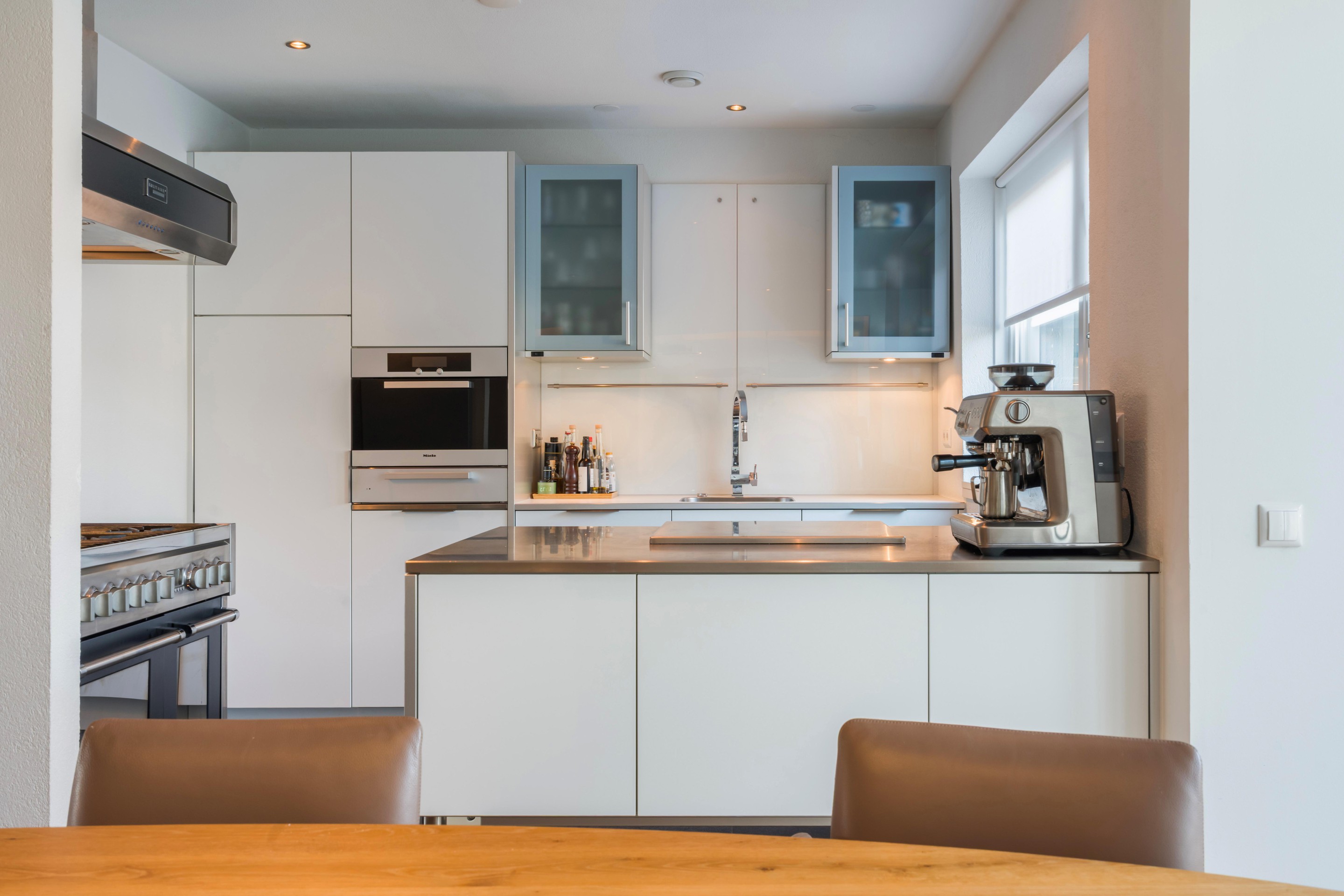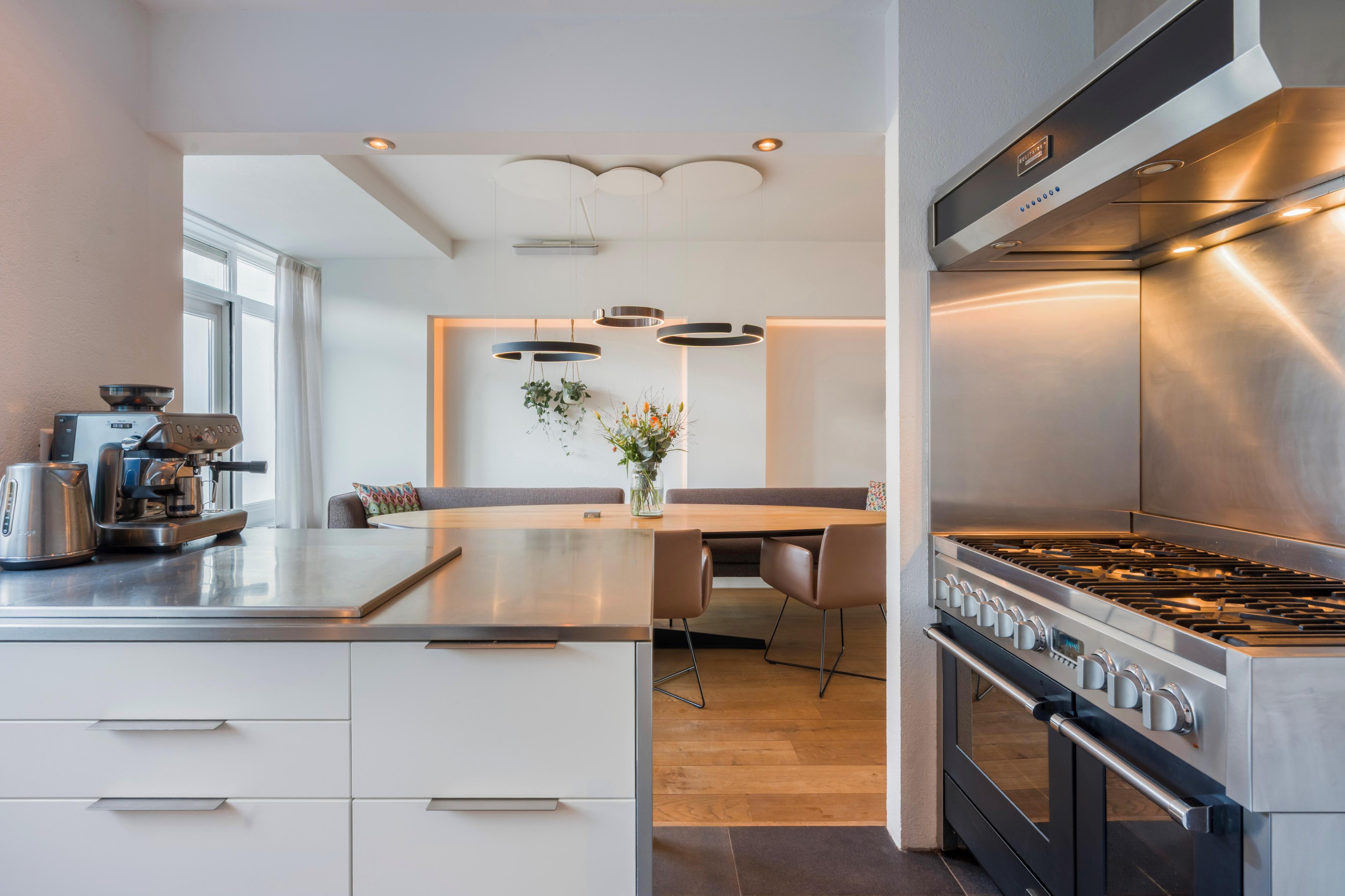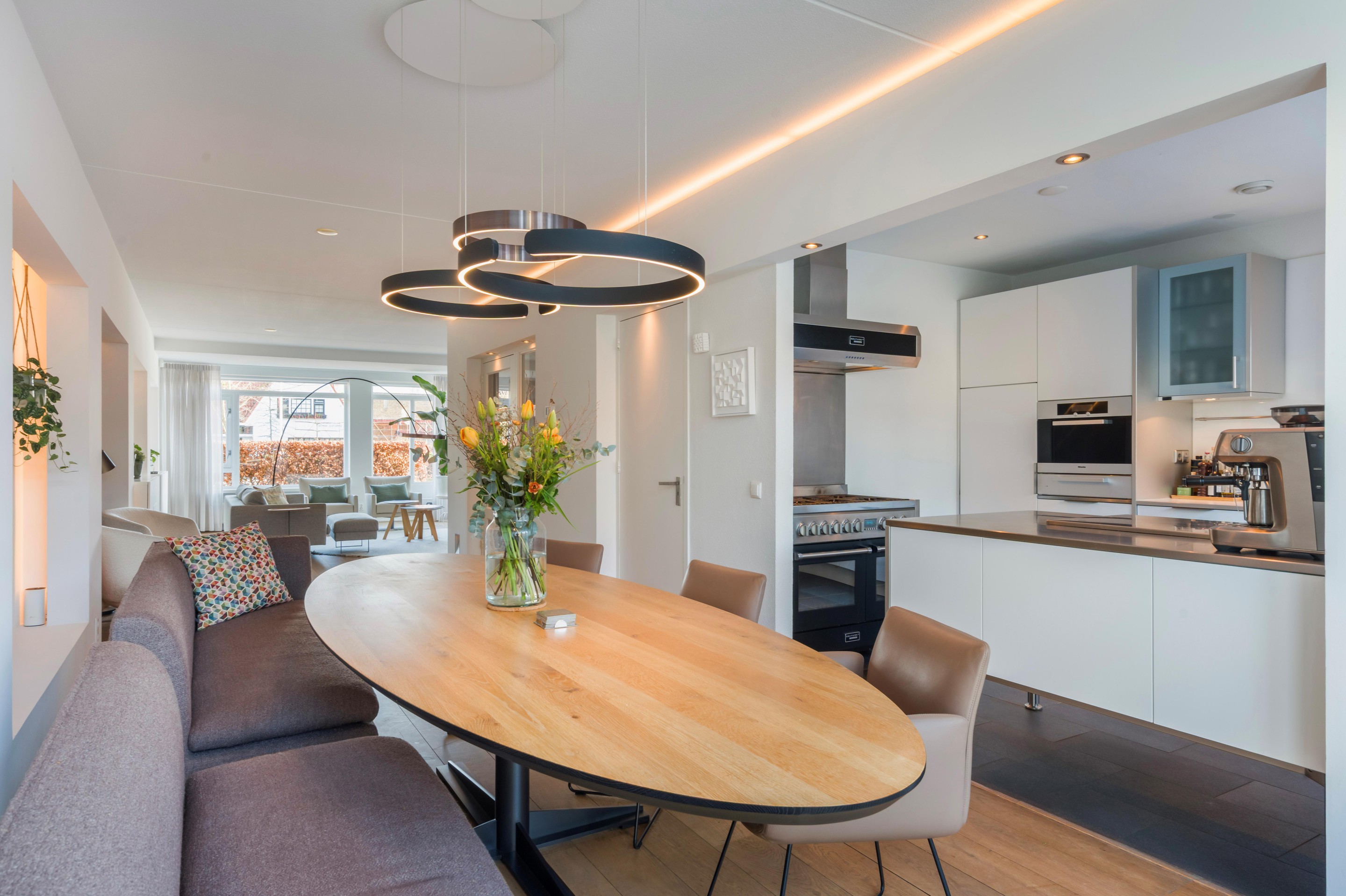 De half -open en moderne keuken van Bulthaup vormt samen met de eethoek het hart van de woning: een heerlijke plek om te koken en gezellig samen te zijn. Aansluitend aan de eethoek bevinden zich openslaande deuren naar buiten, waardoor binnen en buiten op natuurlijke wijze in elkaar overlopen. Vanuit de hal bereikt u ook de garage (met bergzolder) welke ideaal te gebruiken is als bergruimte en/of stalling van de auto en fietsen. Achter de garage bevindt zich nog een extra kamer; ideaal als thuiswerkplek, hobbyruimte of speel-/logeerkamer. Deze ruimte kan ook gebruikt worden als slaapkamer, tevens kan er ook een badkamer gerealiseerd worden in de garage.