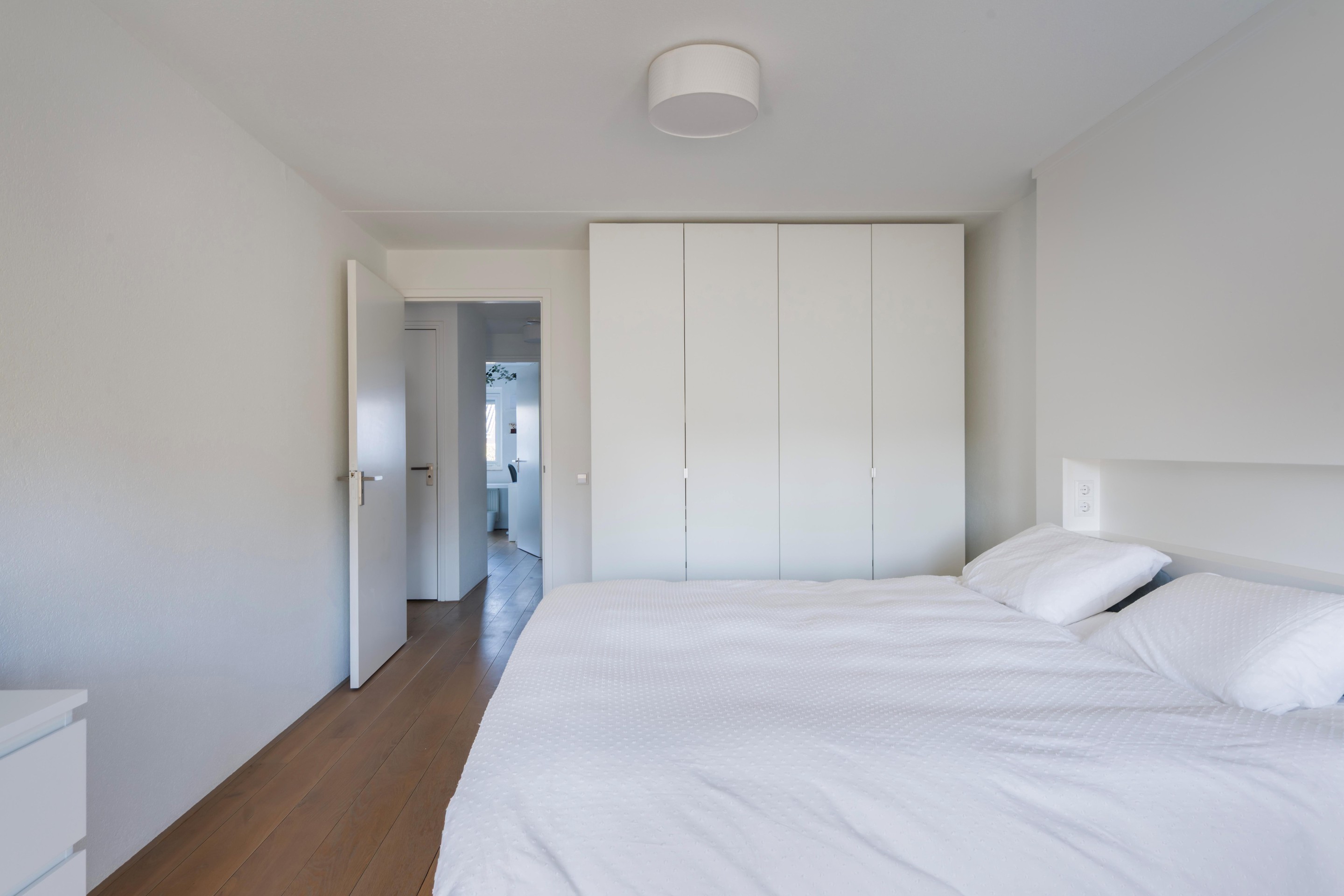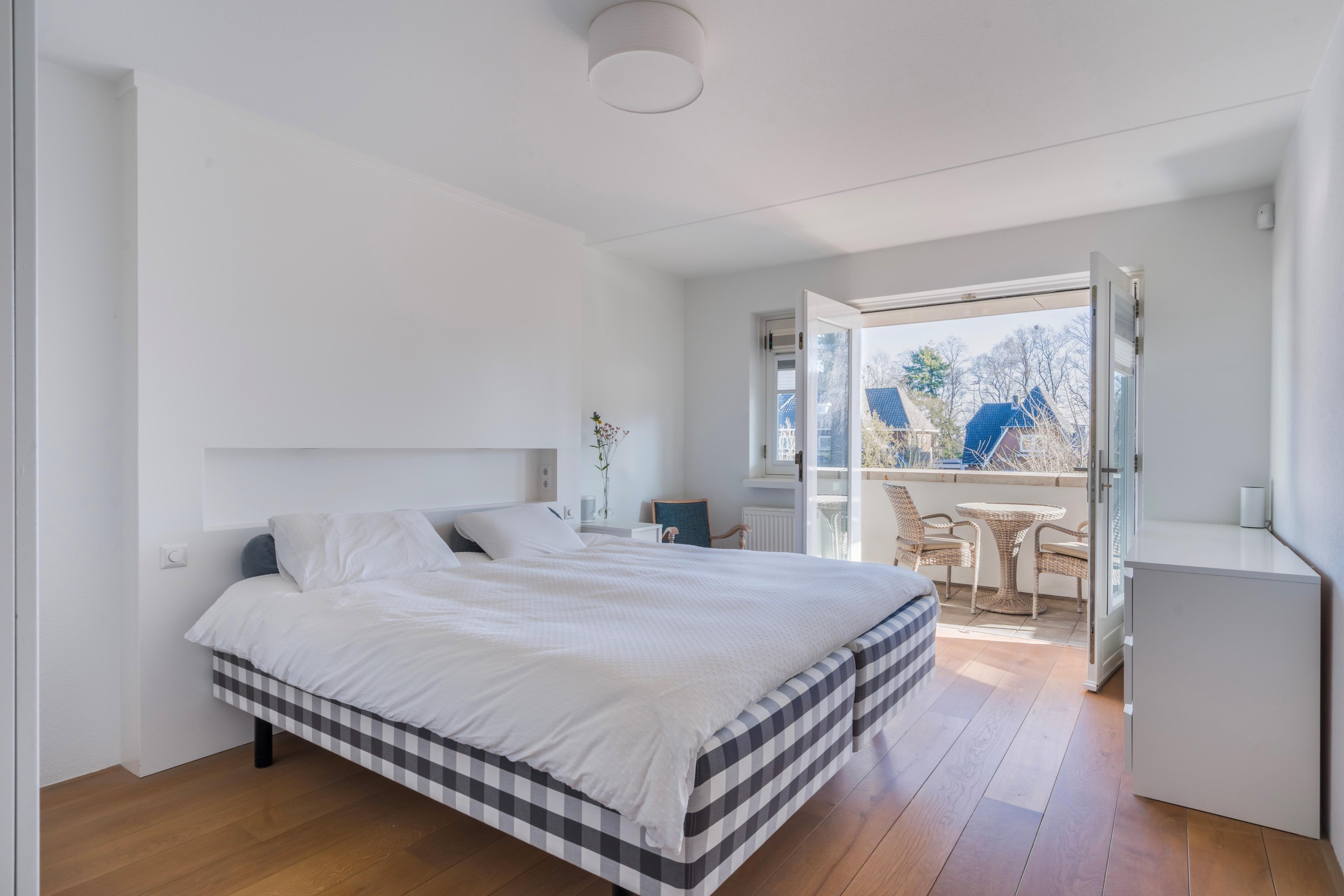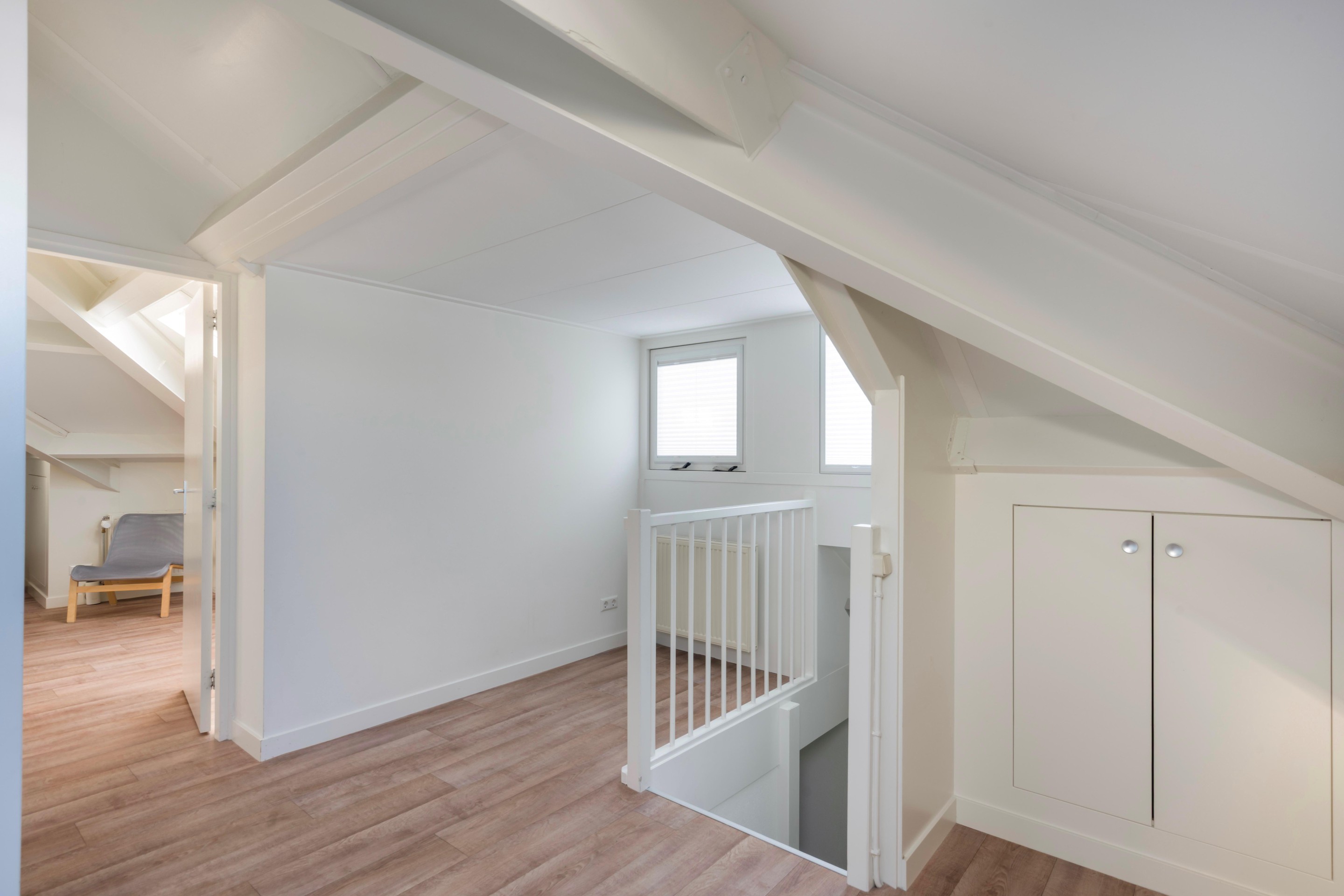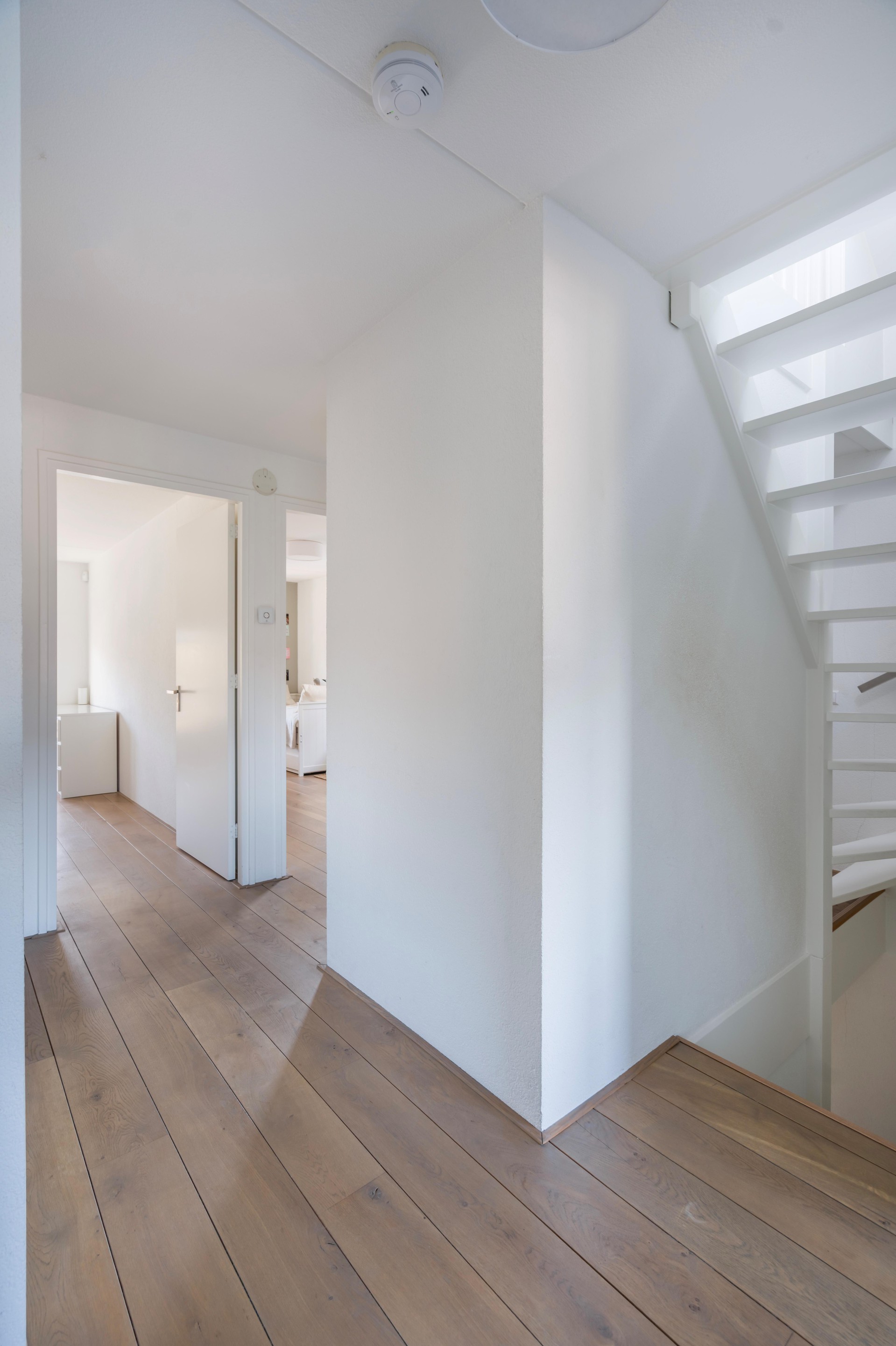 Op de eerste verdieping komt u op de overloop die toegang geeft tot vier slaapkamers. De kamers zijn prettig en ruim van formaat en daardoor geschikt voor een gezin, logees of bijvoorbeeld een combinatie van slapen en werken/studeren. De hele verdieping is voorzien van dezelfde houten vloer als de benedenverdieping. De grotere slaapkamer heeft bovendien toegang tot het balkon aan de Kerkewijk: een leuke extra om even een frisse neus te halen of de dag rustig te starten. De badkamer is compleet ingericht met dubbele wastafel, inloopdouche en bad. Daarnaast is er nog een separaat toilet.