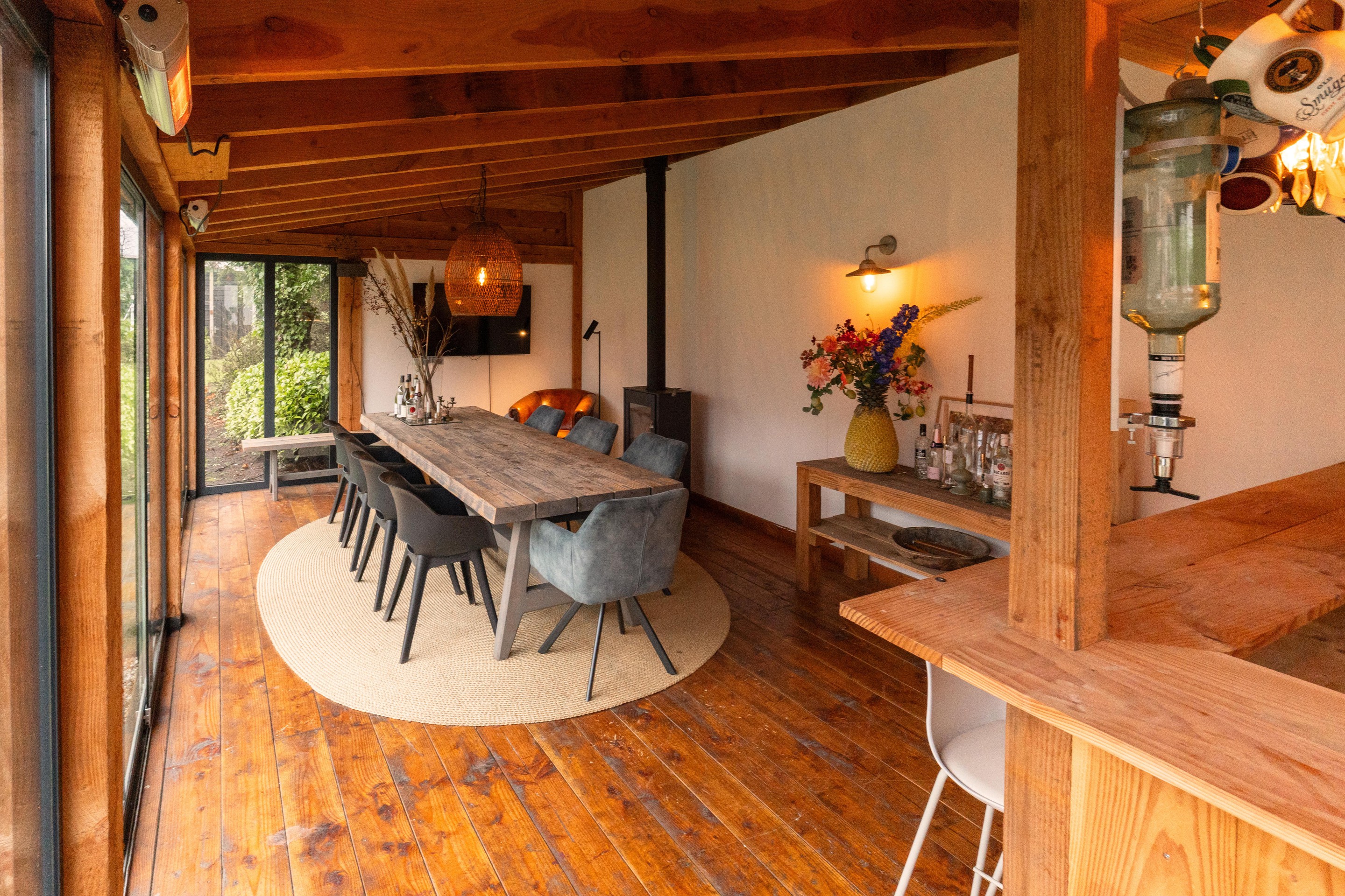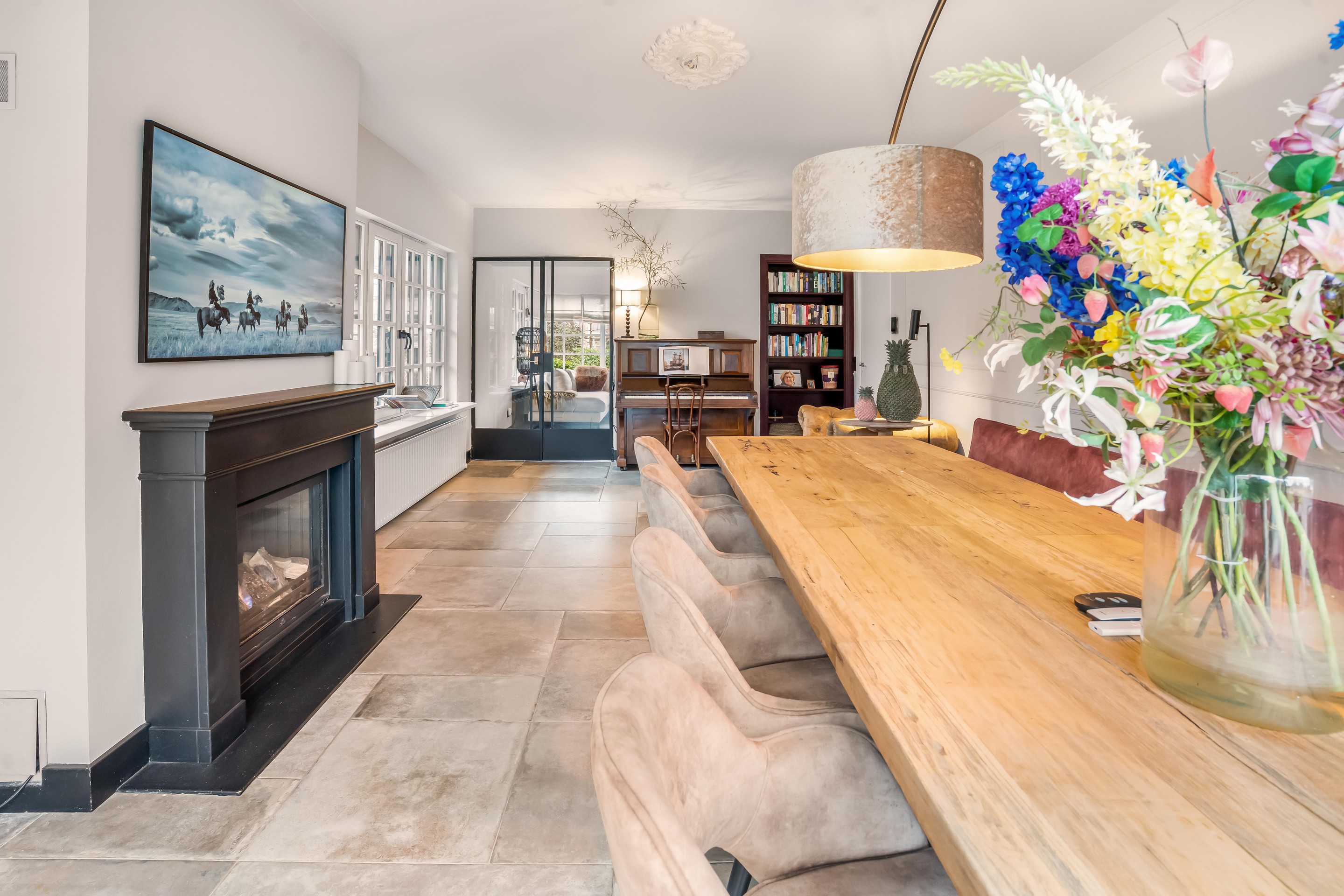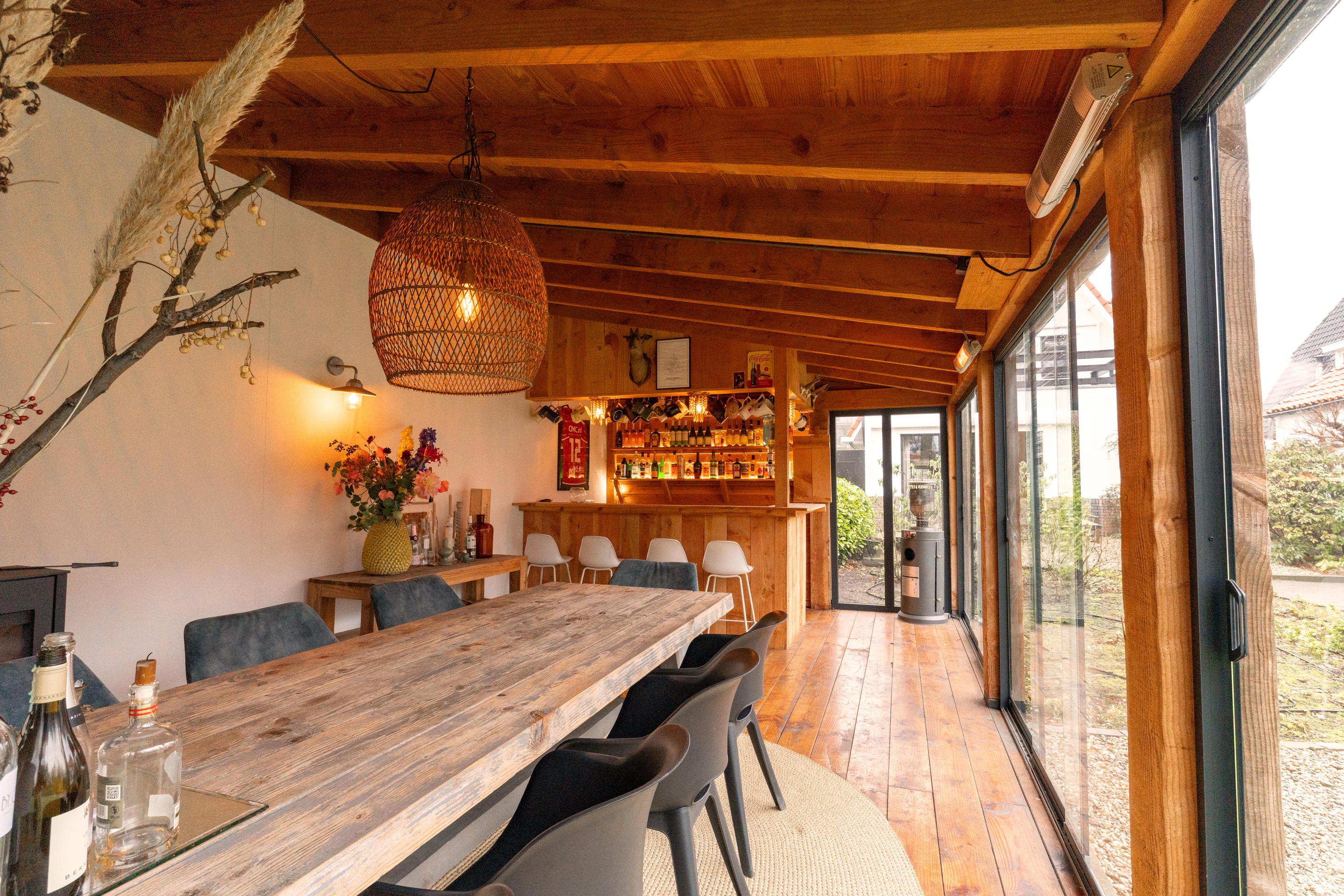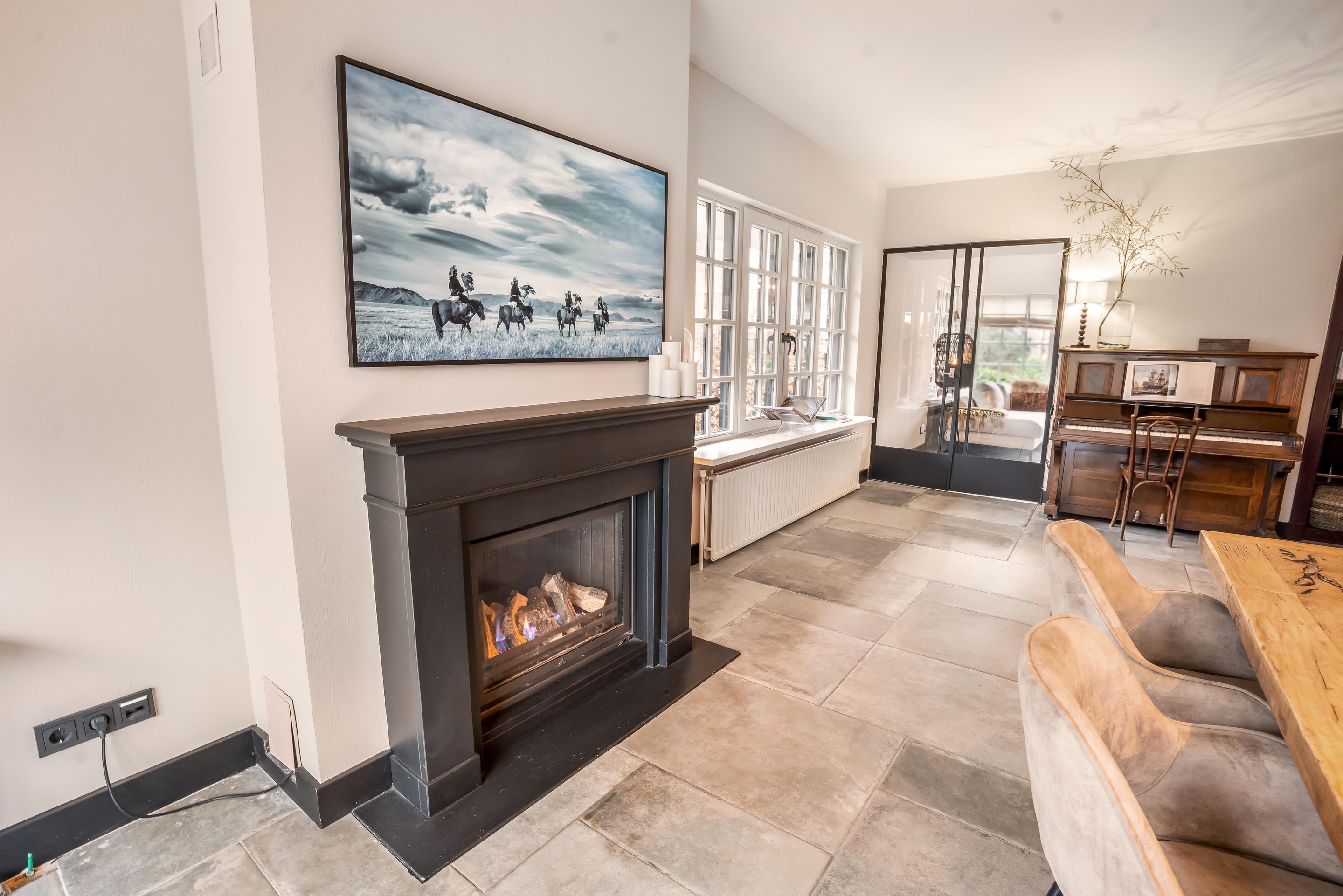 De sfeervolle woonkamer-en-suite van ca. 55 m2 is heerlijk licht, voorzien van een gezellige houtkachel en vernieuwde kozijnen met roedeverdeling. Alle wanden en het plafond zijn in 2025 strak gestuct en geschilderd. Vanuit de eetkamer kijkt u vrijuit over de fraaie tuin met als eyecatcher de ruime en moderne veranda met bar en houtkachel. In de eetkamer is ruimte voor een grote familietafel en deze ruimte beschikt over een gashaard voor extra warmte en sfeer. Op de gehele begane grond is een prachtige nieuwe tegelvloer aangebracht.