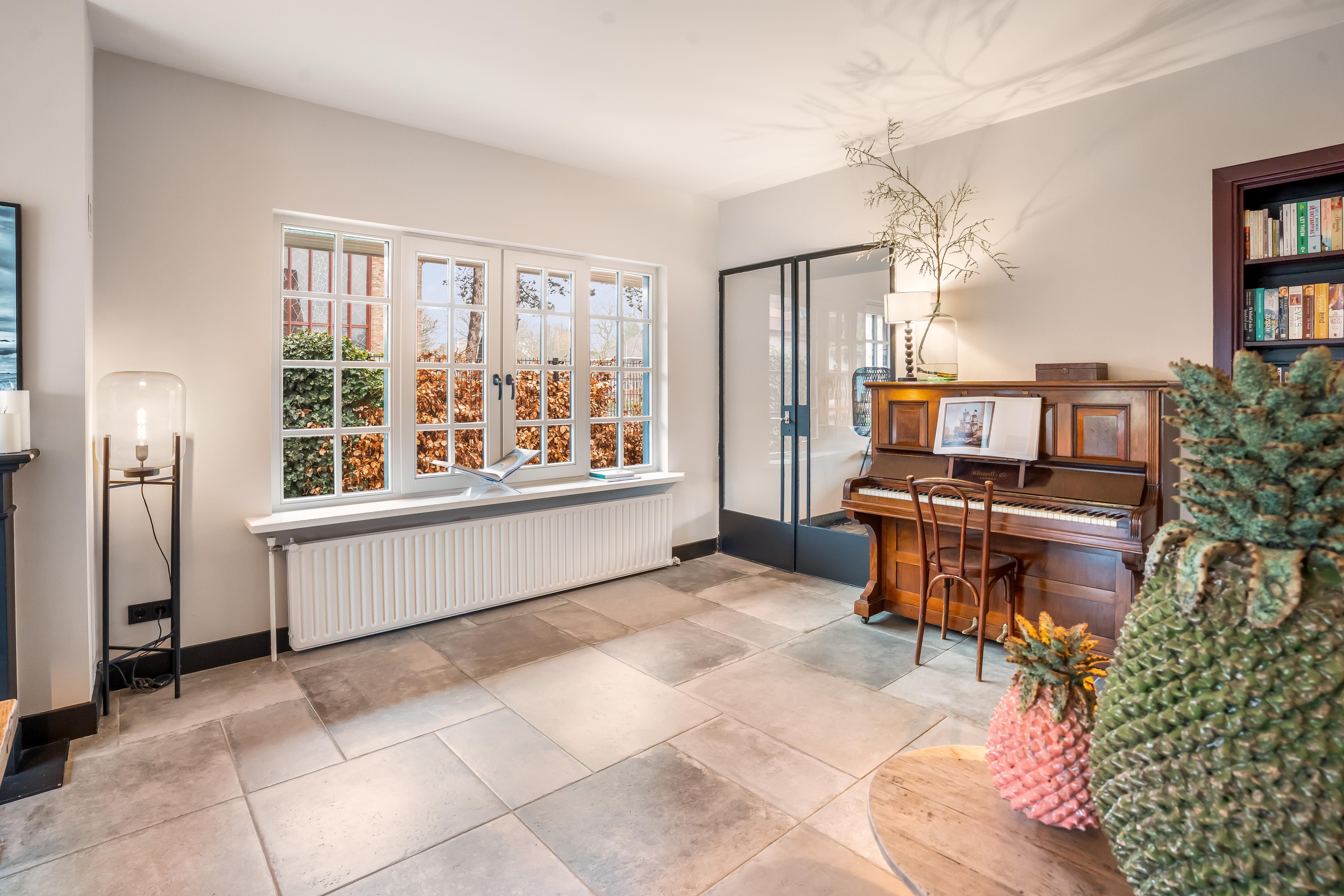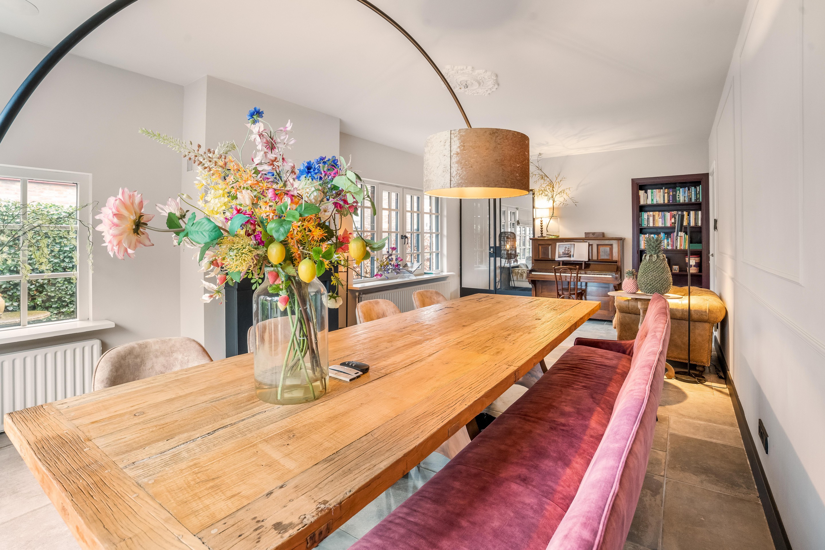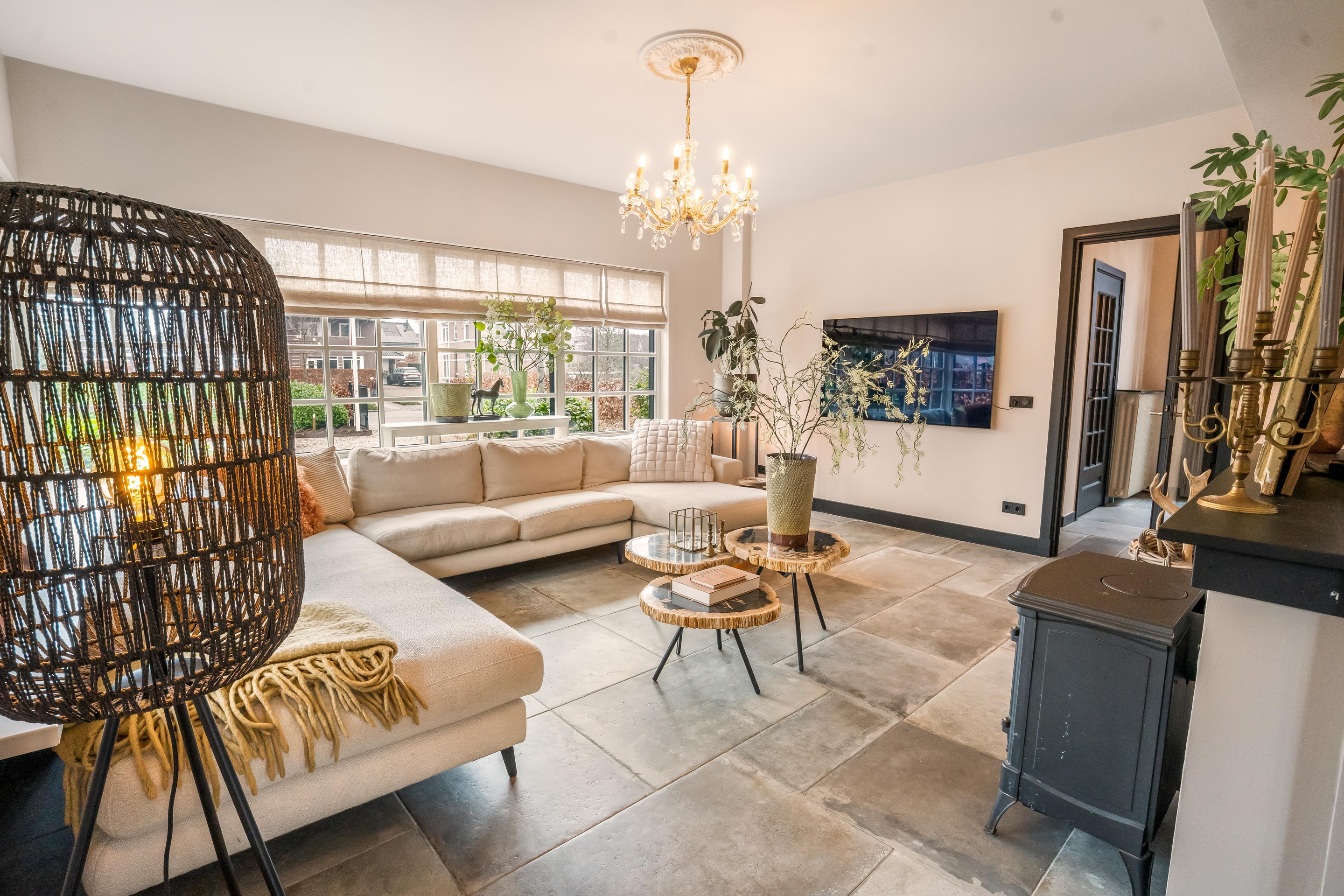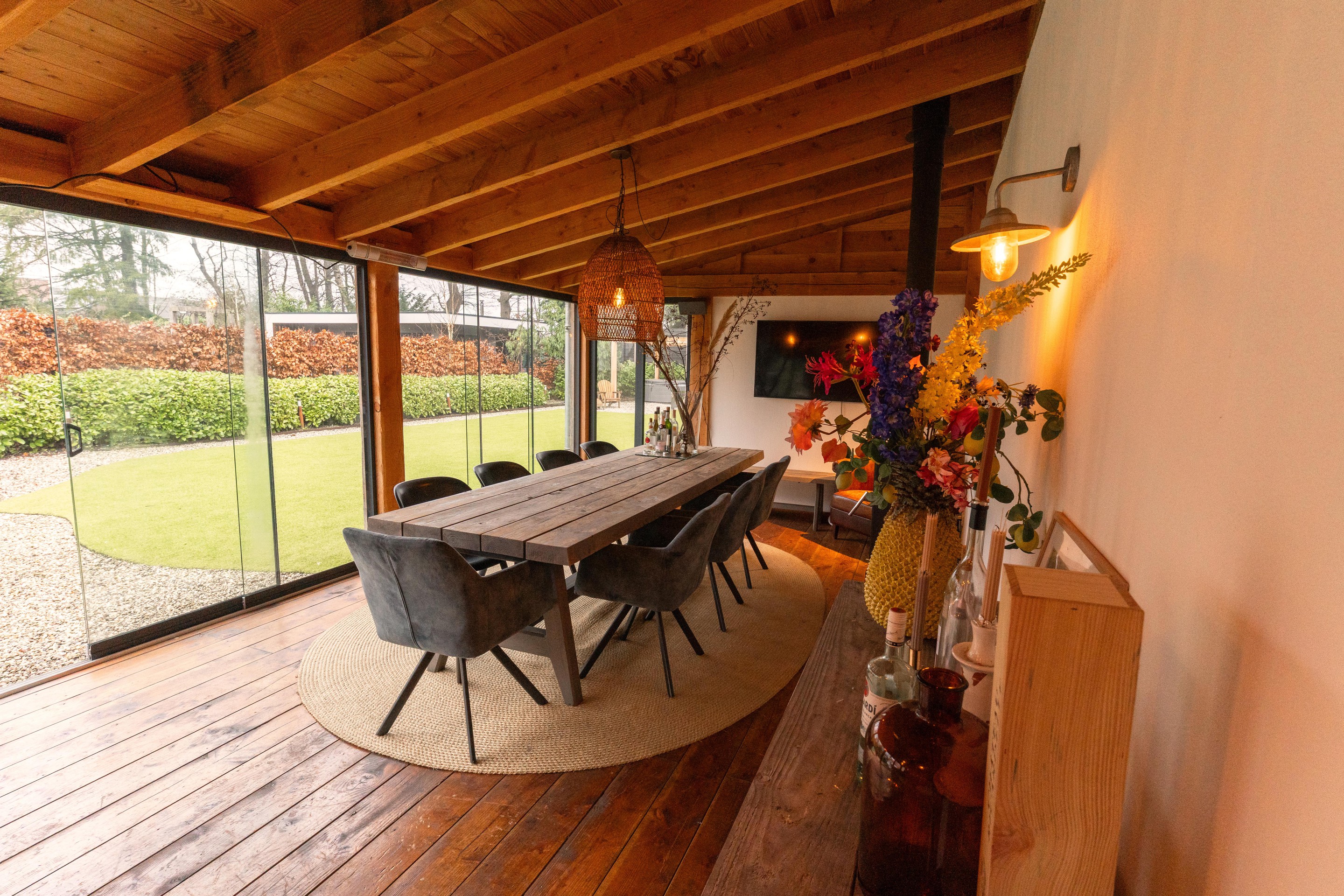 De sfeervolle woonkamer-en-suite van ca. 55 m2 is heerlijk licht, voorzien van een gezellige houtkachel en vernieuwde kozijnen met roedeverdeling. Alle wanden en het plafond zijn in 2025 strak gestuct en geschilderd. Vanuit de eetkamer kijkt u vrijuit over de fraaie tuin met als eyecatcher de ruime en moderne veranda met bar en houtkachel. In de eetkamer is ruimte voor een grote familietafel en deze ruimte beschikt over een gashaard voor extra warmte en sfeer. Op de gehele begane grond is een prachtige nieuwe tegelvloer aangebracht.