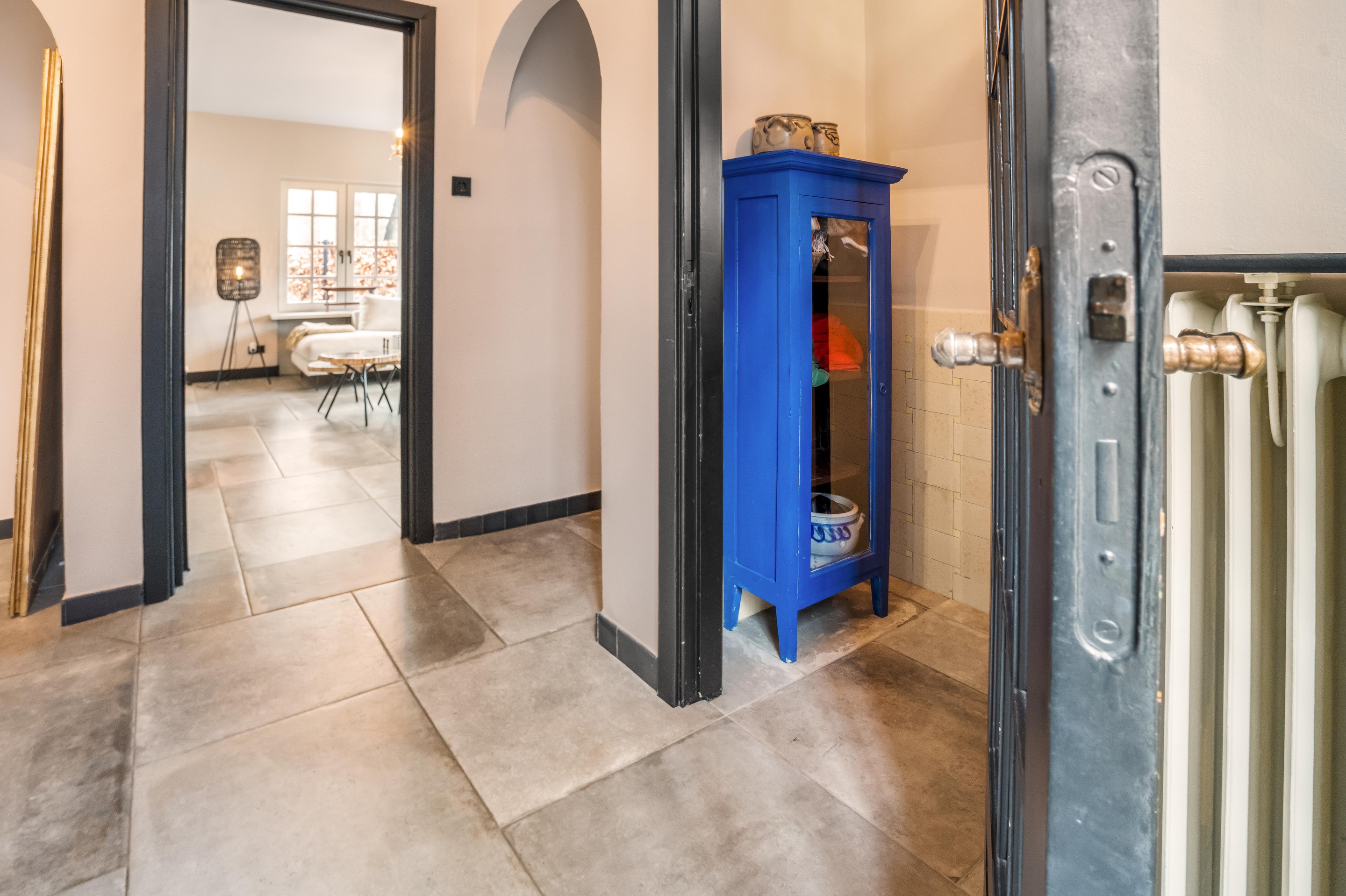 U komt binnen via de overdekte entree. De vestibule met garderobe leidt naar een royale hal met vide en bordestrap. Er worden charmante originele details gevonden, zoals het hoge glas-in-loodraam. In 2018 is het toilet gemoderniseerd. Ook bereikt u vanuit de hal de provisiekelder/wijnkelder van ca. 13 m2, waar ook de aansluitingen zijn voor de wasmachine en droger.