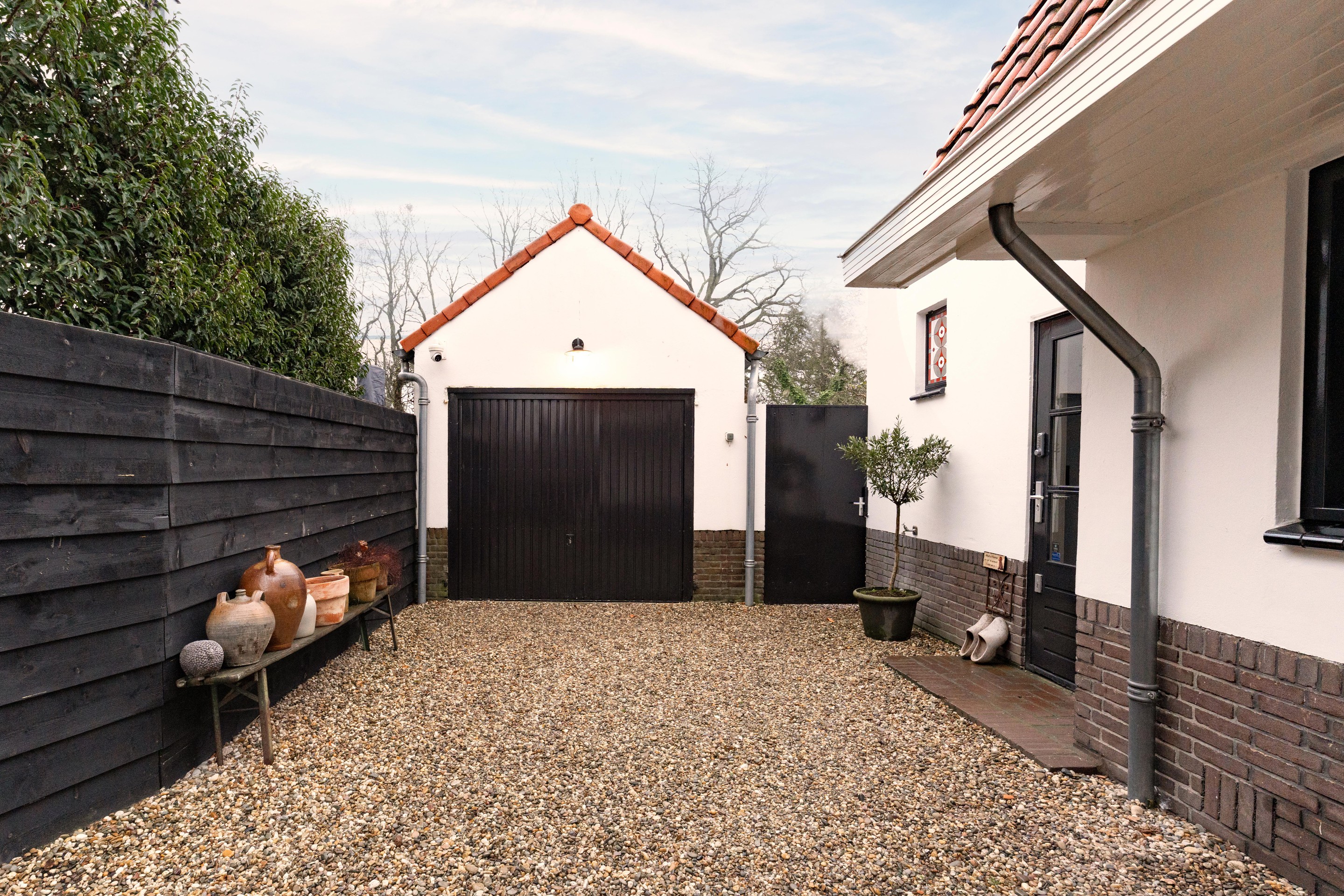 Er is een vrijstaande stenen berging van ca. 16 m2 met elektra. Naast de woning ligt een brede, diepe oprit voor meerdere auto's.