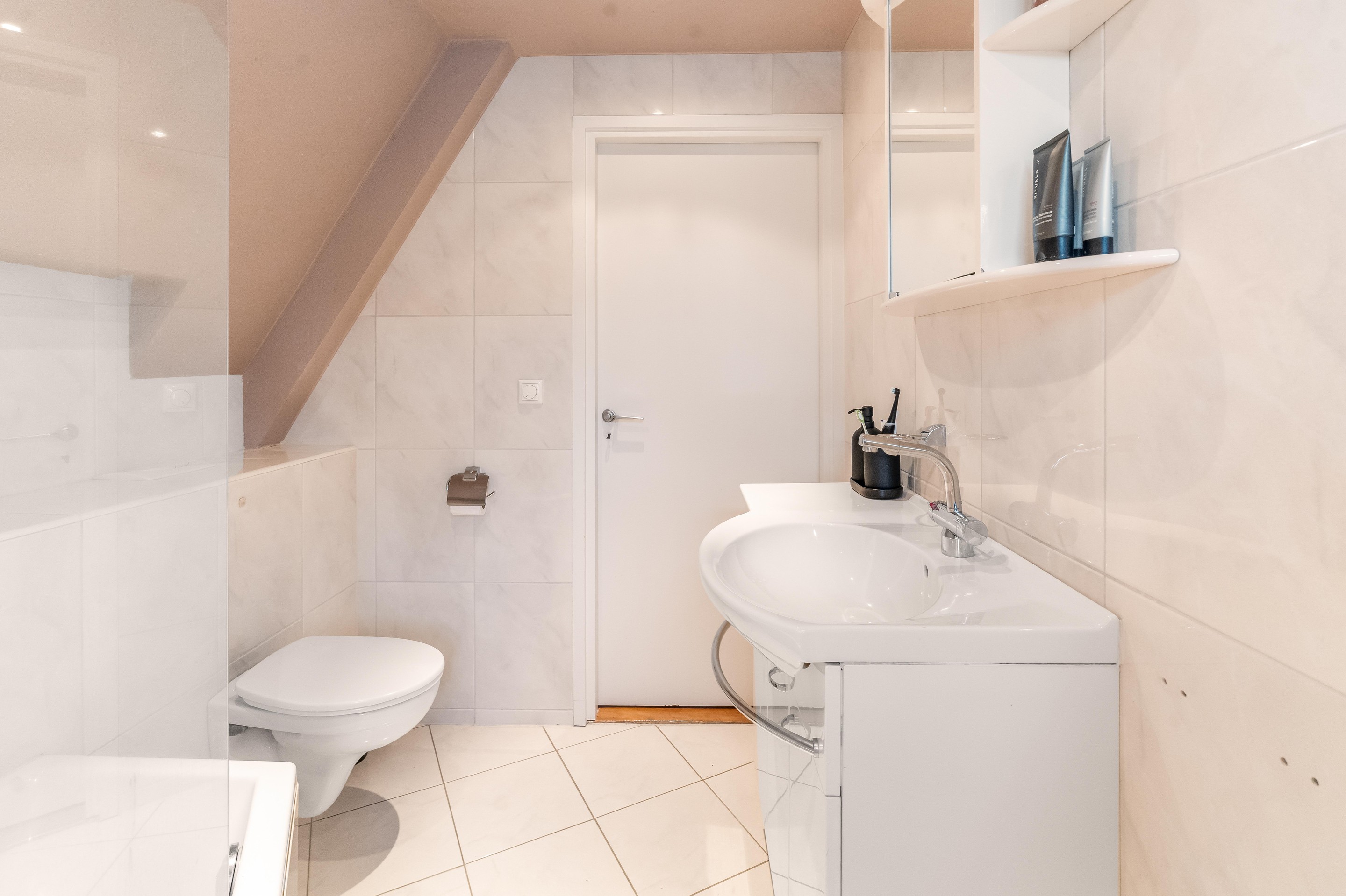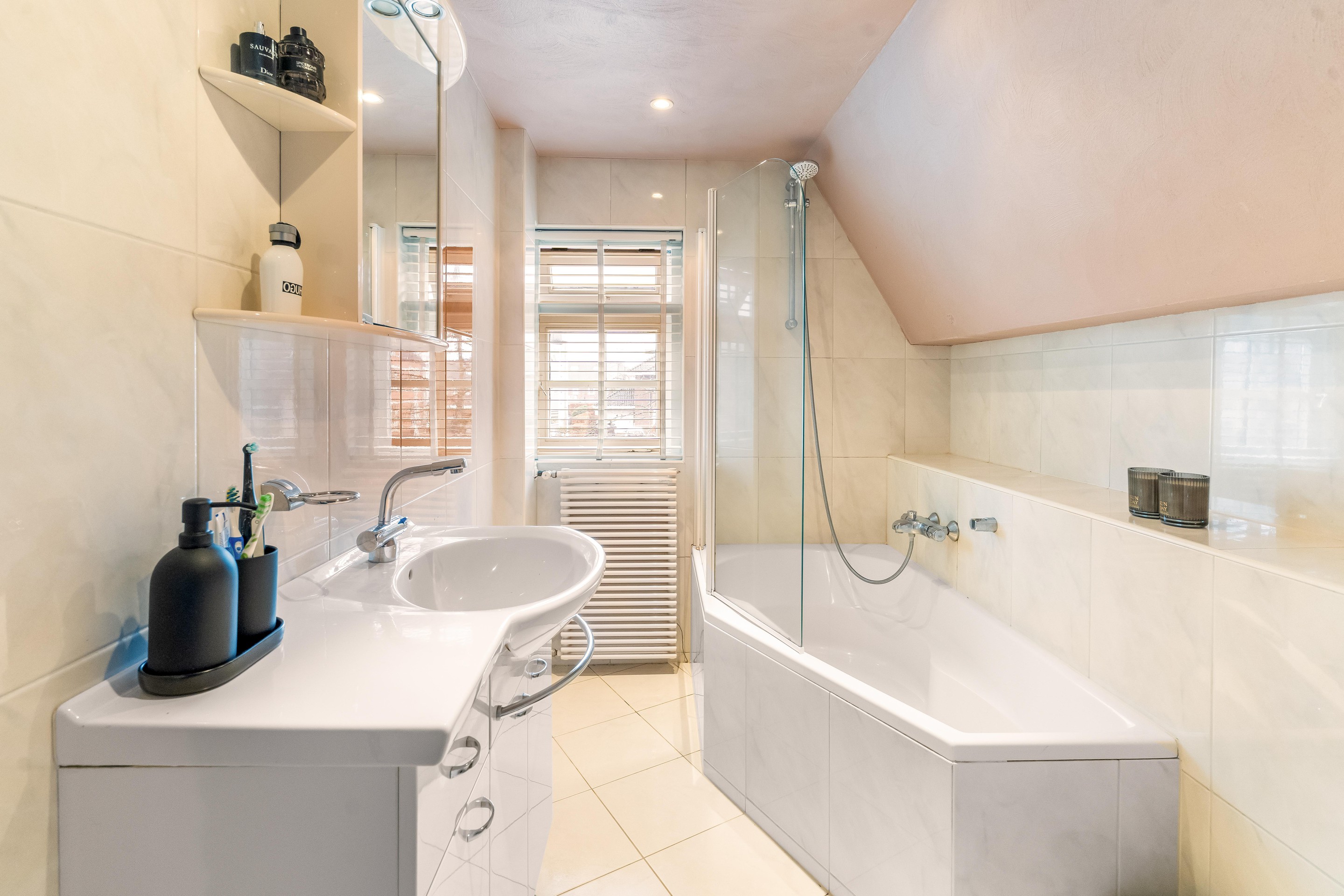 De bordestrap brengt u naar een sfeervolle verdieping met vide en glas-in-lood. Er zijn drie volwaardige slaapkamers van ca. 17 m2, 14,5 m2 en 7 m2. De slaapkamer aan de achterzijde geeft toegang tot het grote zonnige balkon van ca. 15 m2. Ook vaste kastruimte ontbreekt niet op de eerste verdieping. De comfortabele badkamer van ca. 5 m2 is uitgevoerd in lichte kleurstelling. Deze beschikt over een ligbad met douchefunctie, een hangend toilet en een wastafelmeubel met spiegelkast. Het plafond is voorzien van inbouwspots.