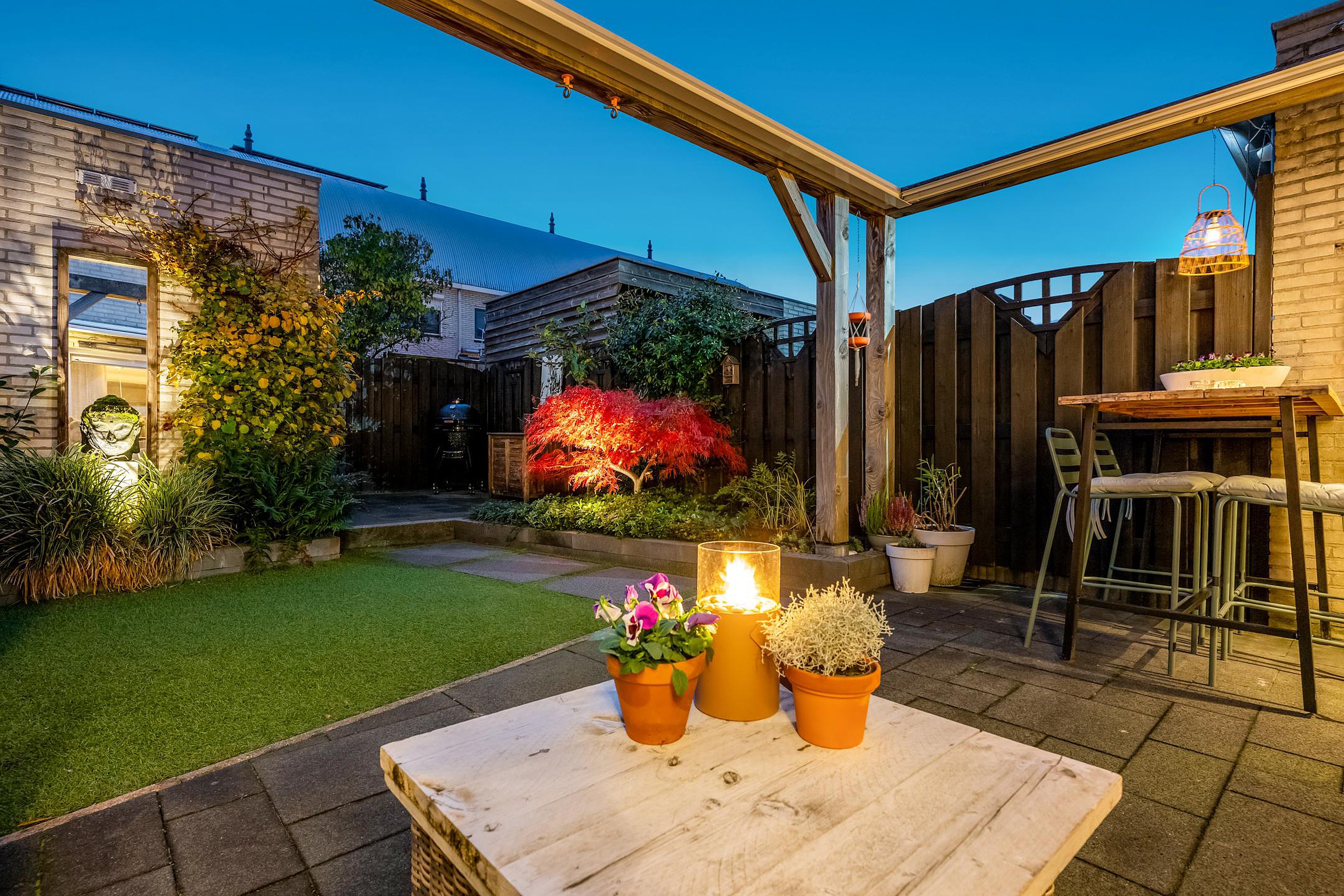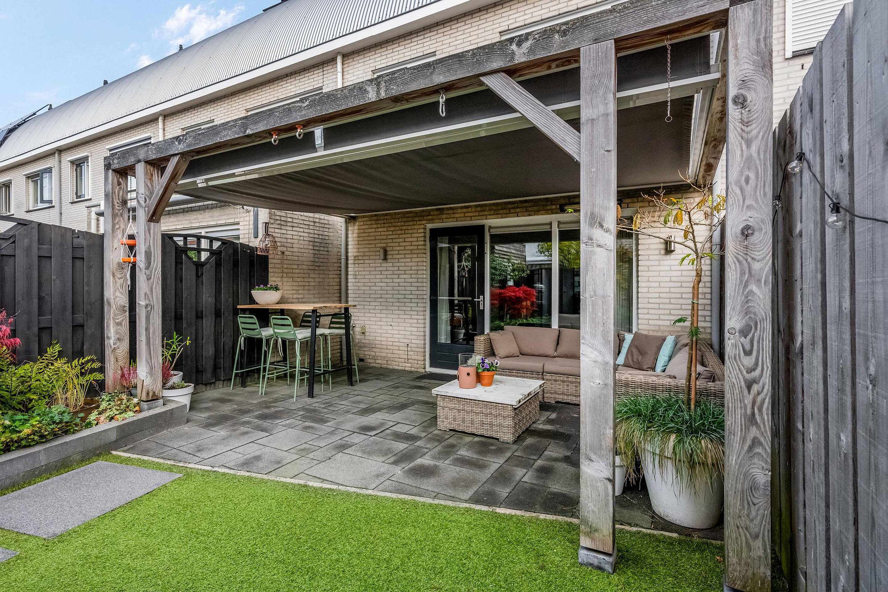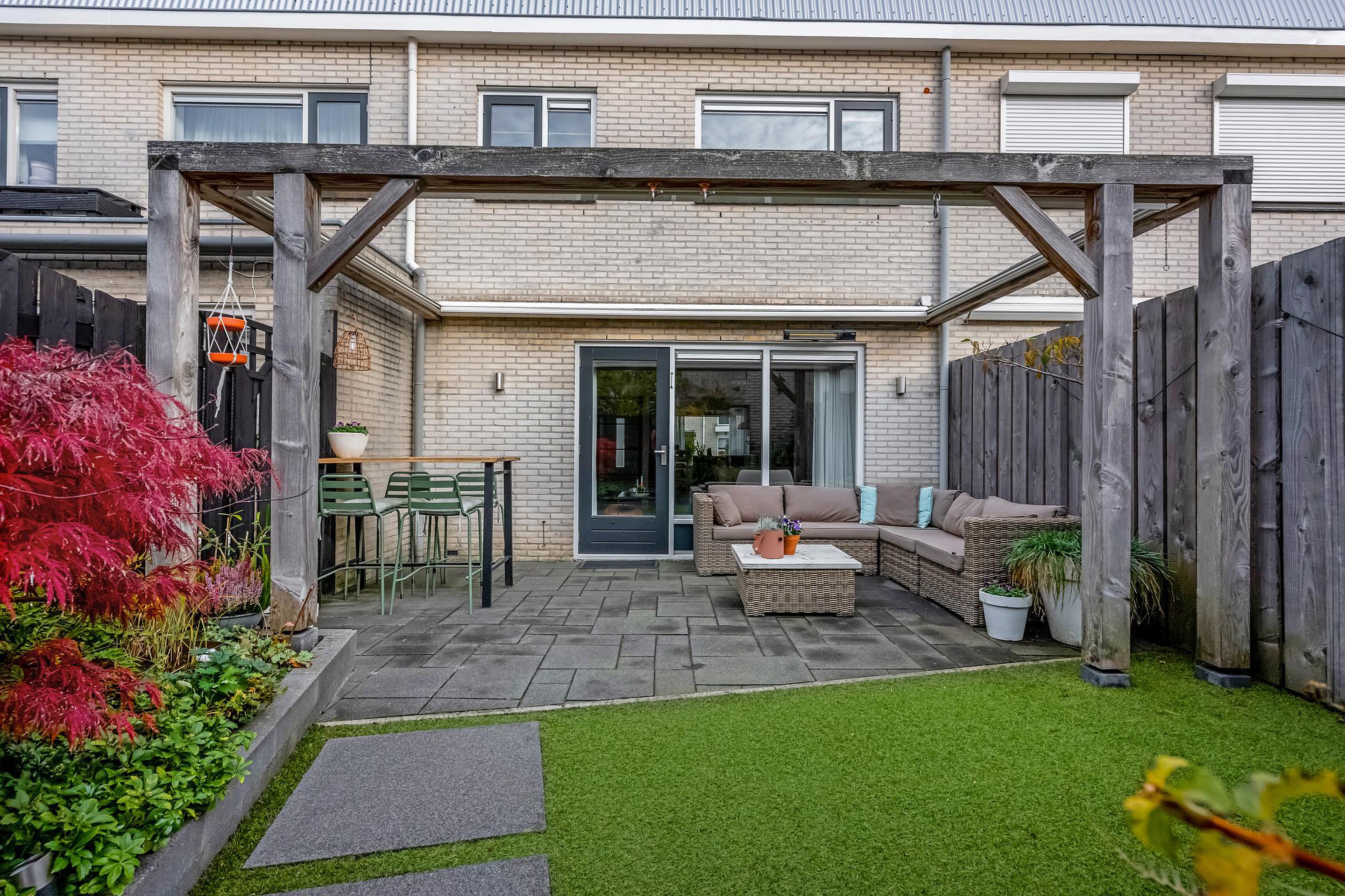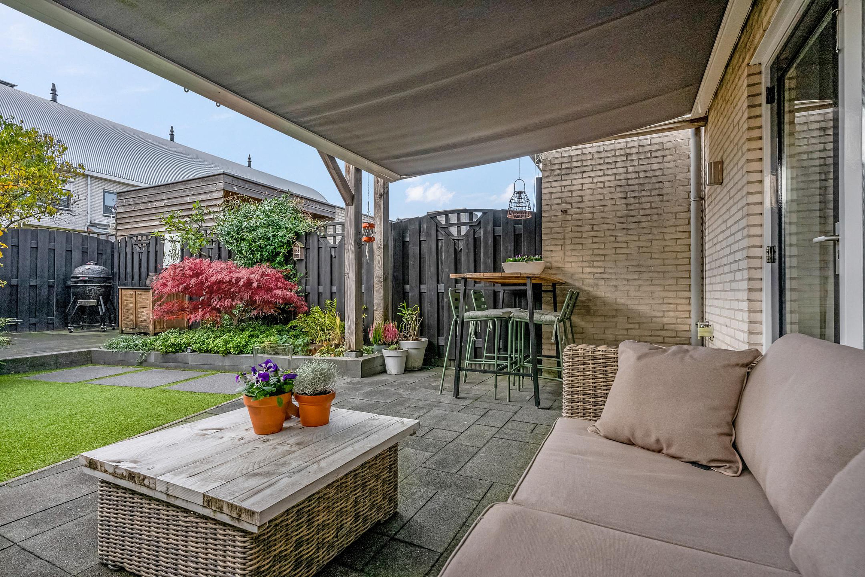 De achtertuin is fraai aangelegd en gericht op het zuidwesten. Dankzij het kunstgras en de onderhoudsarme indeling heeft u weinig werk en veel comfort. Er is genoeg ruimte voor een lounge- of tuintafel en met het grote zonnescherm creëert u eenvoudig een schaduwrijke plek. Achterin de tuin staat een vrijstaande berging, ideaal voor fietsen en tuingereedschap.