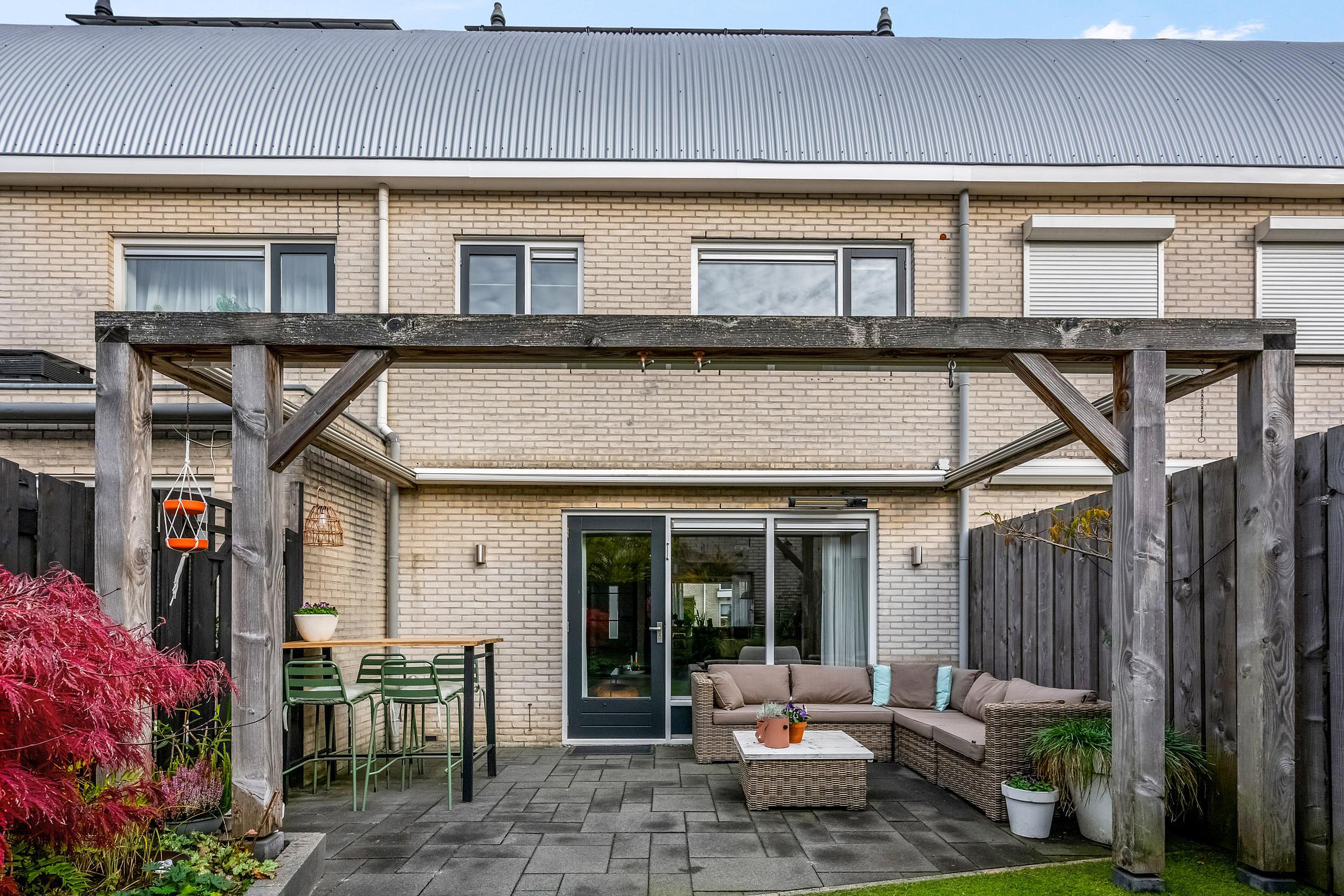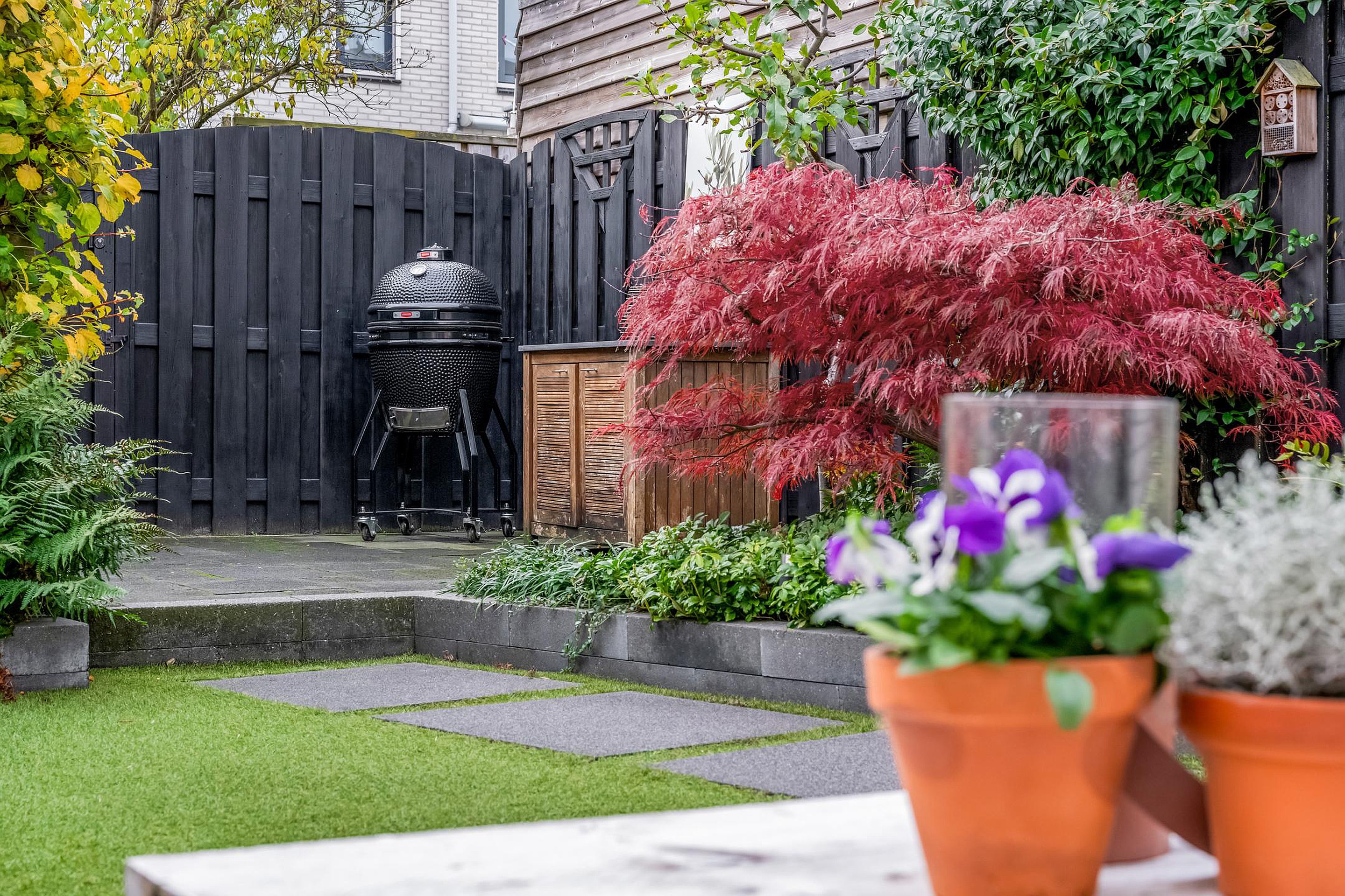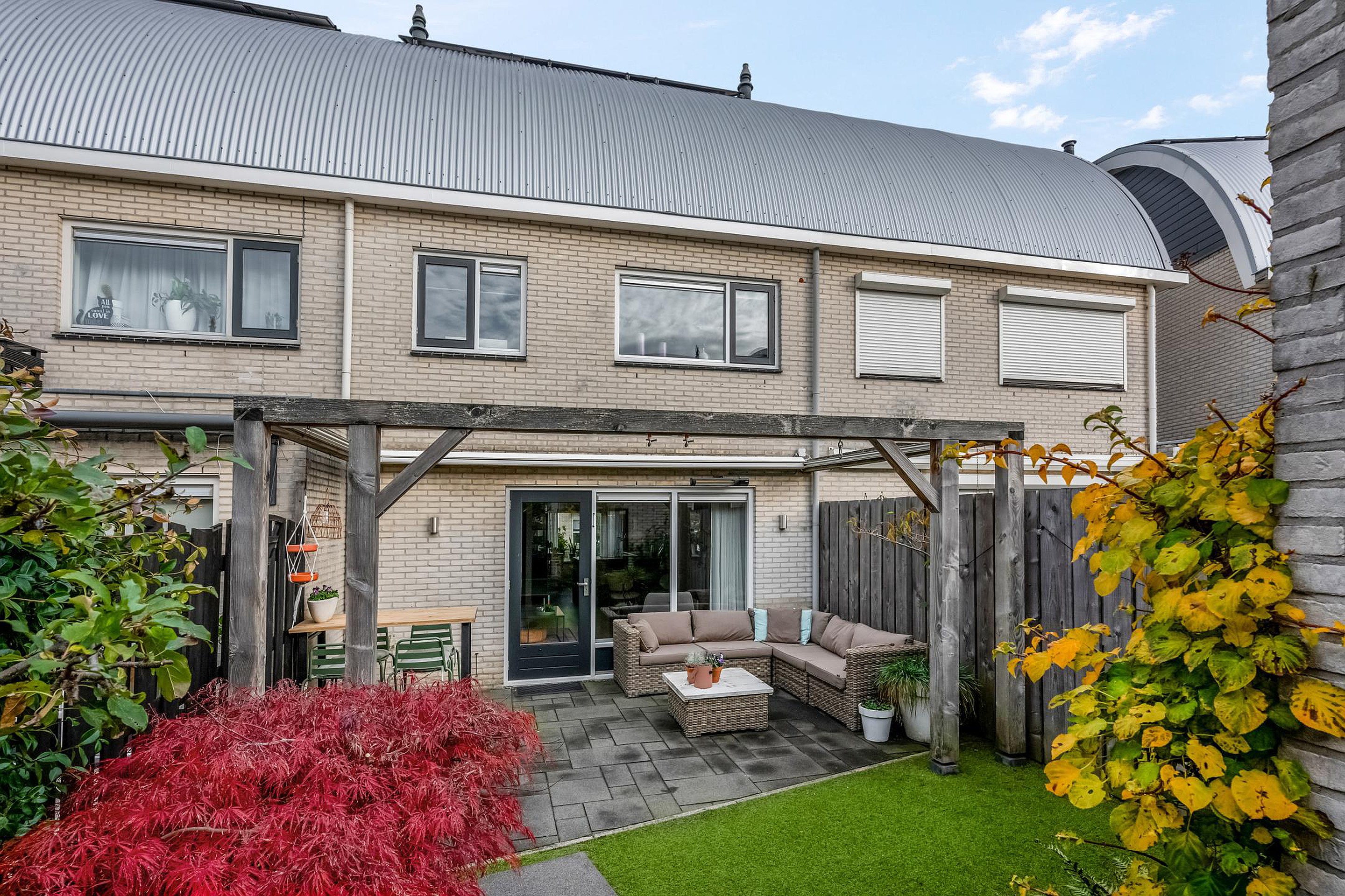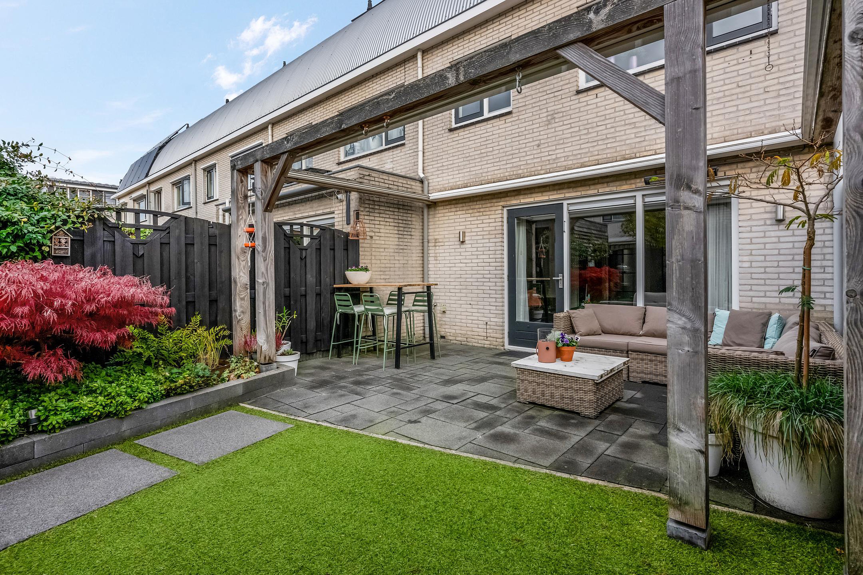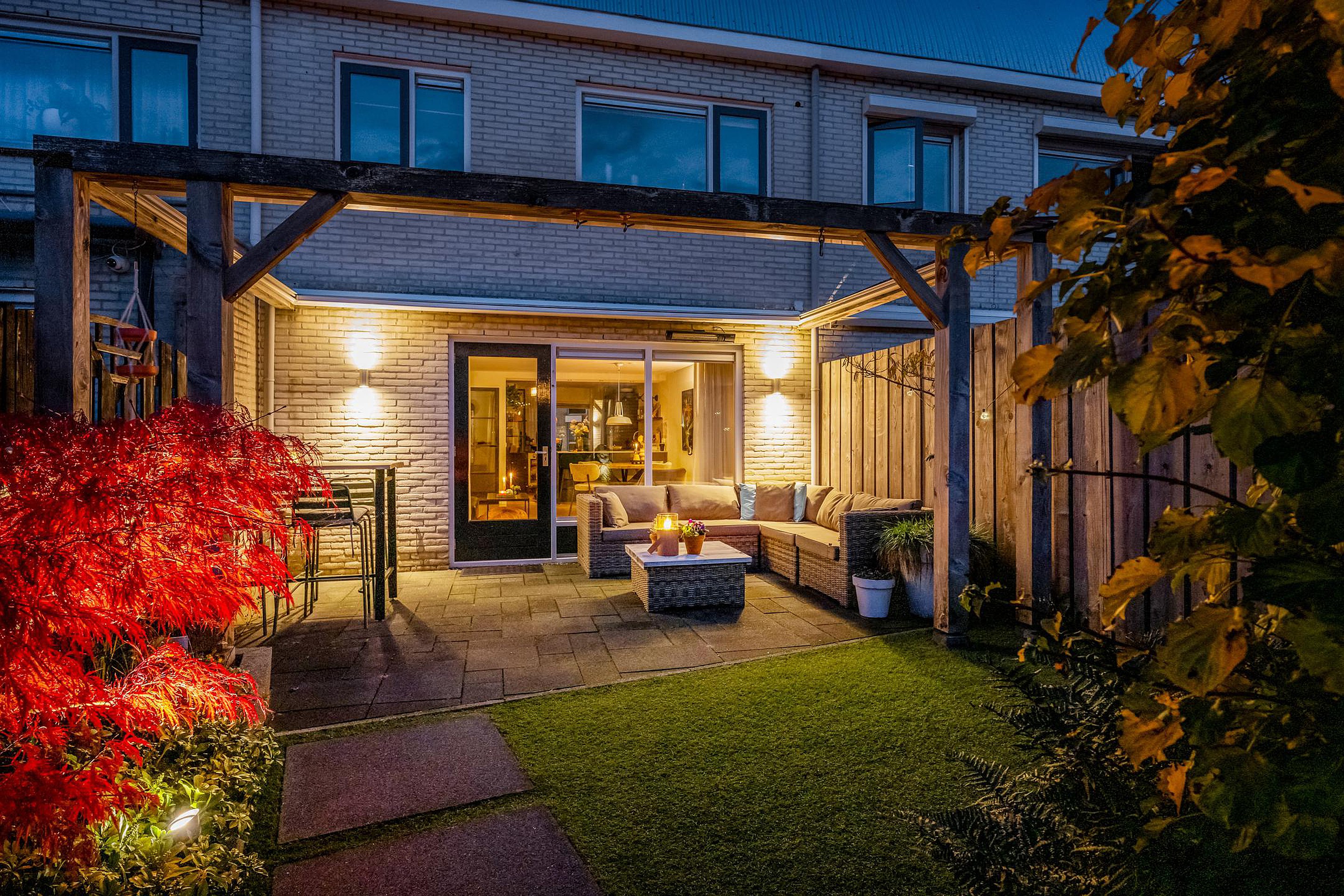 De achtertuin is fraai aangelegd en gericht op het zuidwesten. Dankzij het kunstgras en de onderhoudsarme indeling heeft u weinig werk en veel comfort. Er is genoeg ruimte voor een lounge- of tuintafel en met het grote zonnescherm creëert u eenvoudig een schaduwrijke plek. Achterin de tuin staat een vrijstaande berging, ideaal voor fietsen en tuingereedschap.