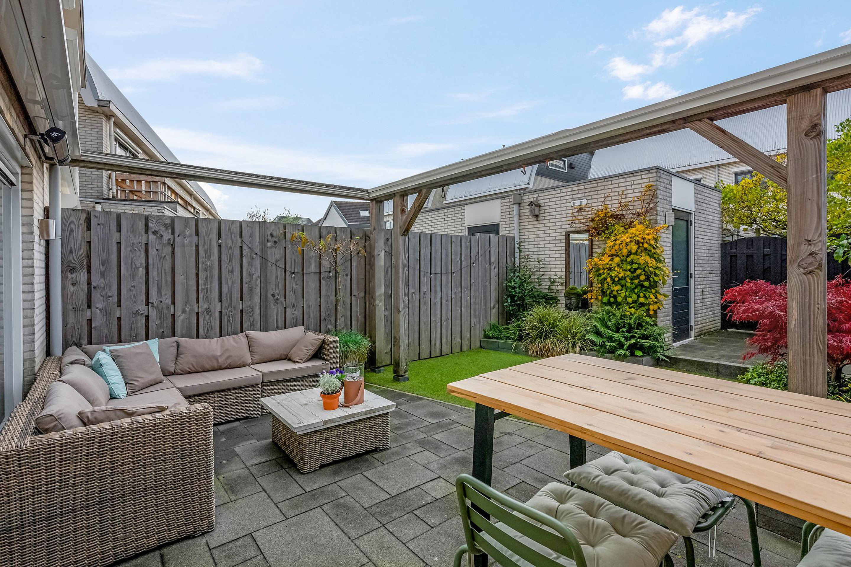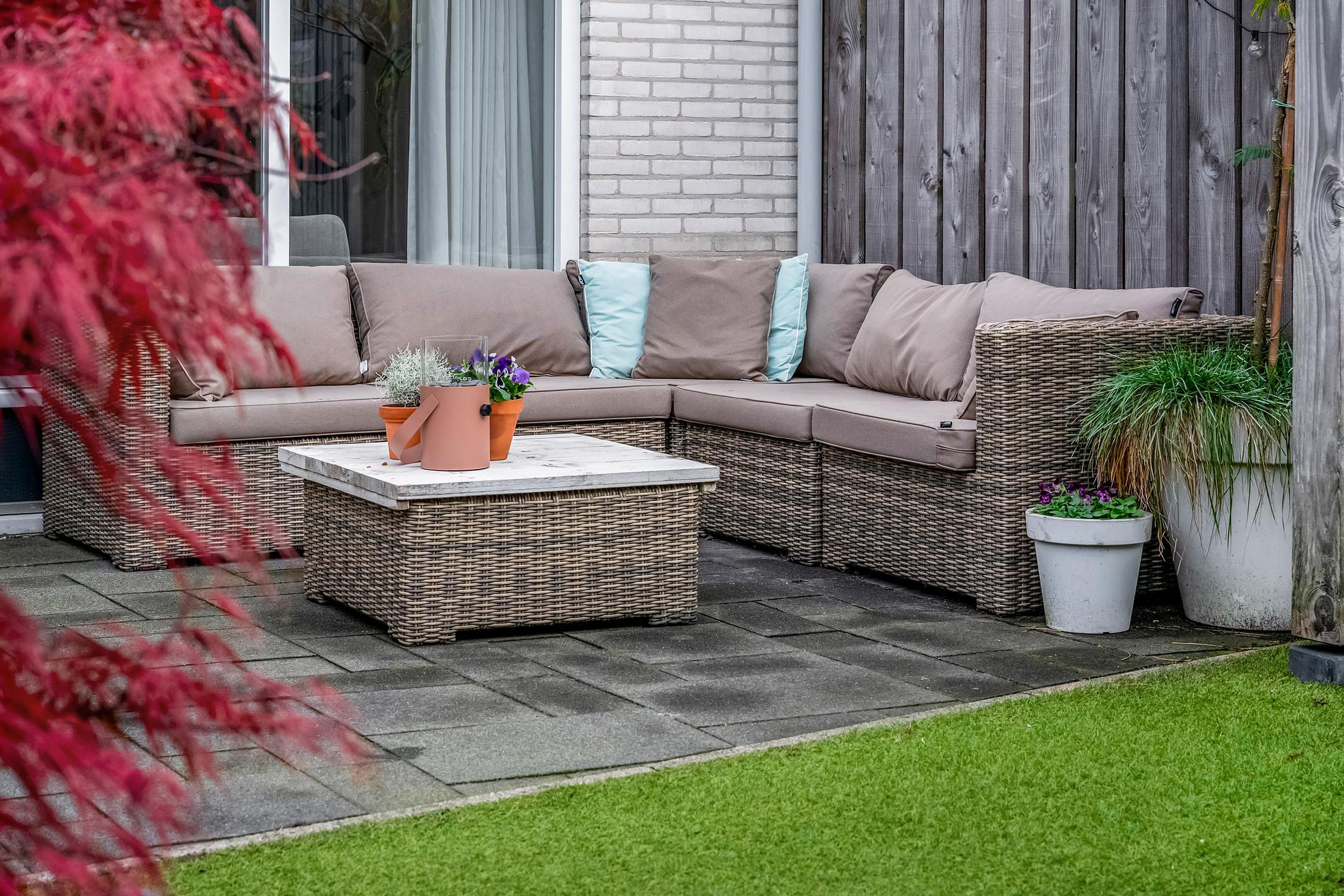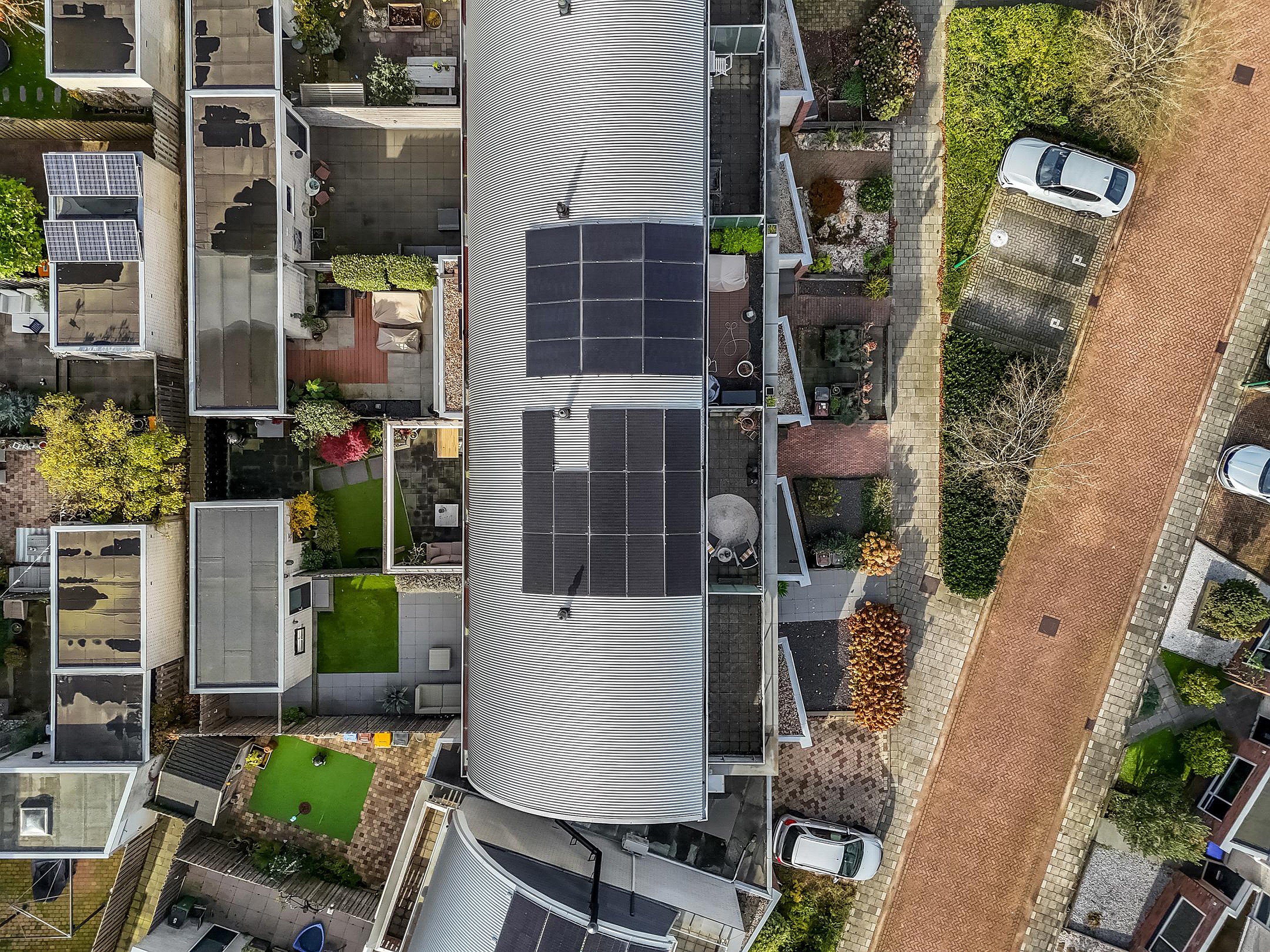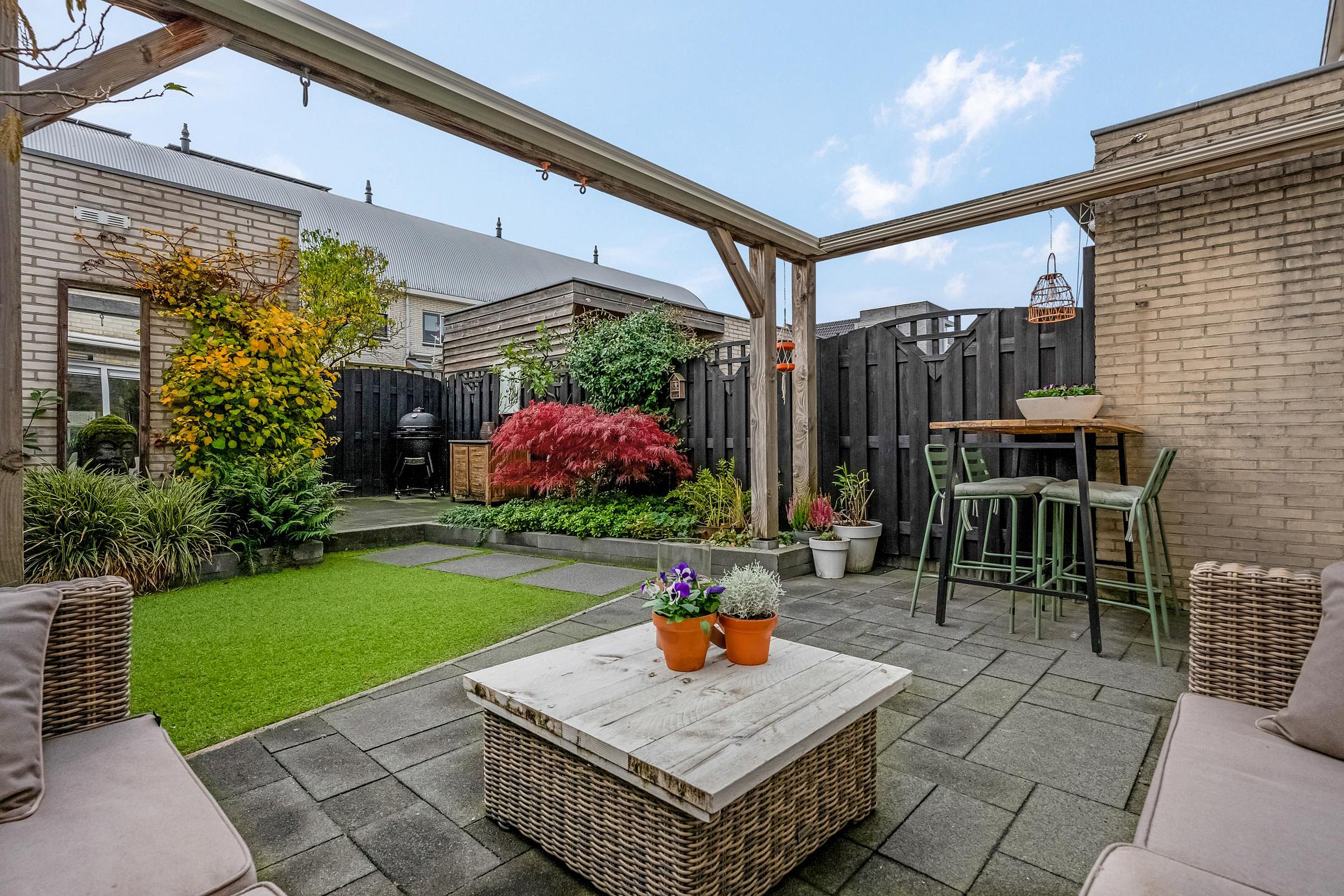 De achtertuin is fraai aangelegd en gericht op het zuidwesten. Dankzij het kunstgras en de onderhoudsarme indeling heeft u weinig werk en veel comfort. Er is genoeg ruimte voor een lounge- of tuintafel en met het grote zonnescherm creëert u eenvoudig een schaduwrijke plek. Achterin de tuin staat een vrijstaande berging, ideaal voor fietsen en tuingereedschap.