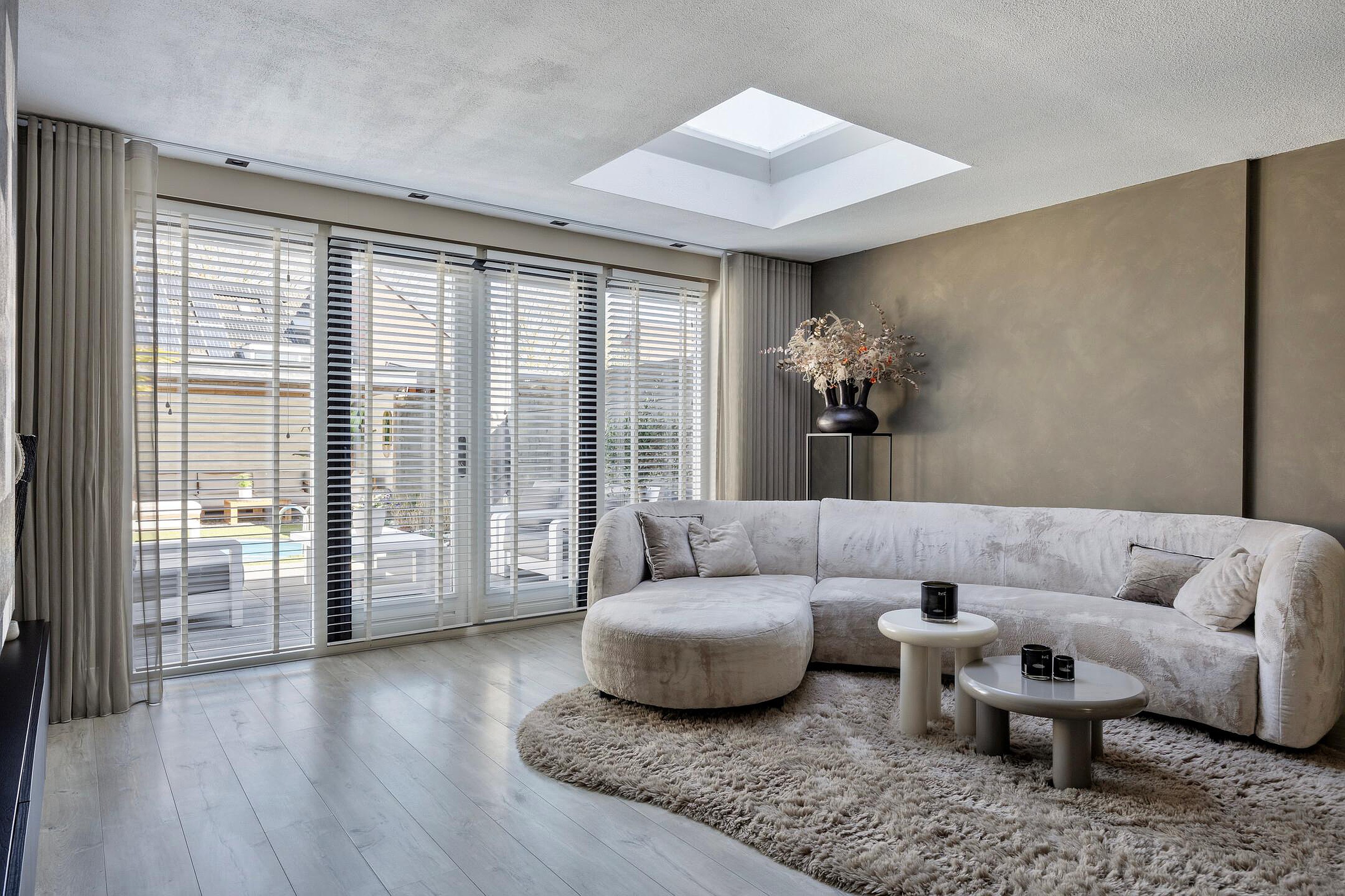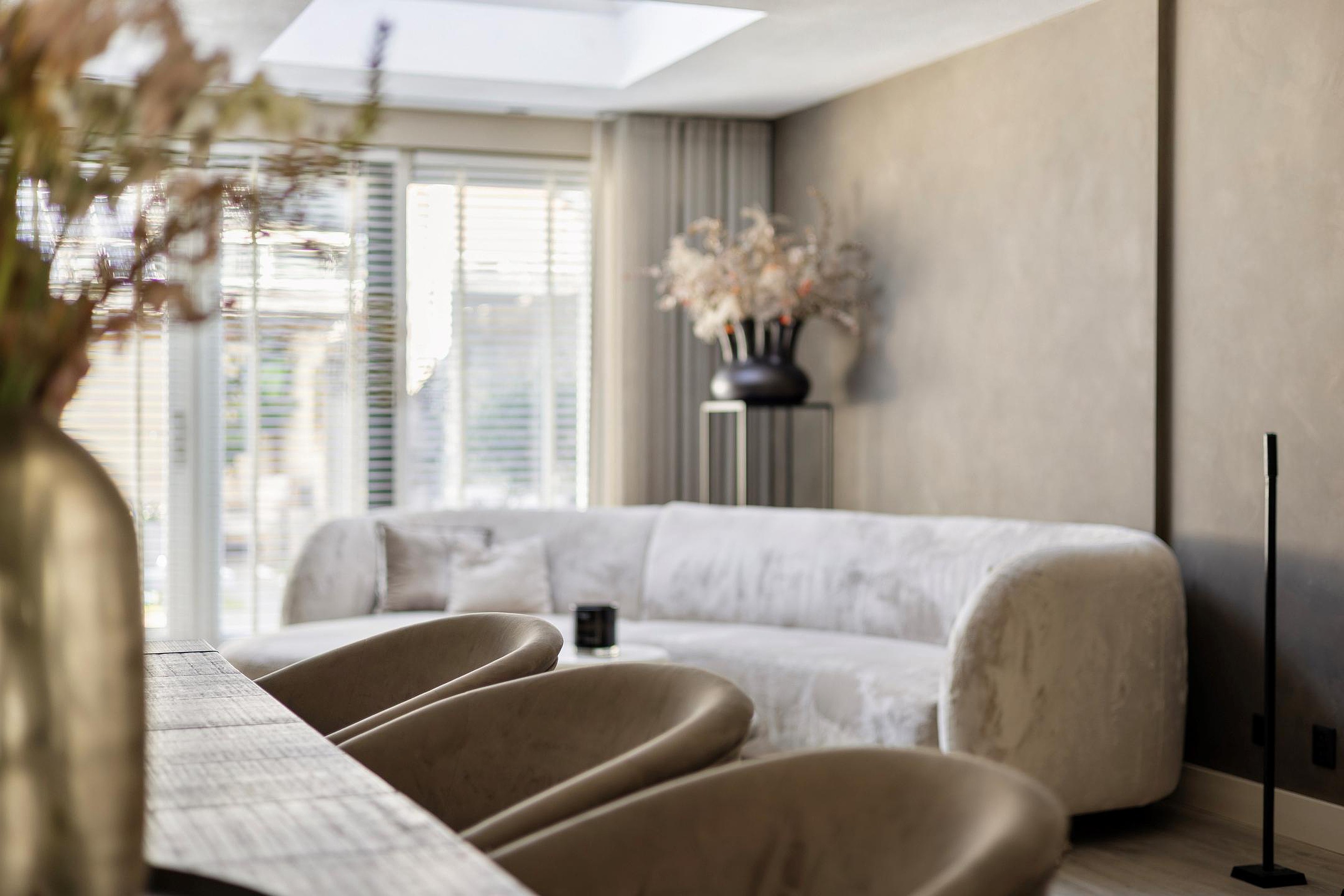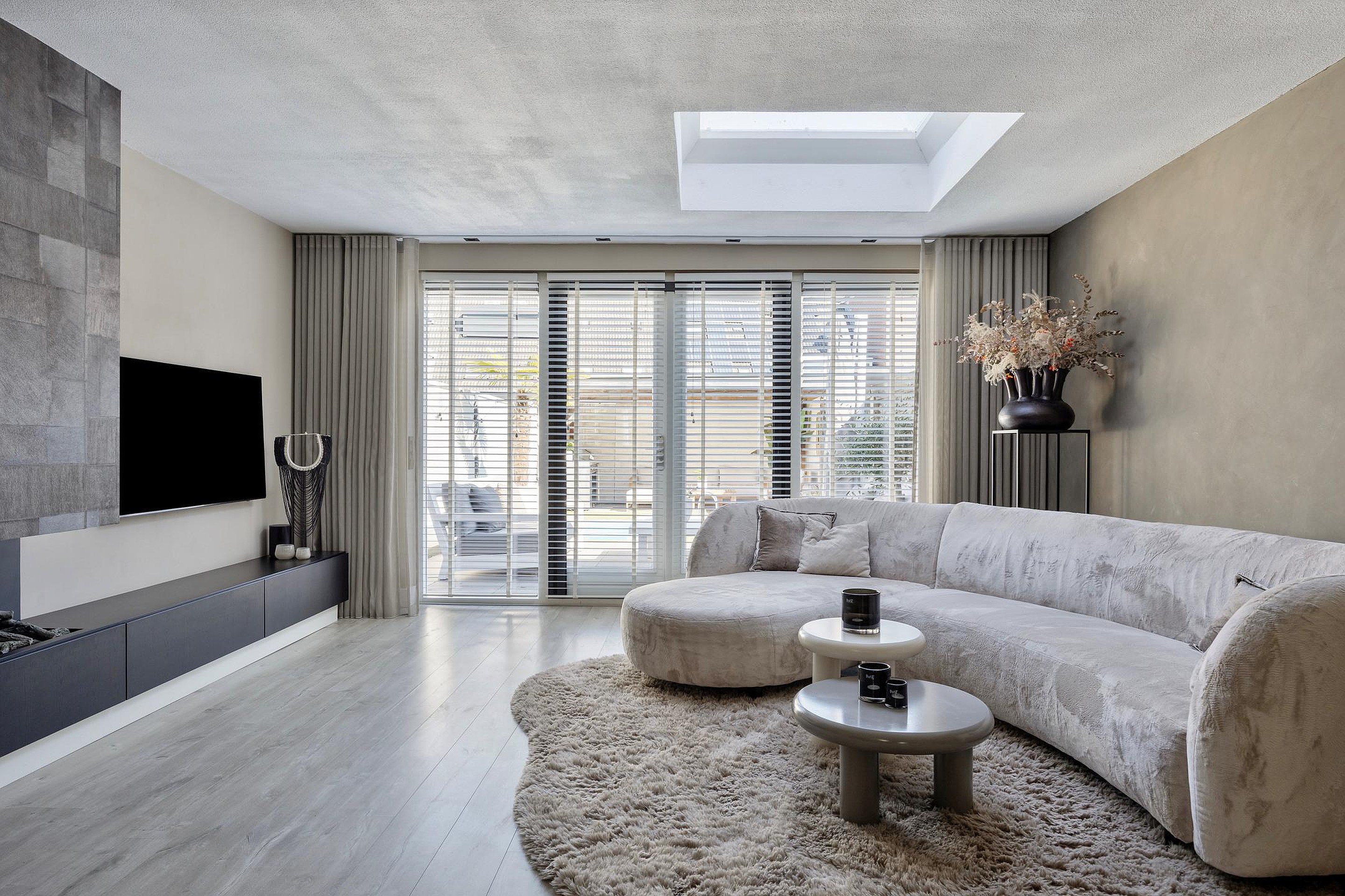 De woonkamer verwelkomt u met een ruimtelijk en open karakter en heeft een moderne uitstraling met een luxe afwerking. Dankzij de grote raampartijen en de lichtstraat baadt de ruimte in een overvloed aan natuurlijk daglicht, wat het geheel extra aantrekkelijk maakt.