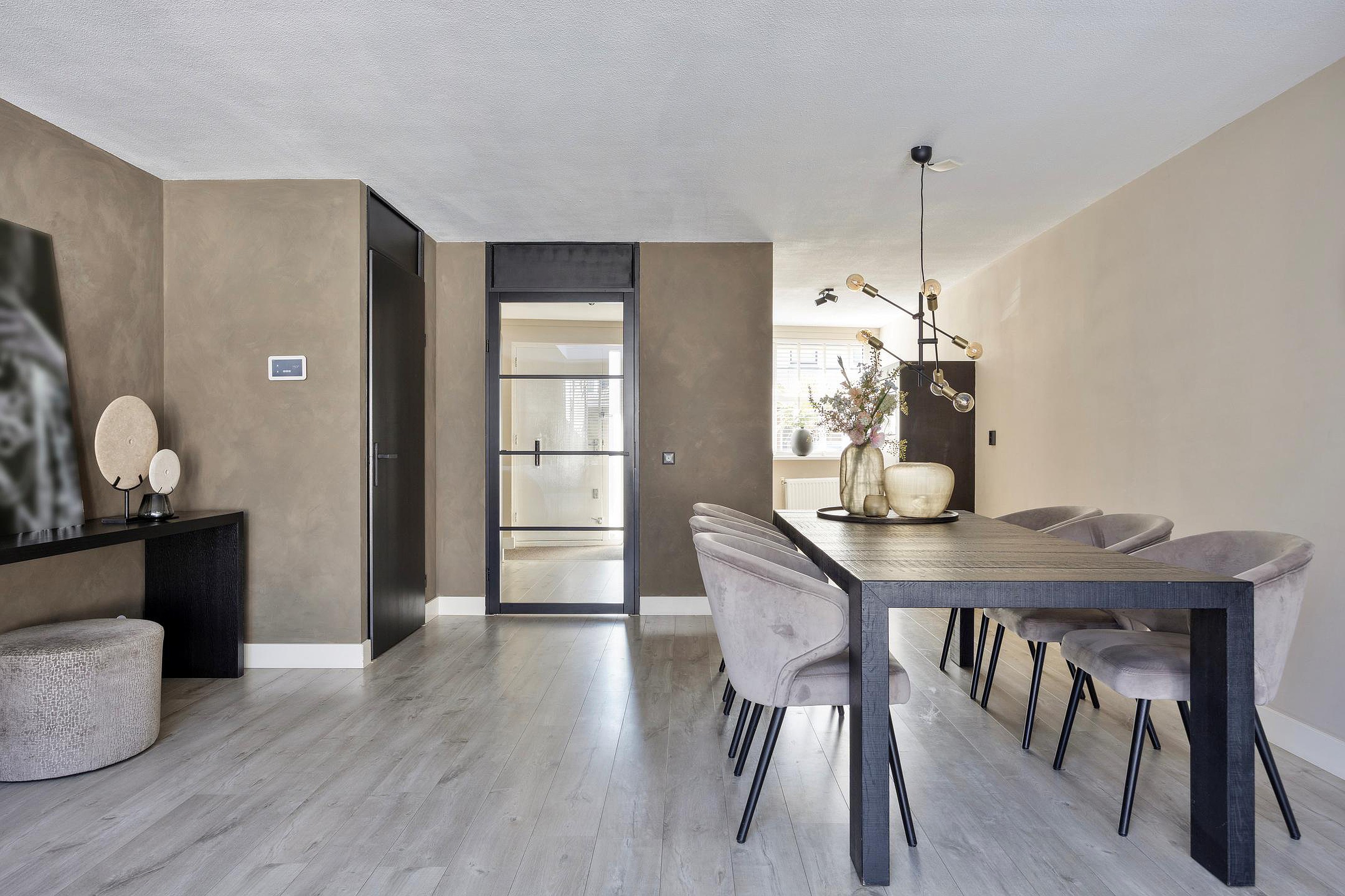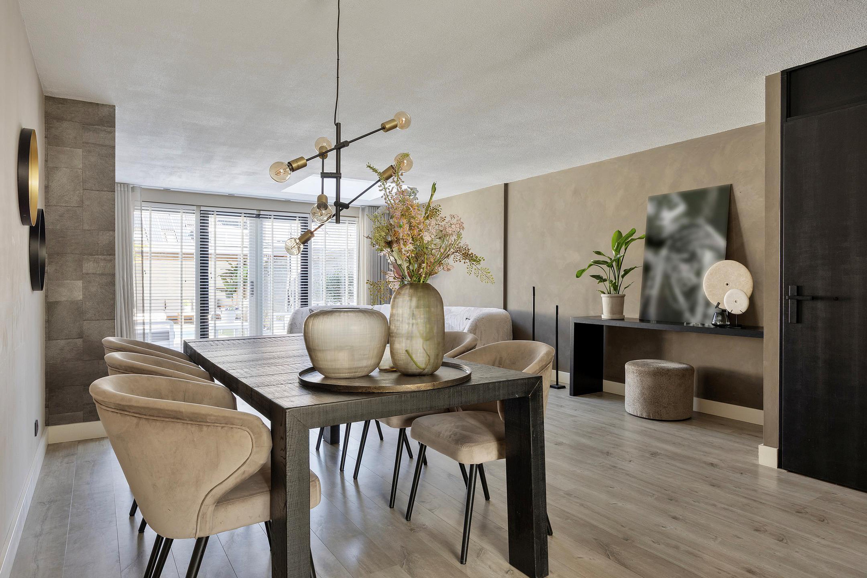 De indeling biedt volop mogelijkheden voor het creëren van een comfortabele zithoek en een sfeervolle eethoek. De openslaande deuren zorgen voor een naadloze verbinding met de tuin, terwijl de haard als stijlvolle eyecatcher warmte en gezelligheid toevoegt aan deze eigentijdse leefruimte.
